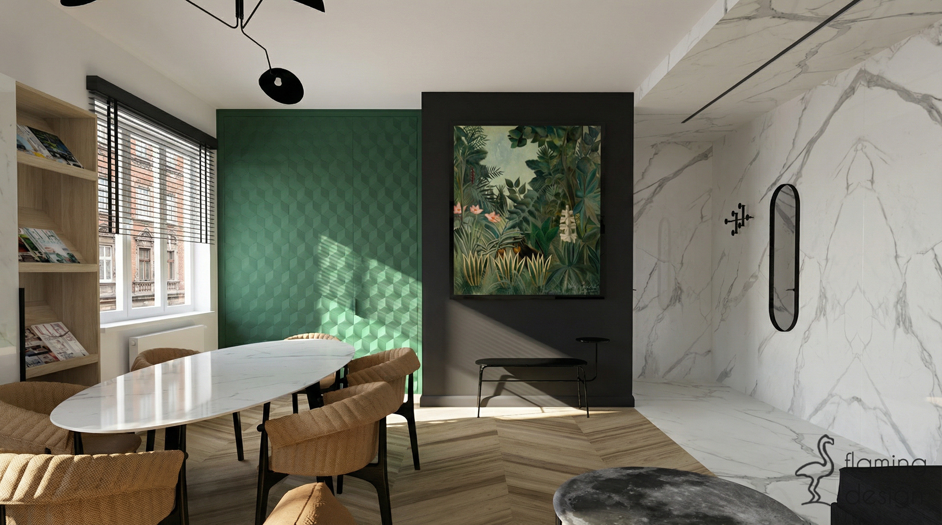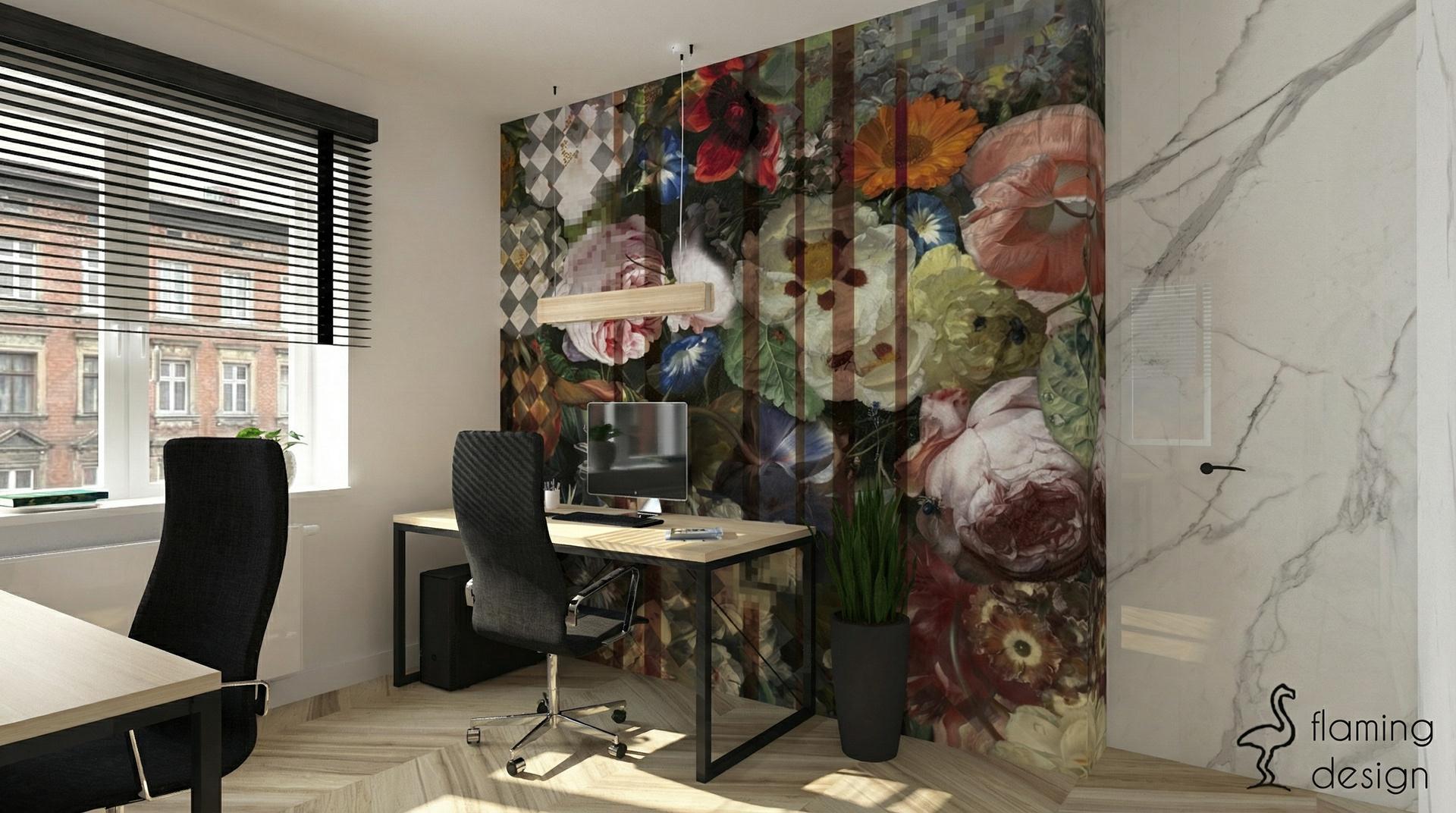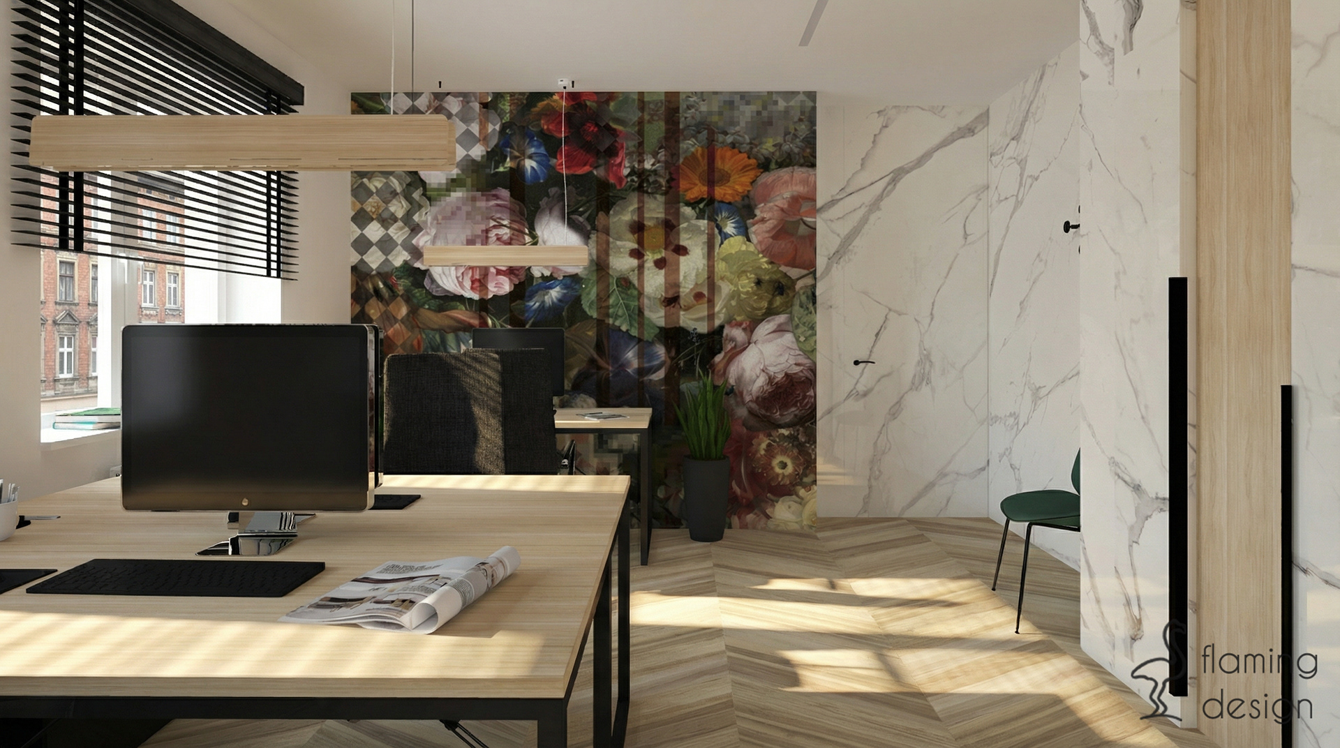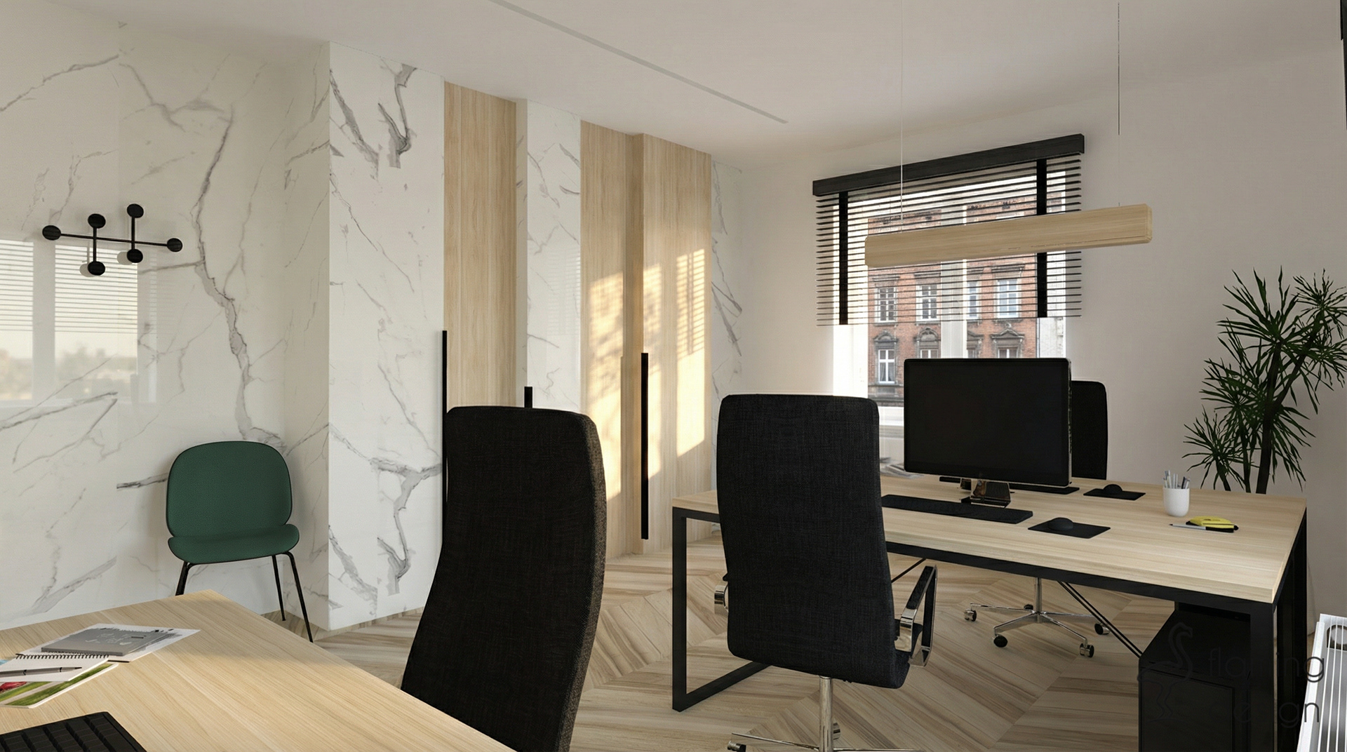 Prezentujemy projekt wnętrza biura w Krakowie z 2017 roku, który łączy funkcjonalność z wyrafinowanym stylem. Przestrzeń została podzielona na reprezentacyjną część dla klientów oraz odrębne pomieszczenie dla pracowników. W głównej strefie zaprojektowaliśmy ukryty w eleganckiej, szmaragdowej zabudowie aneks kuchenny oraz niewielką toaletę. Dla zapewnienia trwałości, na podłodze zastosowaliśmy kontrastowe połączenie wielkoformatowego gresu imitującego biały marmur oraz płytek drewnopodobnych. Wystrój opiera się na kontraście czerni i bieli, dopełnionym głęboką zielenią i akcentami jasnego brązu. Spójność aranżacji zachowano również w pokoju pracowników, gdzie dodatkowo na ścianie pojawiła się nastrojowa, ciemna tapeta w kwiaty.