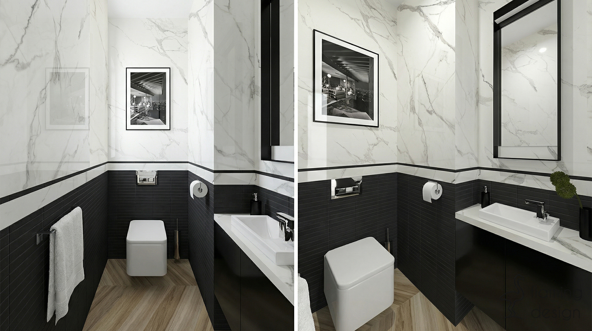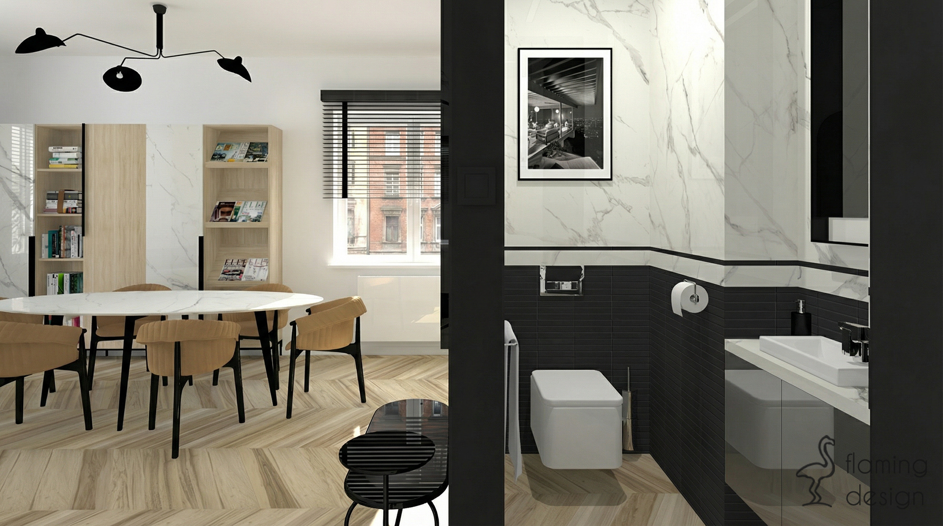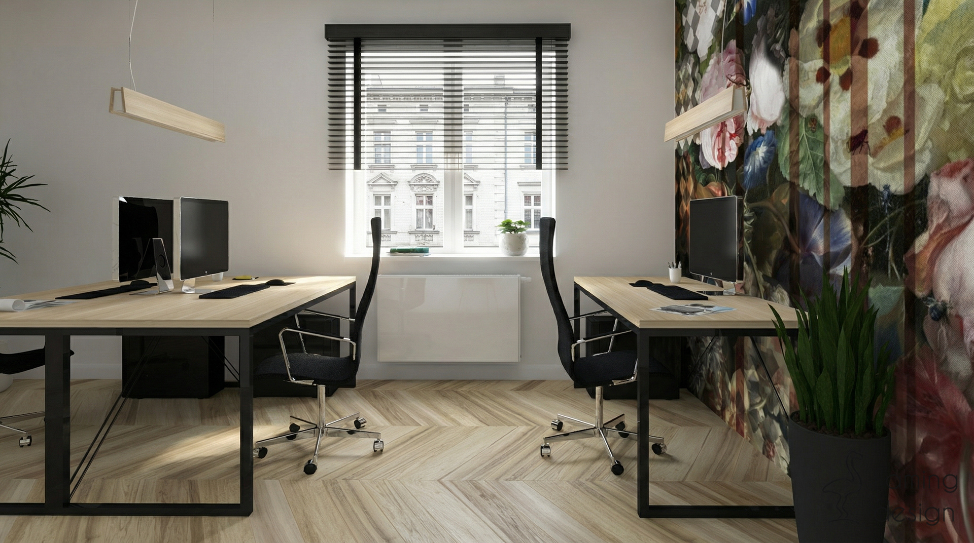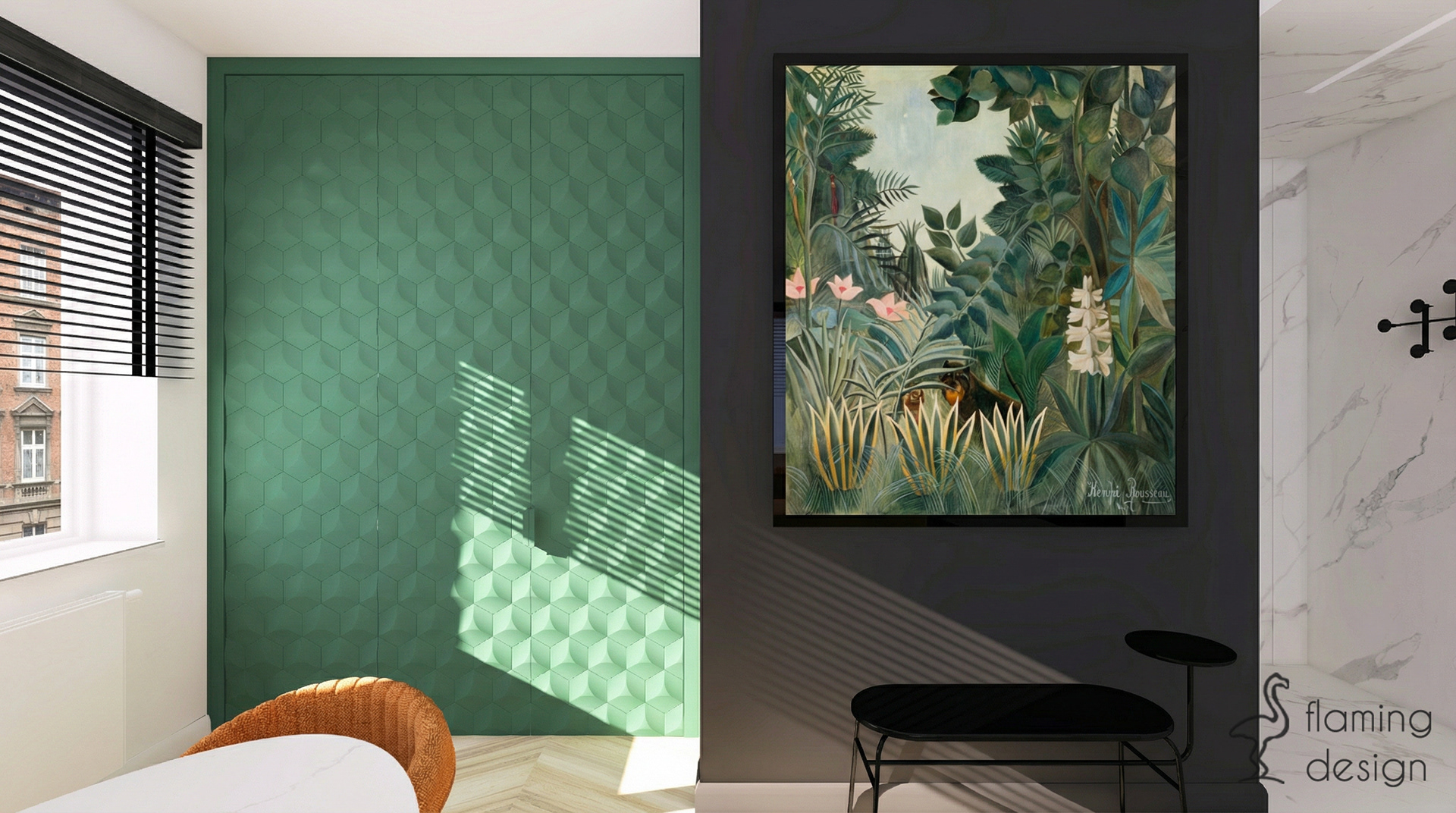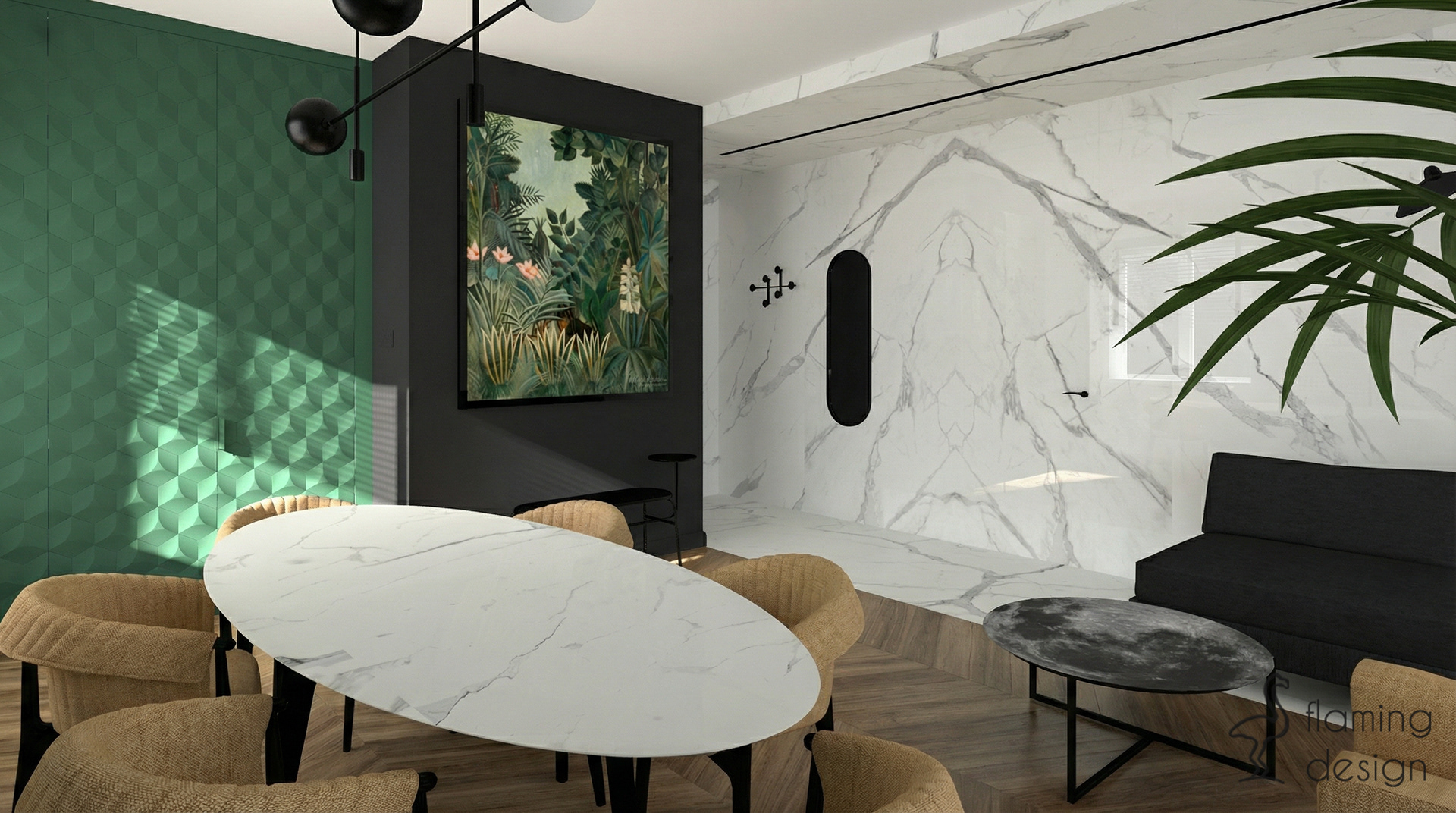 Prezentujemy projekt wnętrza biura w Krakowie z 2017 roku, który łączy funkcjonalność z wyrafinowanym stylem. Przestrzeń została podzielona na reprezentacyjną część dla klientów oraz odrębne pomieszczenie dla pracowników. W głównej strefie zaprojektowaliśmy ukryty w eleganckiej, szmaragdowej zabudowie aneks kuchenny oraz niewielką toaletę. Dla zapewnienia trwałości, na podłodze zastosowaliśmy kontrastowe połączenie wielkoformatowego gresu imitującego biały marmur oraz płytek drewnopodobnych. Wystrój opiera się na kontraście czerni i bieli, dopełnionym głęboką zielenią i akcentami jasnego brązu. Spójność aranżacji zachowano również w pokoju pracowników, gdzie dodatkowo na ścianie pojawiła się nastrojowa, ciemna tapeta w kwiaty.