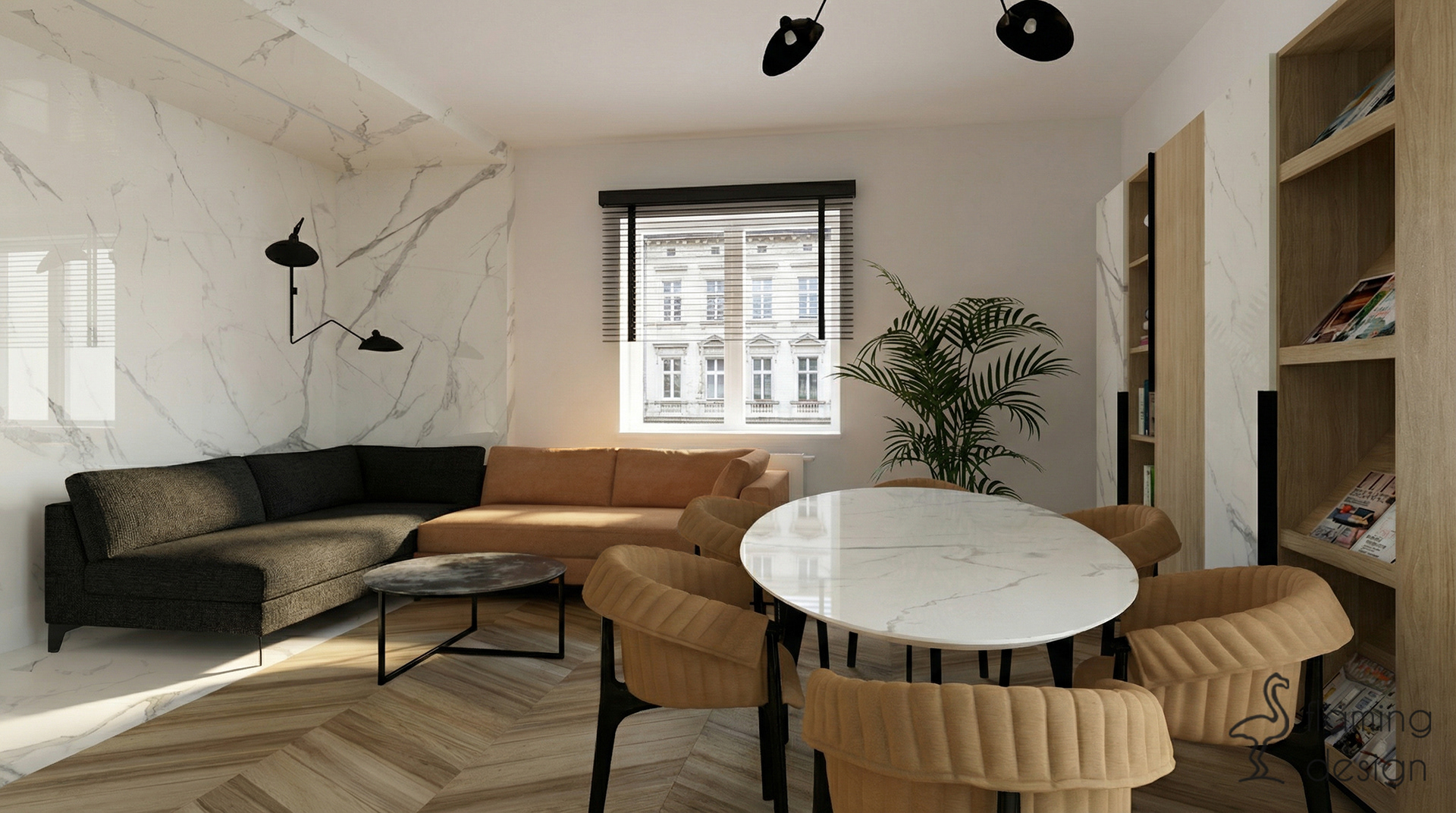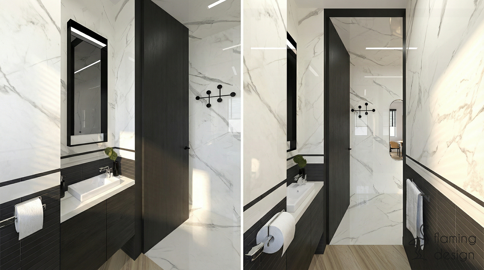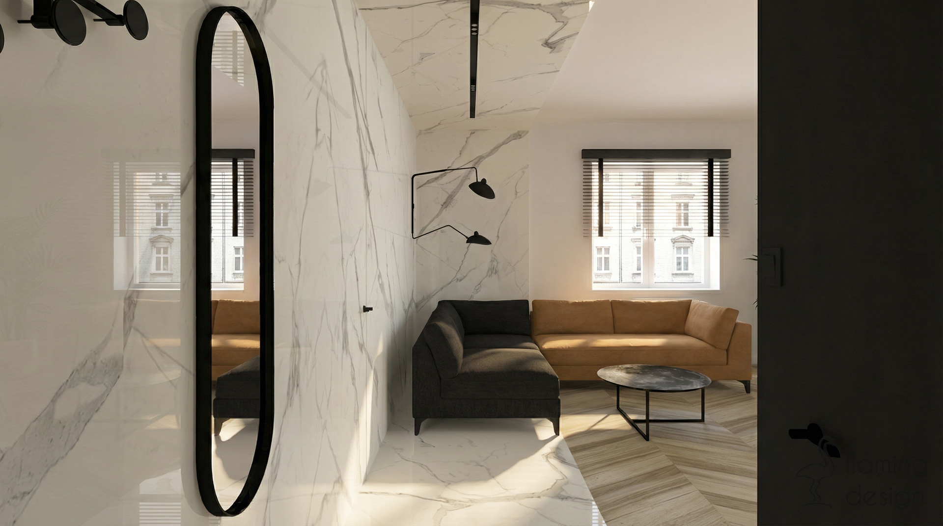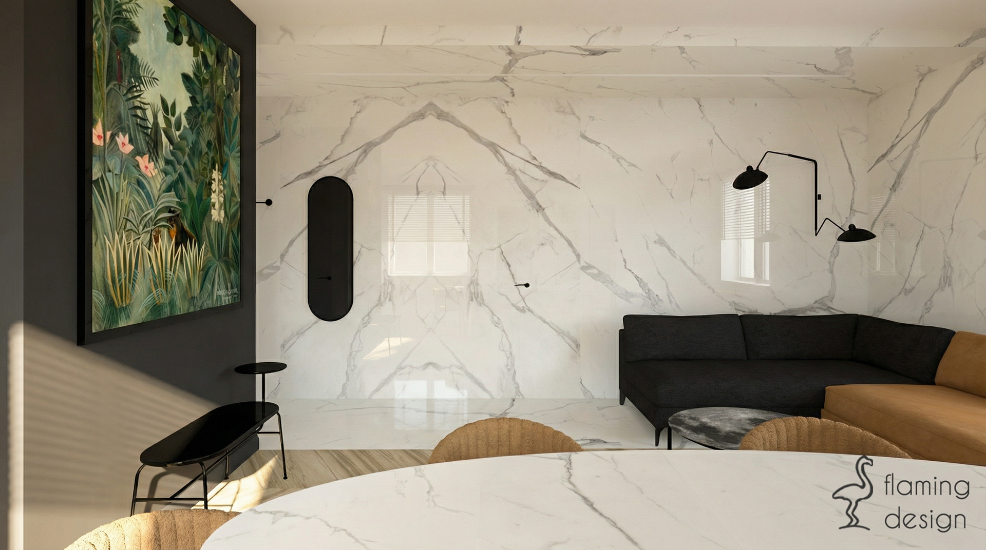 Prezentujemy projekt wnętrza biura w Krakowie z 2017 roku, który łączy funkcjonalność z wyrafinowanym stylem. Przestrzeń została podzielona na reprezentacyjną część dla klientów oraz odrębne pomieszczenie dla pracowników. W głównej strefie zaprojektowaliśmy ukryty w eleganckiej, szmaragdowej zabudowie aneks kuchenny oraz niewielką toaletę. Dla zapewnienia trwałości, na podłodze zastosowaliśmy kontrastowe połączenie wielkoformatowego gresu imitującego biały marmur oraz płytek drewnopodobnych. Wystrój opiera się na kontraście czerni i bieli, dopełnionym głęboką zielenią i akcentami jasnego brązu. Spójność aranżacji zachowano również w pokoju pracowników, gdzie dodatkowo na ścianie pojawiła się nastrojowa, ciemna tapeta w kwiaty.