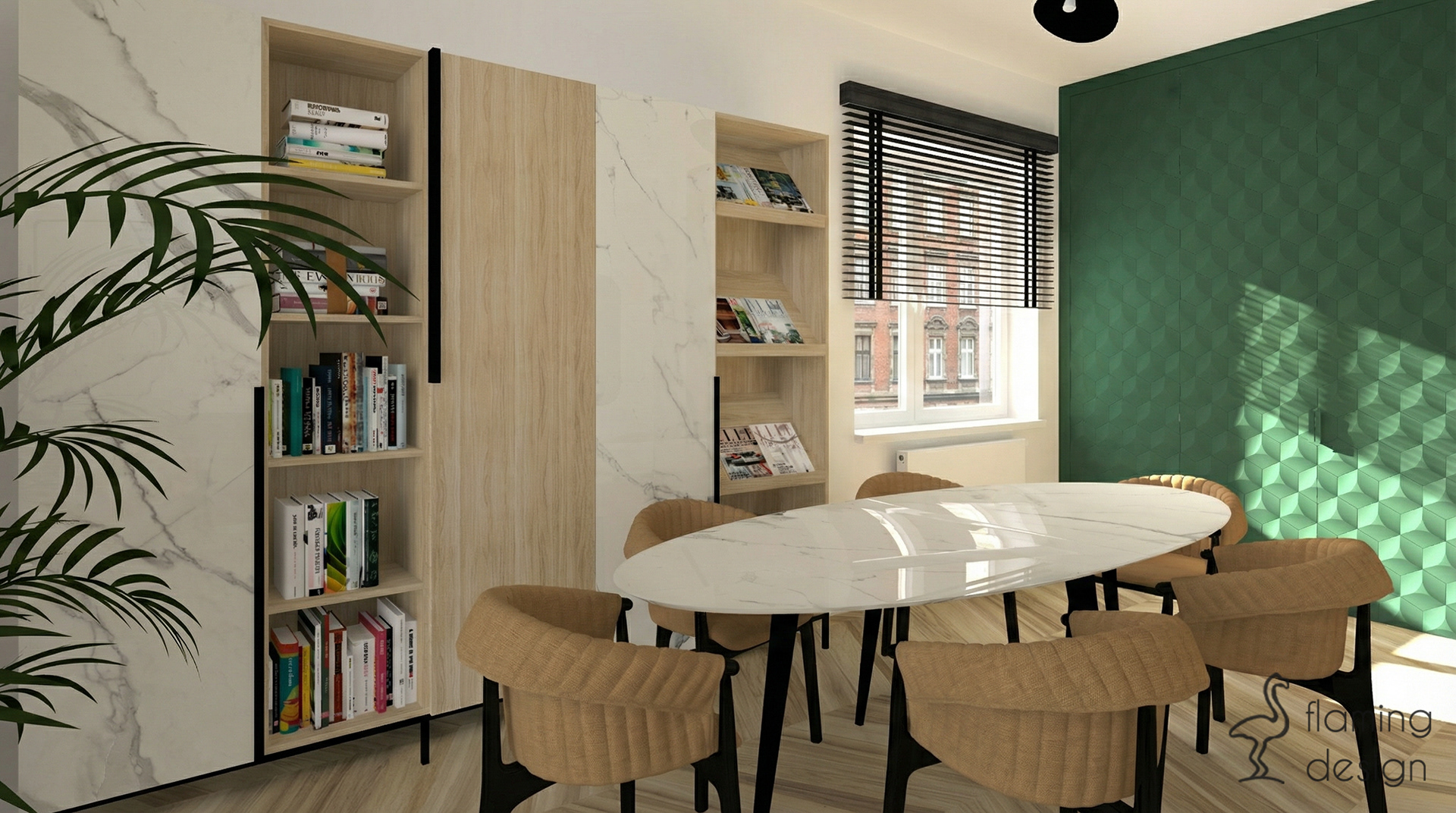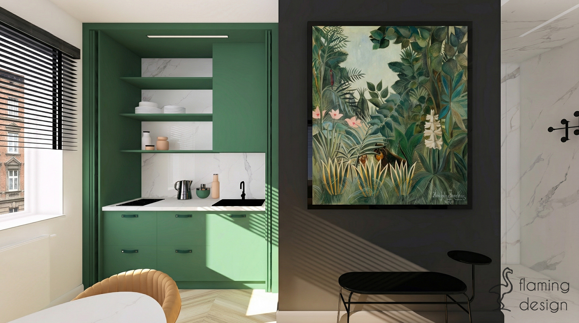 Elegancki projekt biura w Krakowie, łączący funkcjonalną strefę dla klientów z ukrytym aneksem kuchennym w szmaragdowej zabudowie oraz kontrastowymi materiałami wykończeniowymi.