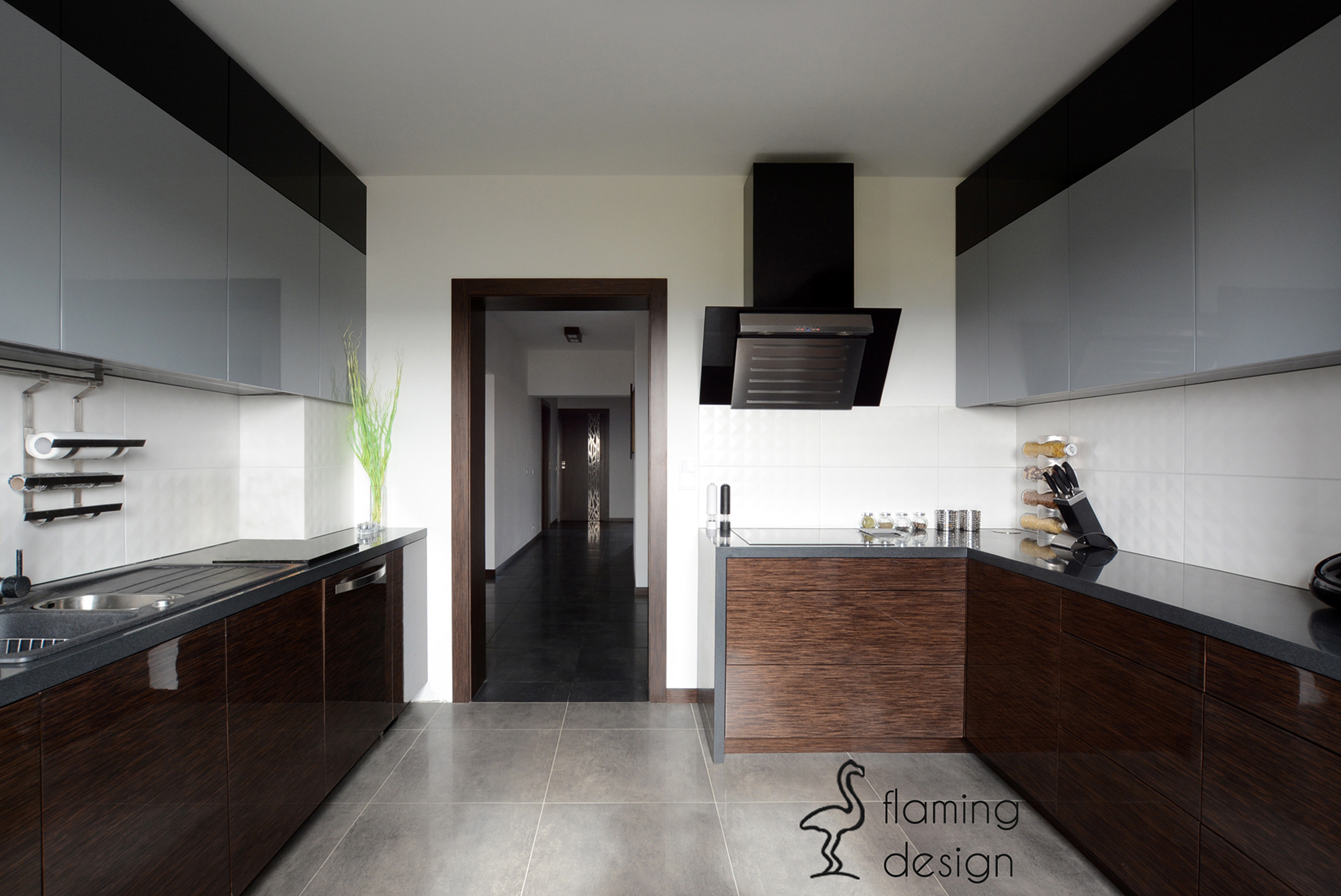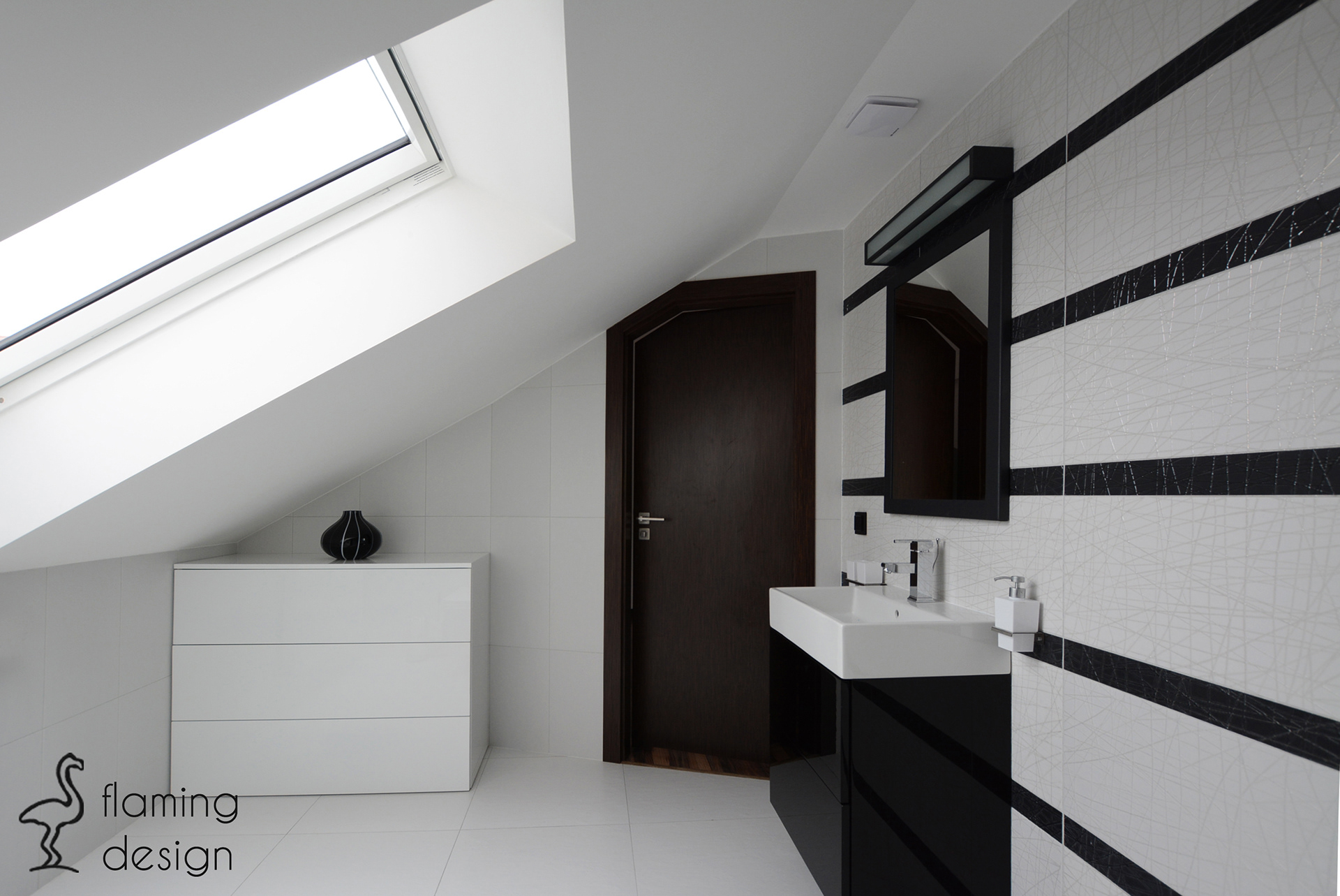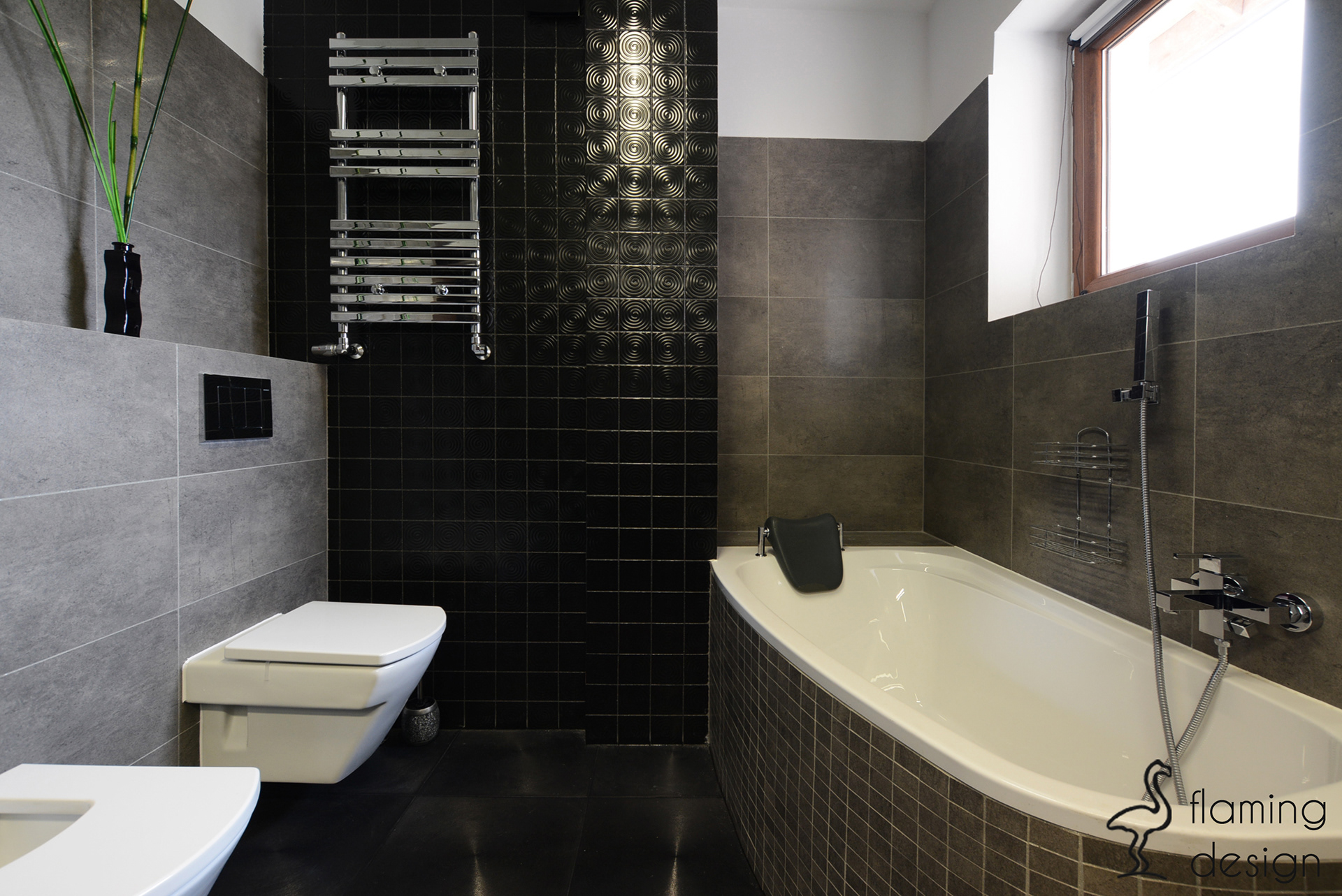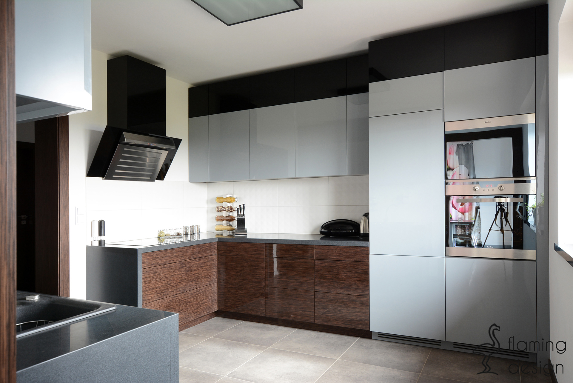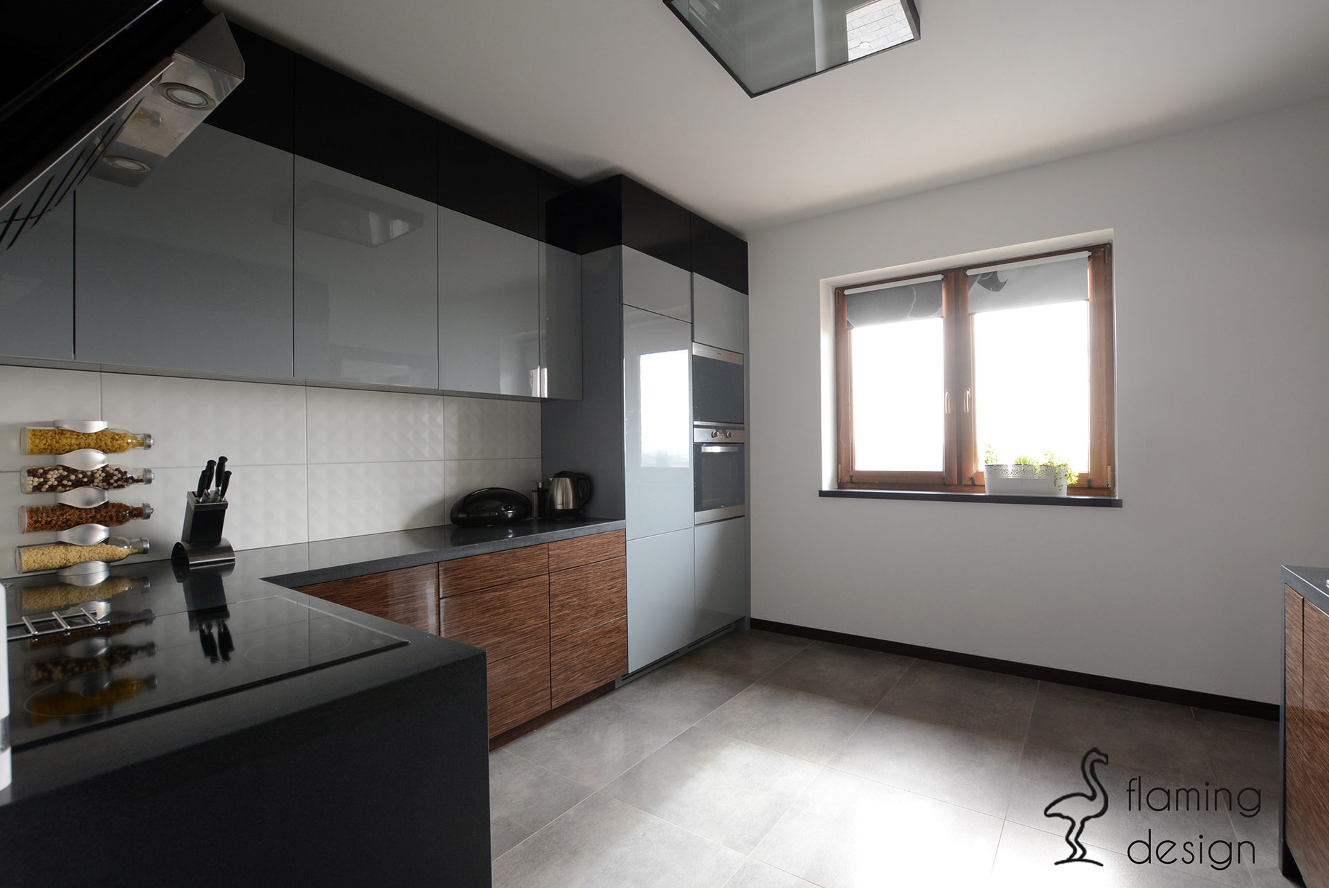 Projekt wnętrz obejmował kuchnię oraz dwie łazienki. W kuchni nie można było zmienić umiejscowienia sprzętów kuchennych, ale zdecydowano się na umiejscowienie piekarnika, mikrofalówki oraz lodówki w zabudowie pionowej. Inwestorzy marzyli o szarej kuchni, która została przełamana fornirem w kolorze orzecha oraz czarnymi elementami. Na polerowanych frontach szafek odbija się światło, przez co kuchnia nie wydaje się za bardzo ciemna. W łazience na parterze inwestorzy wybrali czarne płytki na podłogę, do nich dobrano szare i czarne płytki na ściany. Łazienka na poddaszu jest jaśniejsza, na jednej ze ścian zaprojektowano białe płytki z czarnymi pasami o ciekawym wzorze.