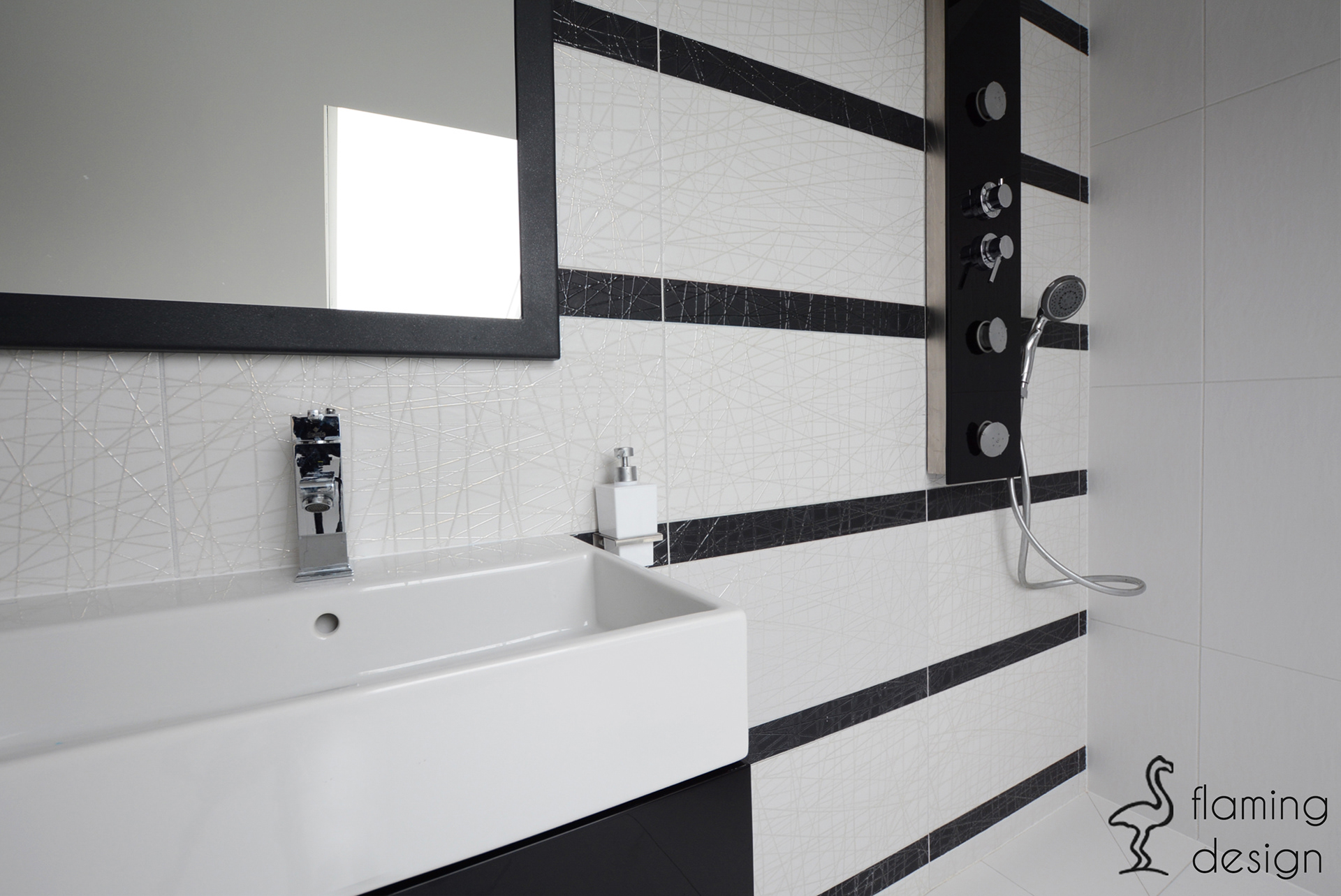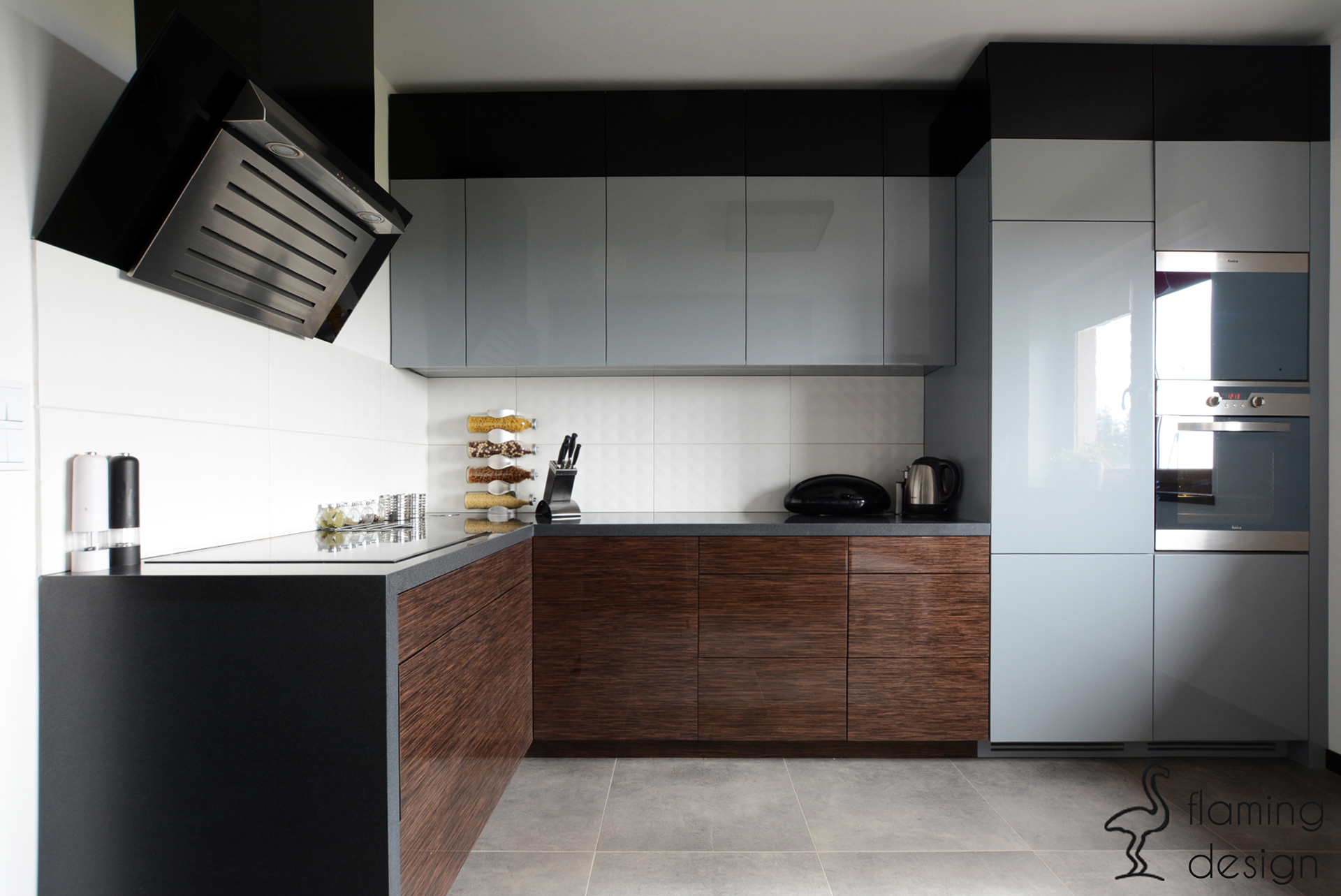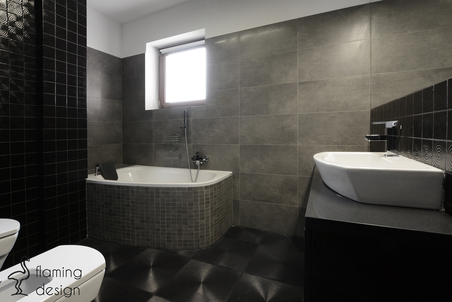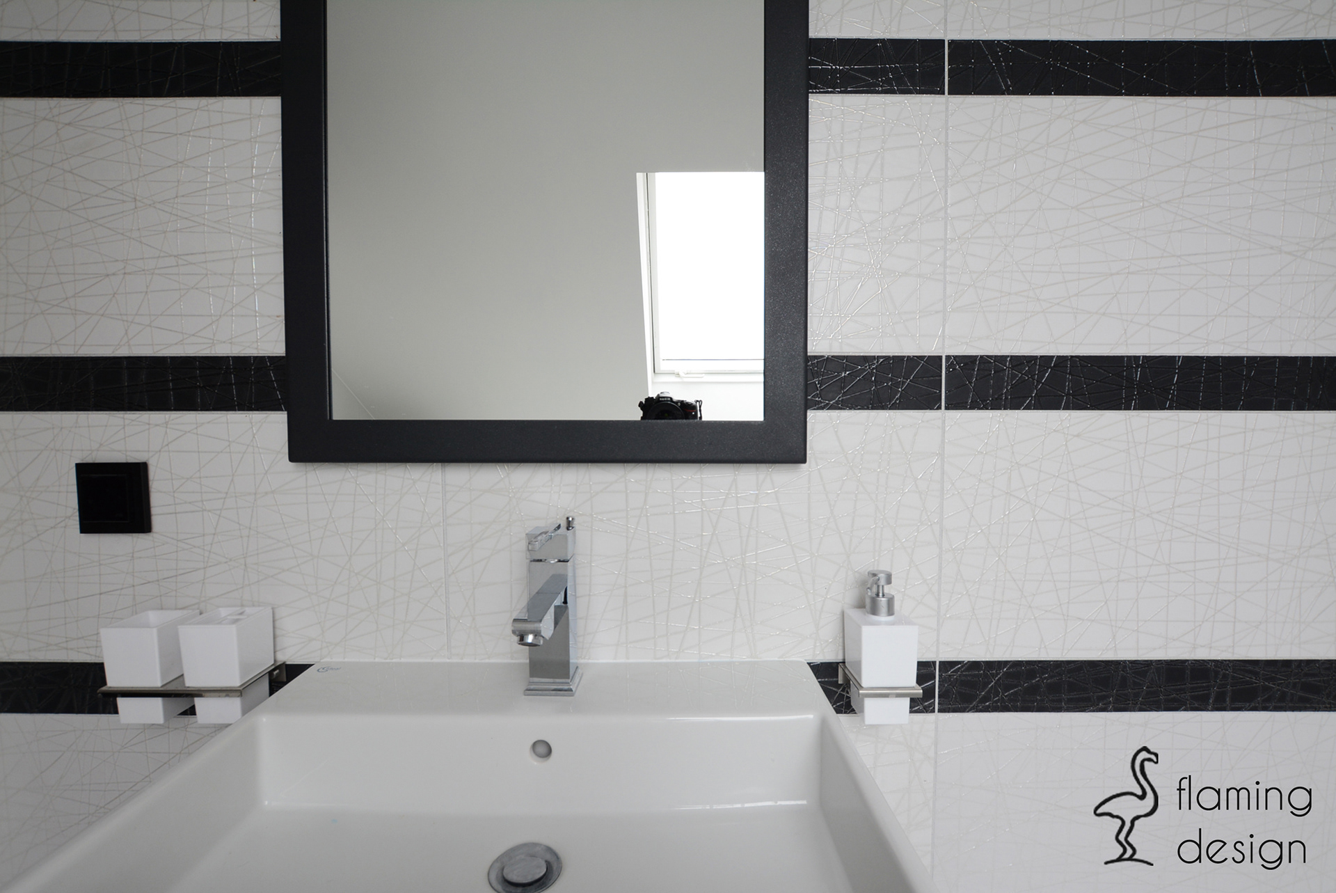 Projekt wnętrz obejmował kuchnię oraz dwie łazienki. W kuchni nie można było zmienić umiejscowienia sprzętów kuchennych, ale zdecydowano się na umiejscowienie piekarnika, mikrofalówki oraz lodówki w zabudowie pionowej. Inwestorzy marzyli o szarej kuchni, która została przełamana fornirem w kolorze orzecha oraz czarnymi elementami. Na polerowanych frontach szafek odbija się światło, przez co kuchnia nie wydaje się za bardzo ciemna. W łazience na parterze inwestorzy wybrali czarne płytki na podłogę, do nich dobrano szare i czarne płytki na ściany. Łazienka na poddaszu jest jaśniejsza, na jednej ze ścian zaprojektowano białe płytki z czarnymi pasami o ciekawym wzorze.
