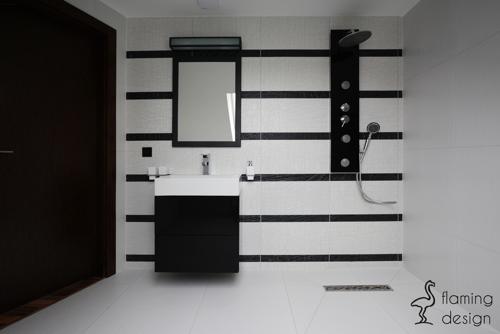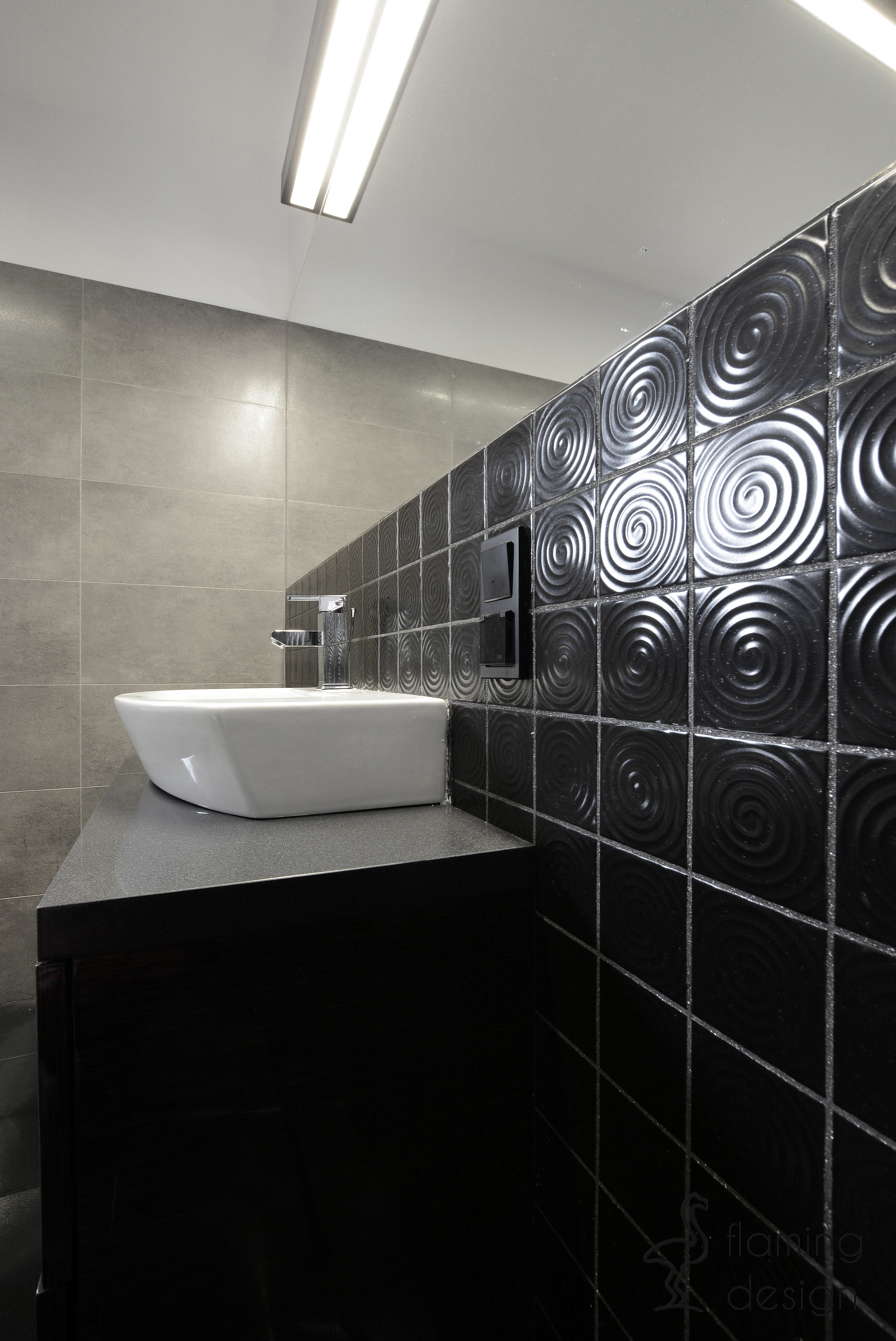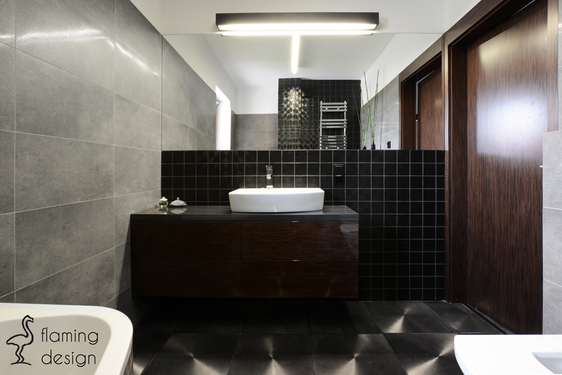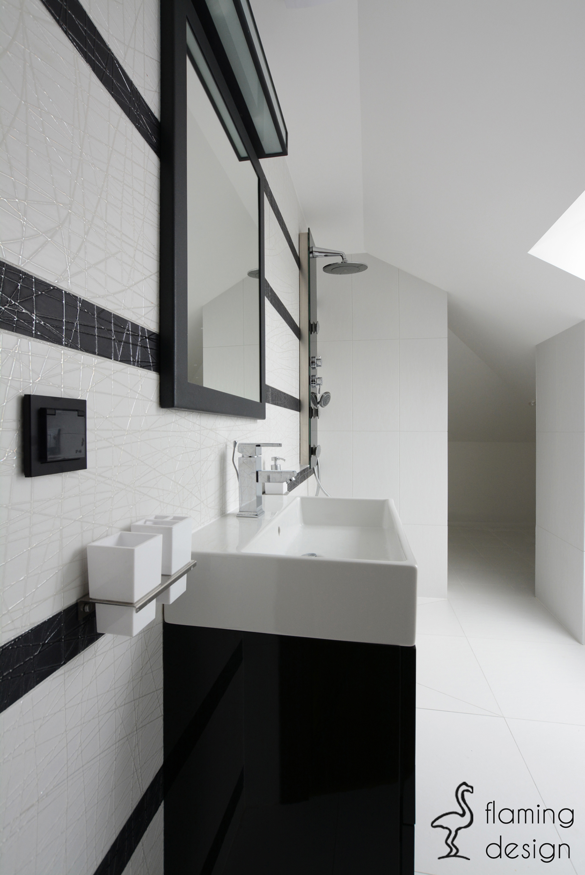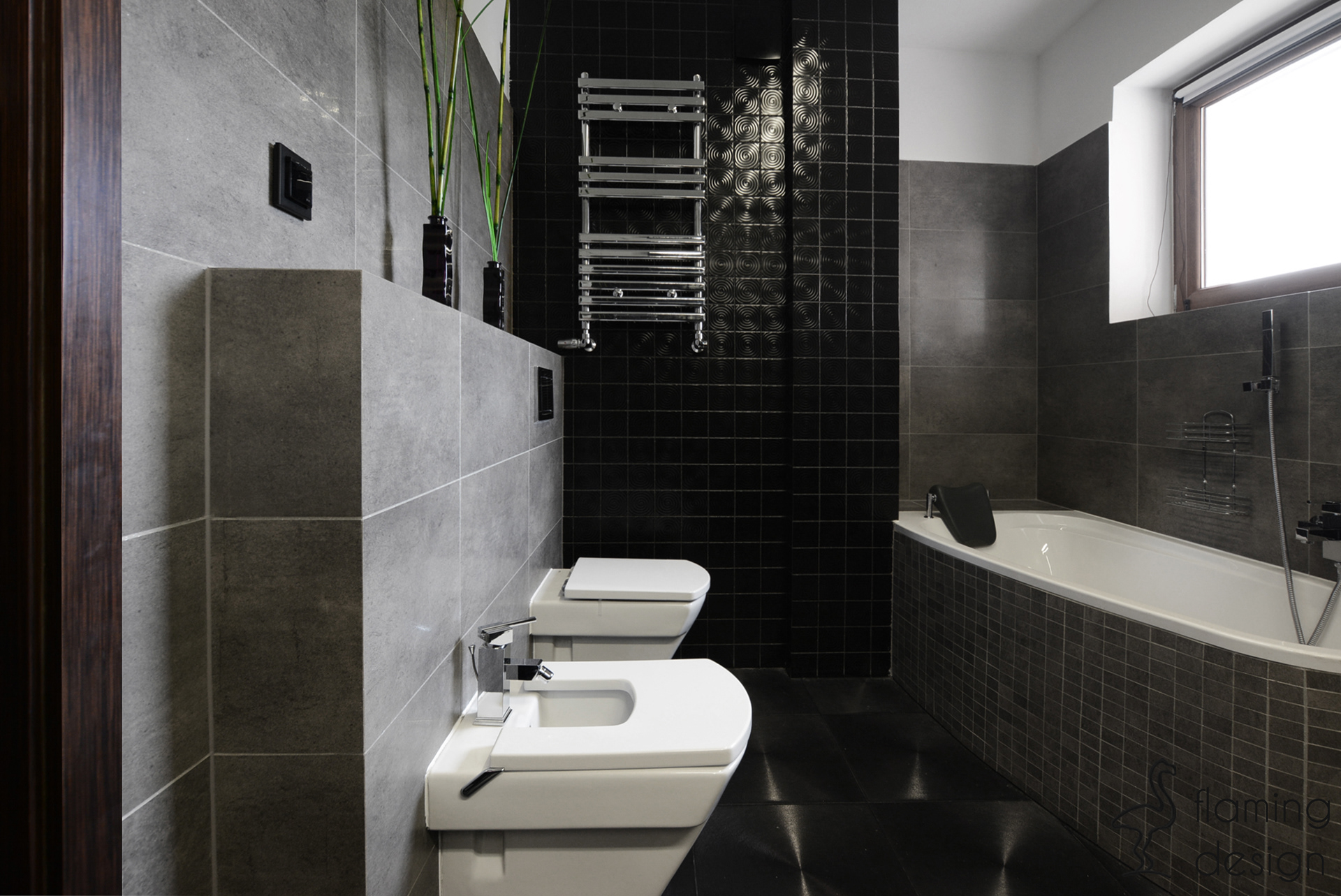 Projekt wnętrz obejmował kuchnię oraz dwie łazienki. W kuchni nie można było zmienić umiejscowienia sprzętów kuchennych, ale zdecydowano się na umiejscowienie piekarnika, mikrofalówki oraz lodówki w zabudowie pionowej. Inwestorzy marzyli o szarej kuchni, która została przełamana fornirem w kolorze orzecha oraz czarnymi elementami. Na polerowanych frontach szafek odbija się światło, przez co kuchnia nie wydaje się za bardzo ciemna. W łazience na parterze inwestorzy wybrali czarne płytki na podłogę, do nich dobrano szare i czarne płytki na ściany. Łazienka na poddaszu jest jaśniejsza, na jednej ze ścian zaprojektowano białe płytki z czarnymi pasami o ciekawym wzorze.