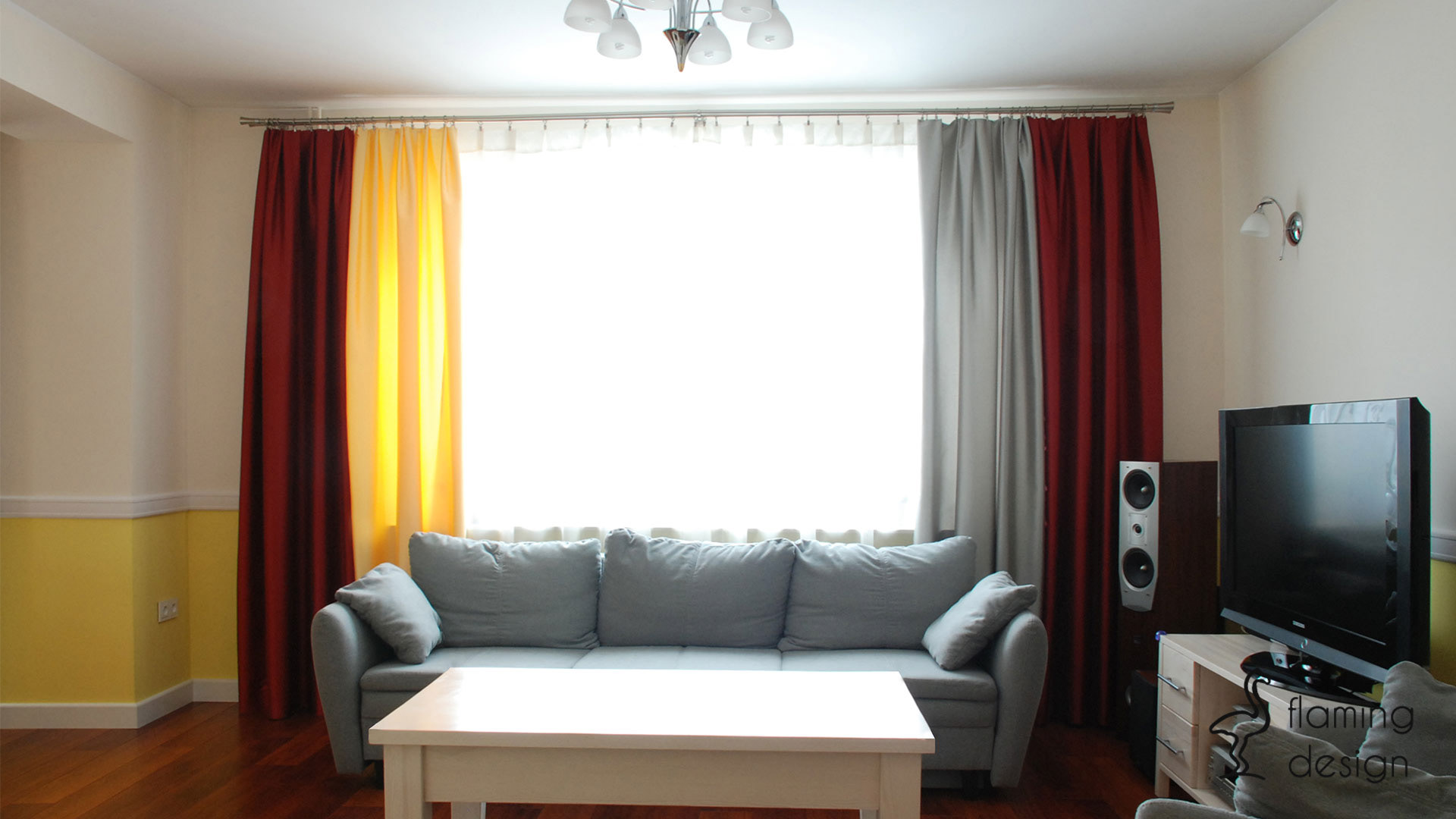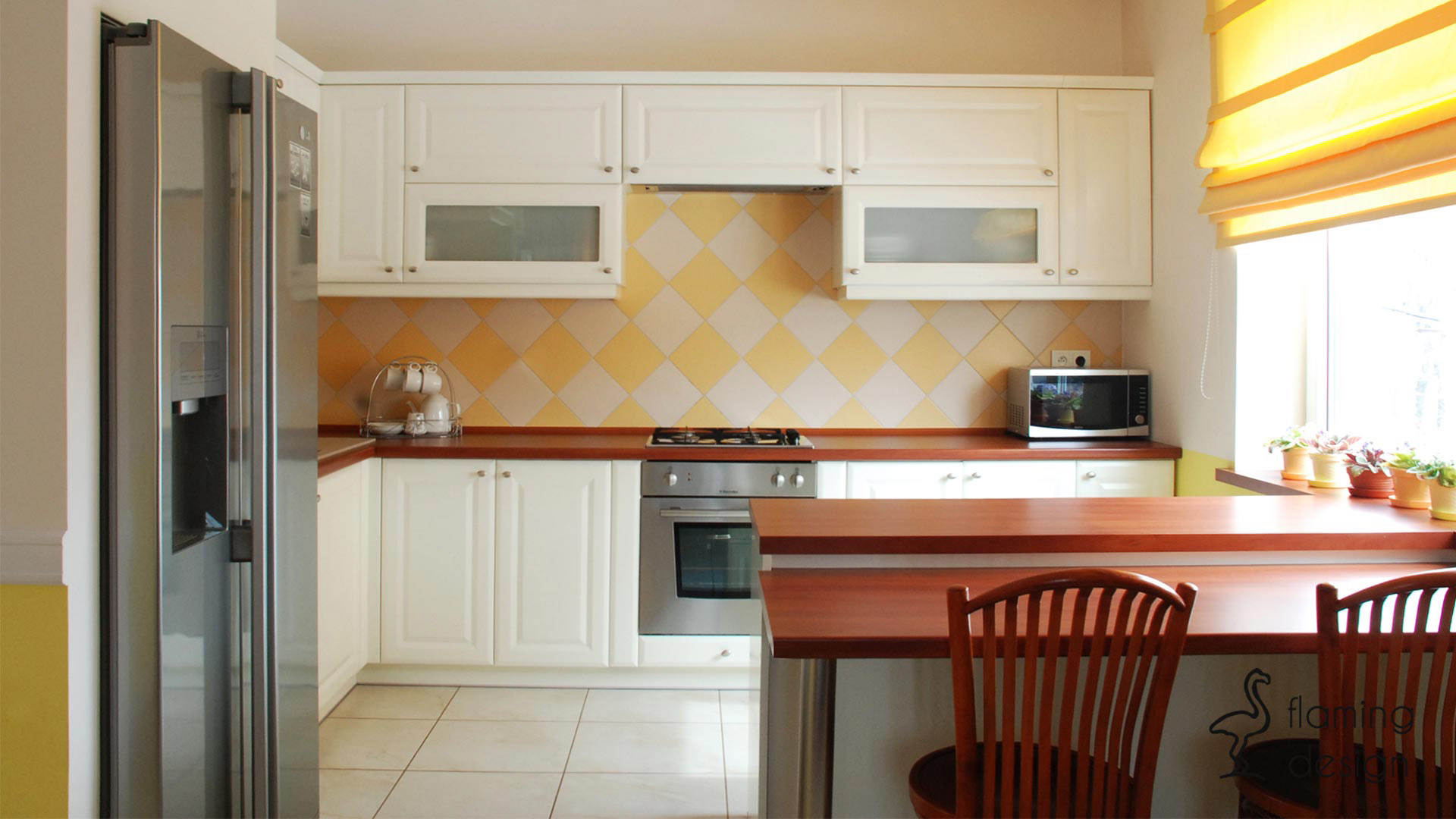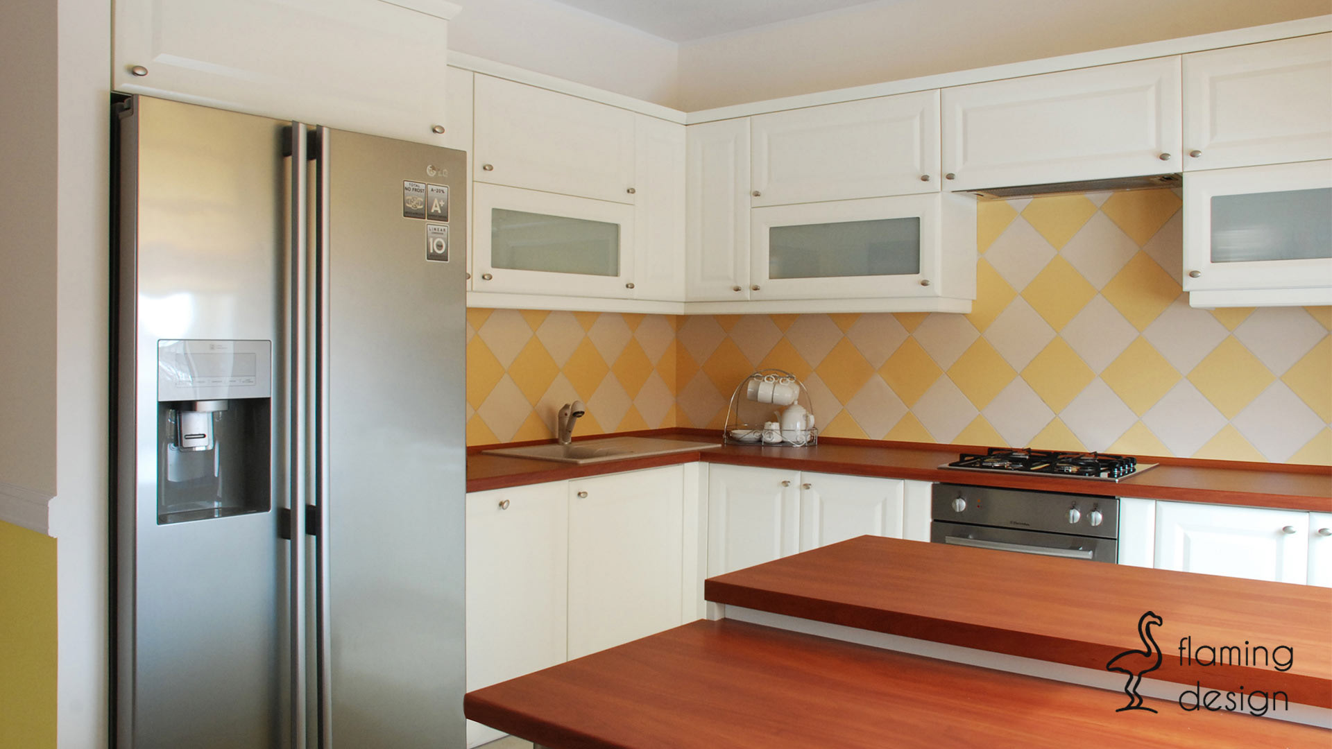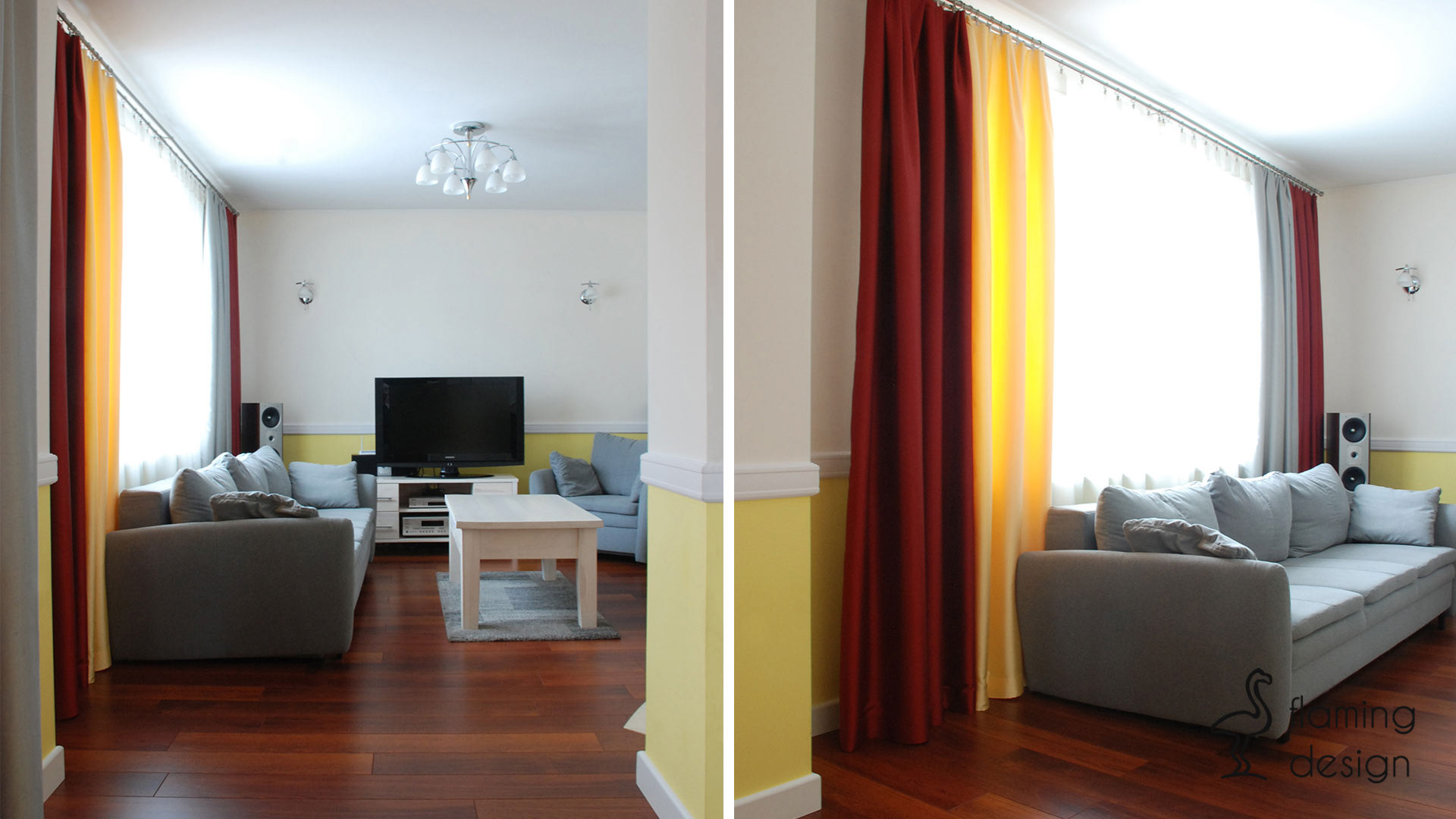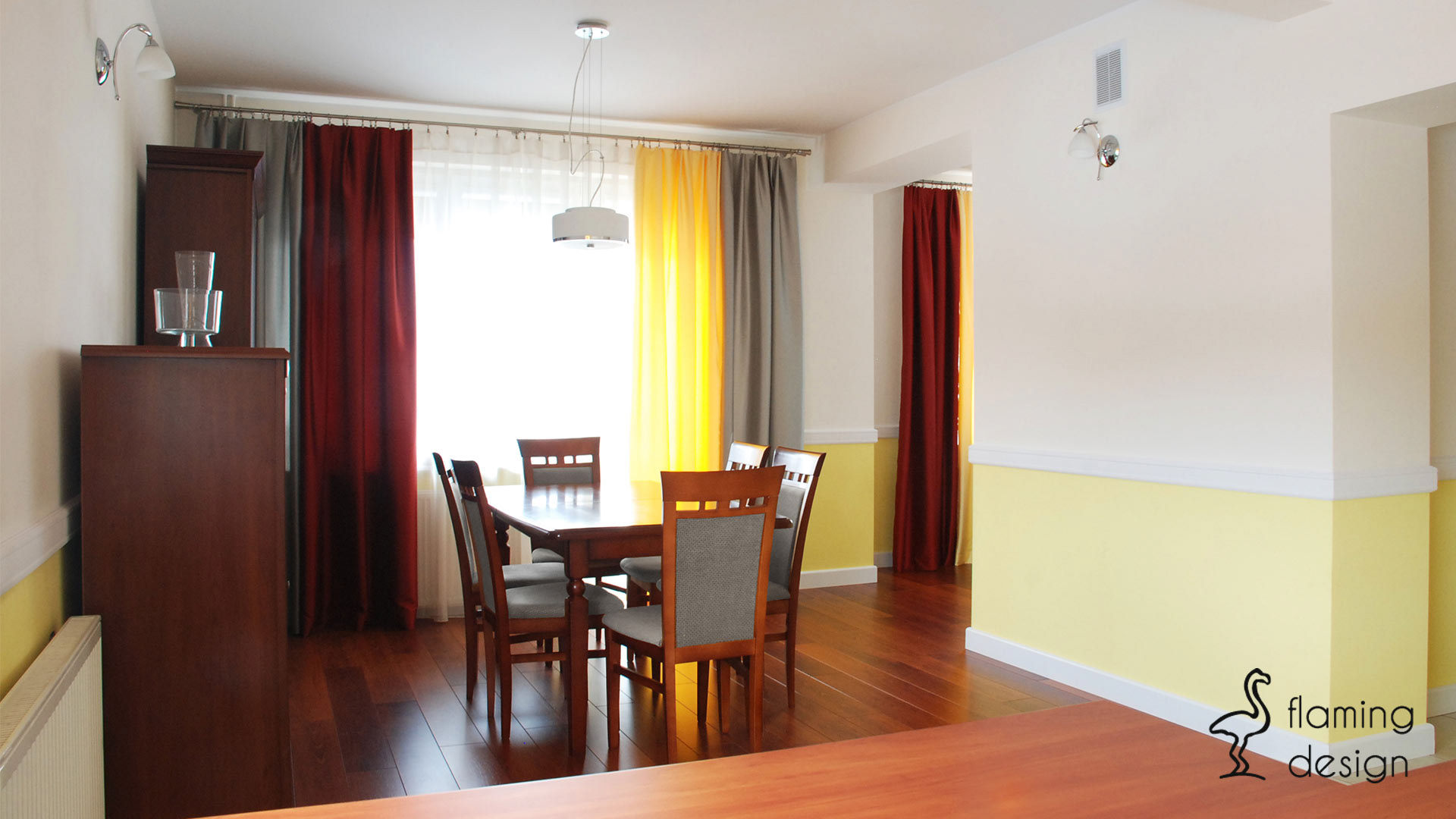 Projekt zakładał generalny remont parteru istniejącego domu jednorodzinnego. Wyburzono część ścian pomiędzy salonem, jadalnią oraz kuchnią, dzięki temu zabiegowi uzyskano większą przestrzeń. Aranżacja wnętrz musiała nawiązywać do mebli z jadalni posiadanych przez właścicieli, dlatego zaprojektowano drewniany parkiet w kolorze mebli. Obudowę nowego kominka wybrali inwestorzy, w salonie ustawiono nową sofę oraz meble. Część ścian całego parteru oraz klatki schodowej pomalowano na kolor jasny żółty, w oknach powieszono zasłony w trzech kolorach, które pasują do całości wnętrza. Zabudowa szafek kuchennych w kształcie litery L wraz z niskim barkiem jest bardzo funkcjonalna. Płytki w łazience nawiązują do klasycznego stylu, a bordowe dodatki do pozostałych pomieszczeń.