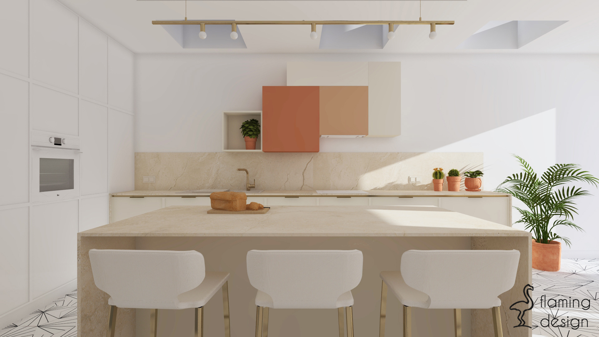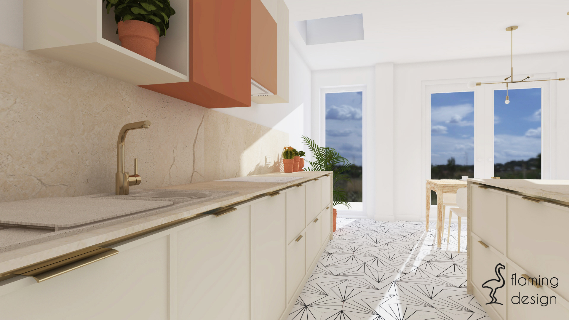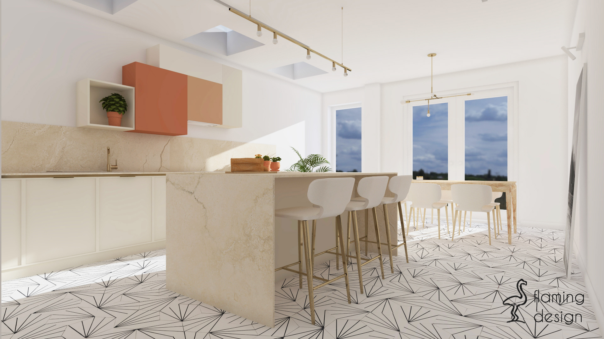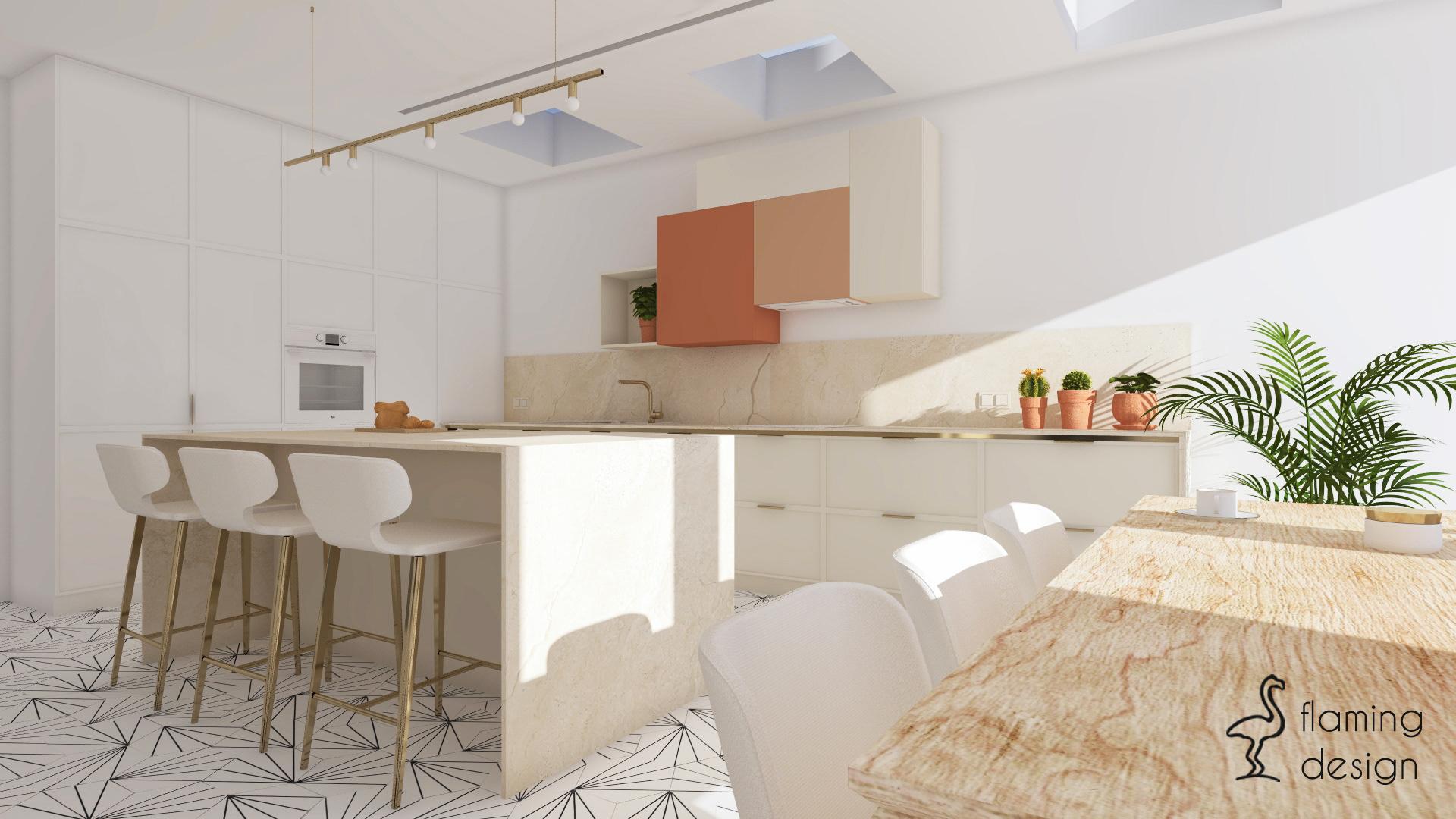 Projekt nowoczesnej kuchni w Londynie, gdzie dominuje biel, beż, naturalne drewno oraz odcienie koloru terakota. Funkcjonalny układ szafek oraz wyspa tworzą kuchnię przyjaznym pomieszczeniem do pracy i wspólnych posiłków. Uwagę zwracają mosiężne dodatki w postaci uchwytów, baterii kuchennej czy oświetlenia. Na podłodze zaprojektowano marokańskie płytki z czarno-białym wzorem, a blaty mają być wykonane ze spieków kwarcowych w kolorze beżowym.