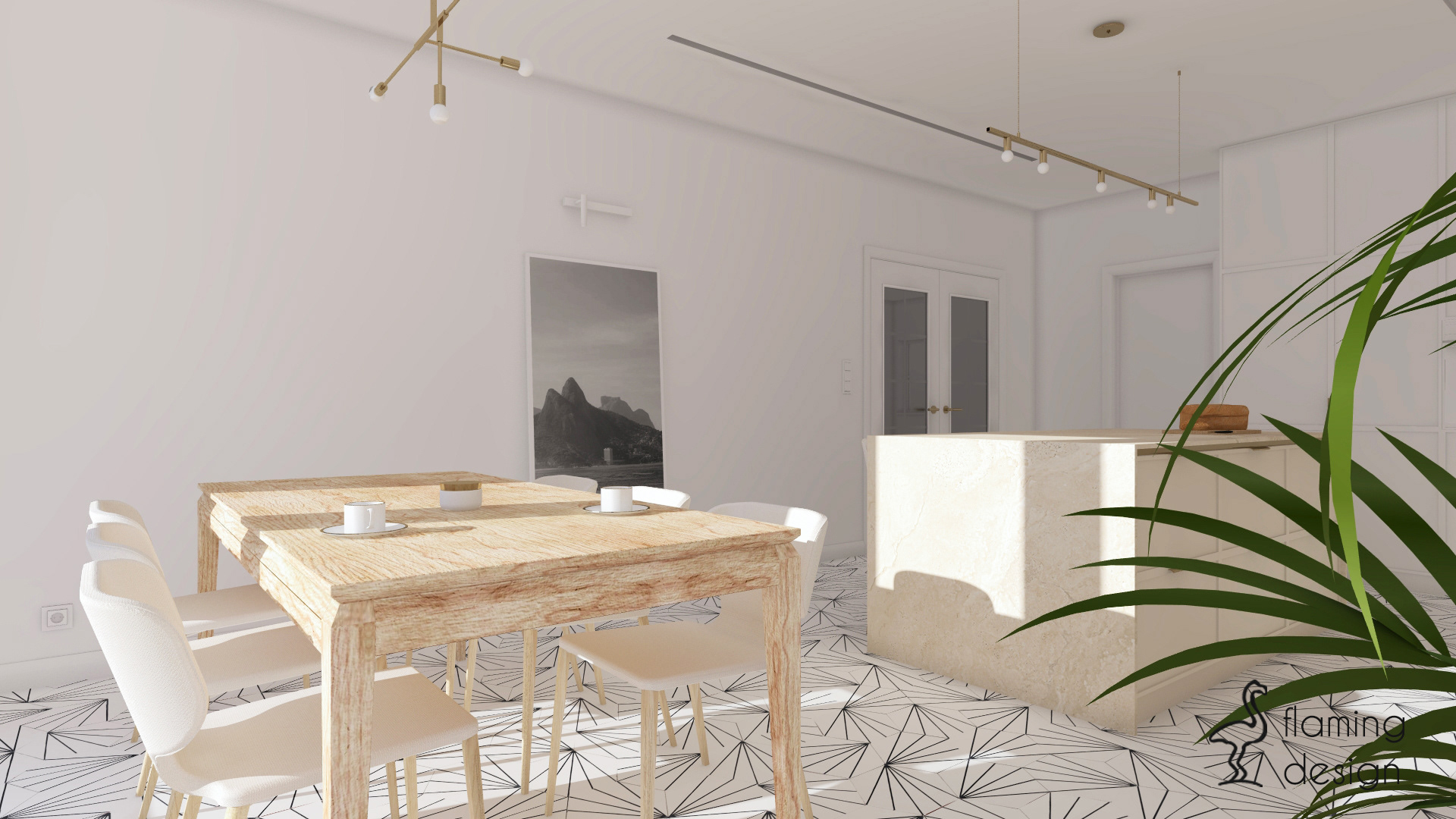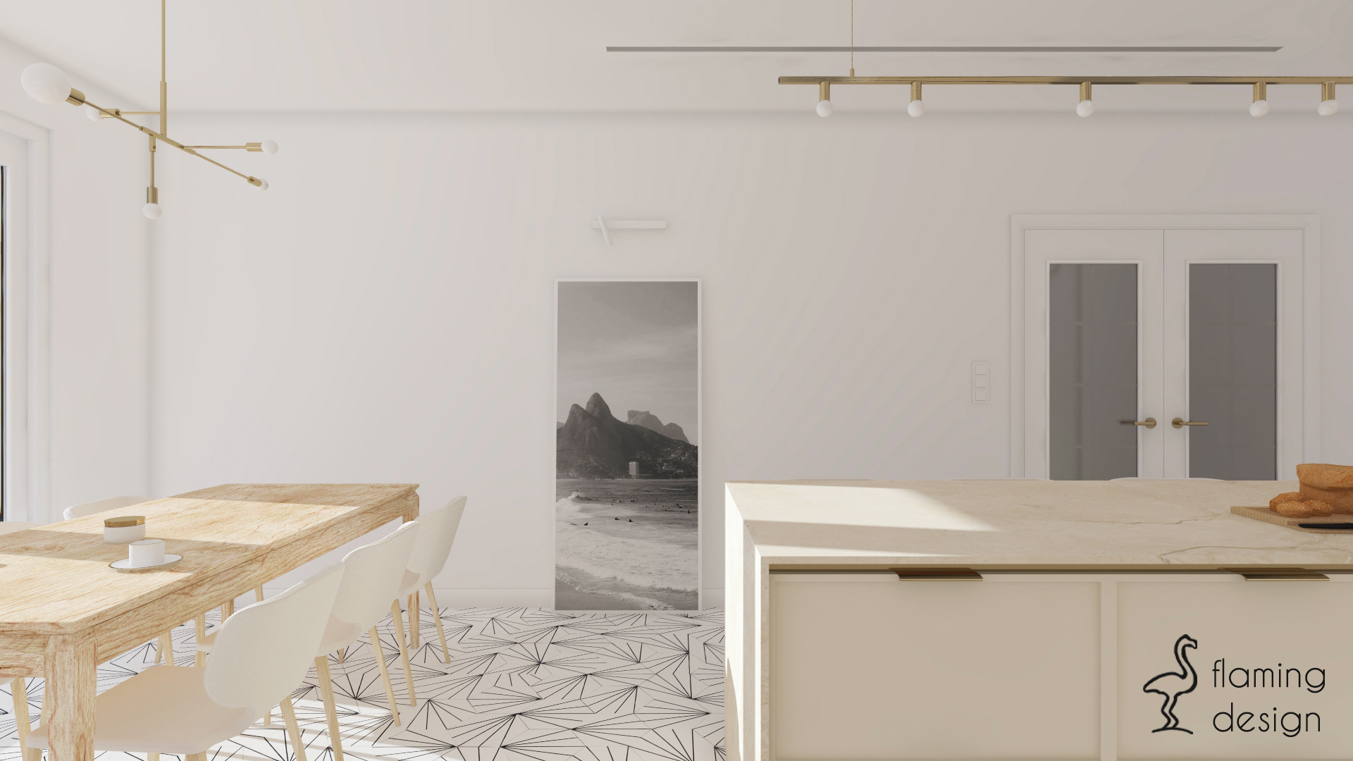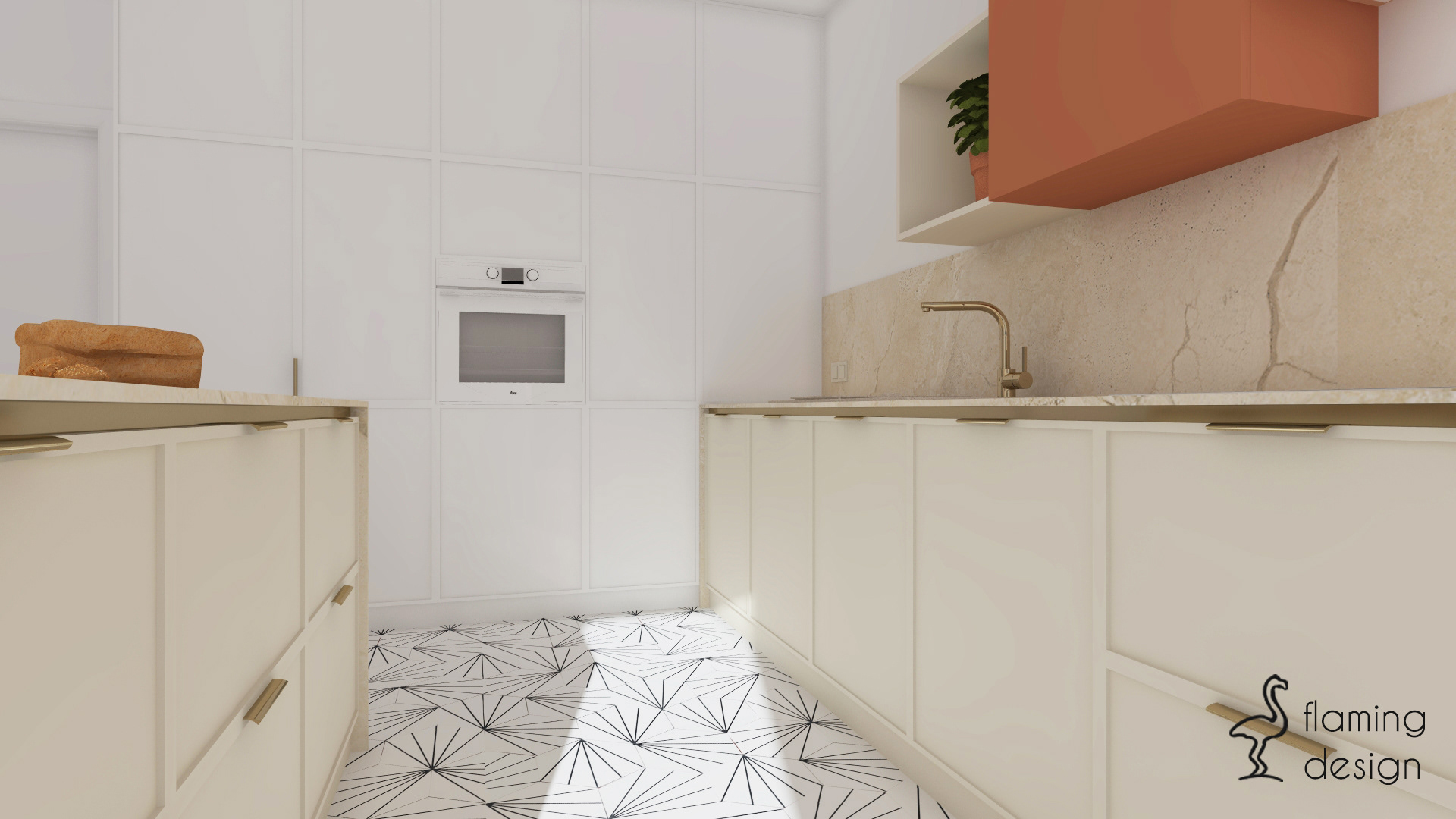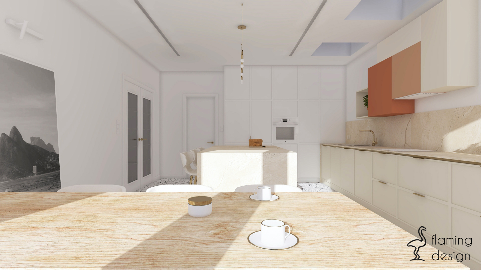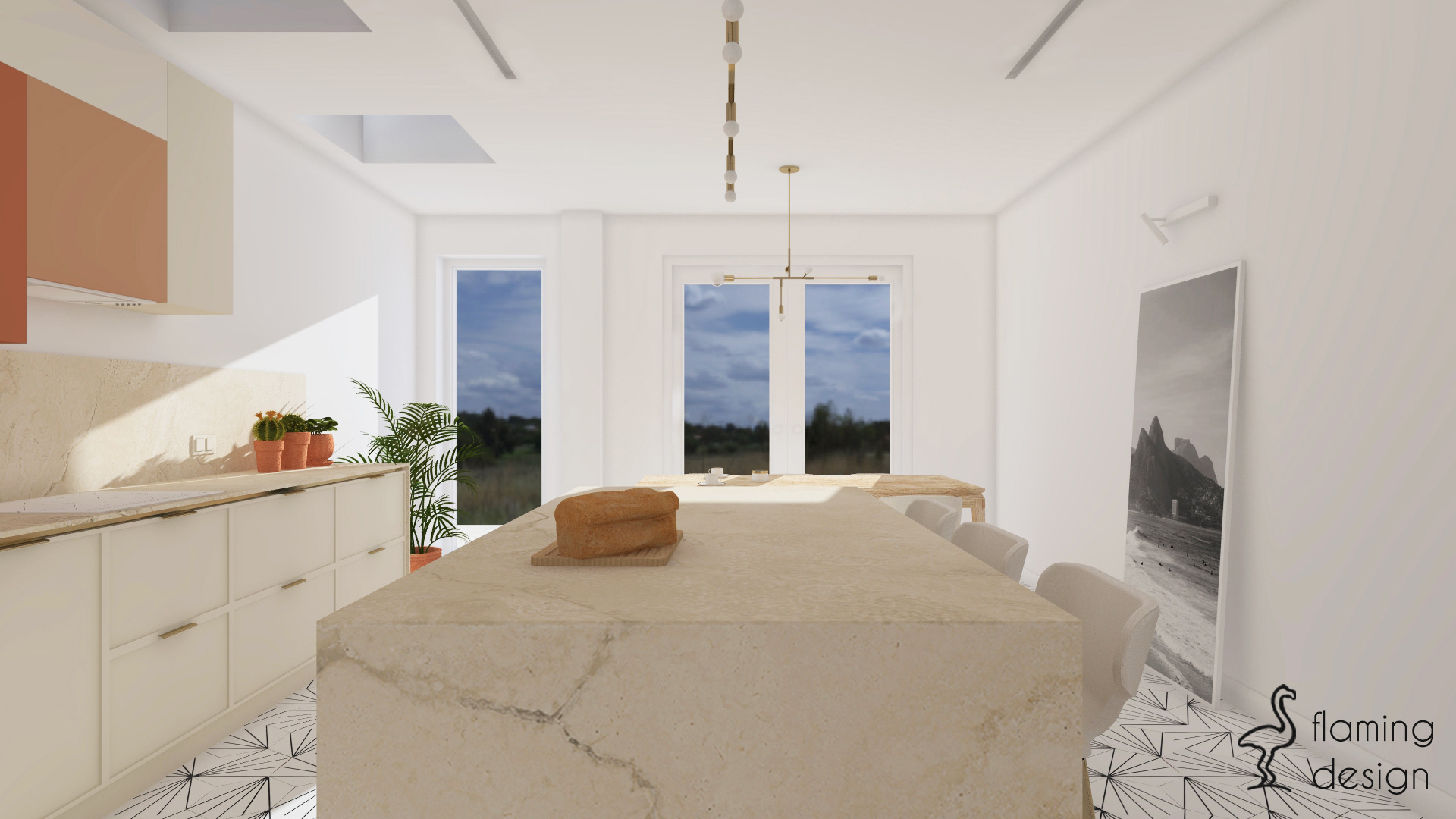 Projekt nowoczesnej kuchni w Londynie, gdzie dominuje biel, beż, naturalne drewno oraz odcienie koloru terakota. Funkcjonalny układ szafek oraz wyspa tworzą kuchnię przyjaznym pomieszczeniem do pracy i wspólnych posiłków. Uwagę zwracają mosiężne dodatki w postaci uchwytów, baterii kuchennej czy oświetlenia. Na podłodze zaprojektowano marokańskie płytki z czarno-białym wzorem, a blaty mają być wykonane ze spieków kwarcowych w kolorze beżowym.