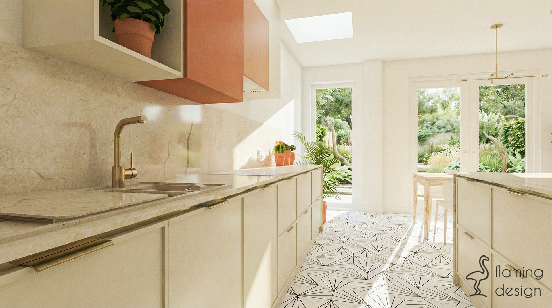 Prezentowana aranżacja kuchni w Londynie to połączenie nowoczesnej estetyki z funkcjonalnością, idealne dla wymagających użytkowników. Wnętrze bazuje na jasnej palecie barw, w której dominują biele i beże, przełamane akcentami w kolorze terakoty oraz naturalnym drewnem.