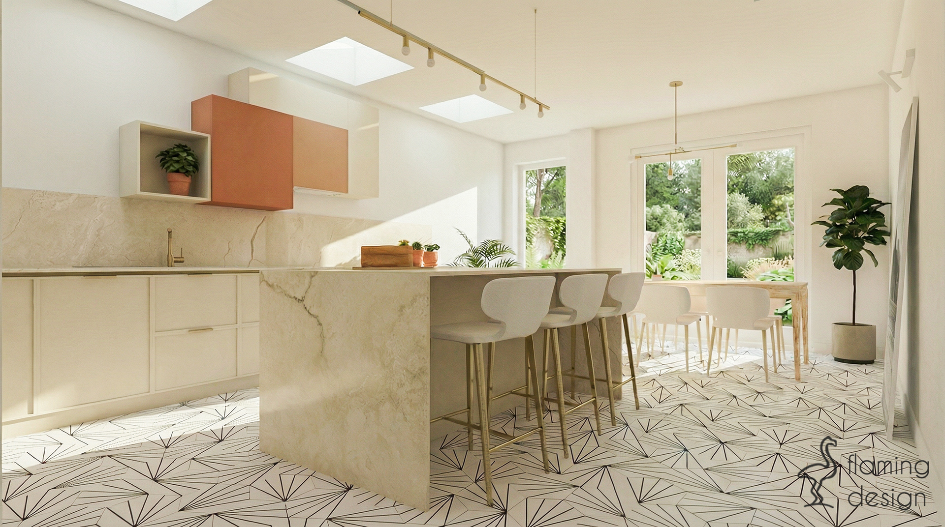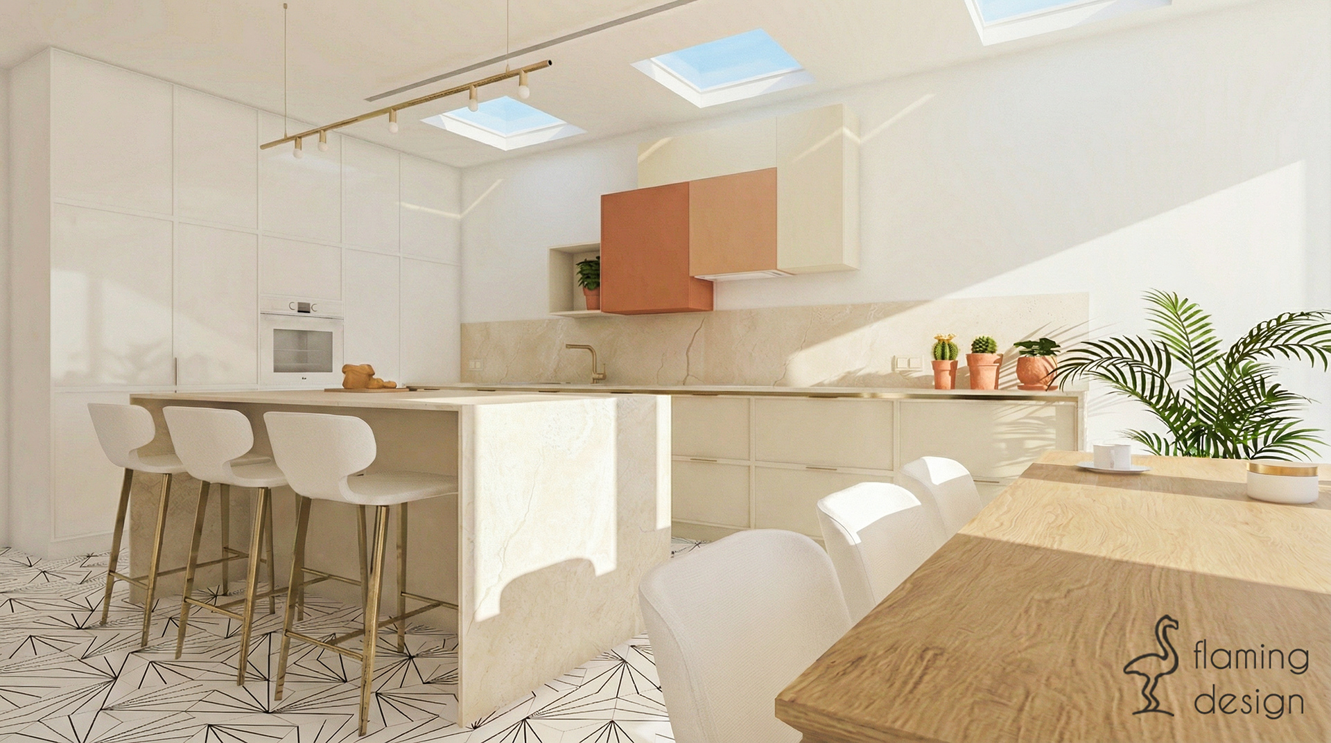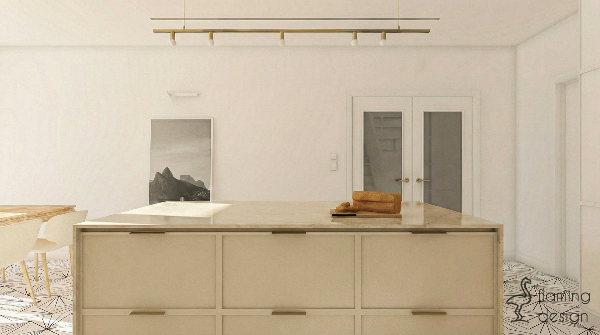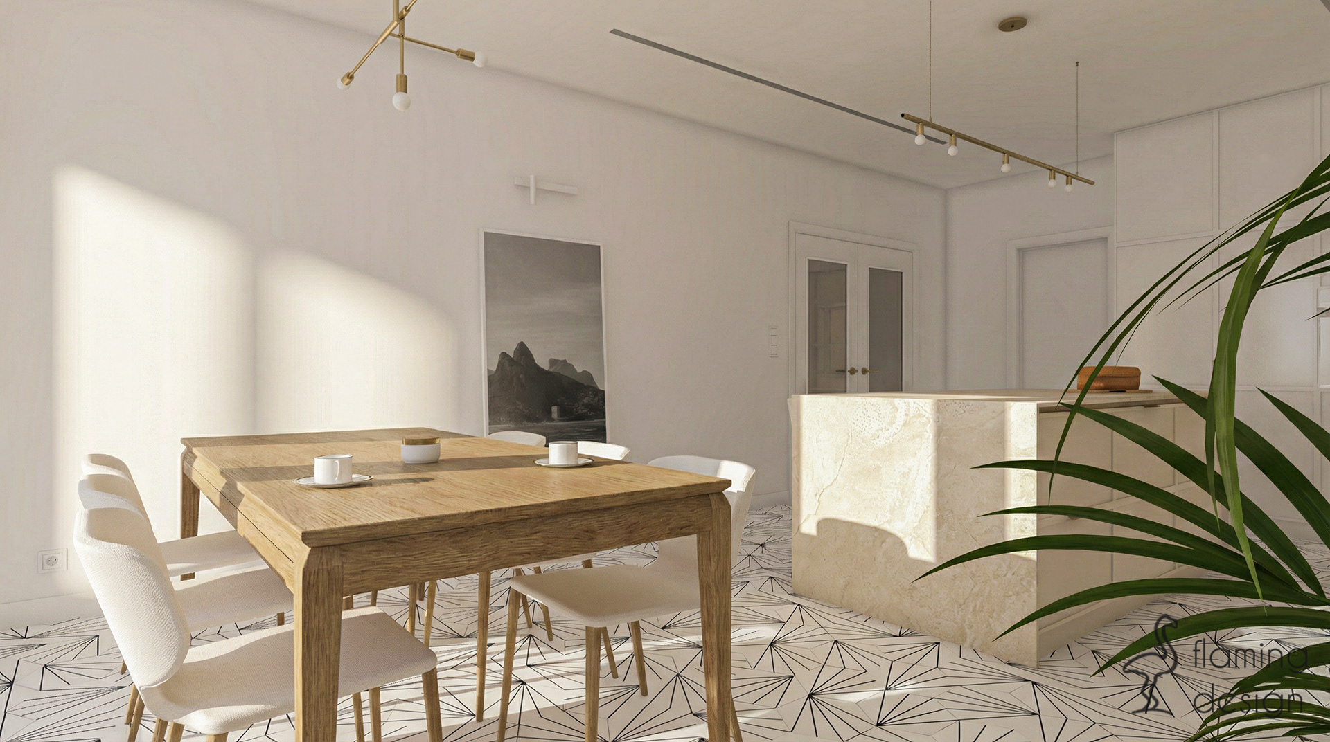 Całość wystroju wnętrza dopełniają podłogi wyłożone marokańskimi płytkami w czarno-biały wzór, które wprowadzają ciekawy kontrast. Ten projekt wnętrz to przykład harmonii między designerskim wyglądem a najwyższą wygodą codziennego użytkowania.