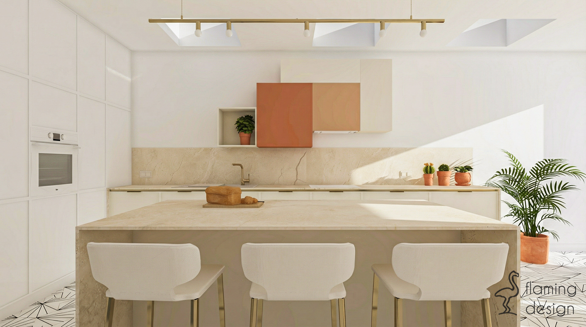 Centralnym punktem pomieszczenia jest funkcjonalna wyspa kuchenna, która tworzy przyjazną przestrzeń zarówno do przygotowywania posiłków, jak i wspólnego spędzania czasu. Uwagę zwracają meble na wymiar z przemyślanym układem szafek oraz blaty wykonane z trwałego spieku kwarcowego. Wyjątkowego charakteru dodają luksusowe mosiężne dodatki, takie jak uchwyty, bateria kuchenna oraz nowoczesne oświetlenie.