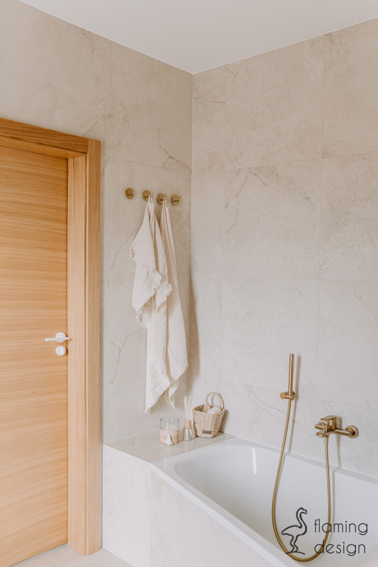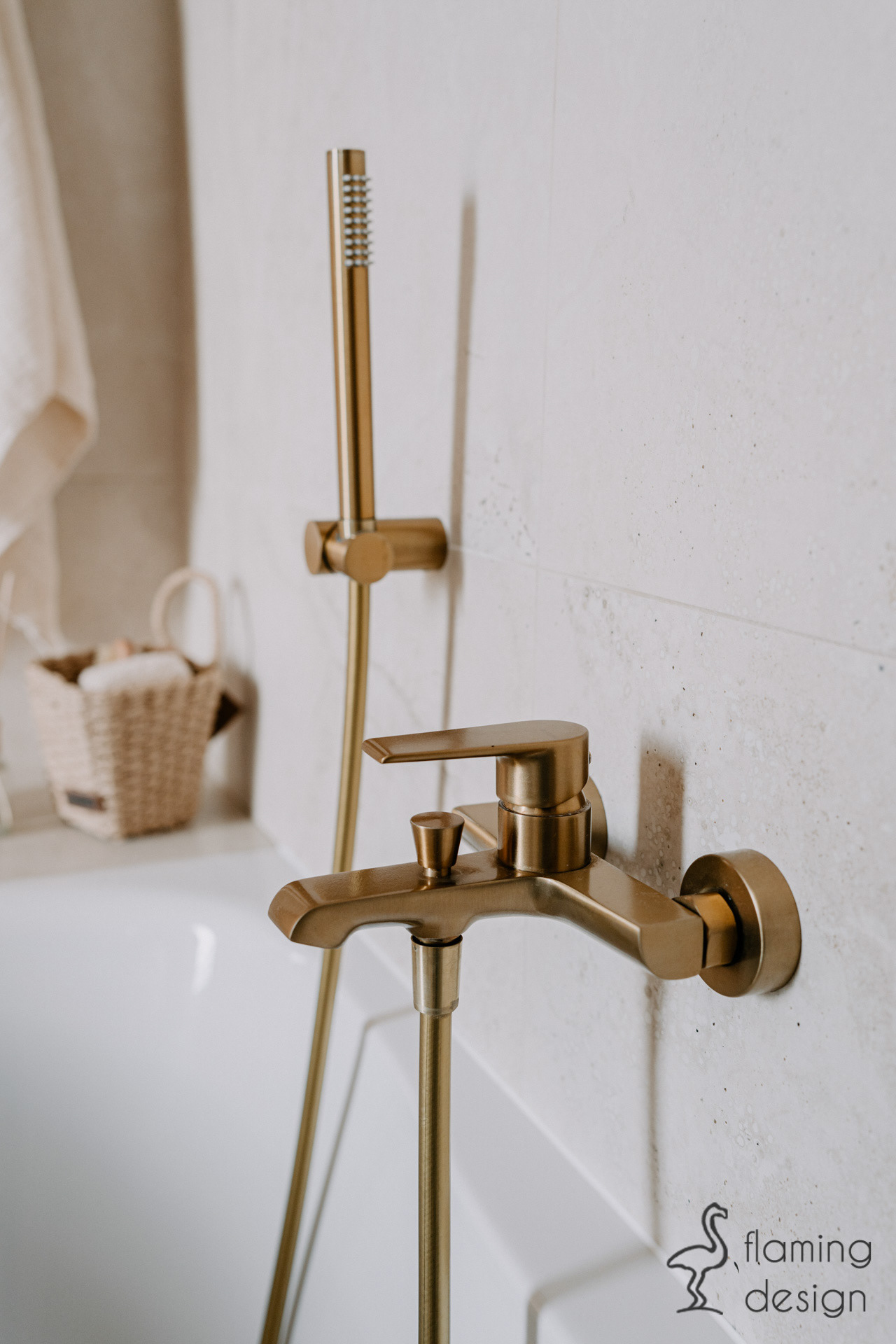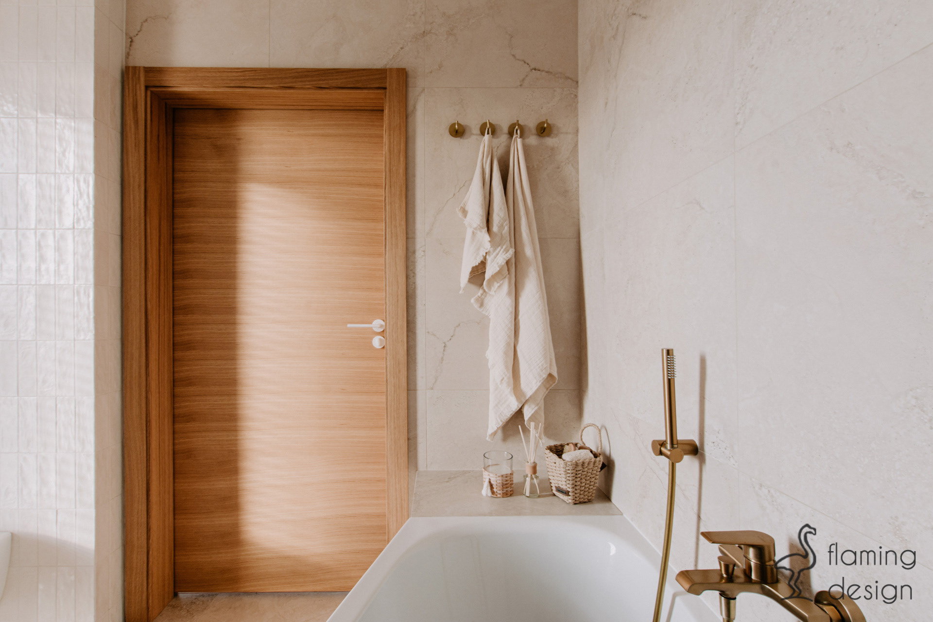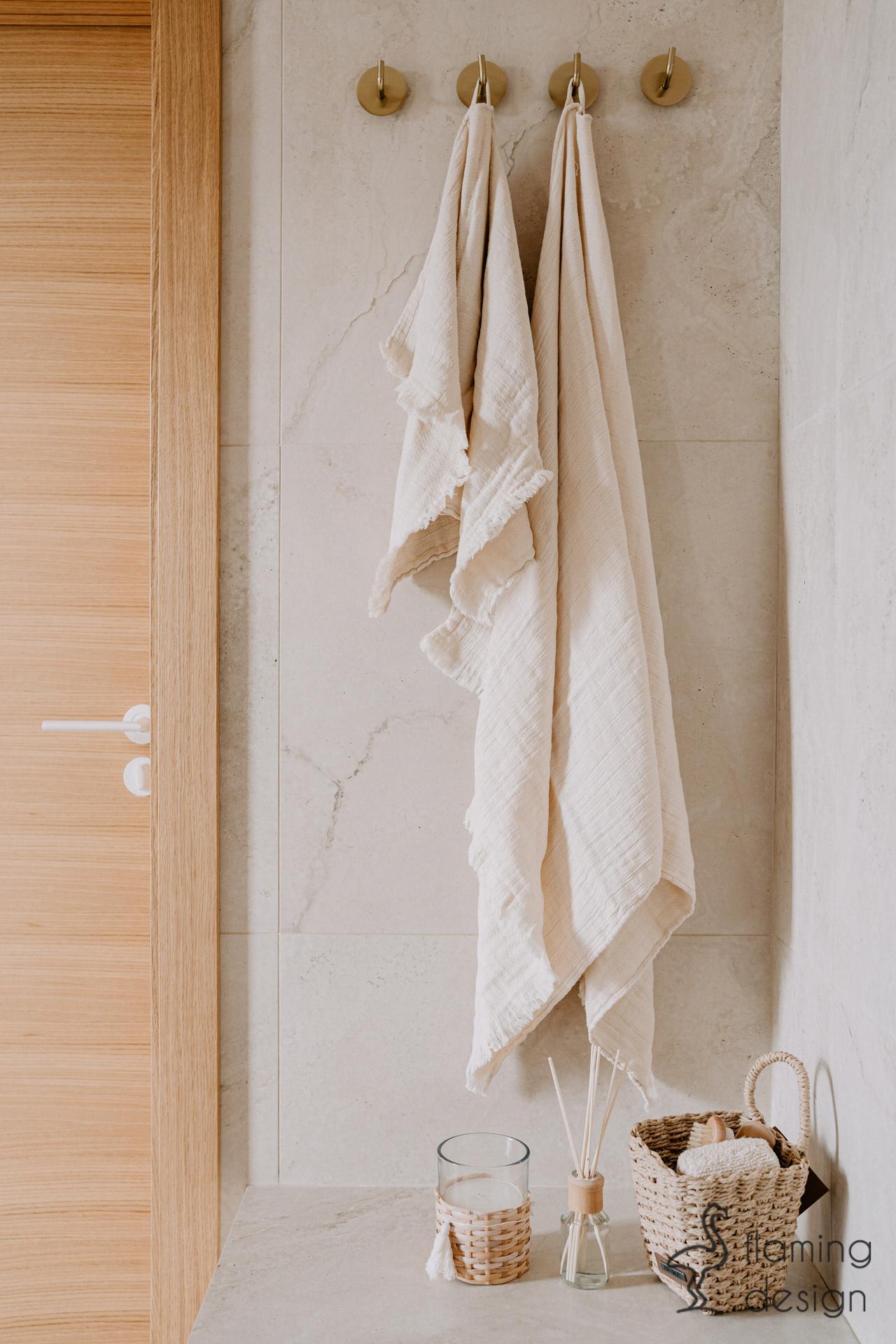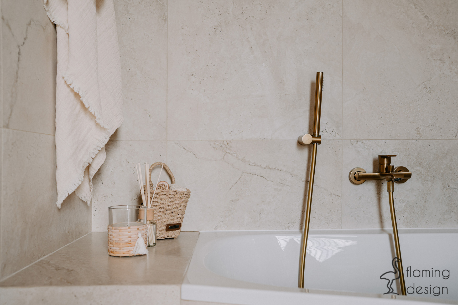 Realizacja łazienki w domu jednorodzinnym. Projekt średniej wielkości łazienki zakładał wygospodarowanie jak najwięcej miejsca, dlatego zdecydowano się na połączenie wanny i prysznica, co odpowiada inwestorom. W przyszłości na brzegu dużej wanny ma być zamontowany parawan nawannowy. Na wprost wejścia usytuowano dużą szafkę z szeroką umywalką i baterią ścienną. Łazienkę przedzielono płytkami na dwie strefy, po lewej gdzie jest wanna zaprojektowano duże beżowe płytki imitujące trawertyn, natomiast po prawej stronie mamy białe, nierówne płytki w kształcie cegiełek. Armatura łazienkowa jest w kolorze szczotkowanego złota. Duże lustro w formie portalu/łuku nawiązuje do kształtów ceramiki. Muślinowe ręczniki oraz beżowe i drewniane akcesoria nadają styl wnętrzu.