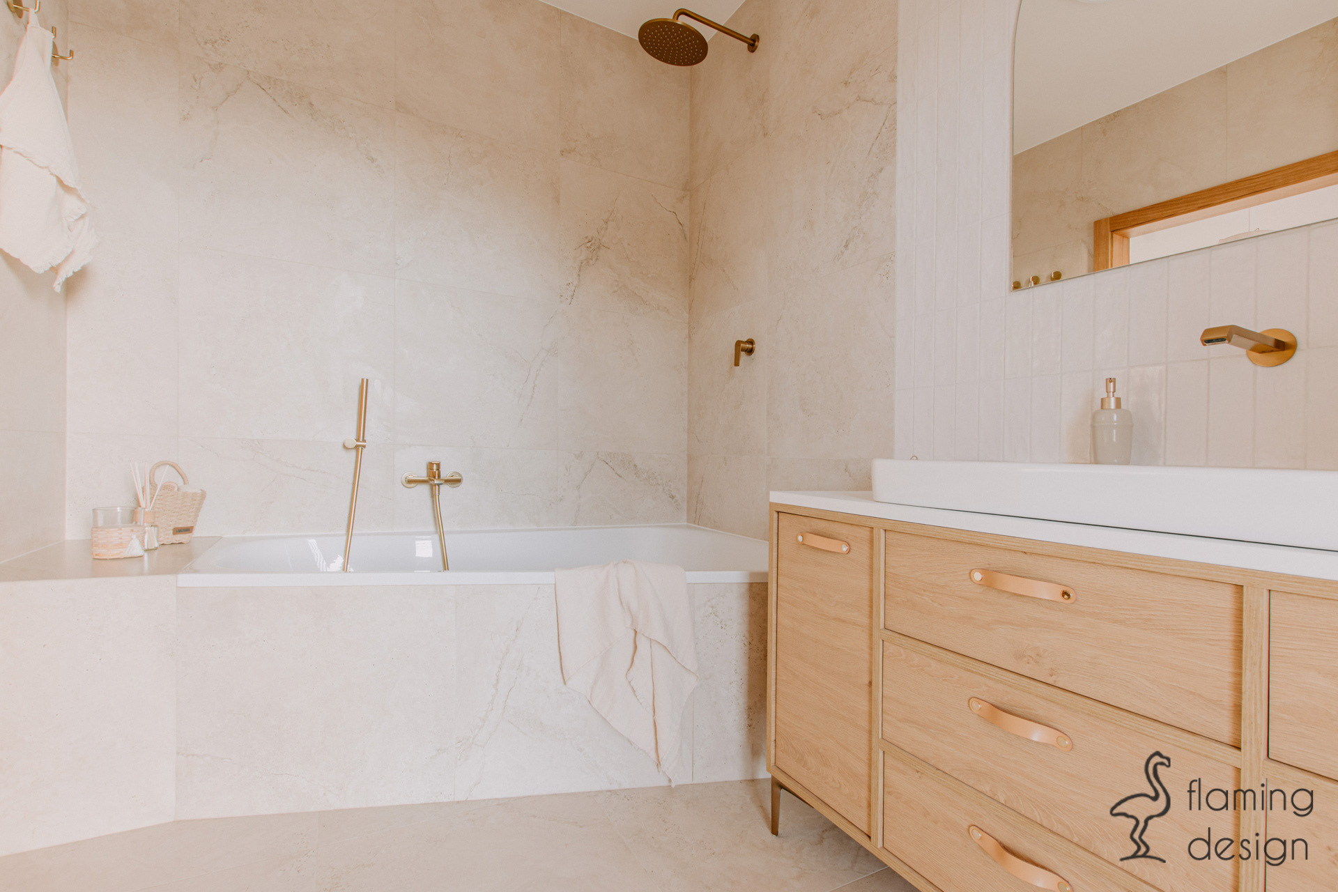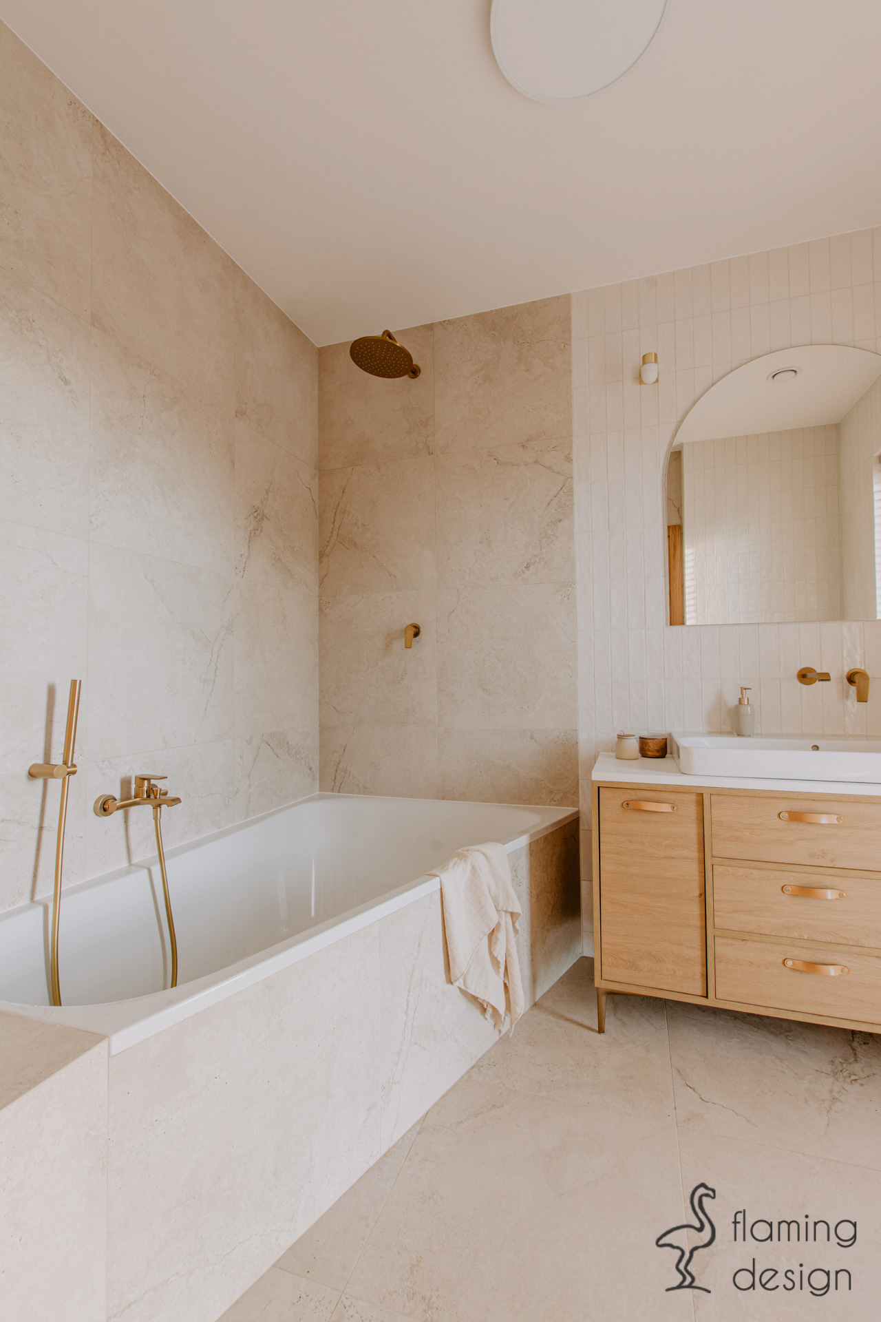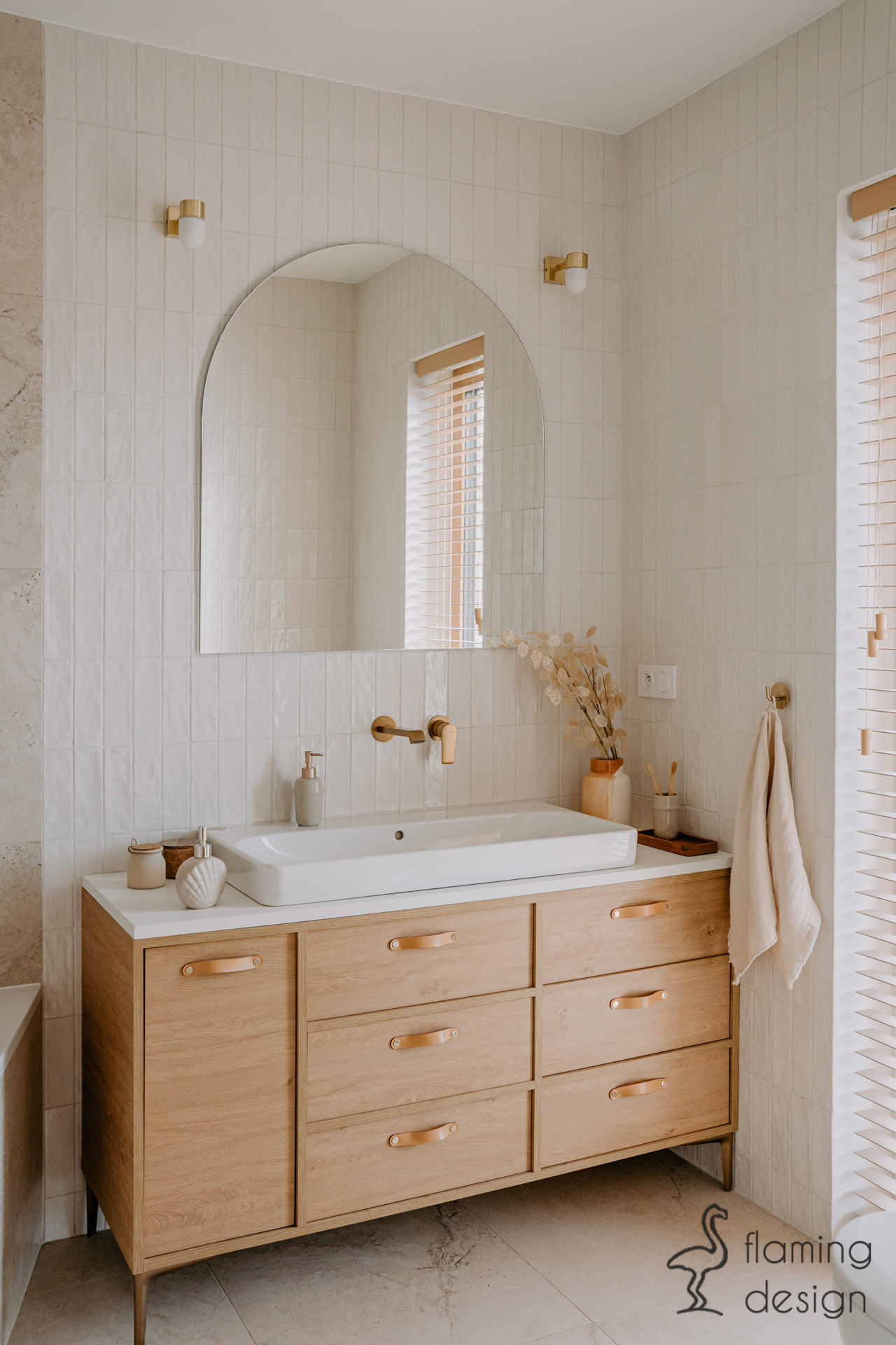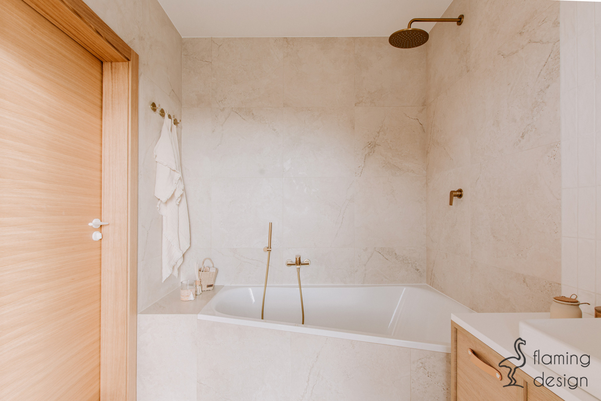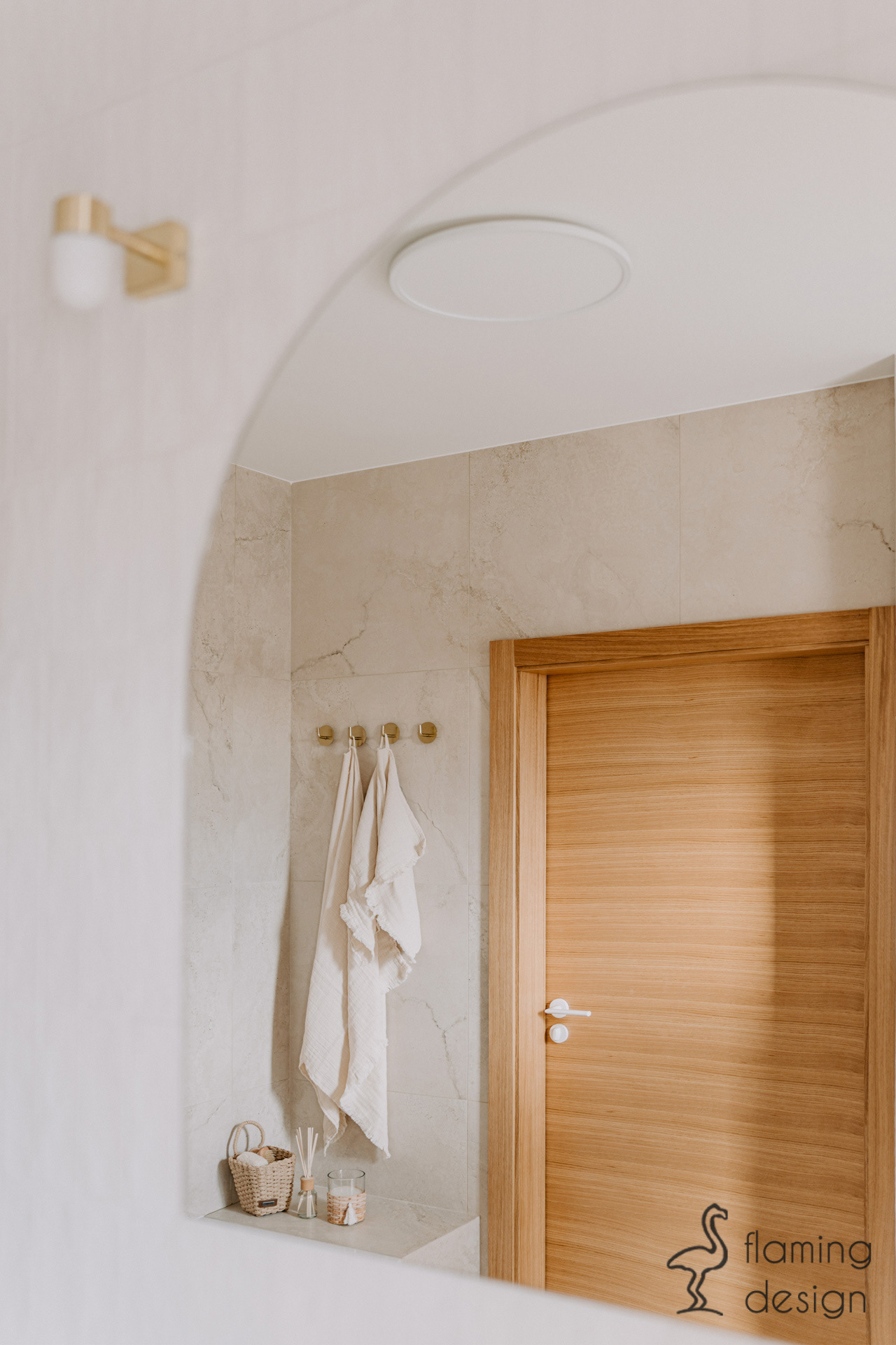 Realizacja łazienki w domu jednorodzinnym. Projekt średniej wielkości łazienki zakładał wygospodarowanie jak najwięcej miejsca, dlatego zdecydowano się na połączenie wanny i prysznica, co odpowiada inwestorom. W przyszłości na brzegu dużej wanny ma być zamontowany parawan nawannowy. Na wprost wejścia usytuowano dużą szafkę z szeroką umywalką i baterią ścienną. Łazienkę przedzielono płytkami na dwie strefy, po lewej gdzie jest wanna zaprojektowano duże beżowe płytki imitujące trawertyn, natomiast po prawej stronie mamy białe, nierówne płytki w kształcie cegiełek. Armatura łazienkowa jest w kolorze szczotkowanego złota. Duże lustro w formie portalu/łuku nawiązuje do kształtów ceramiki. Muślinowe ręczniki oraz beżowe i drewniane akcesoria nadają styl wnętrzu.