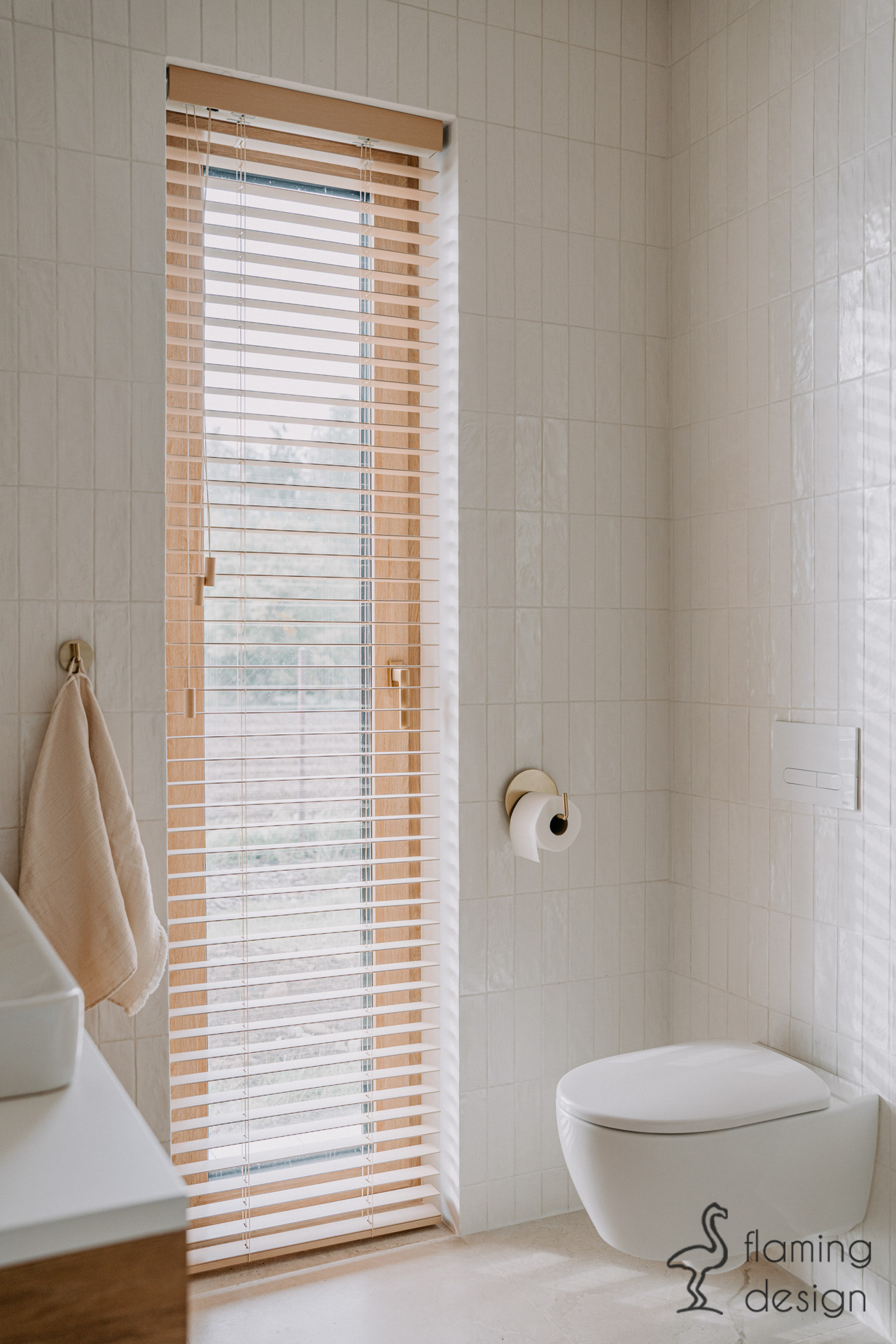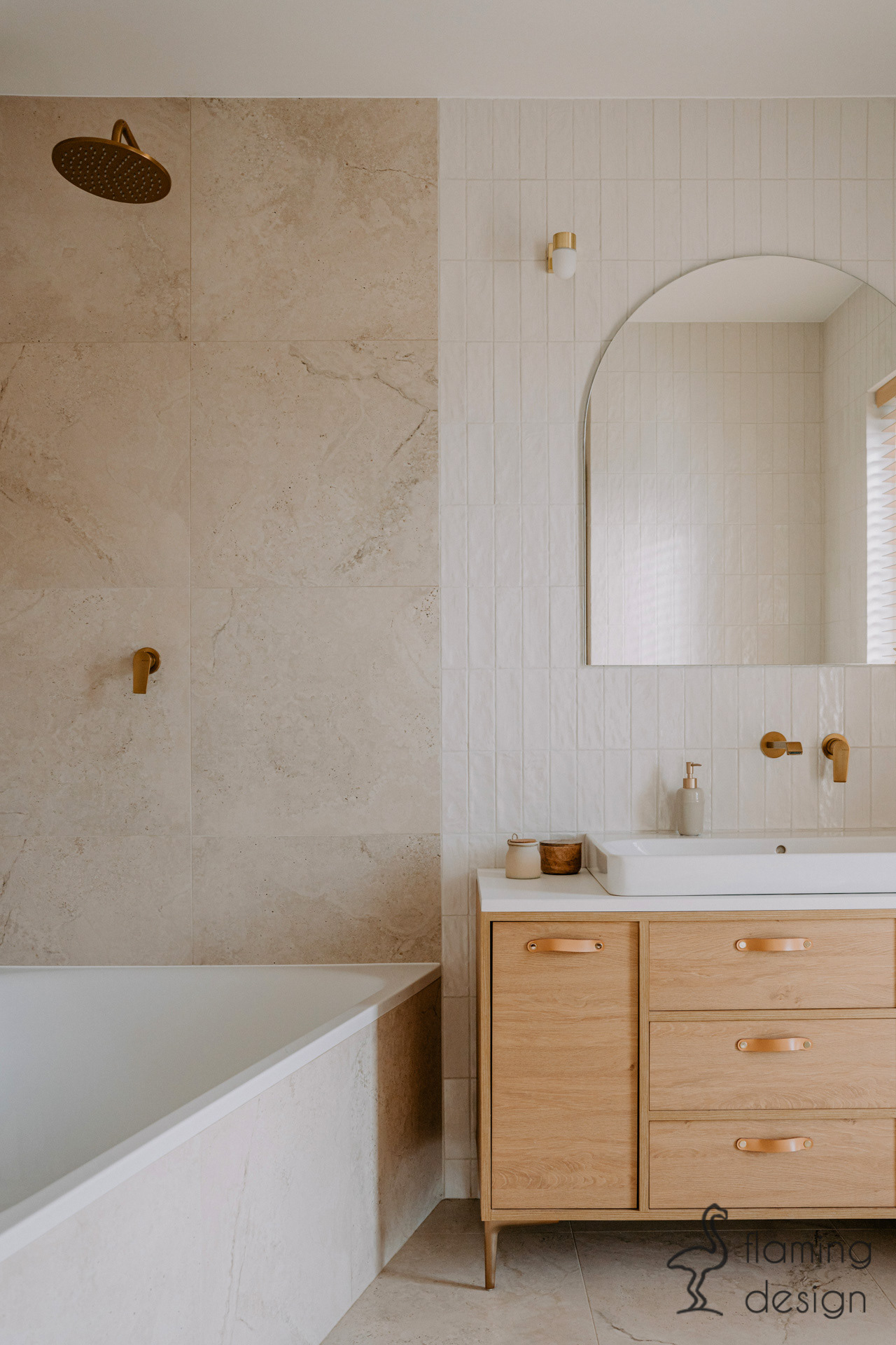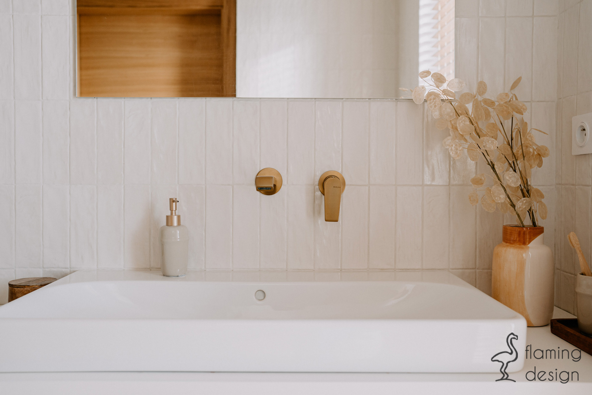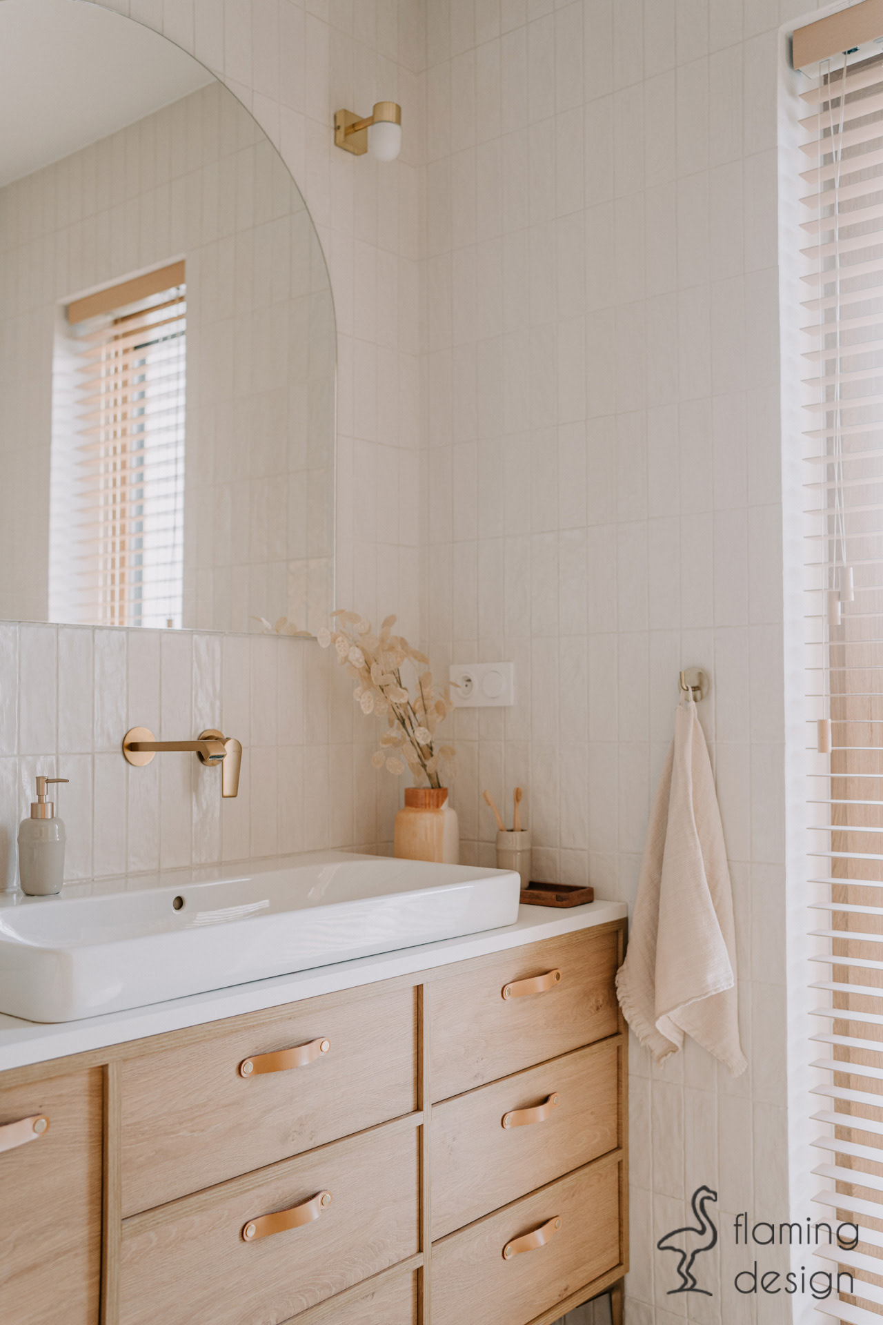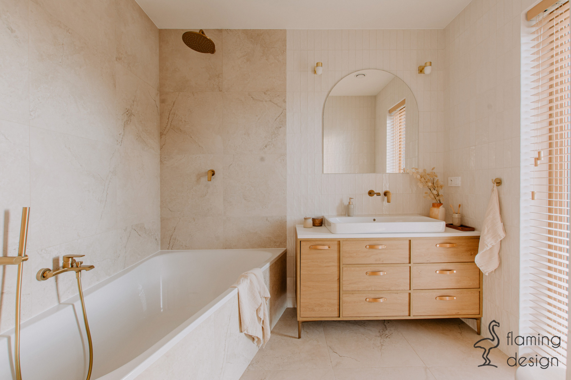 Realizacja łazienki w domu jednorodzinnym. Projekt średniej wielkości łazienki zakładał wygospodarowanie jak najwięcej miejsca, dlatego zdecydowano się na połączenie wanny i prysznica, co odpowiada inwestorom. W przyszłości na brzegu dużej wanny ma być zamontowany parawan nawannowy. Na wprost wejścia usytuowano dużą szafkę z szeroką umywalką i baterią ścienną. Łazienkę przedzielono płytkami na dwie strefy, po lewej gdzie jest wanna zaprojektowano duże beżowe płytki imitujące trawertyn, natomiast po prawej stronie mamy białe, nierówne płytki w kształcie cegiełek. Armatura łazienkowa jest w kolorze szczotkowanego złota. Duże lustro w formie portalu/łuku nawiązuje do kształtów ceramiki. Muślinowe ręczniki oraz beżowe i drewniane akcesoria nadają styl wnętrzu.