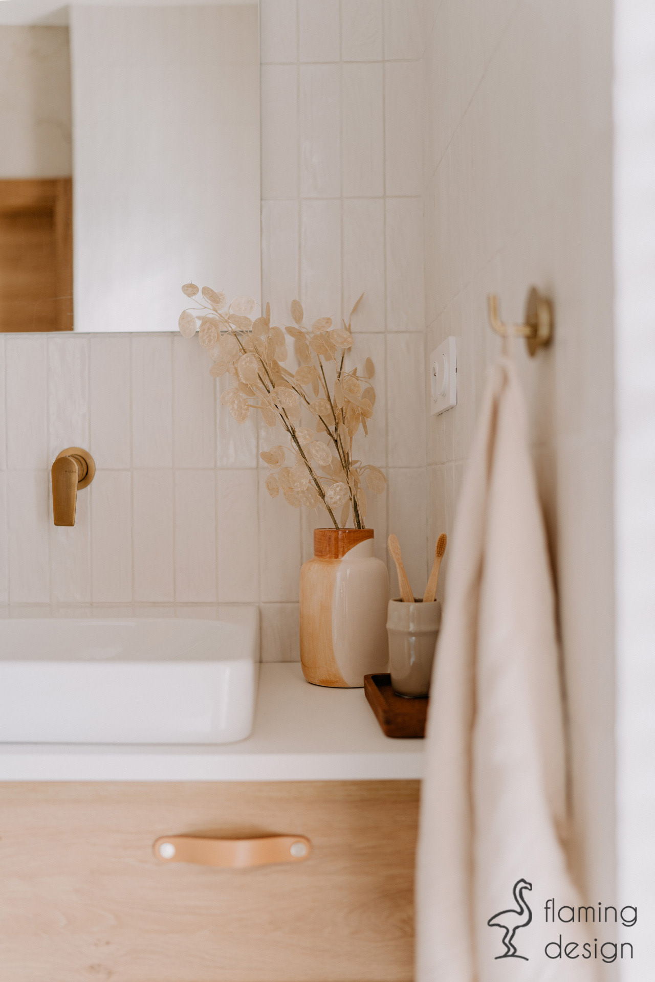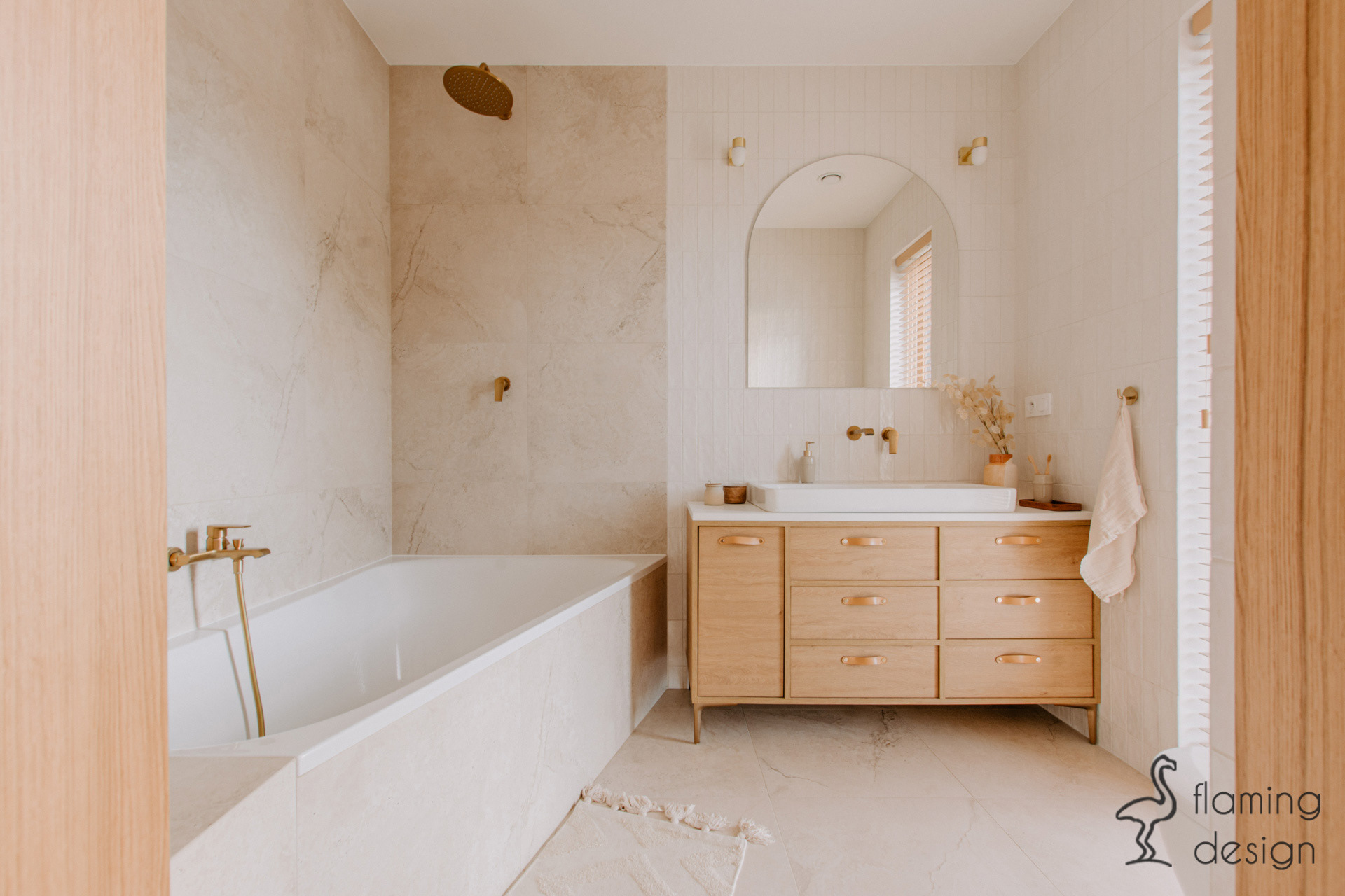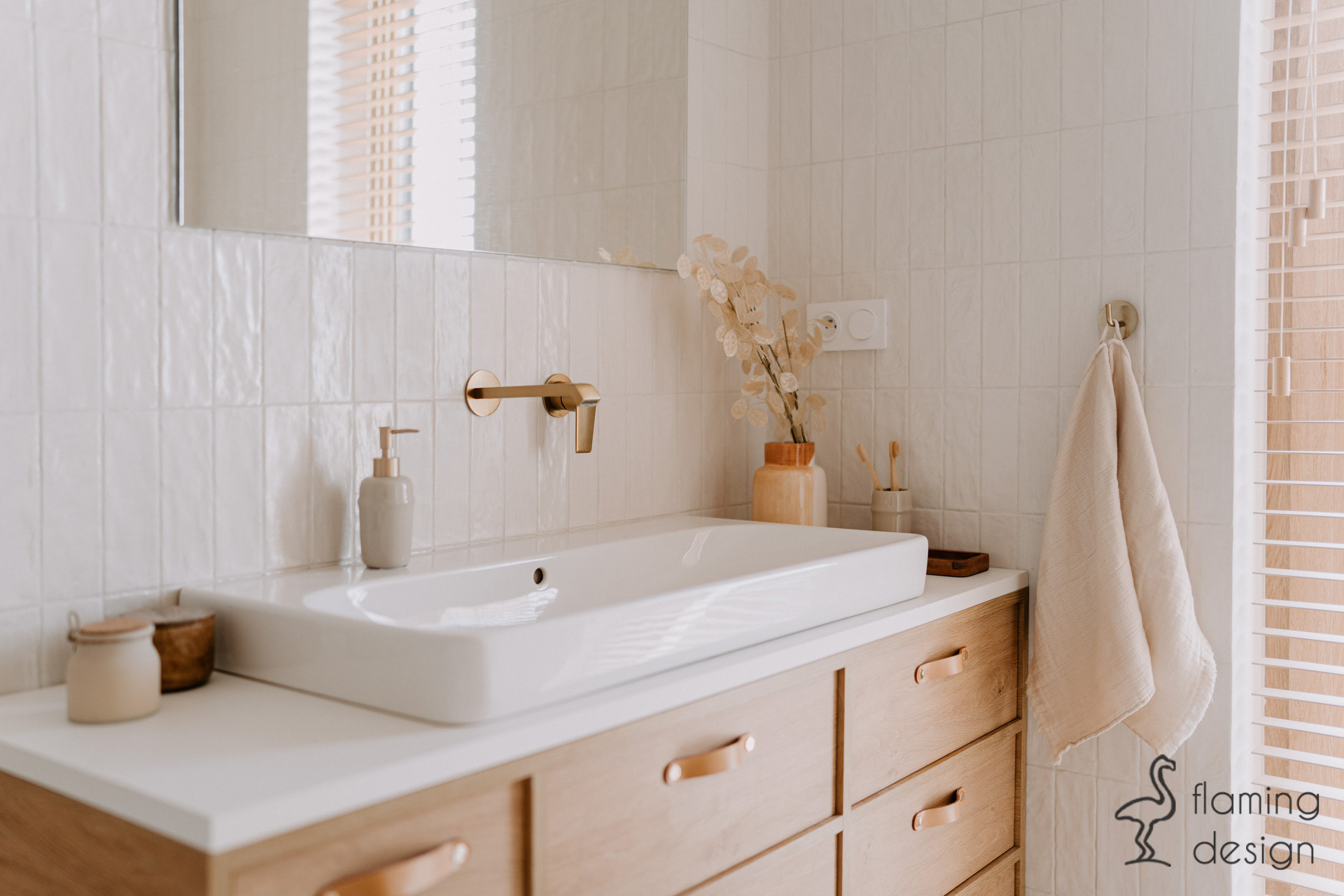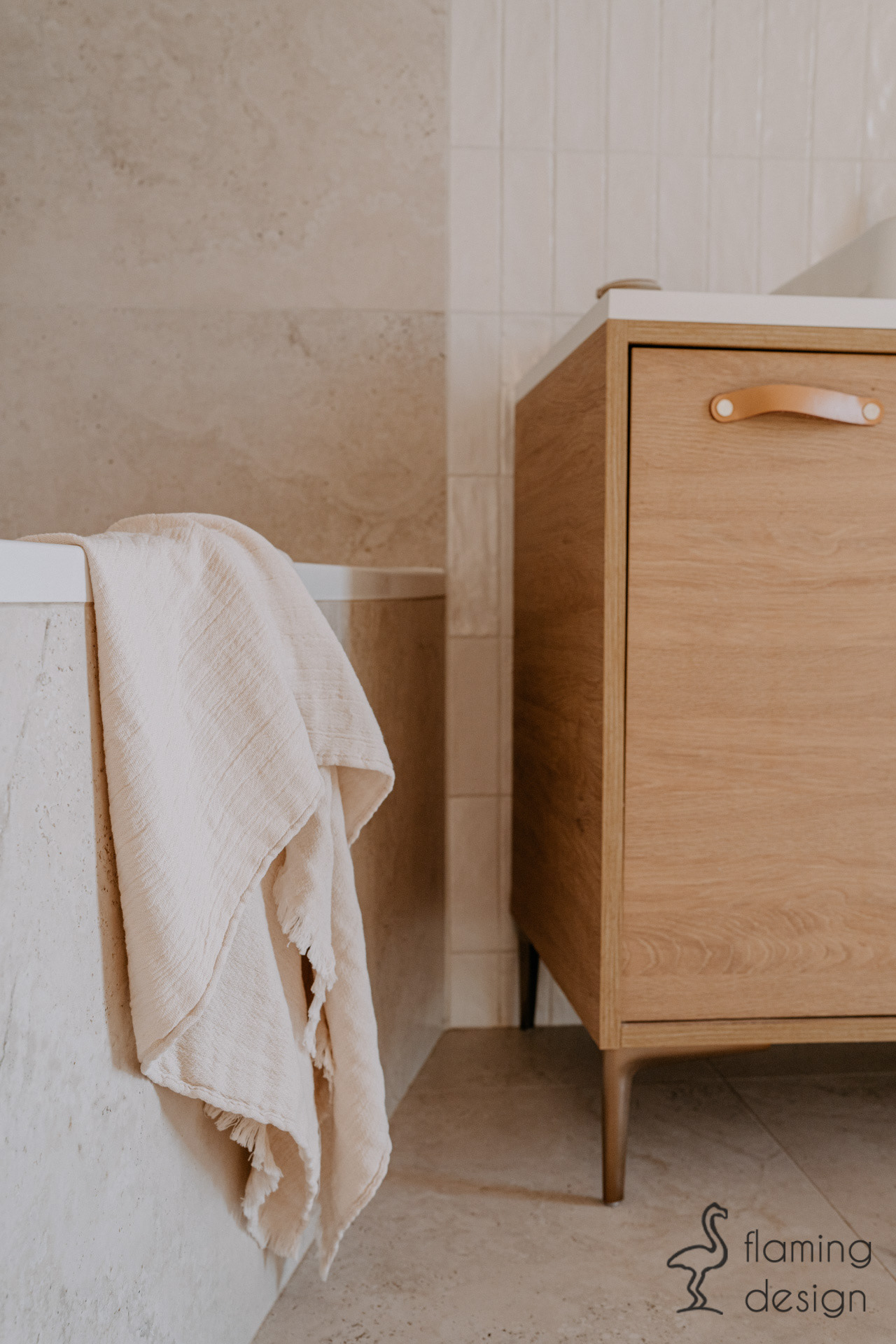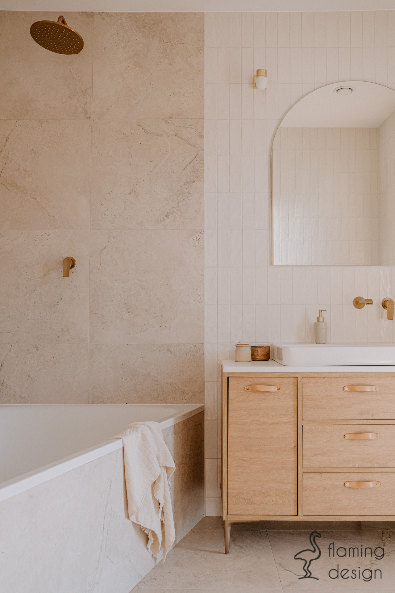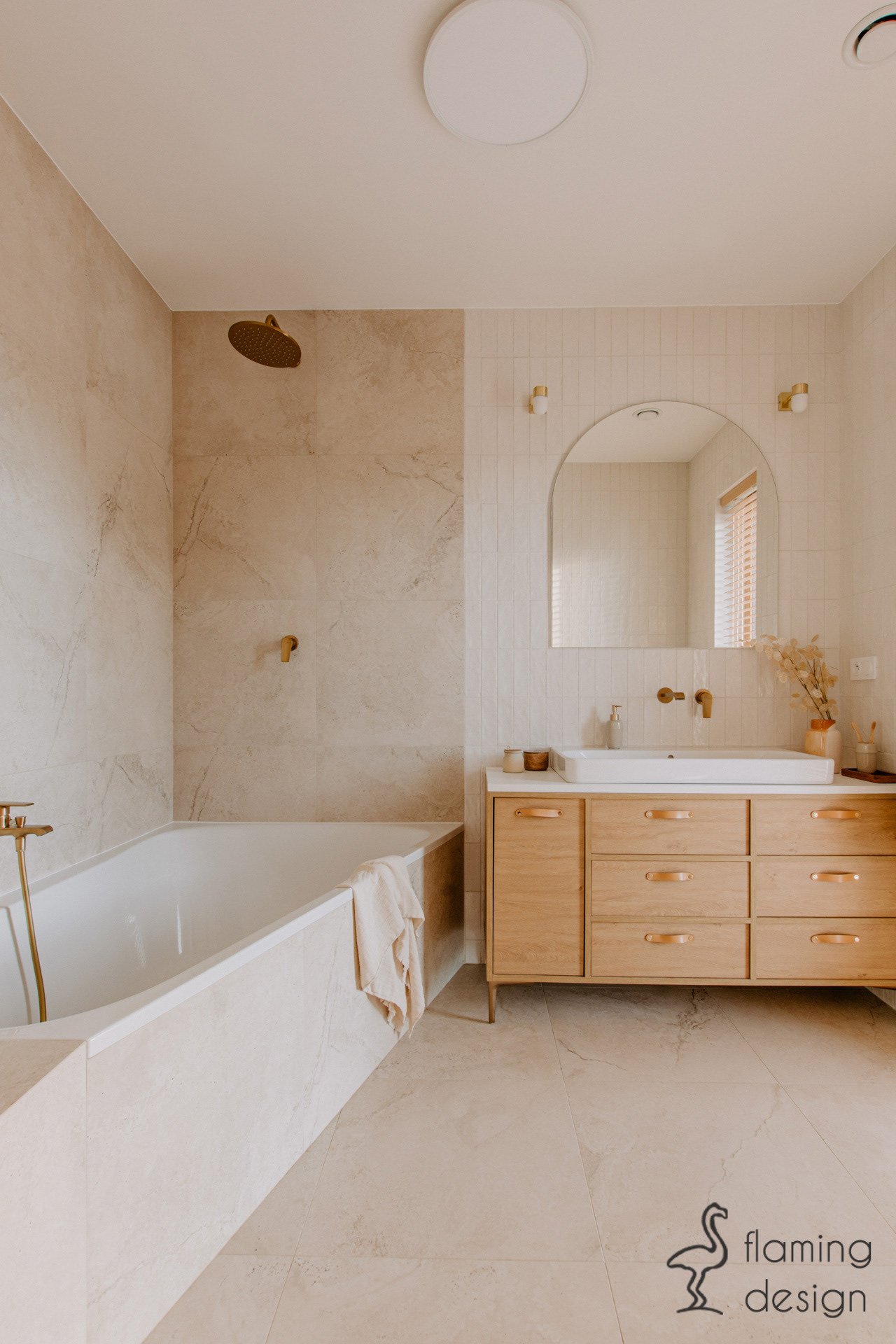 Realizacja łazienki w domu jednorodzinnym. Projekt średniej wielkości łazienki zakładał wygospodarowanie jak najwięcej miejsca, dlatego zdecydowano się na połączenie wanny i prysznica, co odpowiada inwestorom. W przyszłości na brzegu dużej wanny ma być zamontowany parawan nawannowy. Na wprost wejścia usytuowano dużą szafkę z szeroką umywalką i baterią ścienną. Łazienkę przedzielono płytkami na dwie strefy, po lewej gdzie jest wanna zaprojektowano duże beżowe płytki imitujące trawertyn, natomiast po prawej stronie mamy białe, nierówne płytki w kształcie cegiełek. Armatura łazienkowa jest w kolorze szczotkowanego złota. Duże lustro w formie portalu/łuku nawiązuje do kształtów ceramiki. Muślinowe ręczniki oraz beżowe i drewniane akcesoria nadają styl wnętrzu.