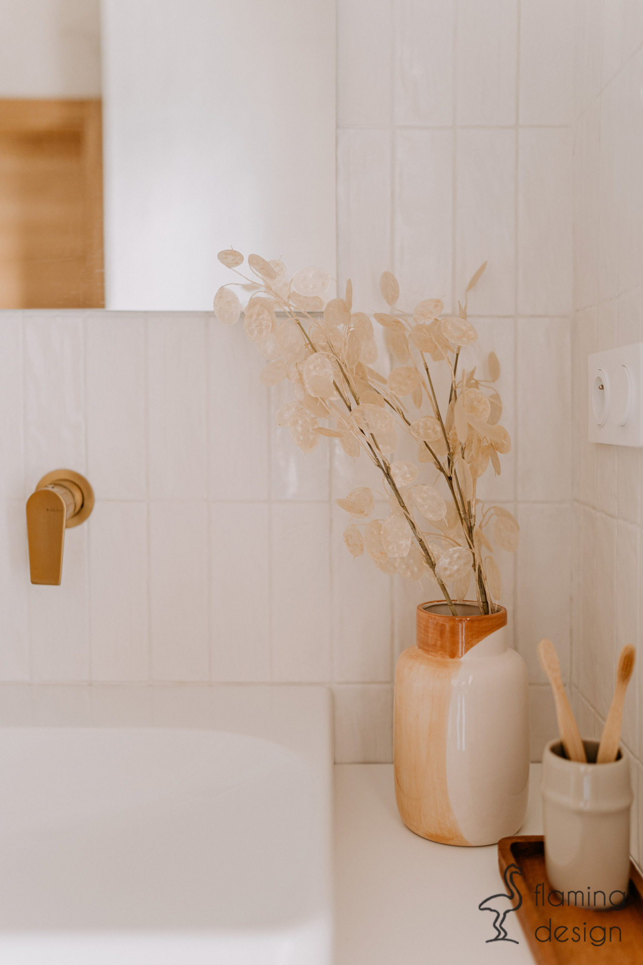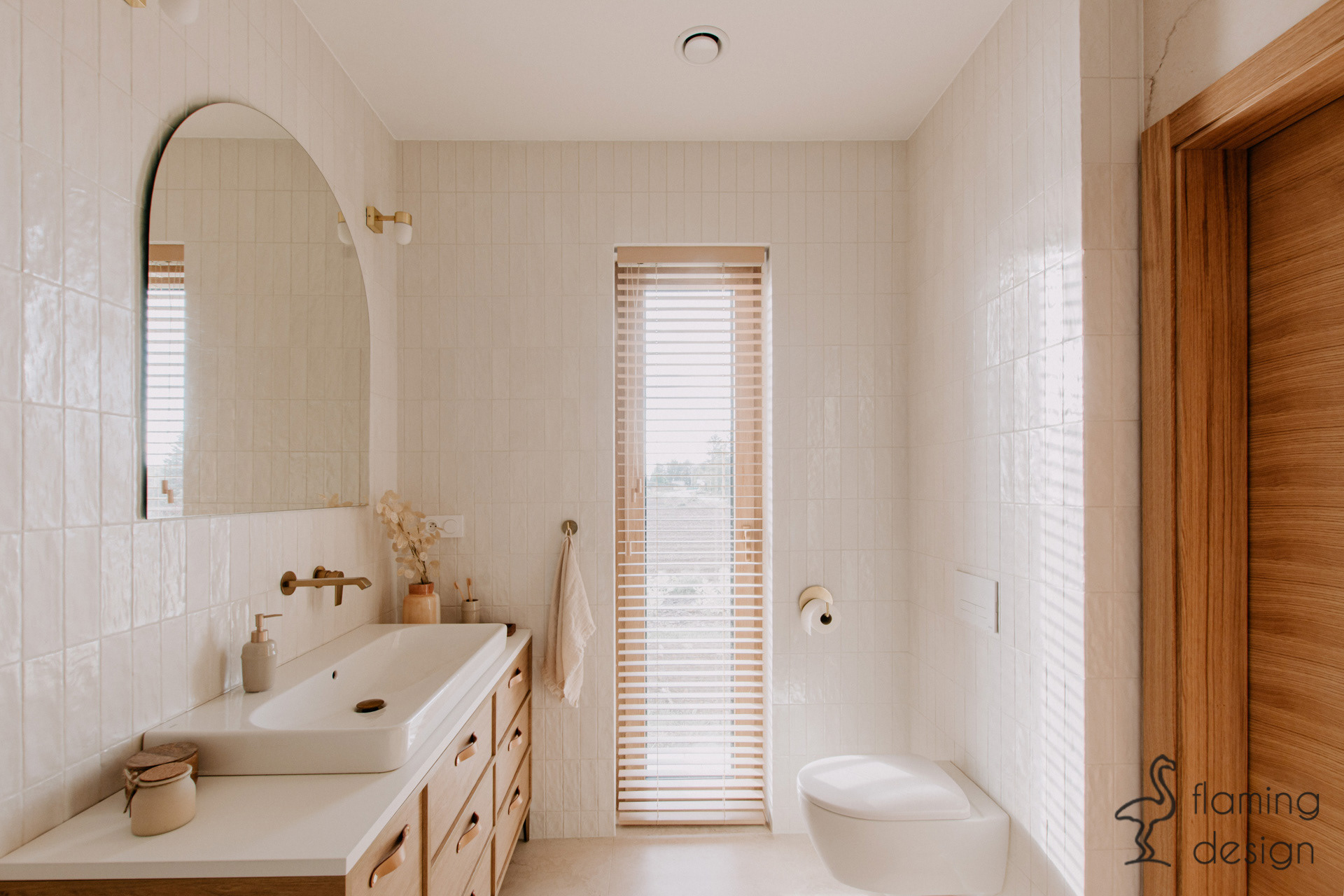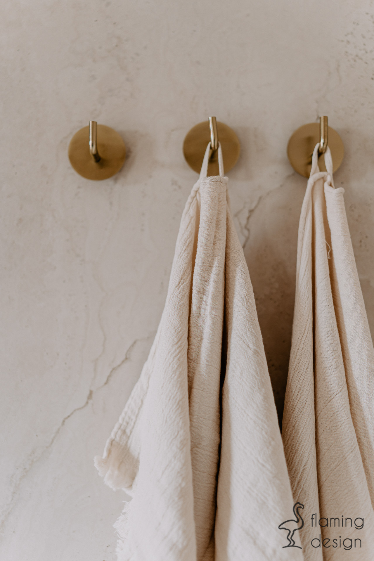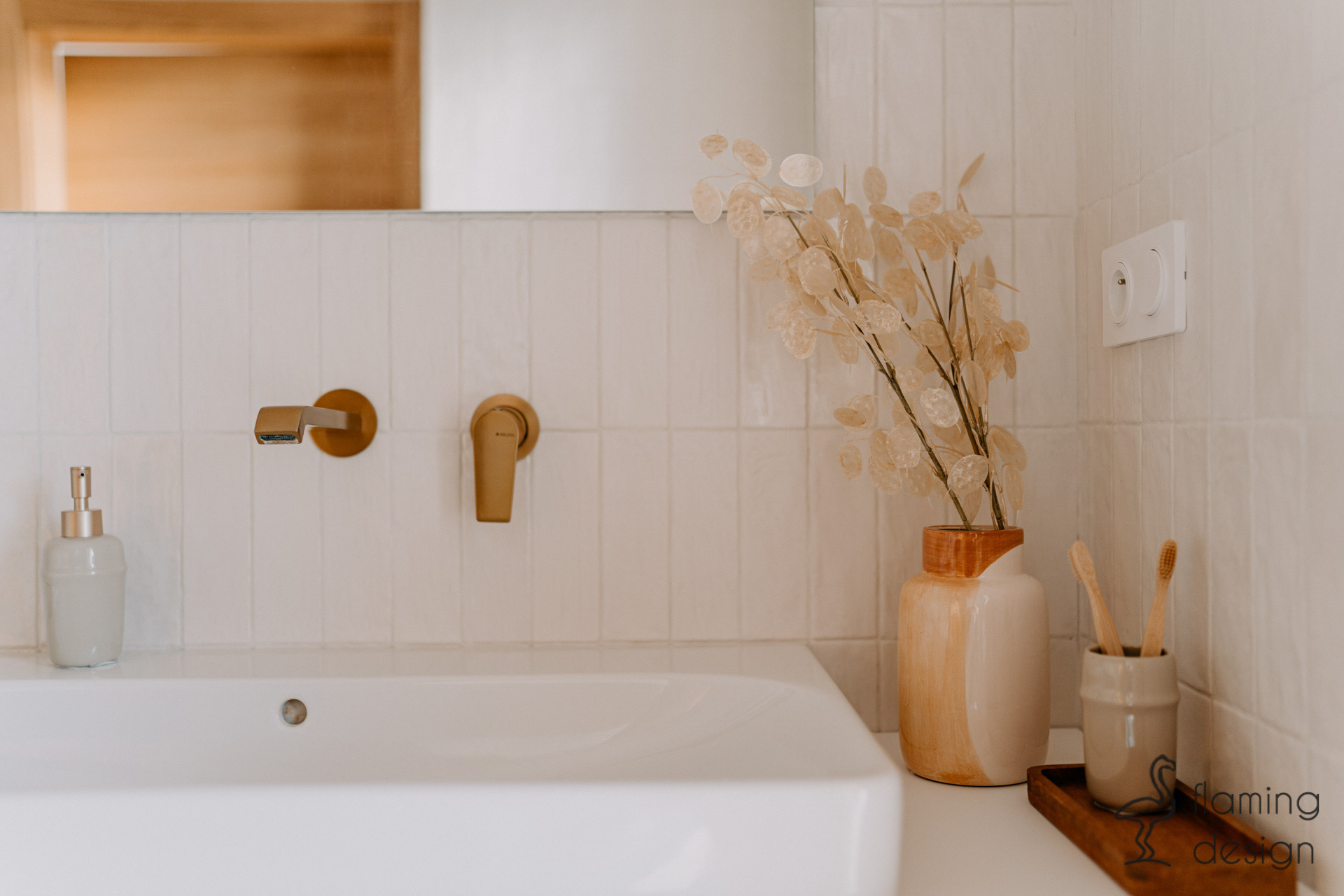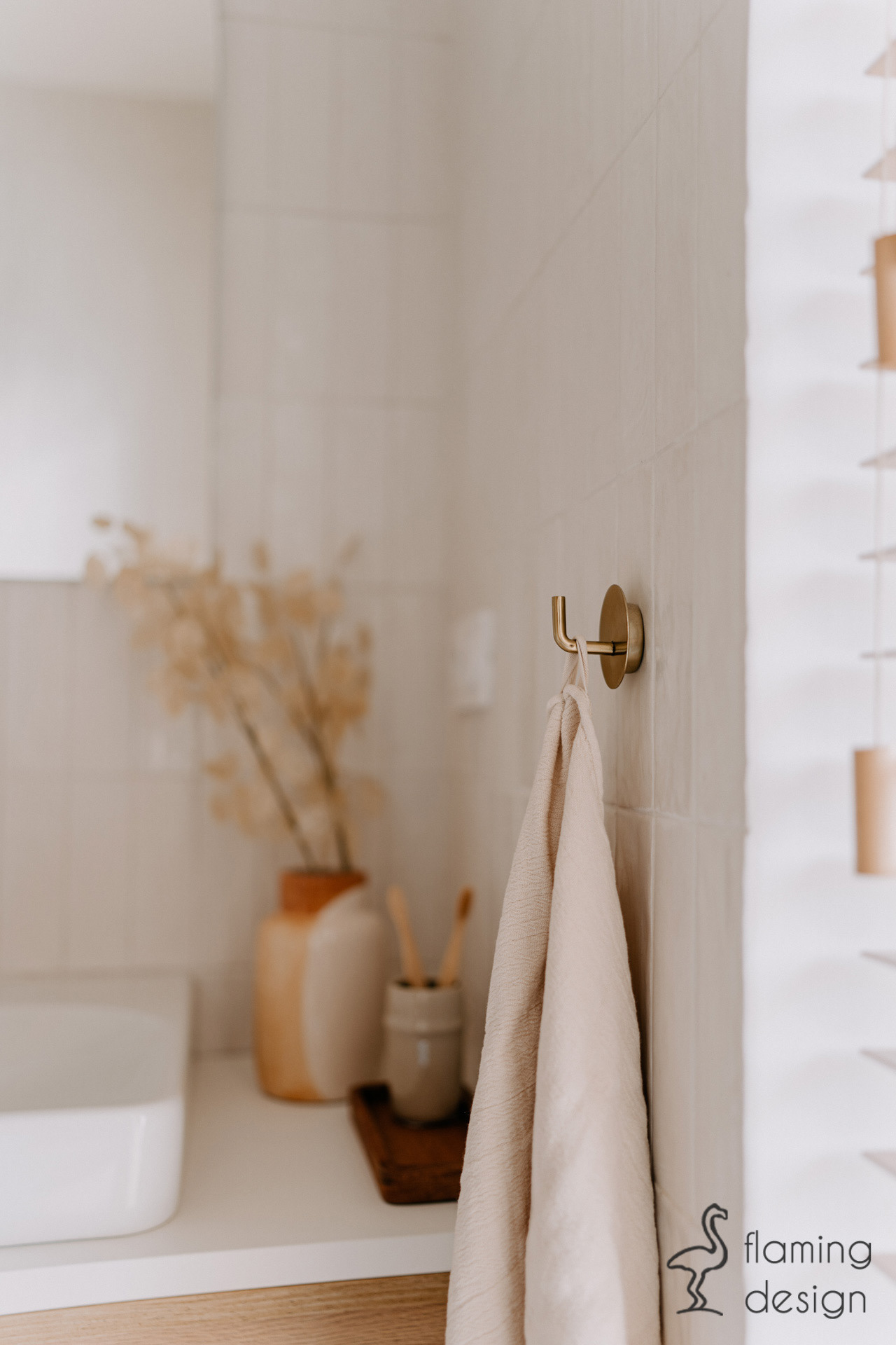 Realizacja łazienki w domu jednorodzinnym. Projekt średniej wielkości łazienki zakładał wygospodarowanie jak najwięcej miejsca, dlatego zdecydowano się na połączenie wanny i prysznica, co odpowiada inwestorom. W przyszłości na brzegu dużej wanny ma być zamontowany parawan nawannowy. Na wprost wejścia usytuowano dużą szafkę z szeroką umywalką i baterią ścienną. Łazienkę przedzielono płytkami na dwie strefy, po lewej gdzie jest wanna zaprojektowano duże beżowe płytki imitujące trawertyn, natomiast po prawej stronie mamy białe, nierówne płytki w kształcie cegiełek. Armatura łazienkowa jest w kolorze szczotkowanego złota. Duże lustro w formie portalu/łuku nawiązuje do kształtów ceramiki. Muślinowe ręczniki oraz beżowe i drewniane akcesoria nadają styl wnętrzu.