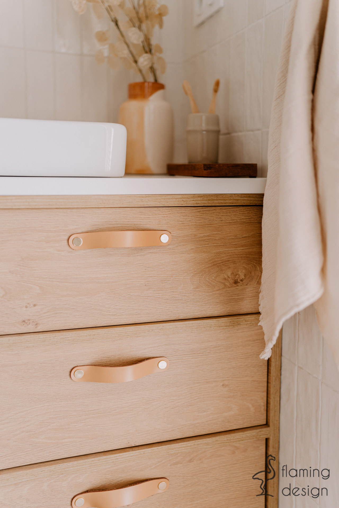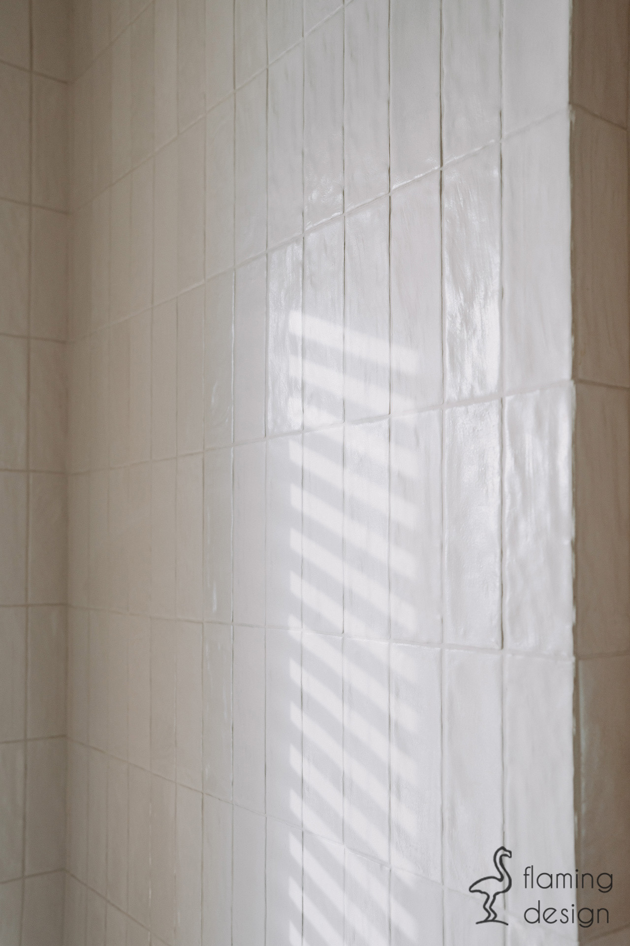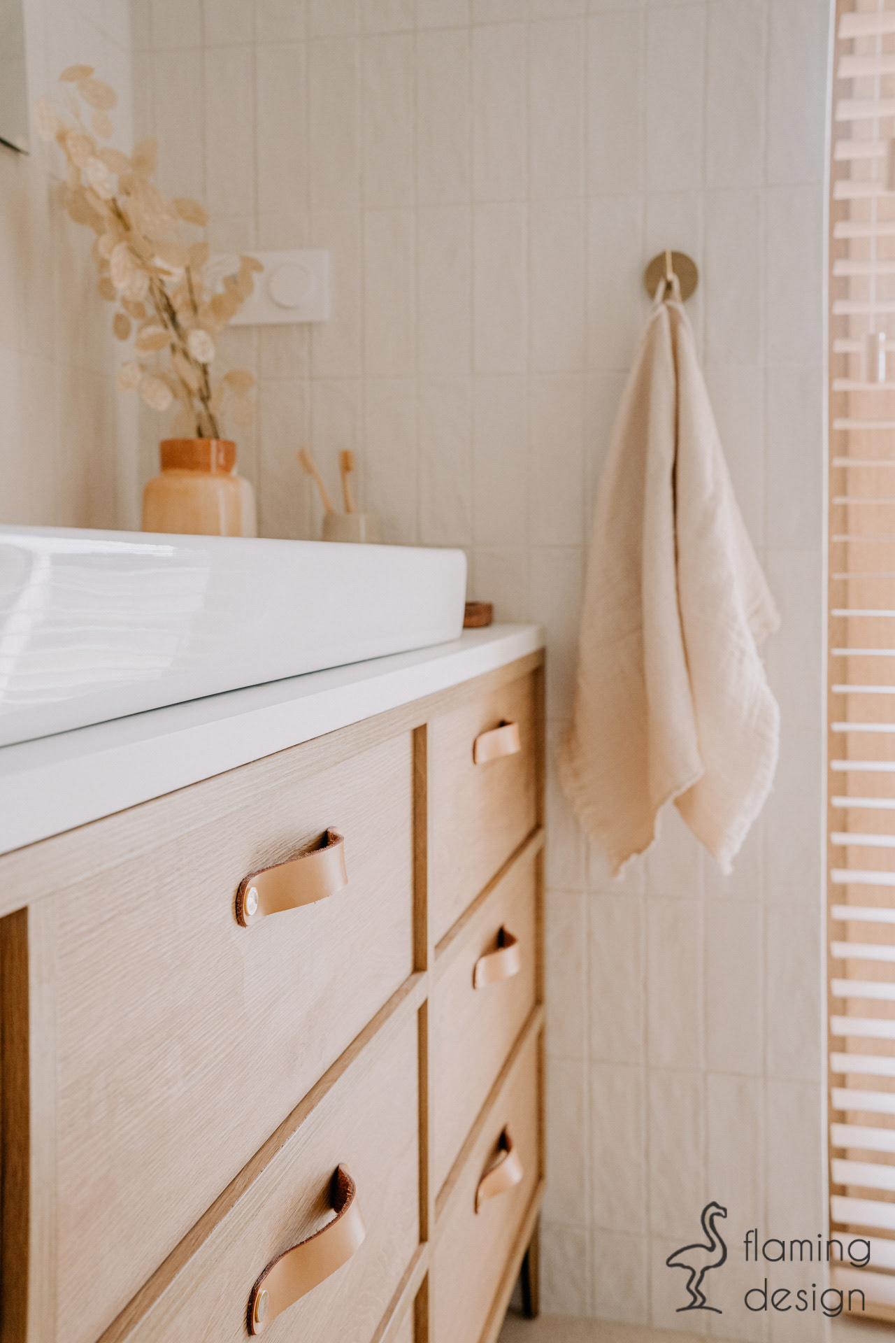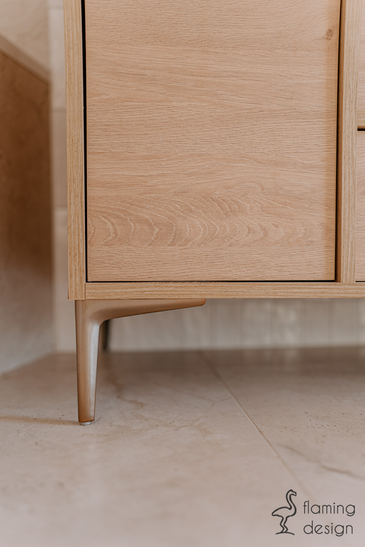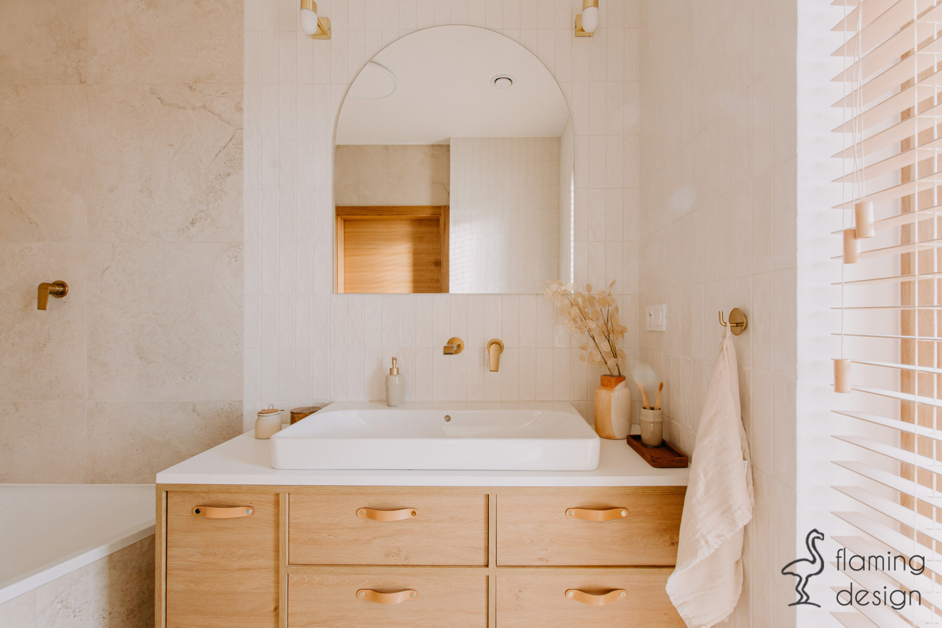 Realizacja łazienki w domu jednorodzinnym. Projekt średniej wielkości łazienki zakładał wygospodarowanie jak najwięcej miejsca, dlatego zdecydowano się na połączenie wanny i prysznica, co odpowiada inwestorom. W przyszłości na brzegu dużej wanny ma być zamontowany parawan nawannowy. Na wprost wejścia usytuowano dużą szafkę z szeroką umywalką i baterią ścienną. Łazienkę przedzielono płytkami na dwie strefy, po lewej gdzie jest wanna zaprojektowano duże beżowe płytki imitujące trawertyn, natomiast po prawej stronie mamy białe, nierówne płytki w kształcie cegiełek. Armatura łazienkowa jest w kolorze szczotkowanego złota. Duże lustro w formie portalu/łuku nawiązuje do kształtów ceramiki. Muślinowe ręczniki oraz beżowe i drewniane akcesoria nadają styl wnętrzu.