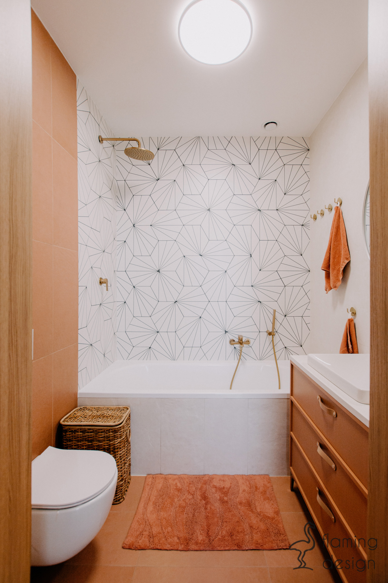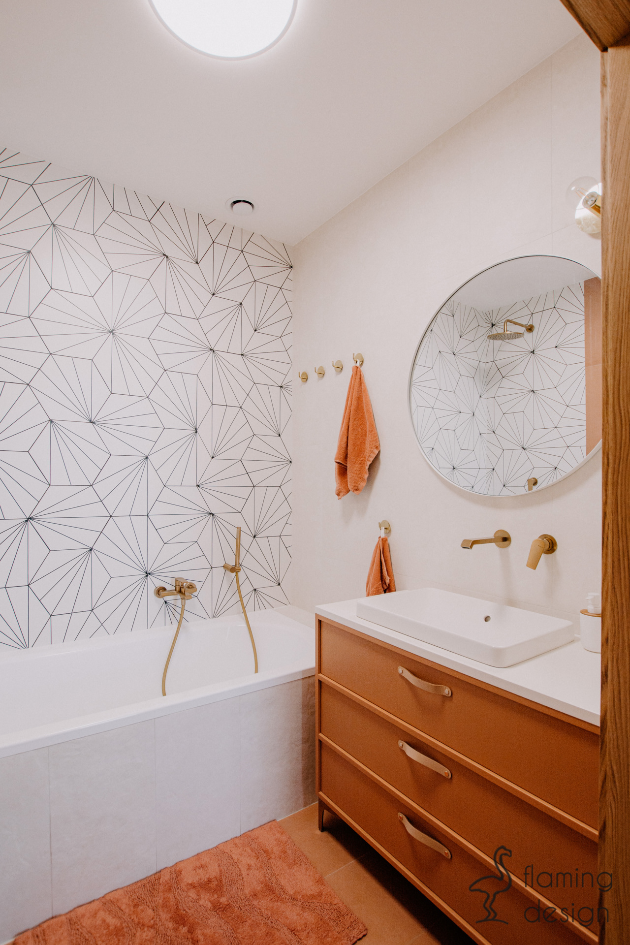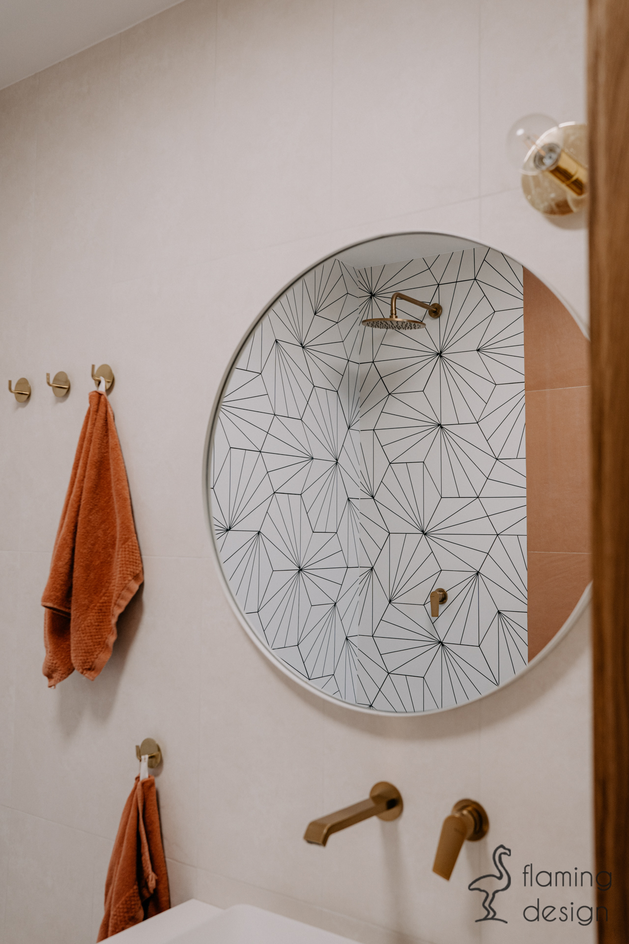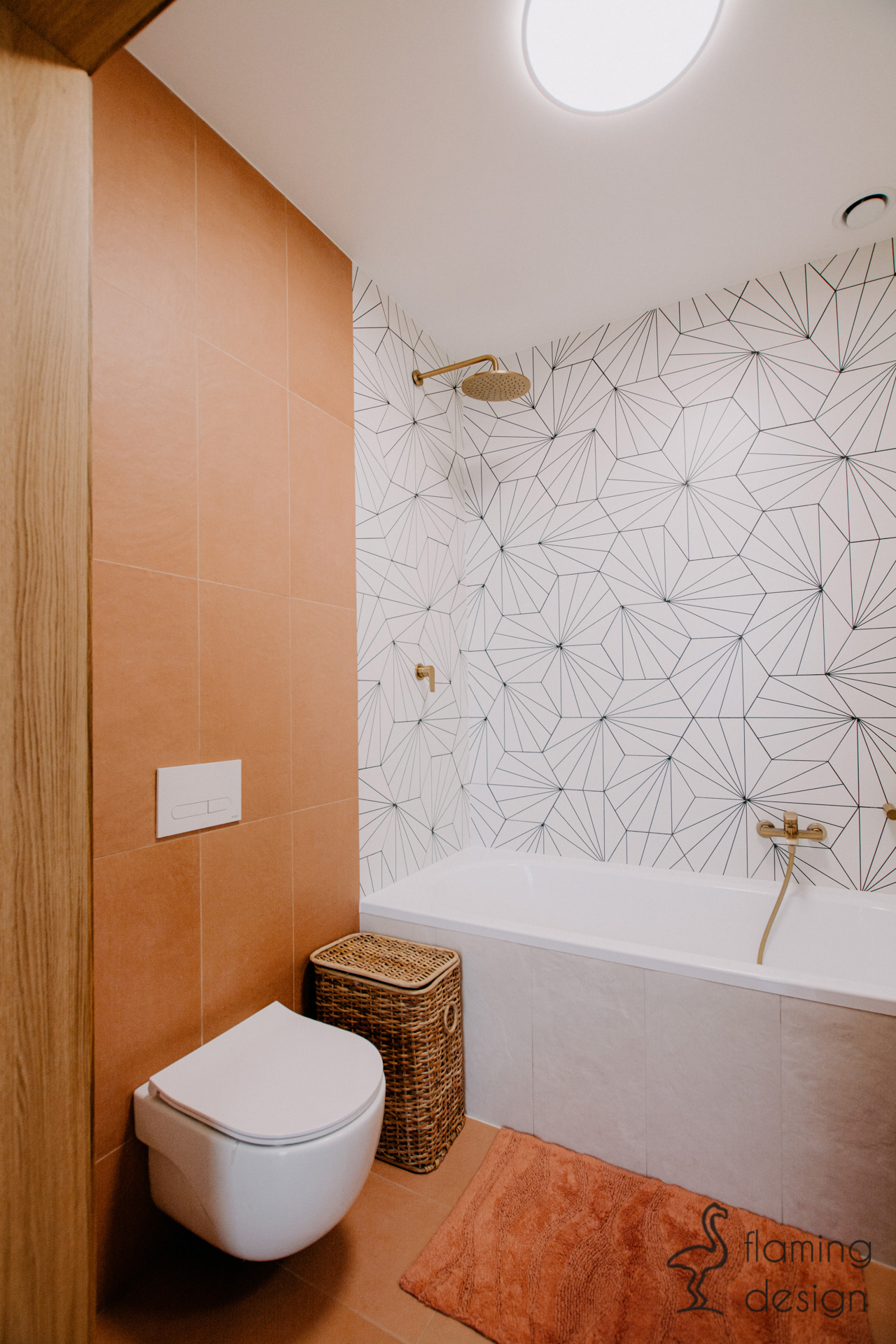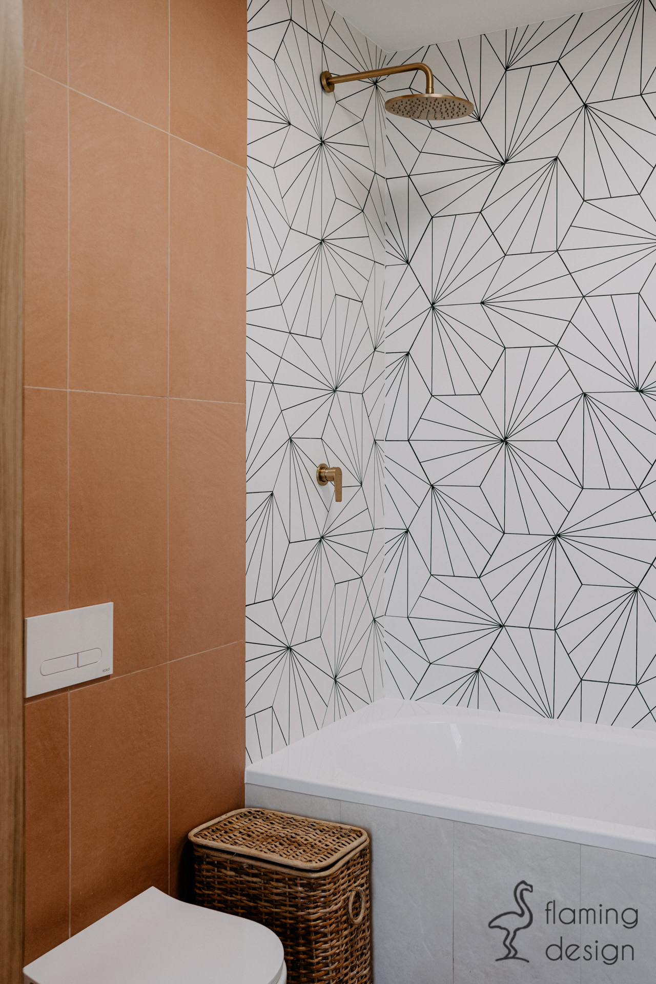Realizacja projektu łazienki w nowoczesnej stodole. Niewielka łazienka z wanną i deszczownicą prysznicową, w przyszłości inwestorzy zamontują jeszcze parawan nawannowy. Na ścianie na wprost wejścia i część po lewej stronie zaprojektowano biało-czarne heksagonalne płytki, które tworzą oryginalny wzór. Na ścianie z umywalką i szafką na wymiar są białe płytki z nieregularną strukturą. Na podłodze oraz w miejscu sedesu zaprojektowano płytki w kolorze ceglanym, które również mają nieregularną powierzchnię. Okrągłe lustro i mosiężne baterie oraz dodatki stanowią dopełnienie projektu.