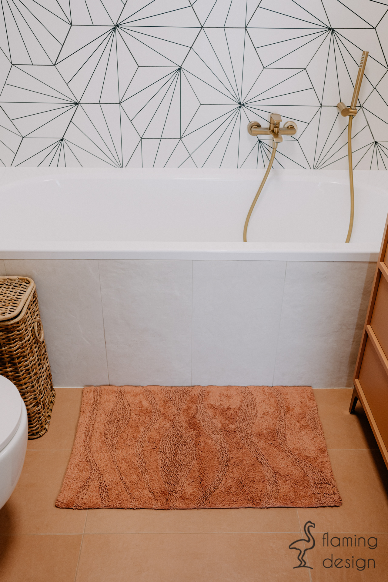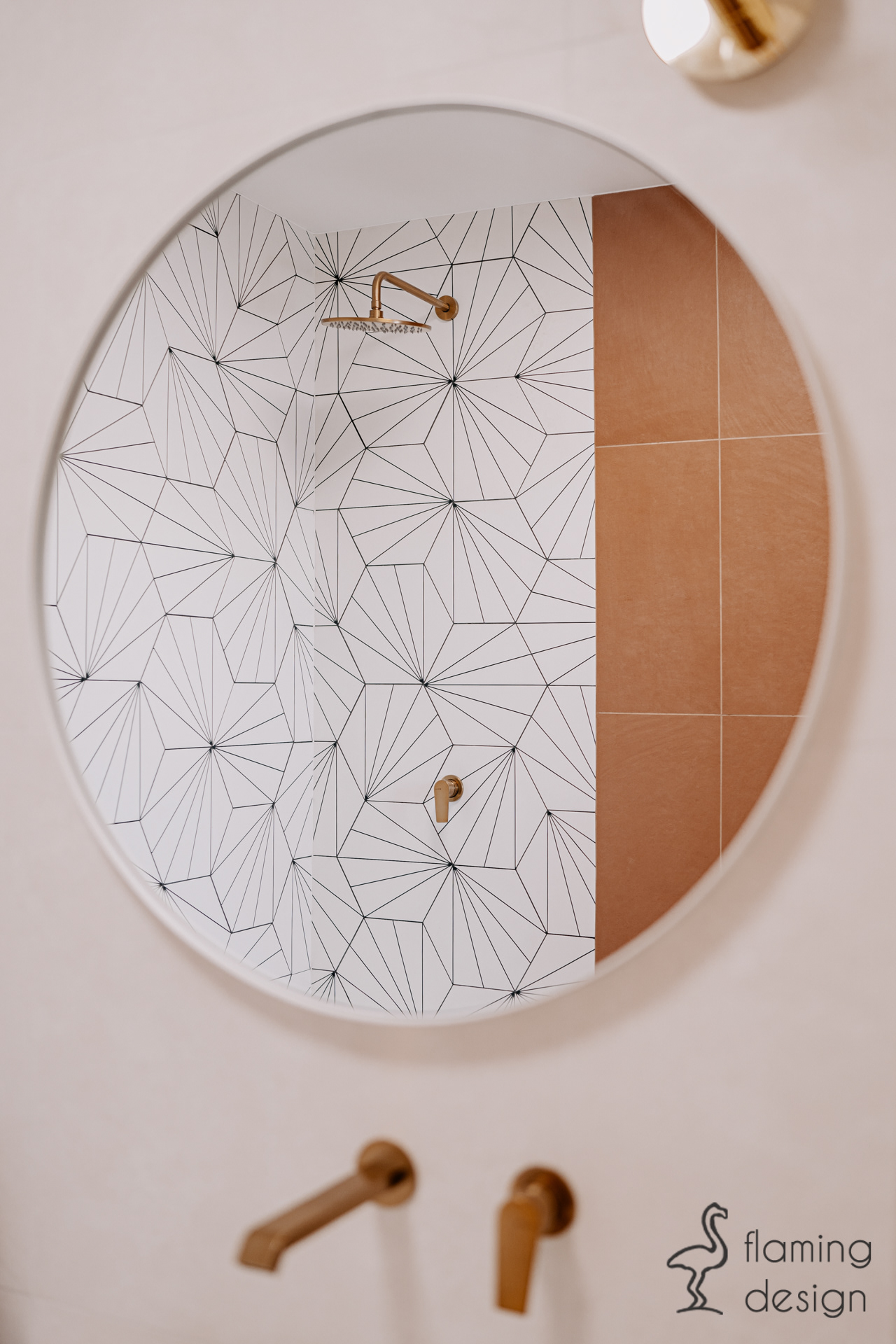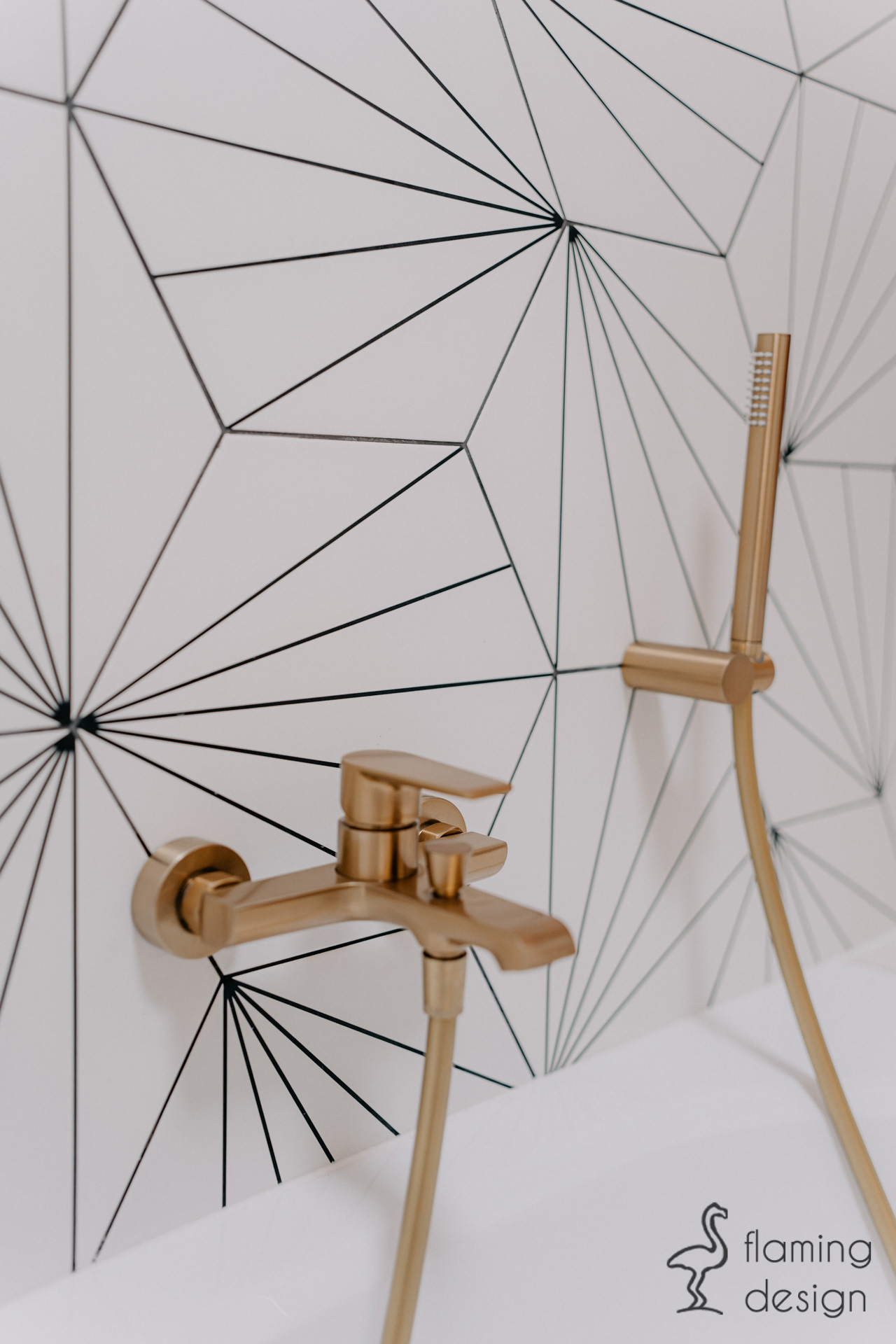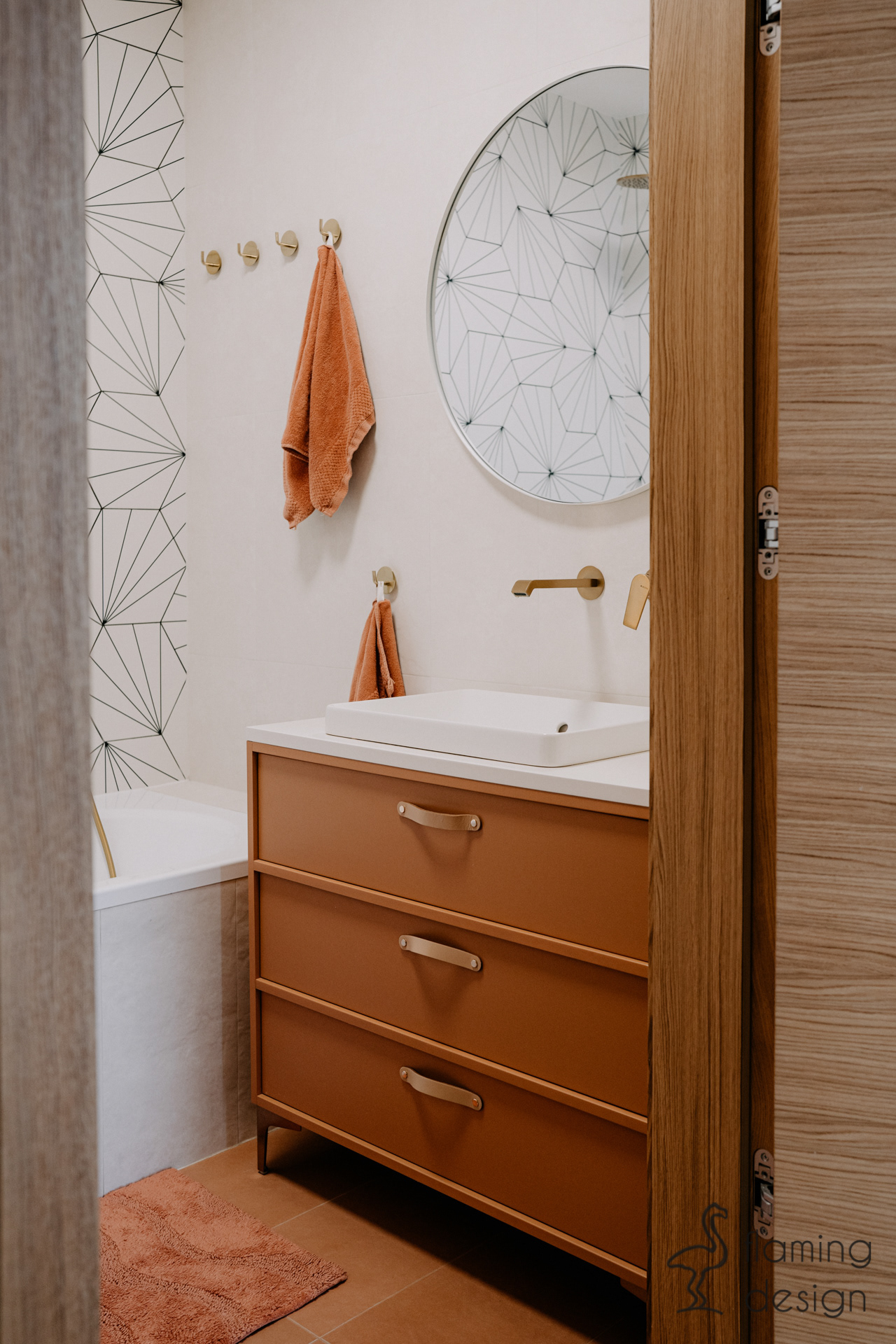 Realizacja projektu łazienki w nowoczesnej stodole. Niewielka łazienka z wanną i deszczownicą prysznicową, w przyszłości inwestorzy zamontują jeszcze parawan nawannowy. Na ścianie na wprost wejścia i część po lewej stronie zaprojektowano biało-czarne heksagonalne płytki, które tworzą oryginalny wzór. Na ścianie z umywalką i szafką na wymiar są białe płytki z nieregularną strukturą. Na podłodze oraz w miejscu sedesu zaprojektowano płytki w kolorze ceglanym, które również mają nieregularną powierzchnię. Okrągłe lustro i mosiężne baterie oraz dodatki stanowią dopełnienie projektu.