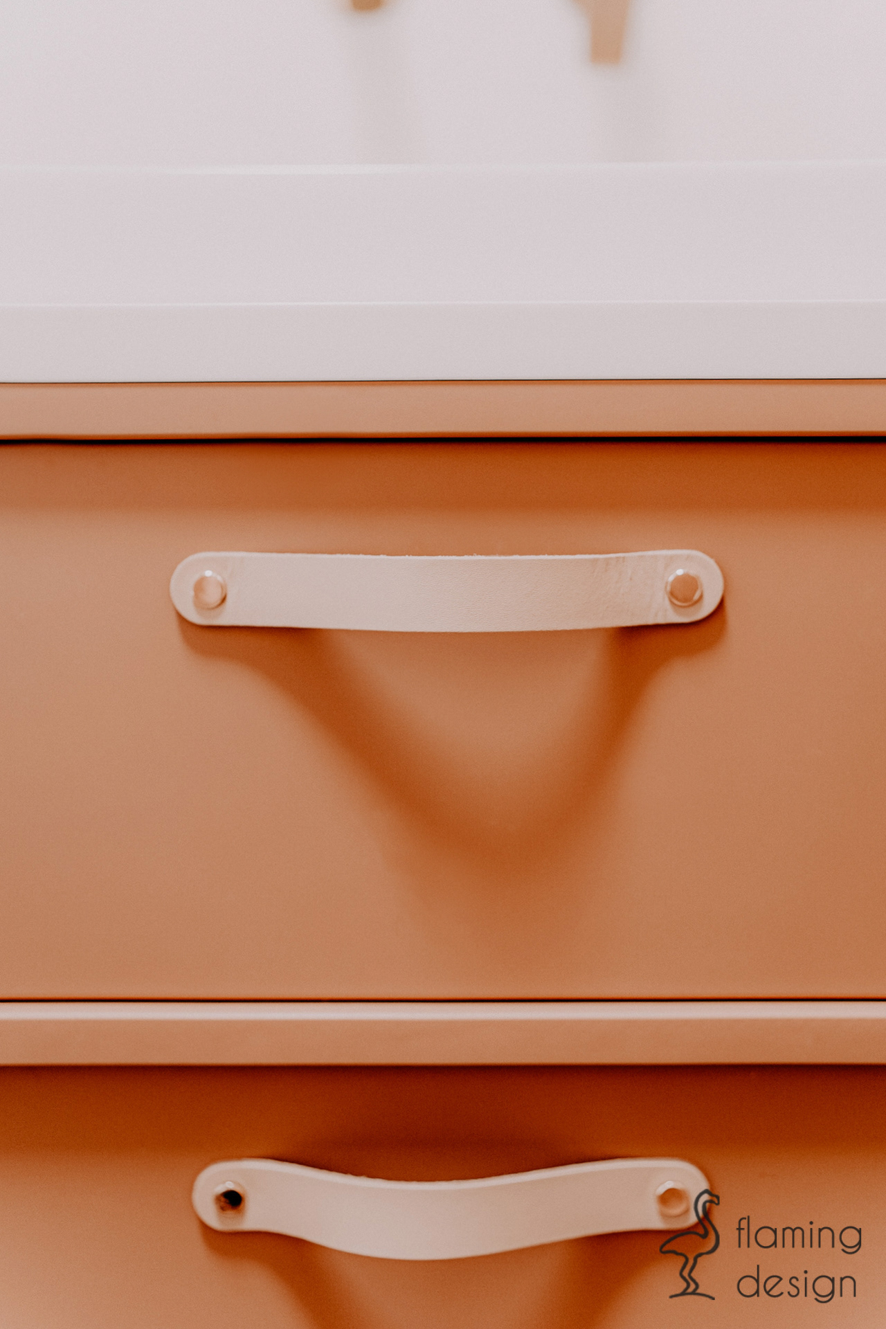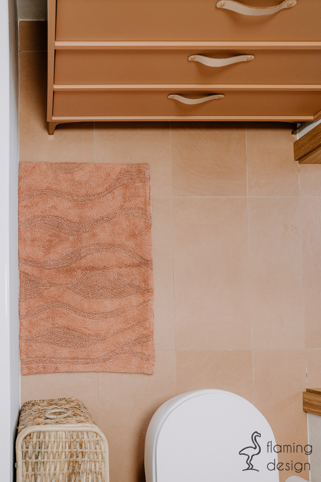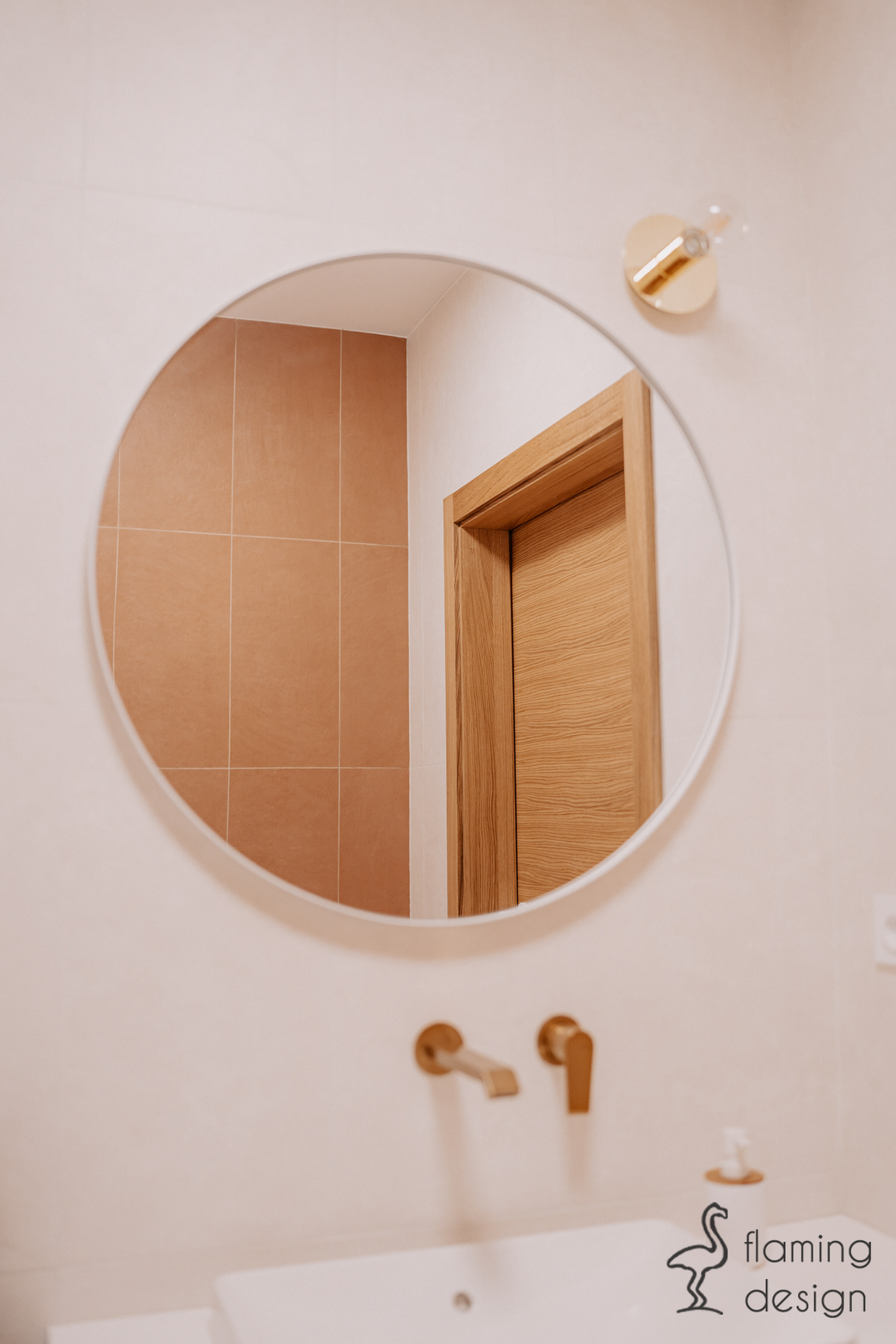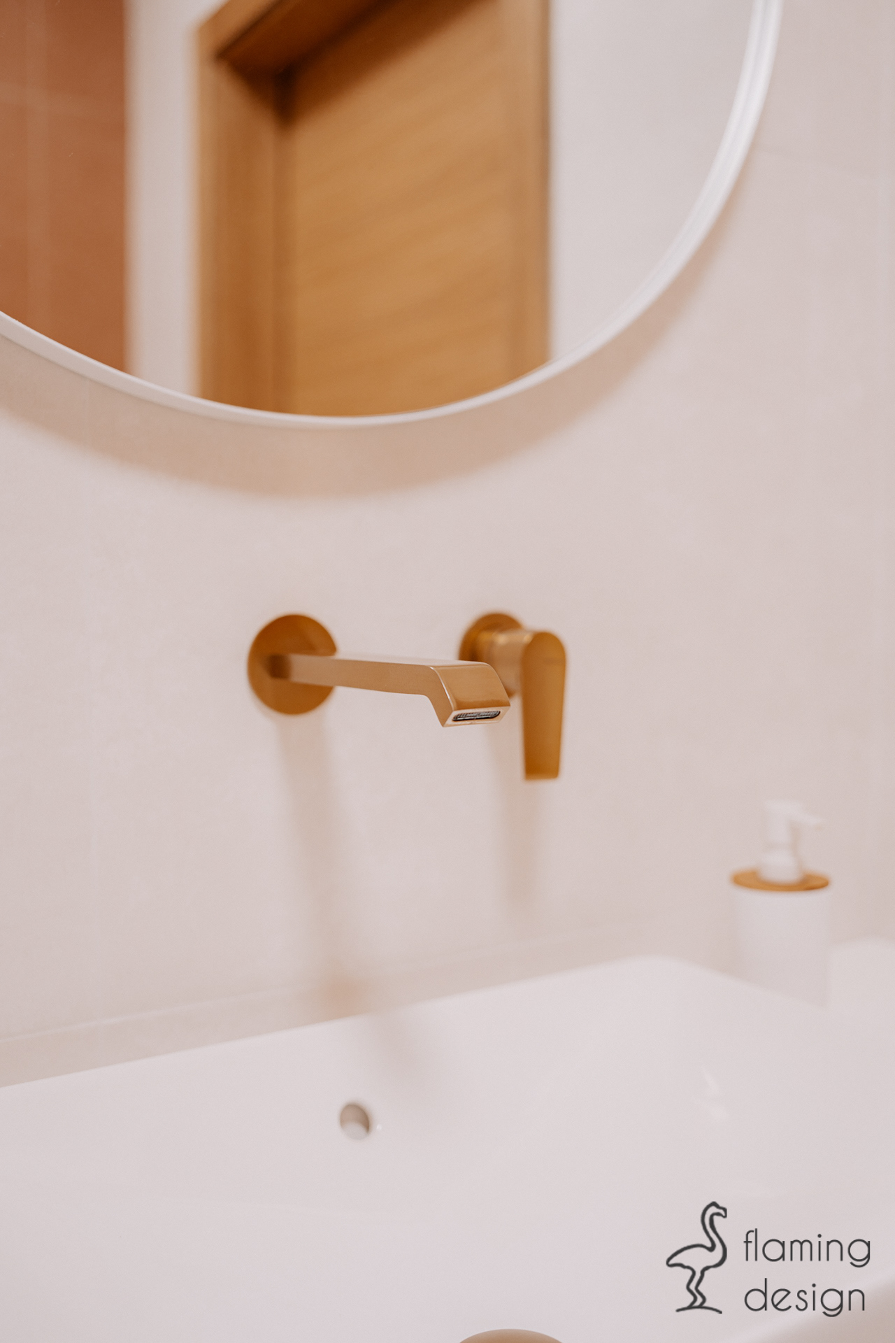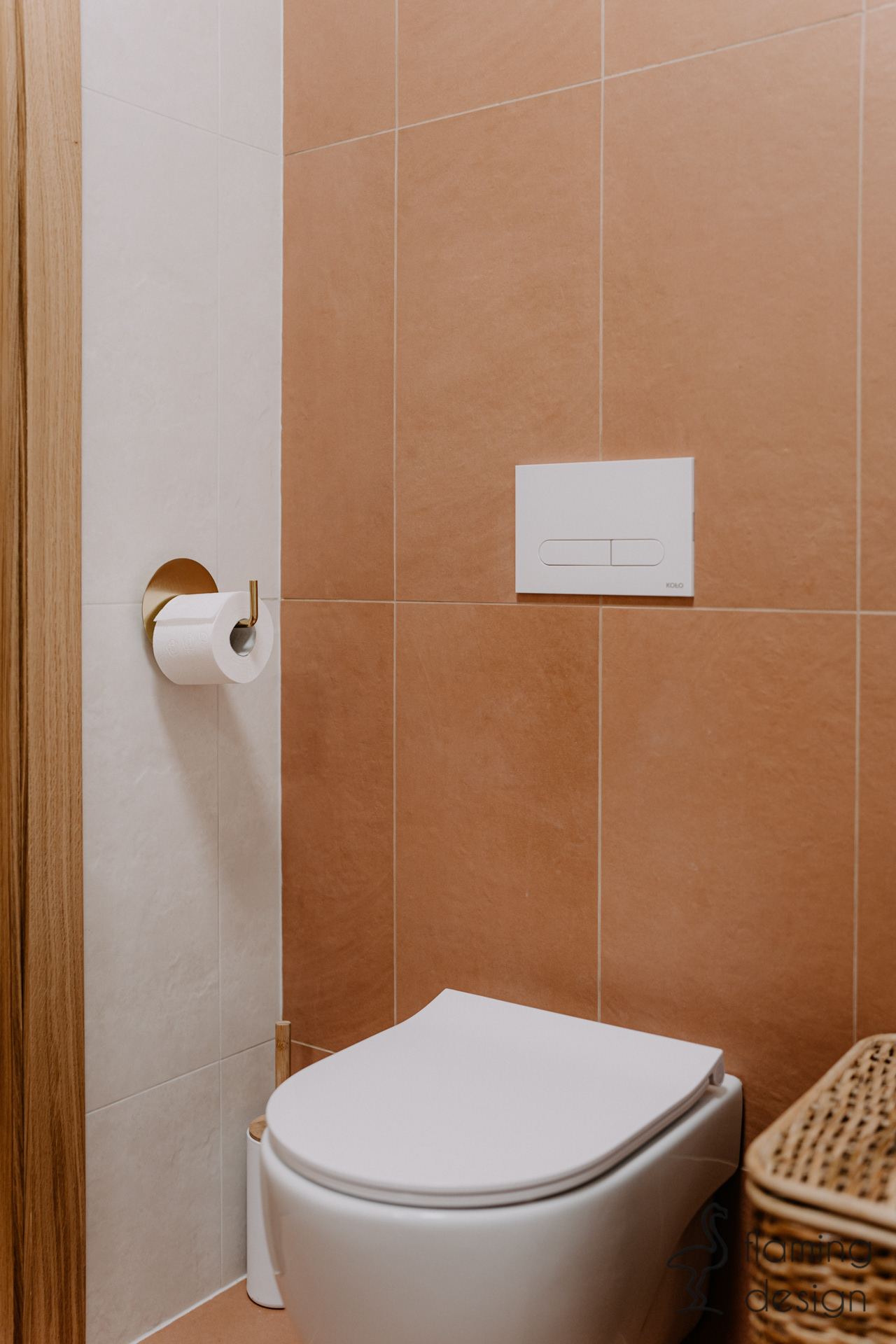 Realizacja projektu łazienki w nowoczesnej stodole. Niewielka łazienka z wanną i deszczownicą prysznicową, w przyszłości inwestorzy zamontują jeszcze parawan nawannowy. Na ścianie na wprost wejścia i część po lewej stronie zaprojektowano biało-czarne heksagonalne płytki, które tworzą oryginalny wzór. Na ścianie z umywalką i szafką na wymiar są białe płytki z nieregularną strukturą. Na podłodze oraz w miejscu sedesu zaprojektowano płytki w kolorze ceglanym, które również mają nieregularną powierzchnię. Okrągłe lustro i mosiężne baterie oraz dodatki stanowią dopełnienie projektu.