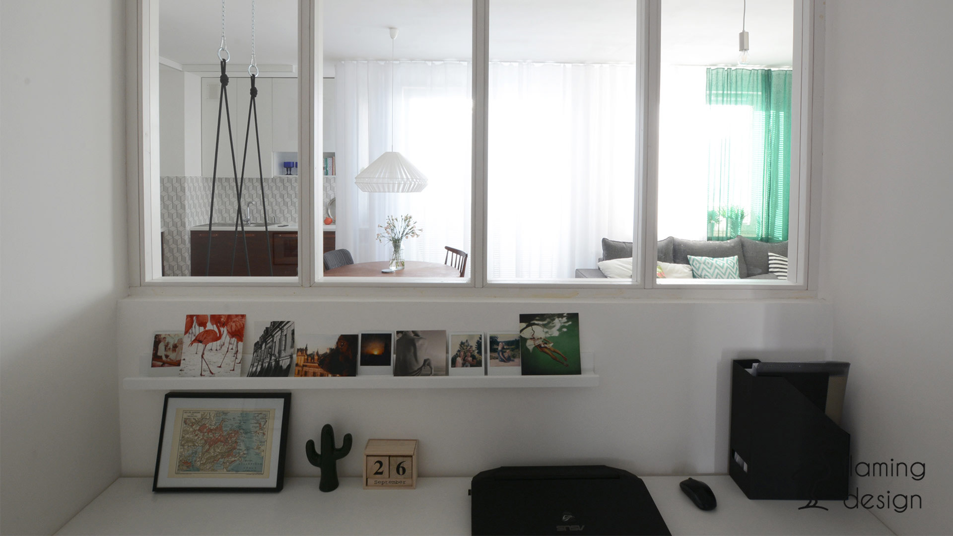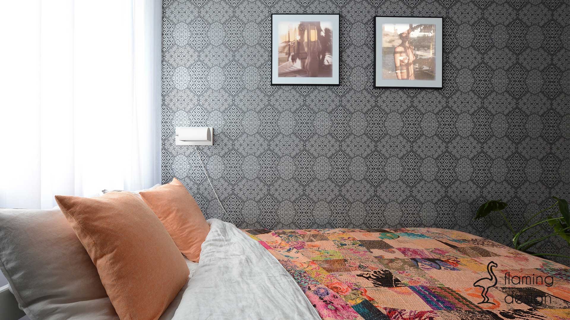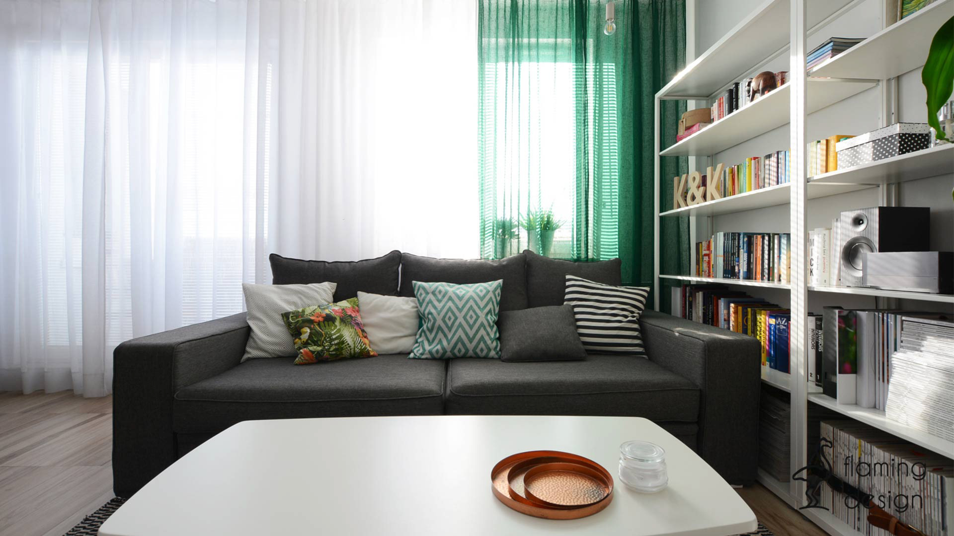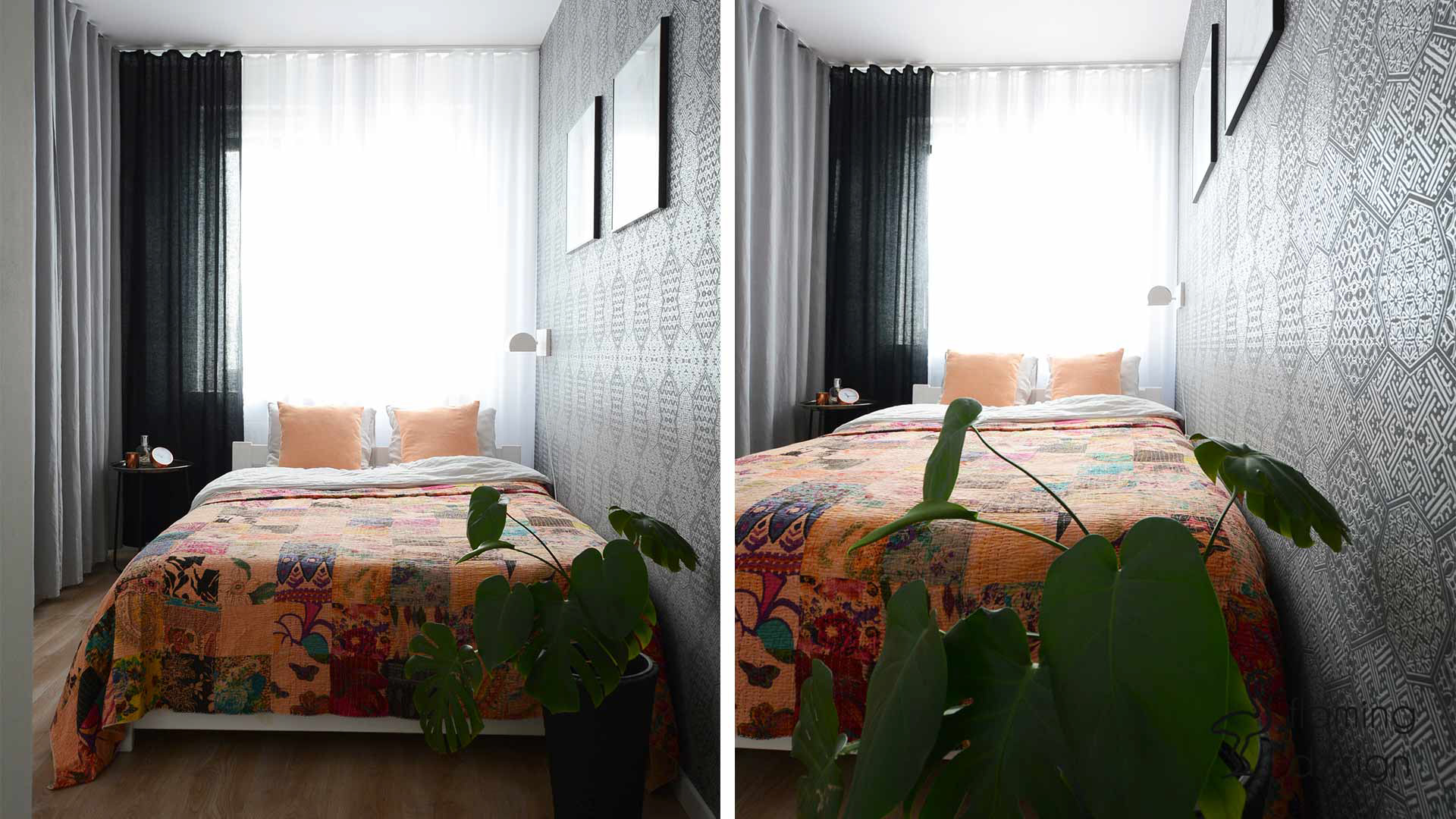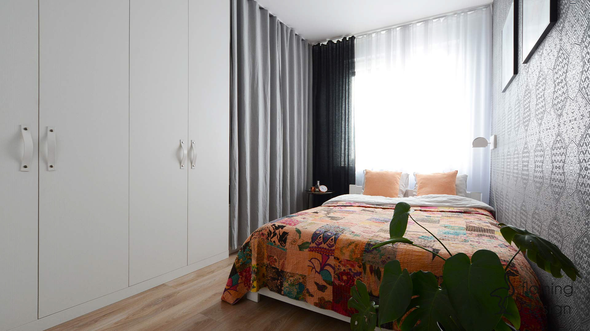 Zielone zasłony, dodatki oraz roślinność ożywiają to wnętrze. W łazience dominują białe, kwadratowe płytki i ten sam kolor rudego forniru na szafkach jak w kuchni. W sypialni na jednej ścianie zaprojektowano dużą szafę, jednak, aby nie była to długa ściana z frontów, połowę wnętrza szafy zasłaniają tkaniny lniane zamiast drzwi. Na przeciwległej ścianie położono strukturalną, grafitową tapetę, a kolorowa narzuta z Indii dodaje trochę koloru do wnętrza.