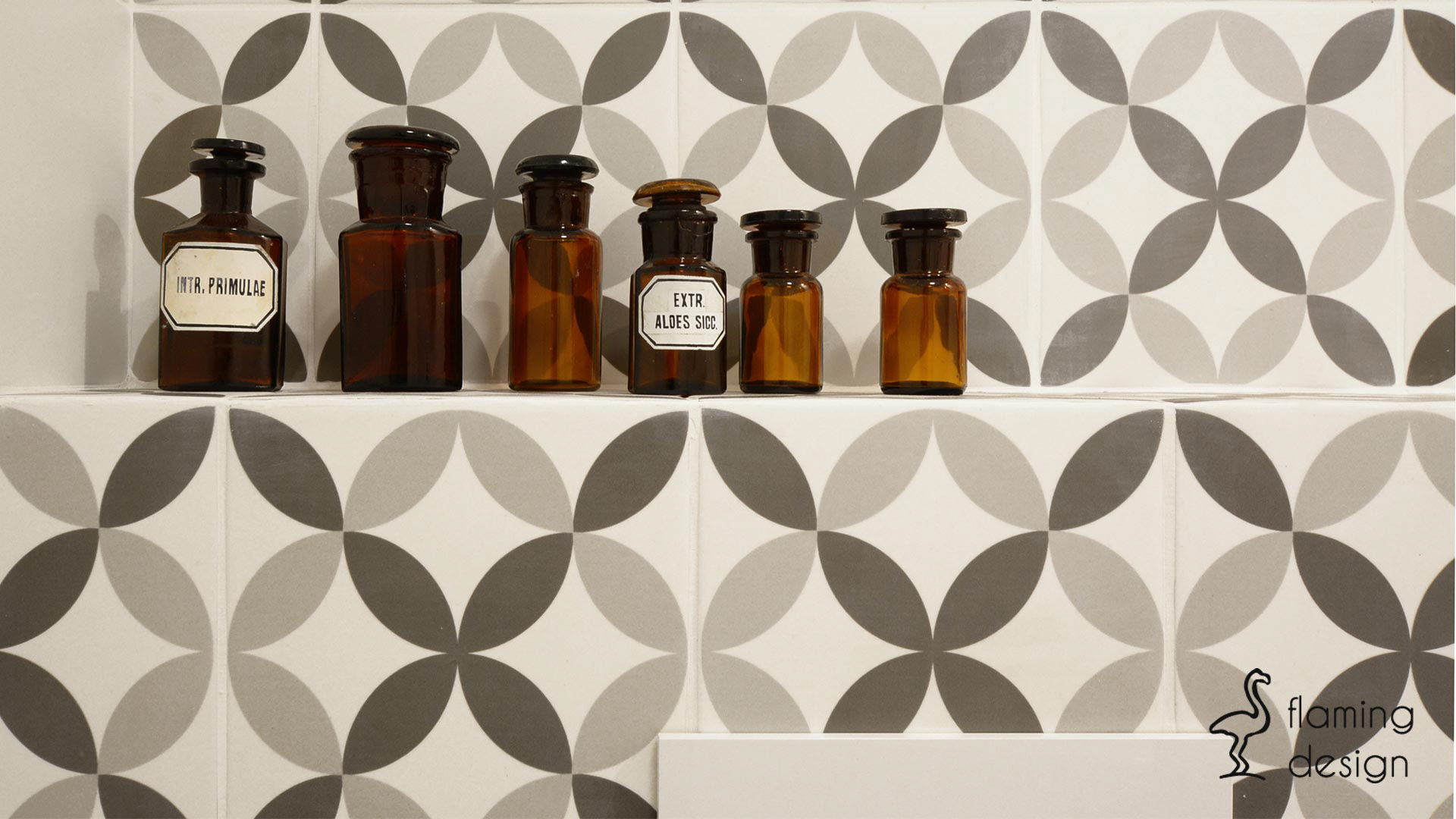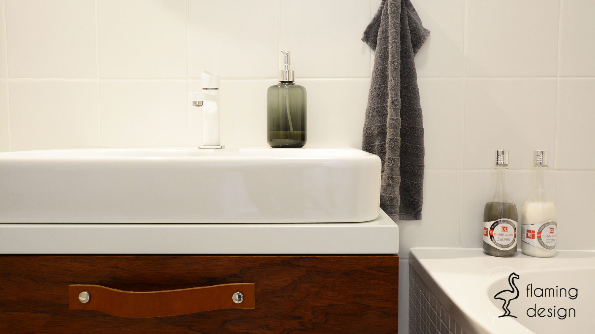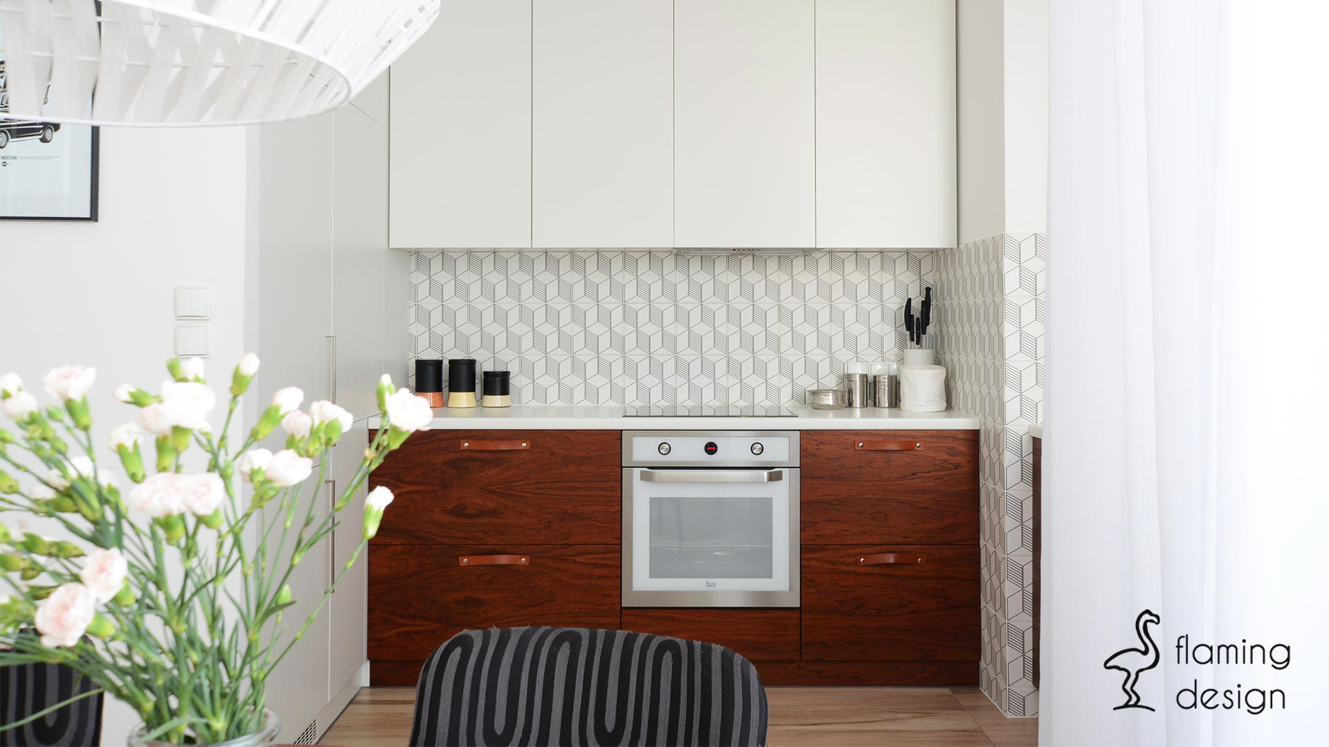 Na podłodze zaprojektowano płytki gresowe imitujące drewno, które świetnie sprawdzają się w takich przestrzeniach. Kolor dolnych szafek kuchennych był dobierany do posiadanego przez właścicieli duńskiego stołu z lat 60-tych. Oryginalne uchwyty w szafkach wykonano samodzielnie ze skóry. Płytki pomiędzy szafkami są też specjalnie zaprojektowane dla tego wnętrza i wykonane na zamówienie.