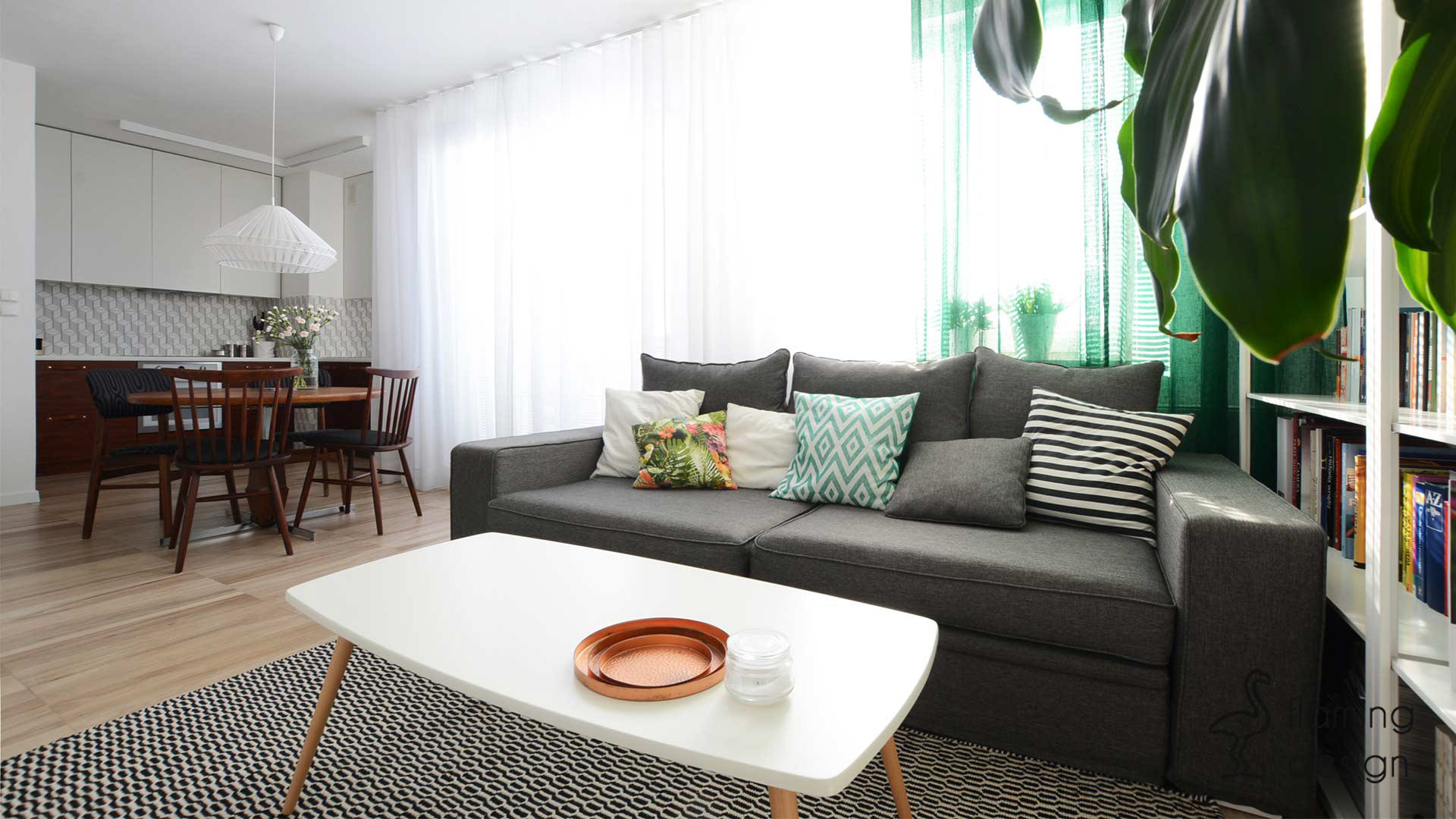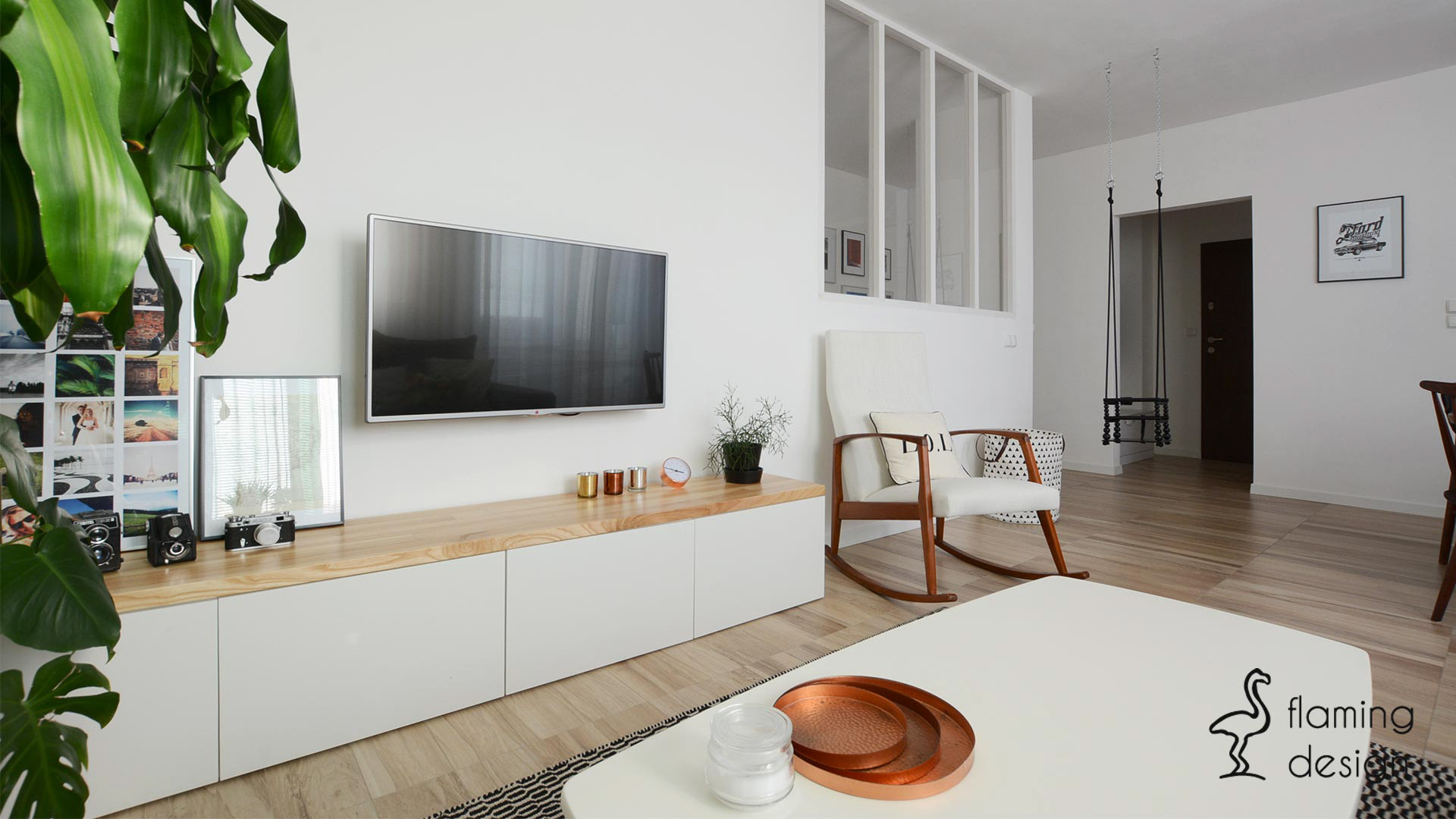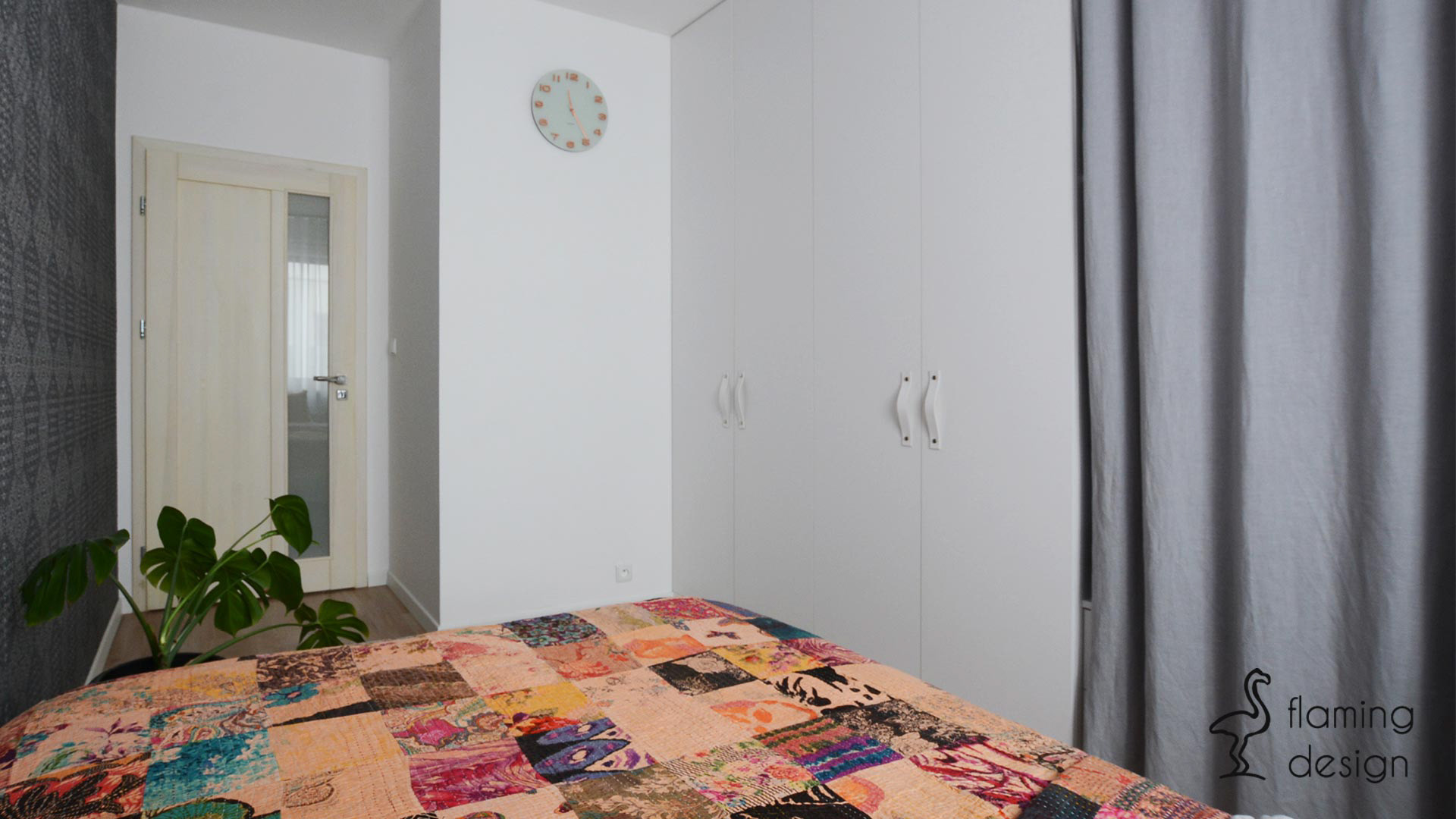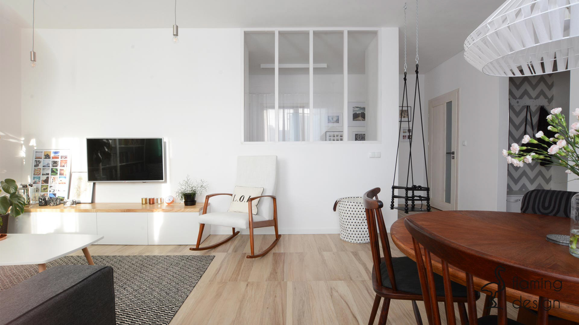 Projekt 3-pokojowego mieszkania o powierzchni 70m2 w stylu nowoczesnym. W celu uzyskania większej przestrzeni zdecydowano się na likwidację jednego z pokojów (pierwotnie mieszkanie było 4-pokojowe), dzięki wyburzeniu ściany powstał dużo większy salon połączony z aneksem kuchennym. Mieszkanie miało być jasne i kolorowe.