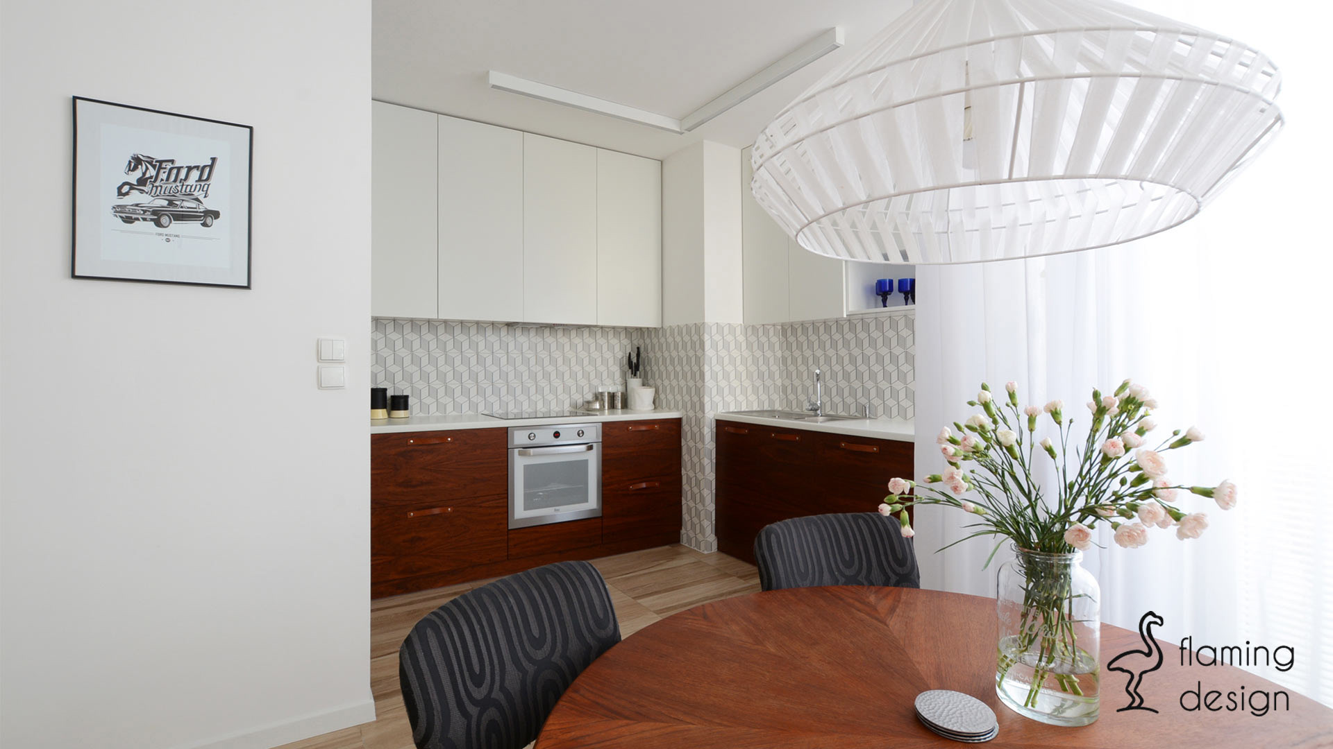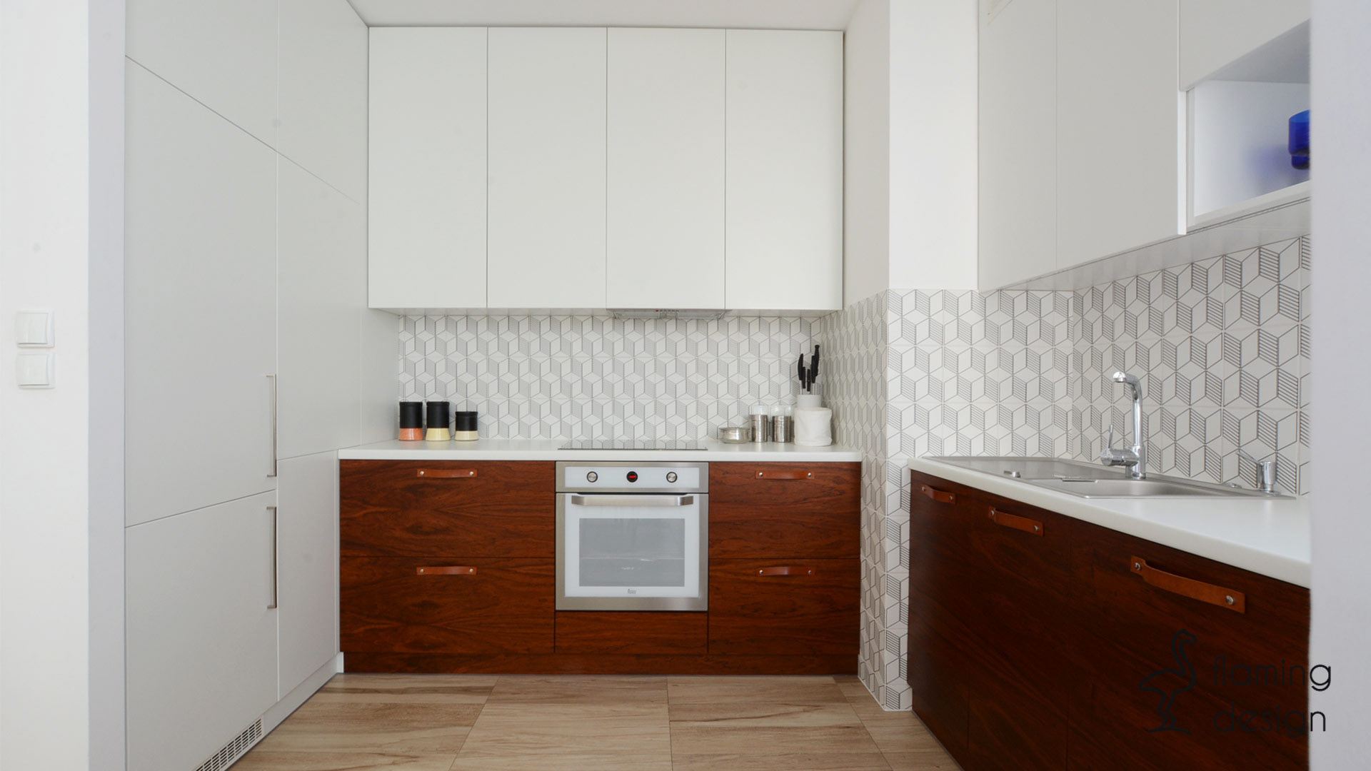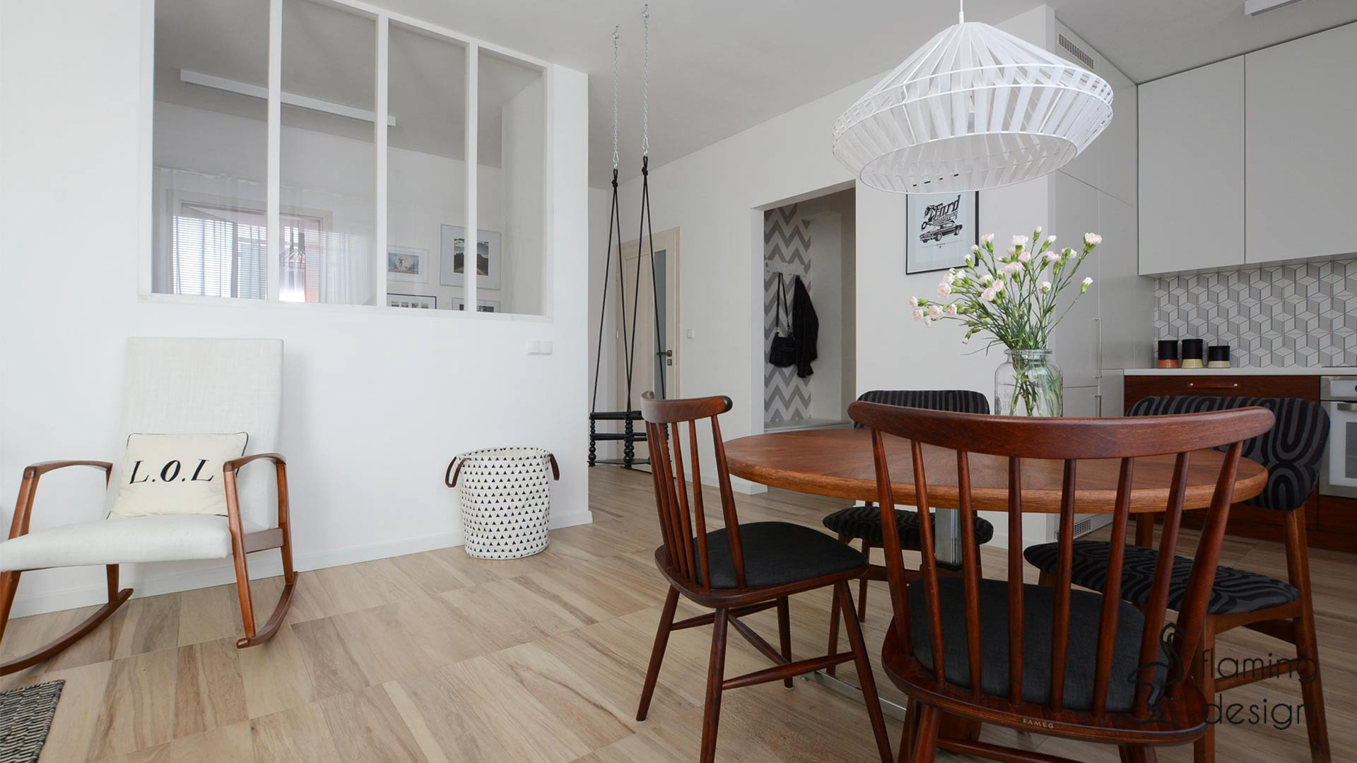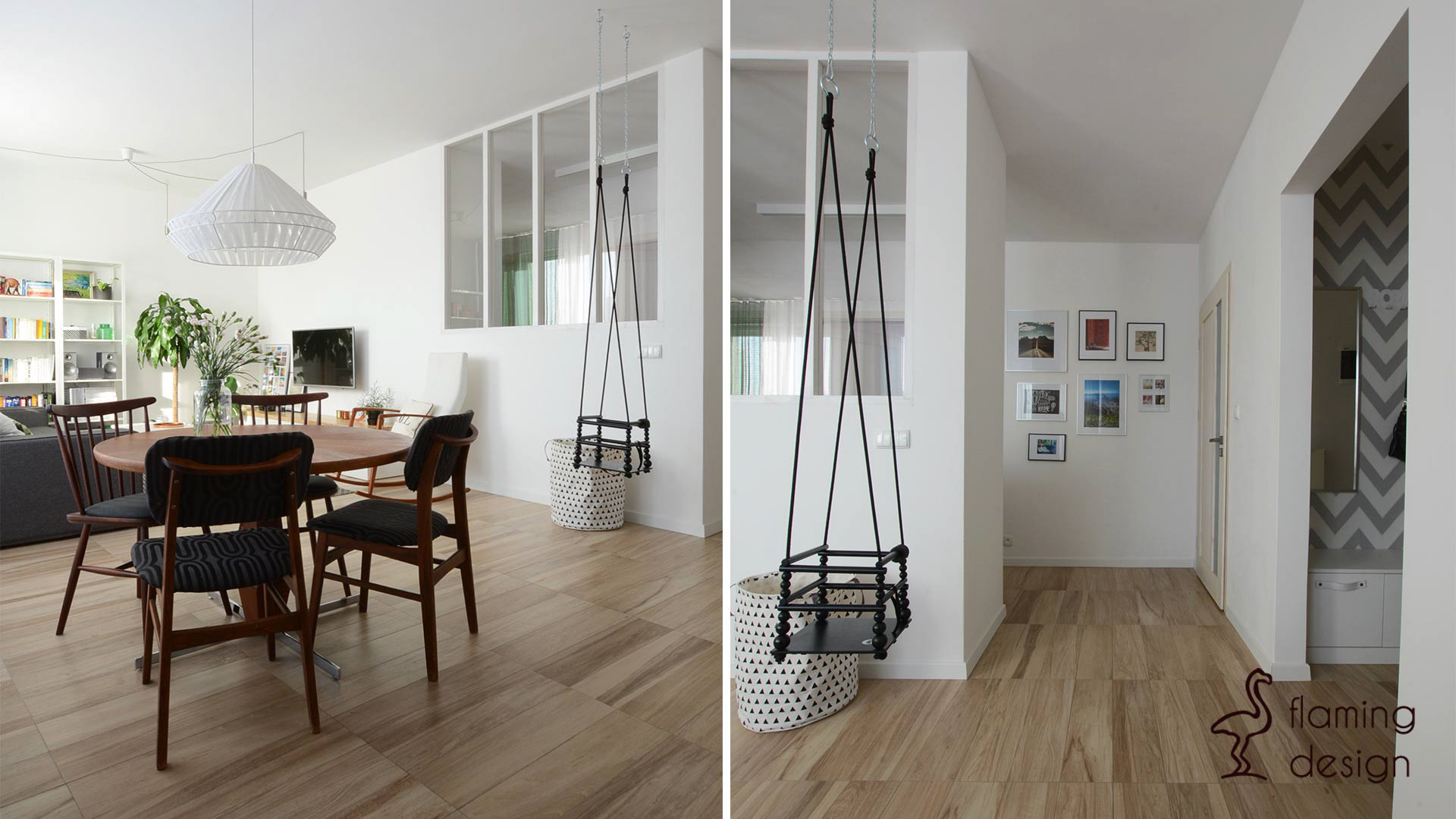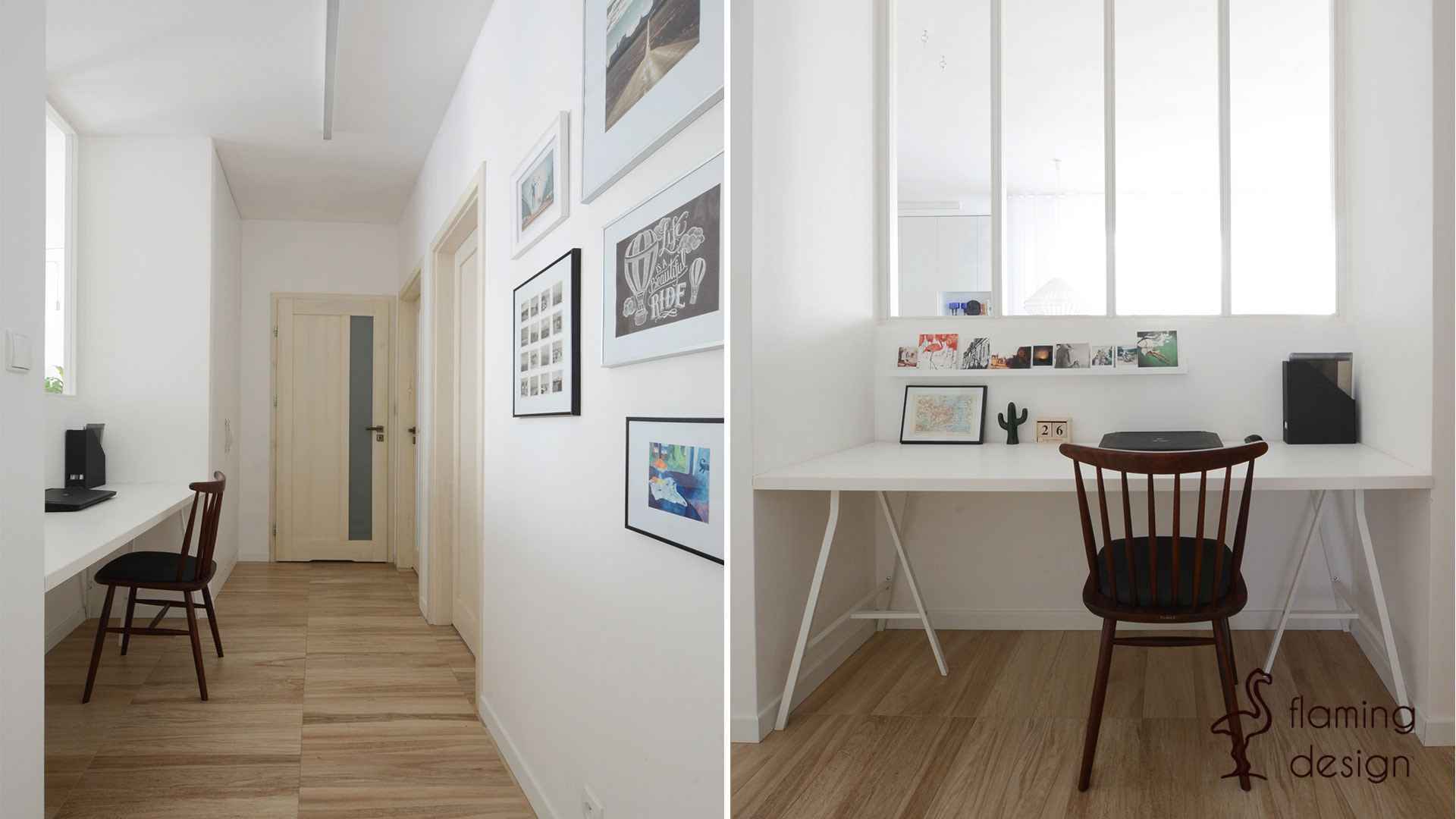 Projekt 3-pokojowego mieszkania o powierzchni 70m2 w stylu nowoczesnym. W celu uzyskania większej przestrzeni zdecydowano się na likwidację jednego z pokojów (pierwotnie mieszkanie było 4-pokojowe), dzięki wyburzeniu ściany powstał dużo większy salon połączony z aneksem kuchennym. Mieszkanie miało być jasne i kolorowe.