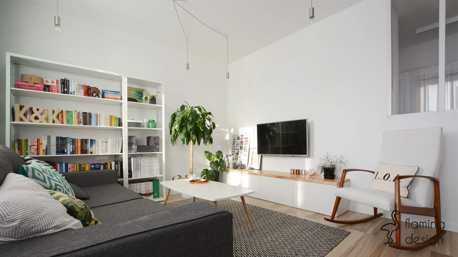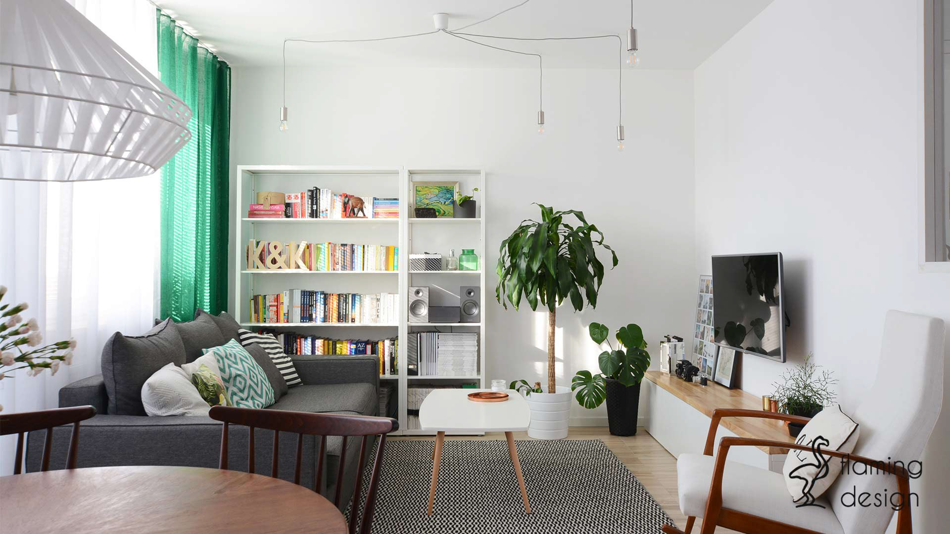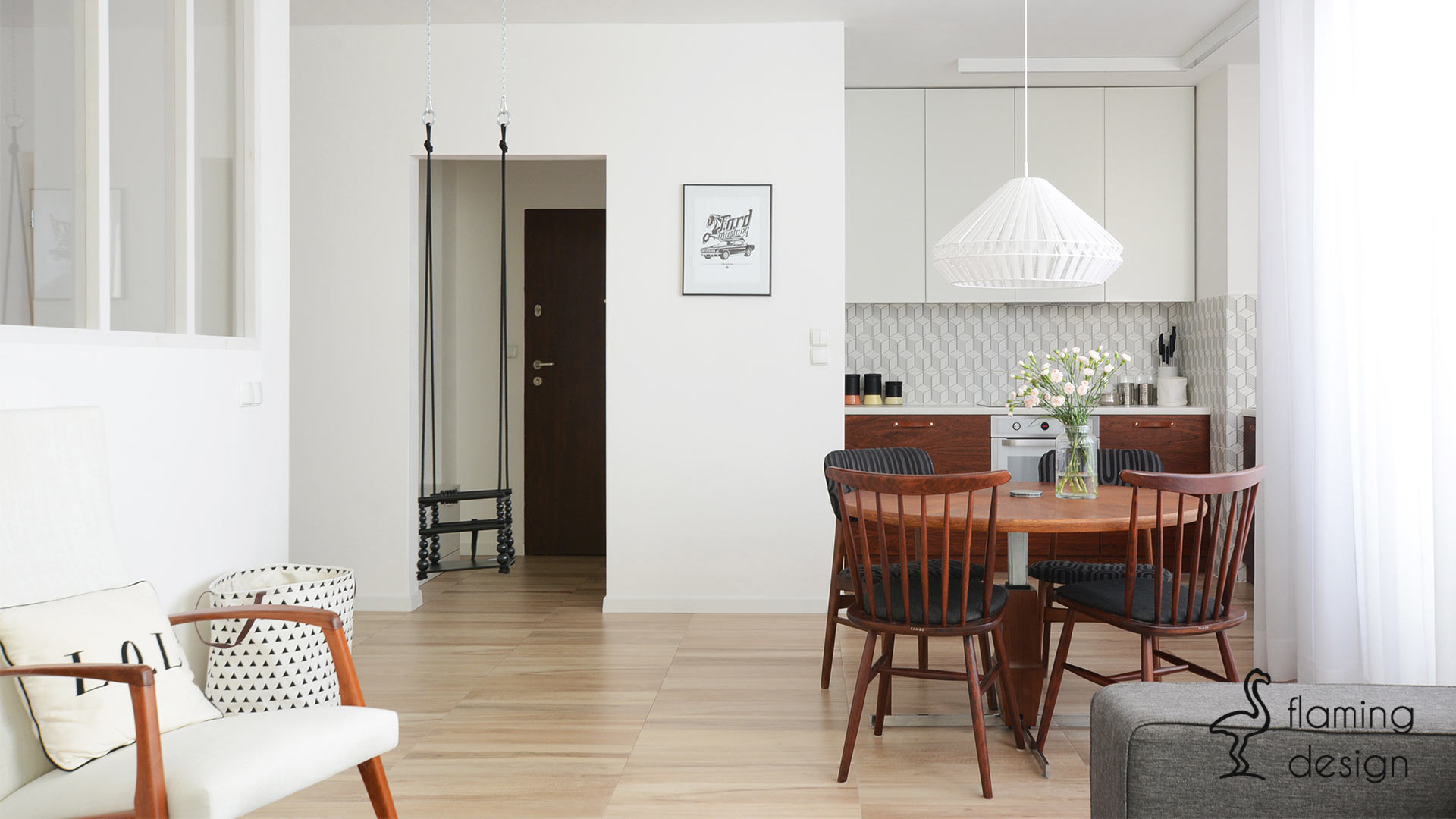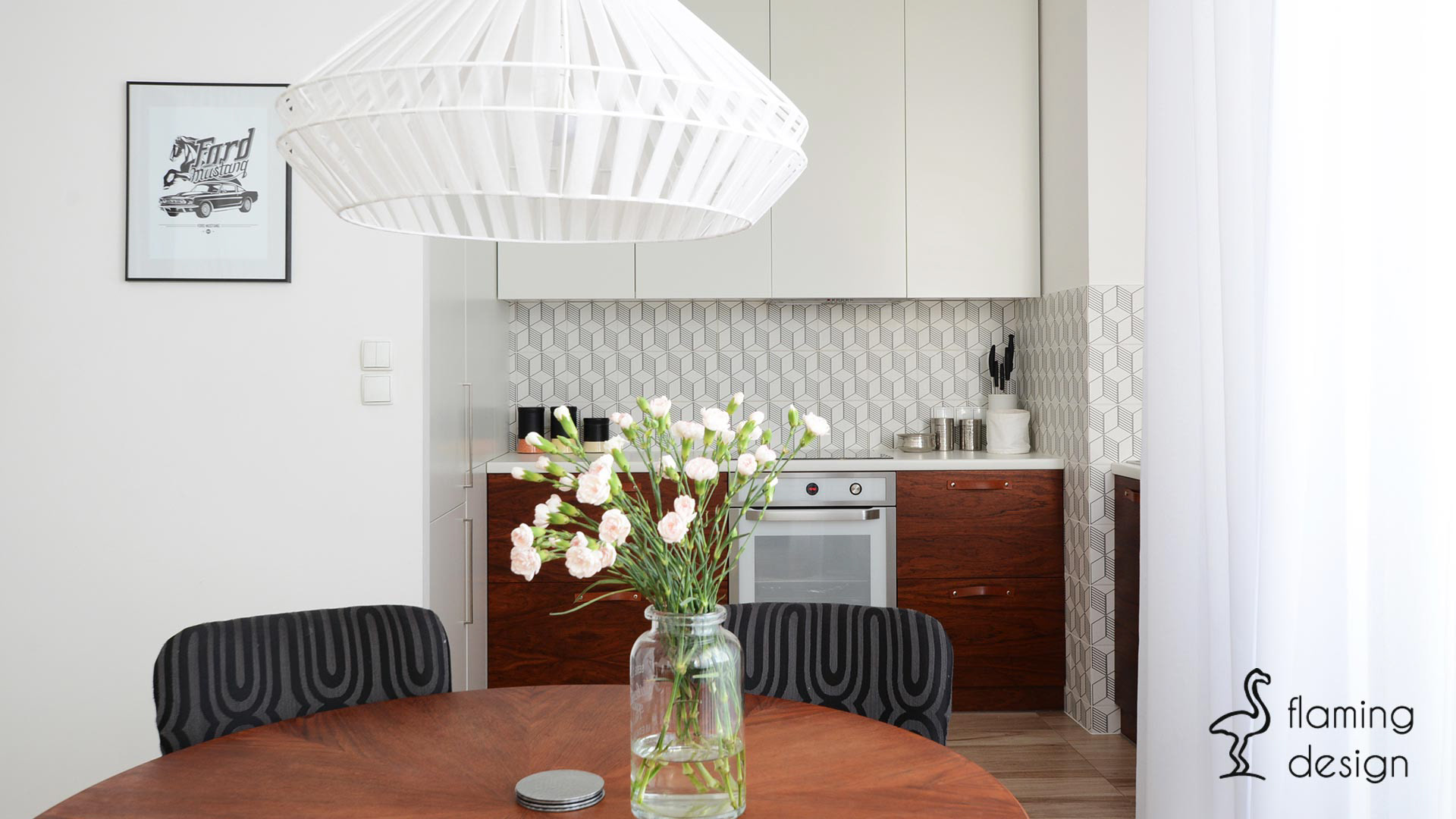 Projekt 3-pokojowego mieszkania o powierzchni 70m2 w stylu nowoczesnym. W celu uzyskania większej przestrzeni zdecydowano się na likwidację jednego z pokojów (pierwotnie mieszkanie było 4-pokojowe), dzięki wyburzeniu ściany powstał dużo większy salon połączony z aneksem kuchennym. Mieszkanie miało być jasne i kolorowe.