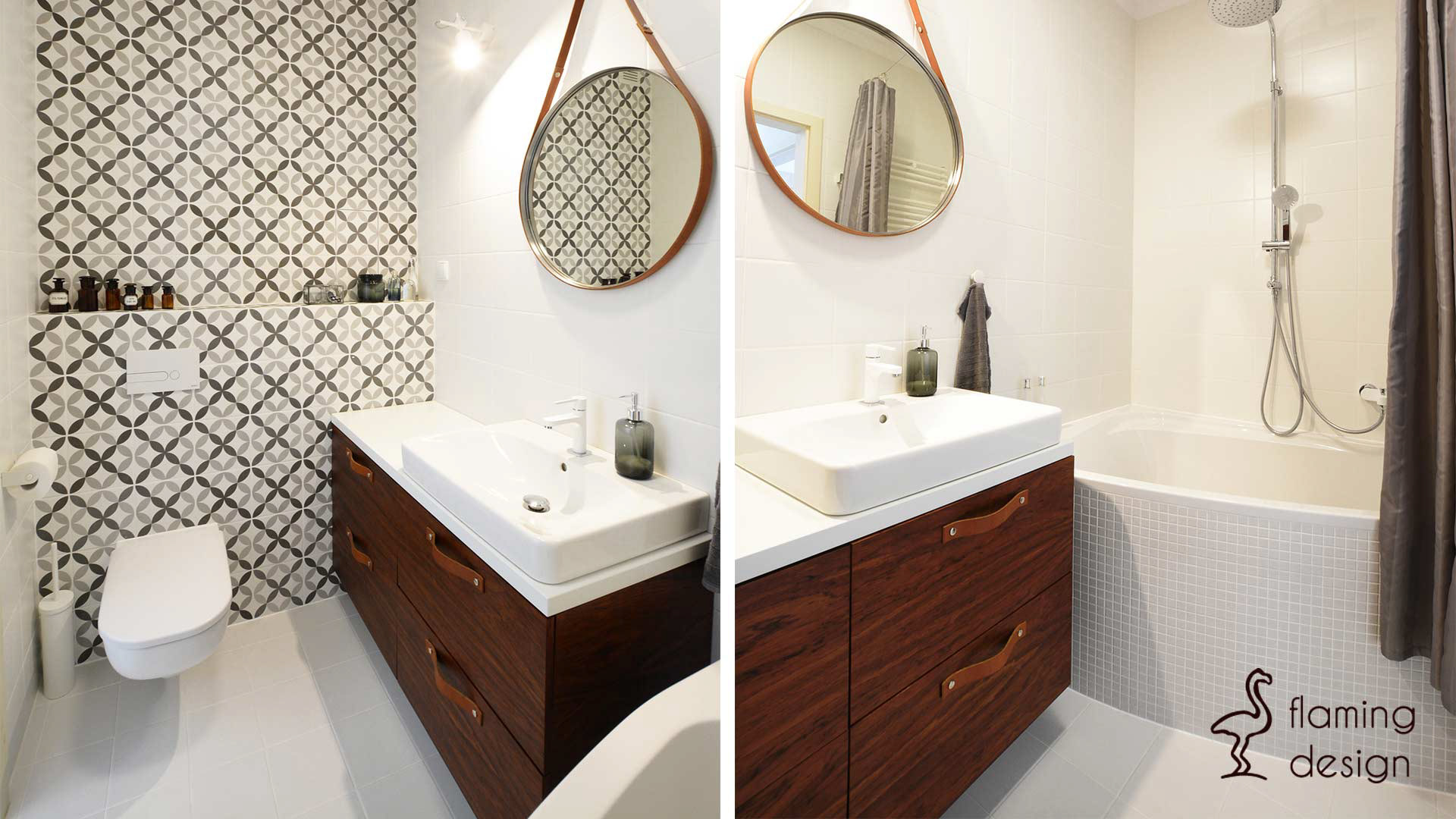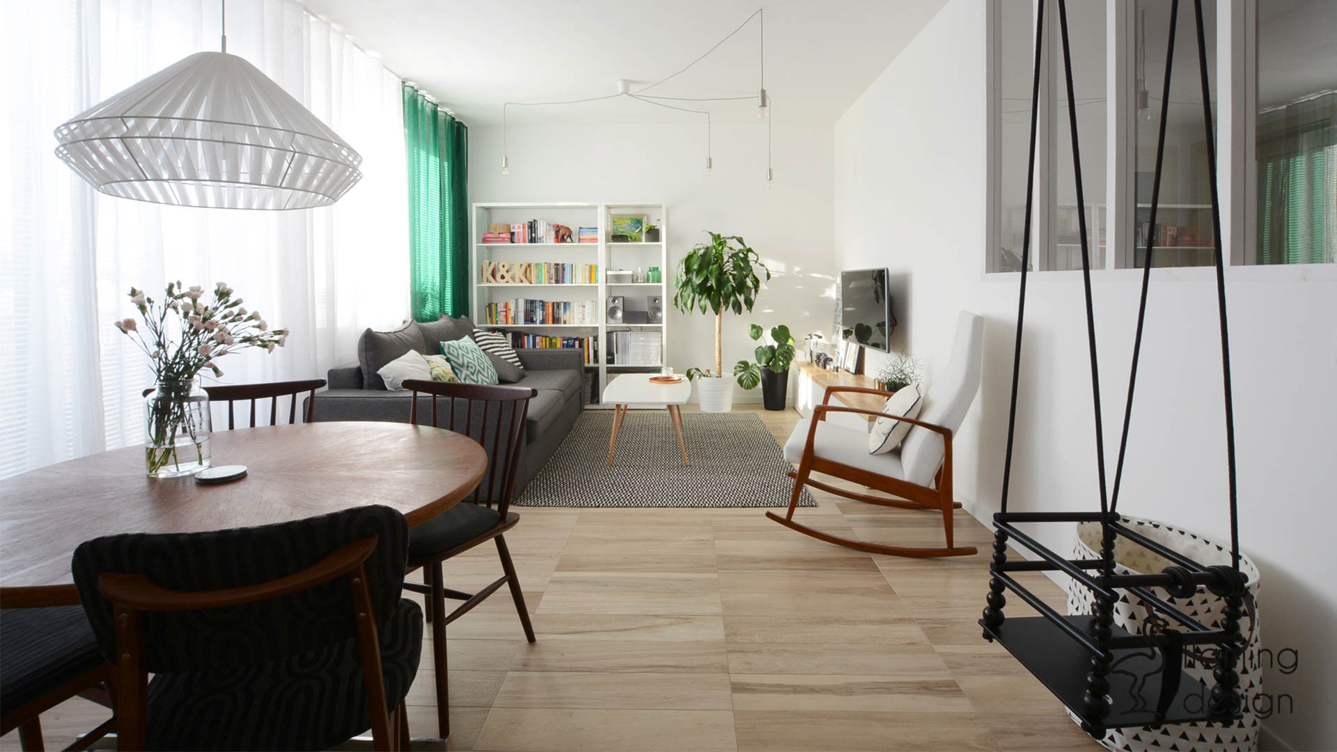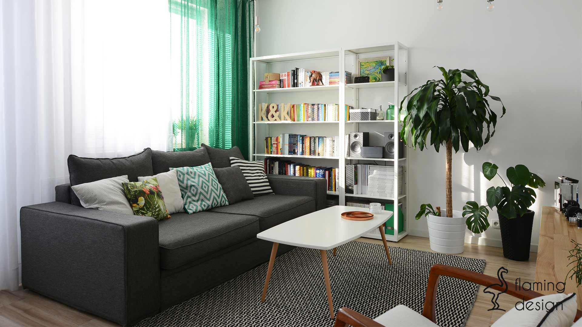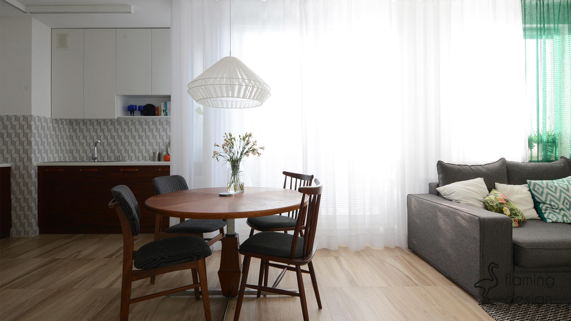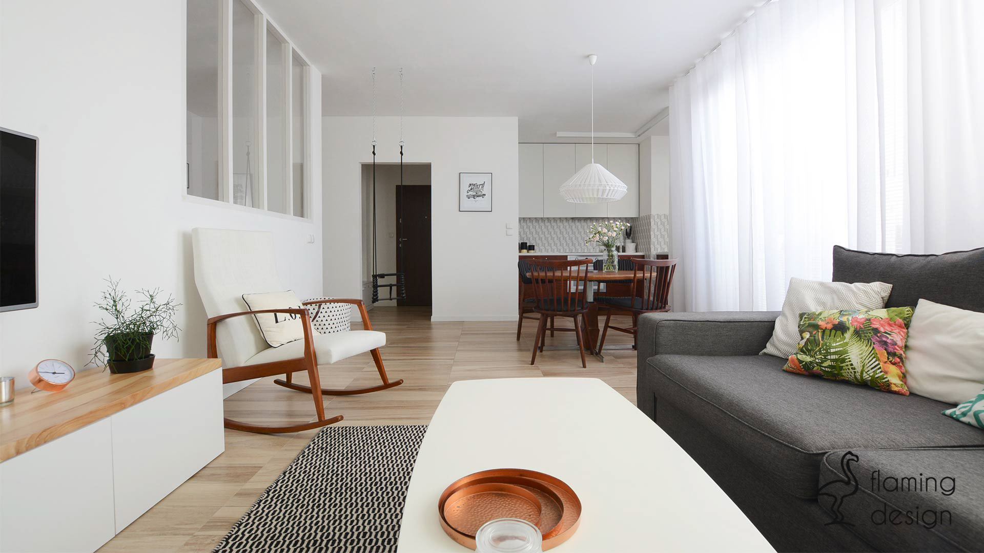 Projekt 3-pokojowego mieszkania o powierzchni 70m2 w stylu nowoczesnym. W celu uzyskania większej przestrzeni zdecydowano się na likwidację jednego z pokojów (pierwotnie mieszkanie było 4-pokojowe), dzięki wyburzeniu ściany powstał dużo większy salon połączony z aneksem kuchennym. Mieszkanie miało być jasne i kolorowe.
