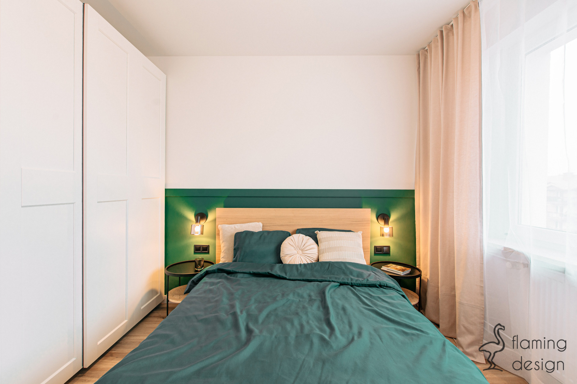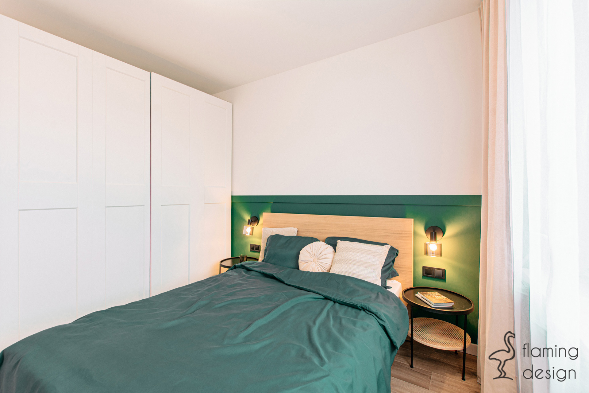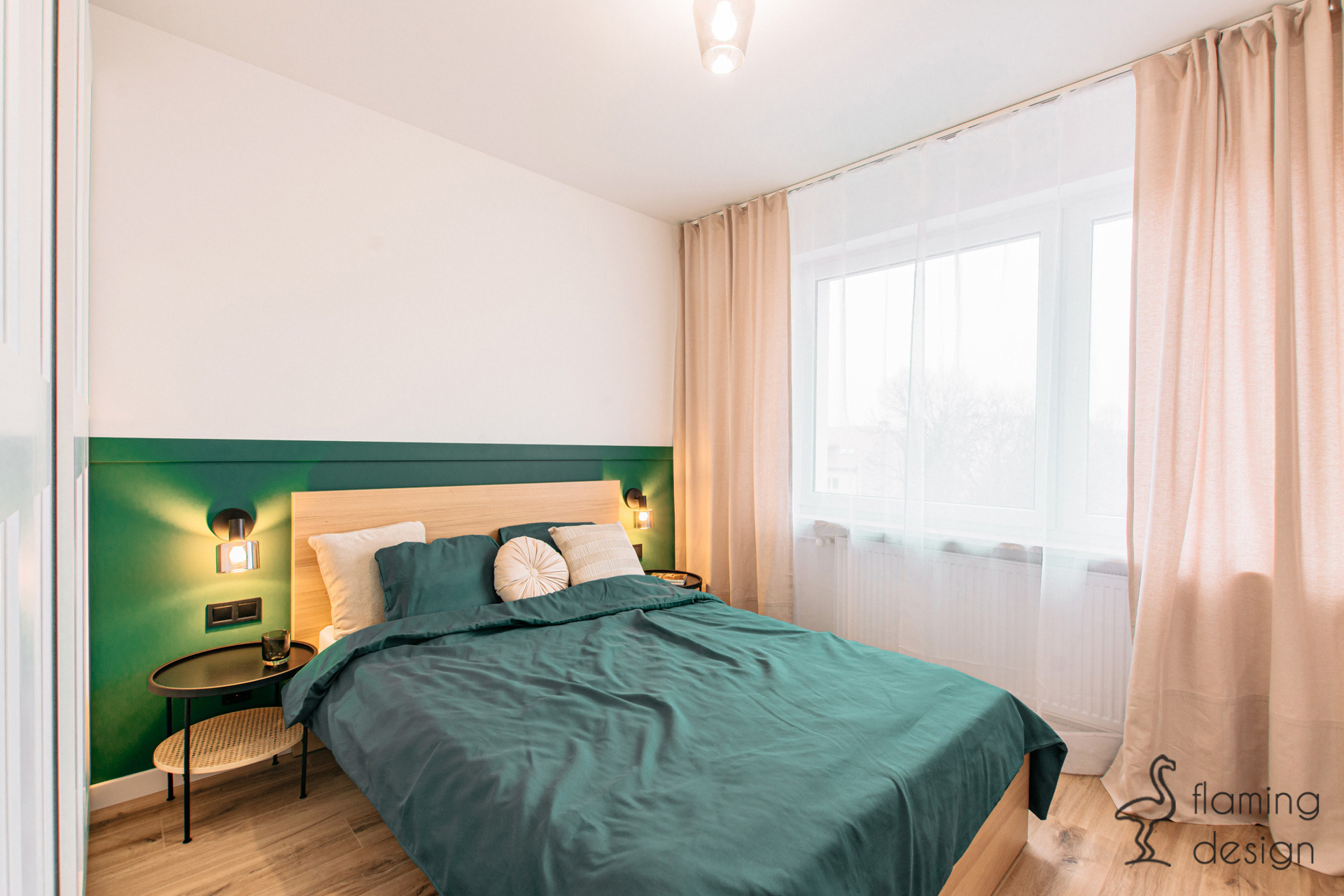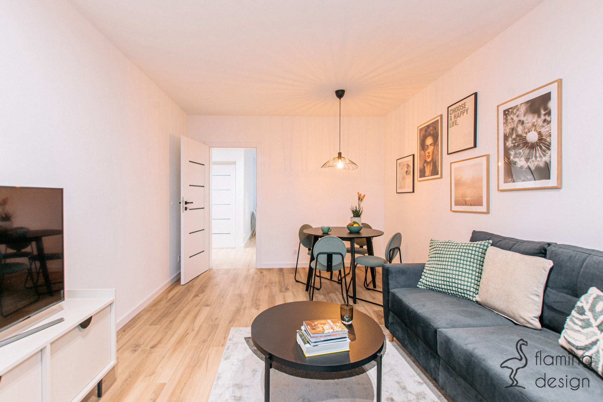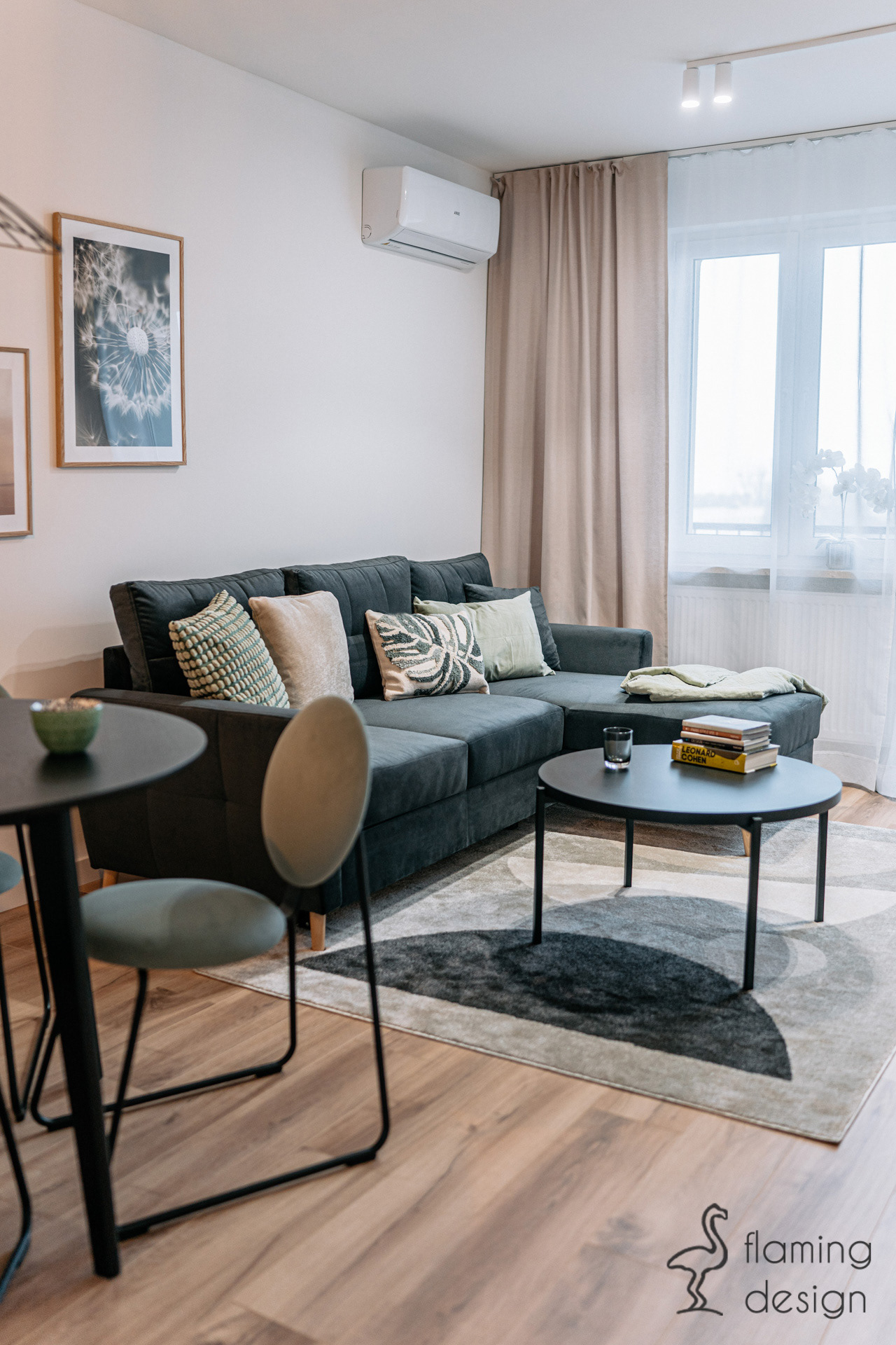 Projekt mieszkania na wynajem. Mieszkanie wymagało generalnego remontu, zachowano taki sam układ funkcjonalny pomieszczeń. W przedpokoju zaprojektowano dużą szafę z siedziskiem i wieszakami. W salonie znalazło się miejsce na rozkładaną sofę, okrągły stół z krzesłami oraz szafkę rtv. Dominują tu kolory takie jak biel, beż, jasny brąz, szałwiowa i butelkowa zieleń oraz czerń. Kuchnia z nowymi szafkami i czarnym okrągłym stolikiem jest bardziej funkcjonalna niż poprzednio. W łazience zaprojektowano szaro-beżowe płytki o wzorze lastryko, czarne dodatki takie jak baterie, kabina prysznicowa oraz zabudowę wnęki w kolorze podłogi w pozostałych pomieszczeniach mieszczącą pralkę i półki. Sypialnia z częścią ściany w kolorze zielonym nawiązuje do kolorów w salonie.
