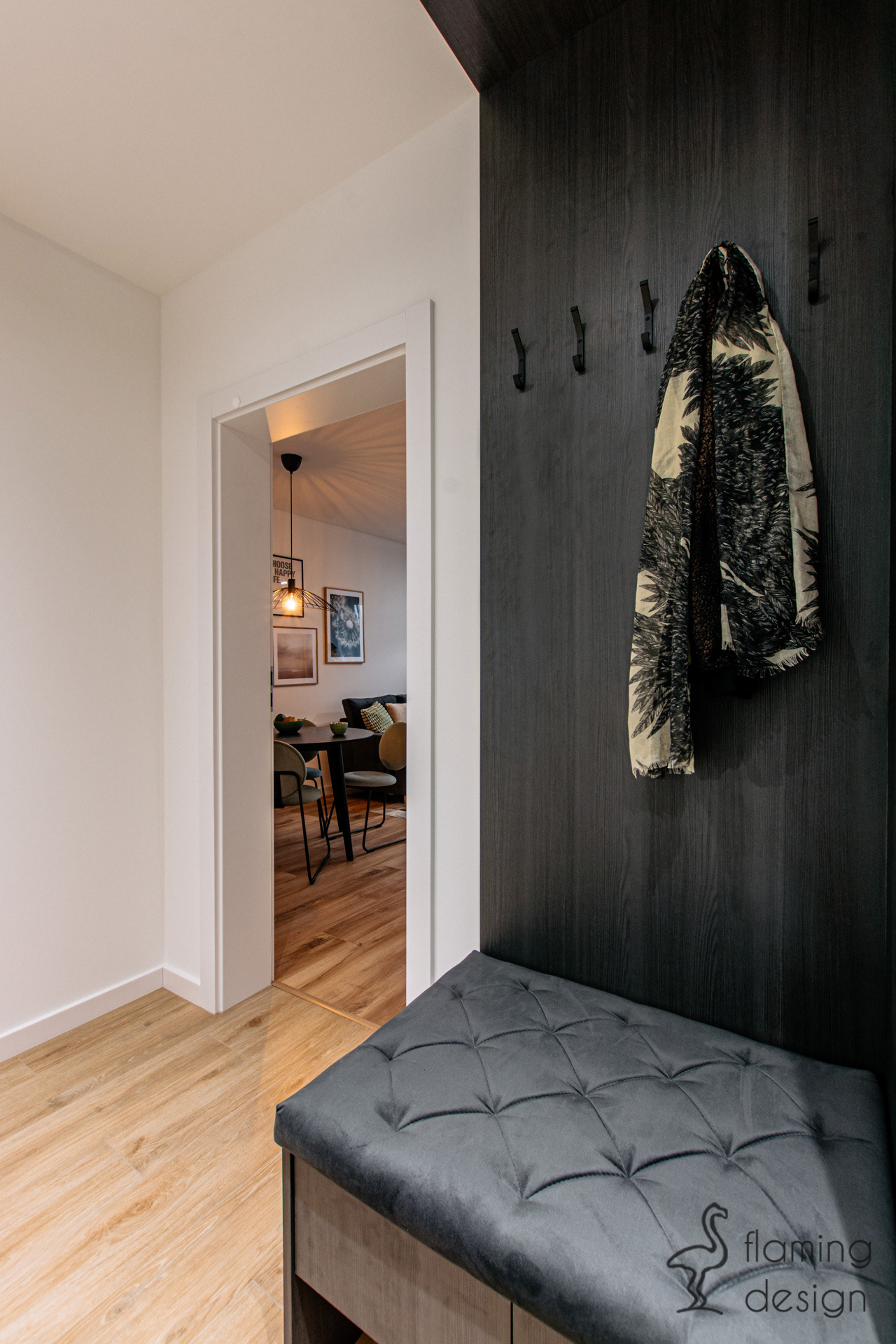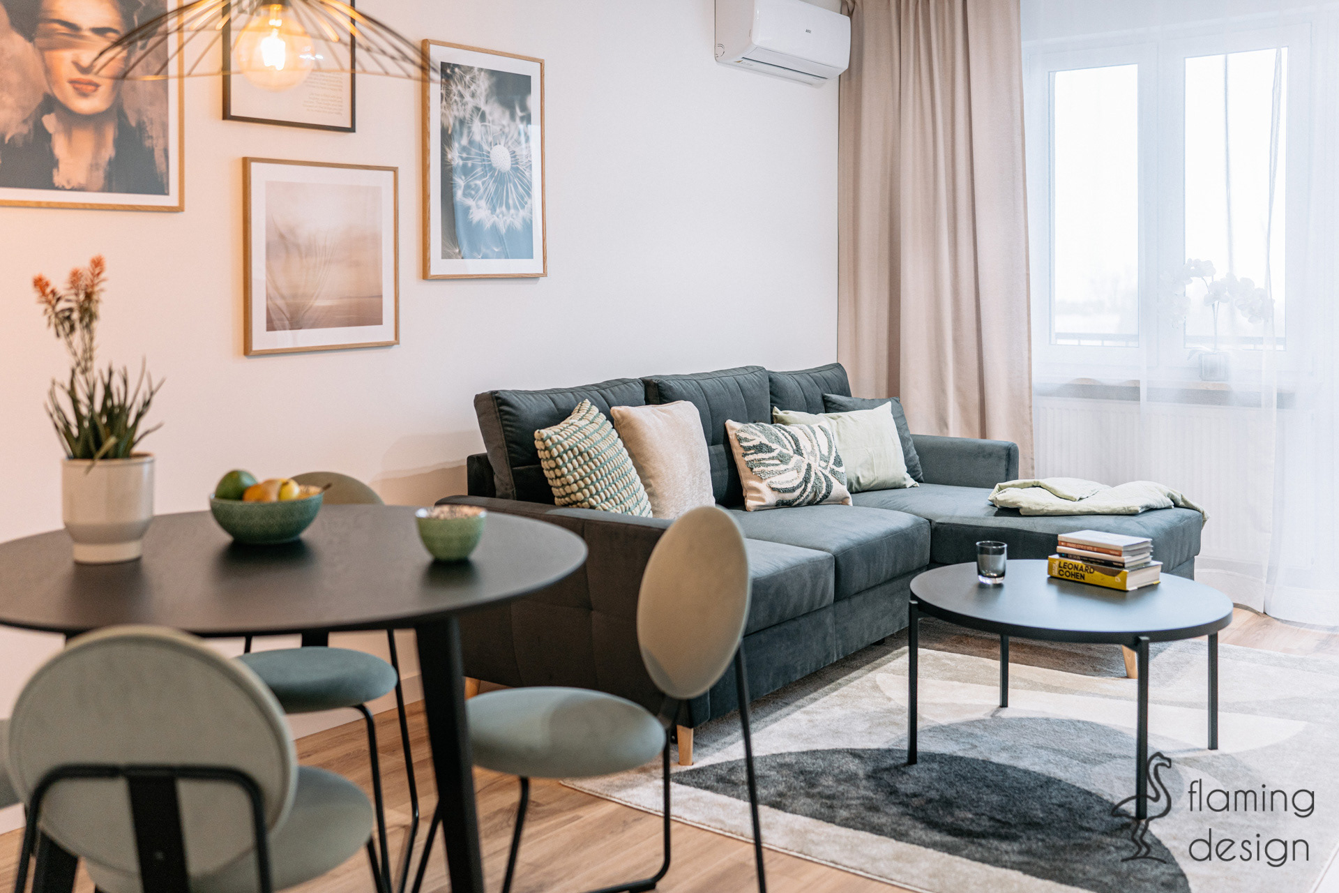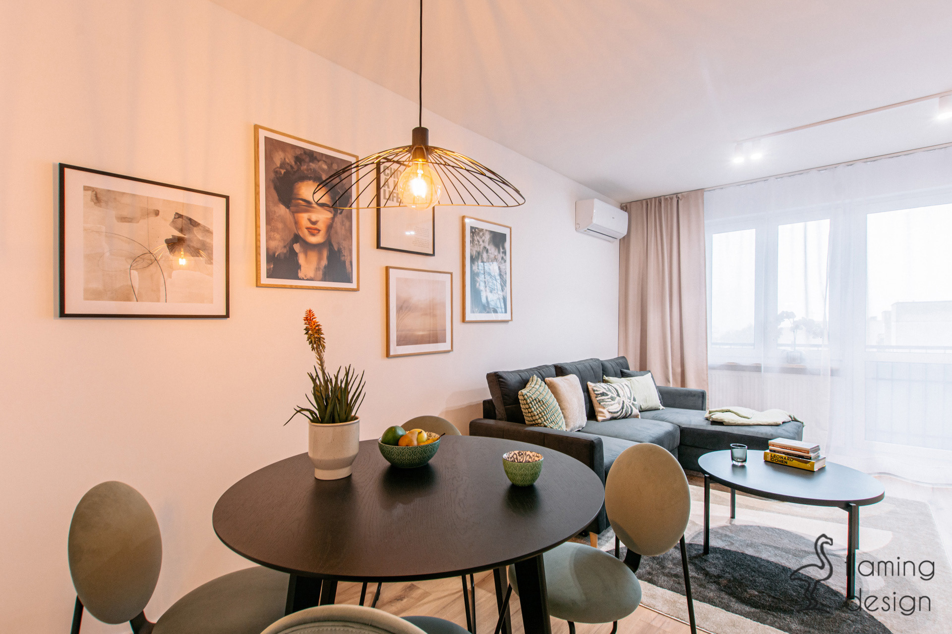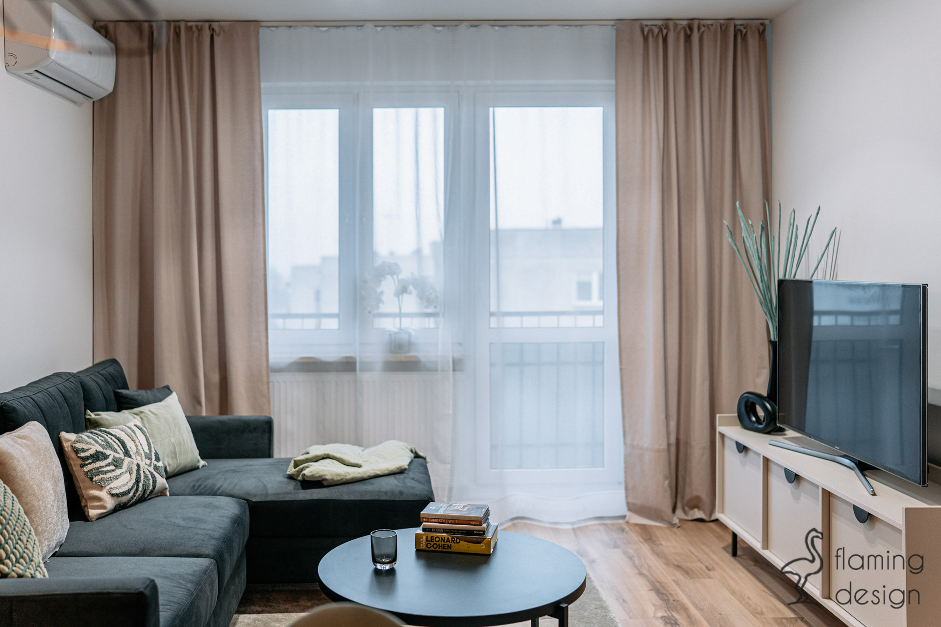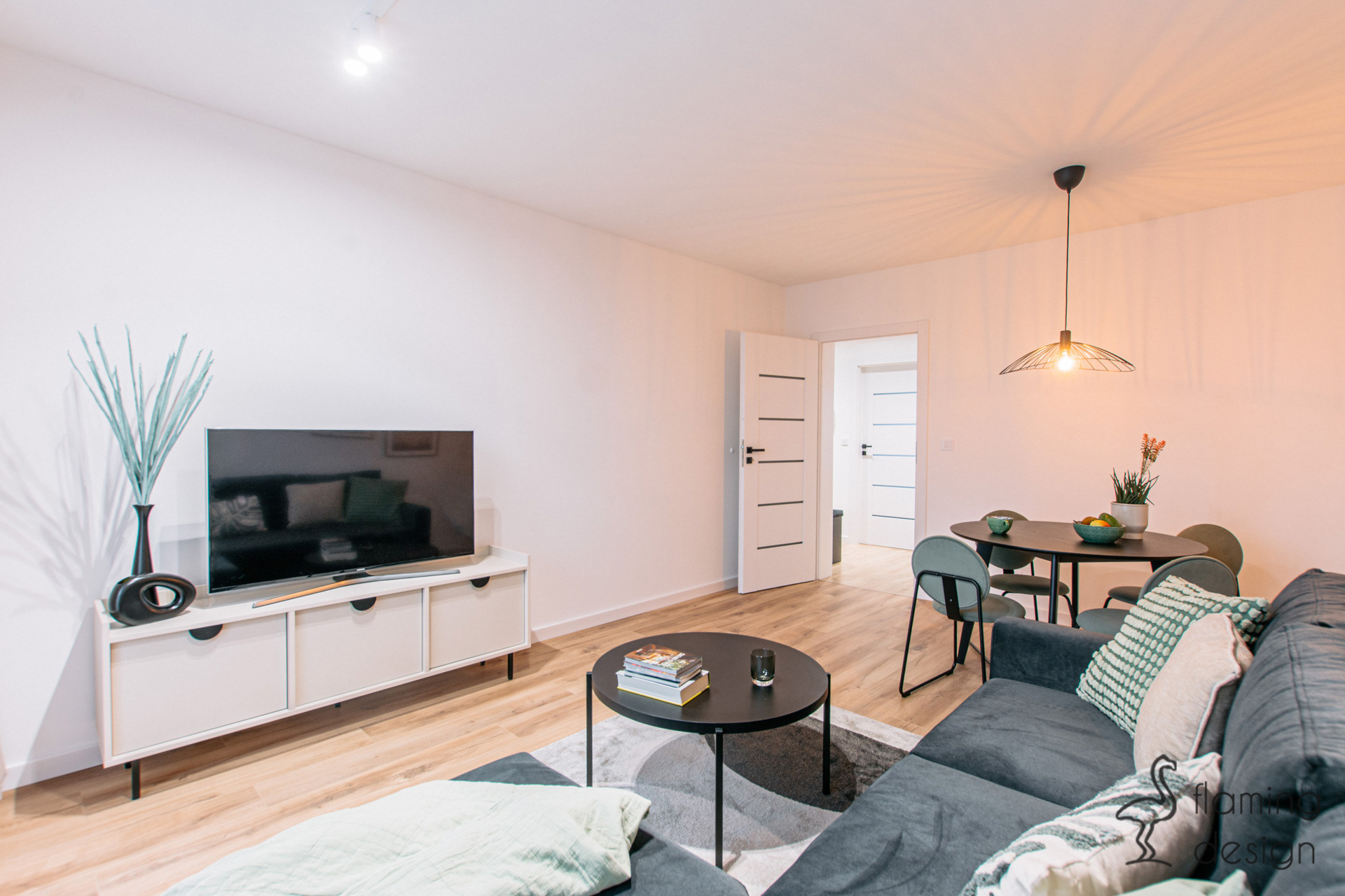 Projekt mieszkania na wynajem. Mieszkanie wymagało generalnego remontu, zachowano taki sam układ funkcjonalny pomieszczeń. W przedpokoju zaprojektowano dużą szafę z siedziskiem i wieszakami. W salonie znalazło się miejsce na rozkładaną sofę, okrągły stół z krzesłami oraz szafkę rtv. Dominują tu kolory takie jak biel, beż, jasny brąz, szałwiowa i butelkowa zieleń oraz czerń. Kuchnia z nowymi szafkami i czarnym okrągłym stolikiem jest bardziej funkcjonalna niż poprzednio. W łazience zaprojektowano szaro-beżowe płytki o wzorze lastryko, czarne dodatki takie jak baterie, kabina prysznicowa oraz zabudowę wnęki w kolorze podłogi w pozostałych pomieszczeniach mieszczącą pralkę i półki. Sypialnia z częścią ściany w kolorze zielonym nawiązuje do kolorów w salonie.