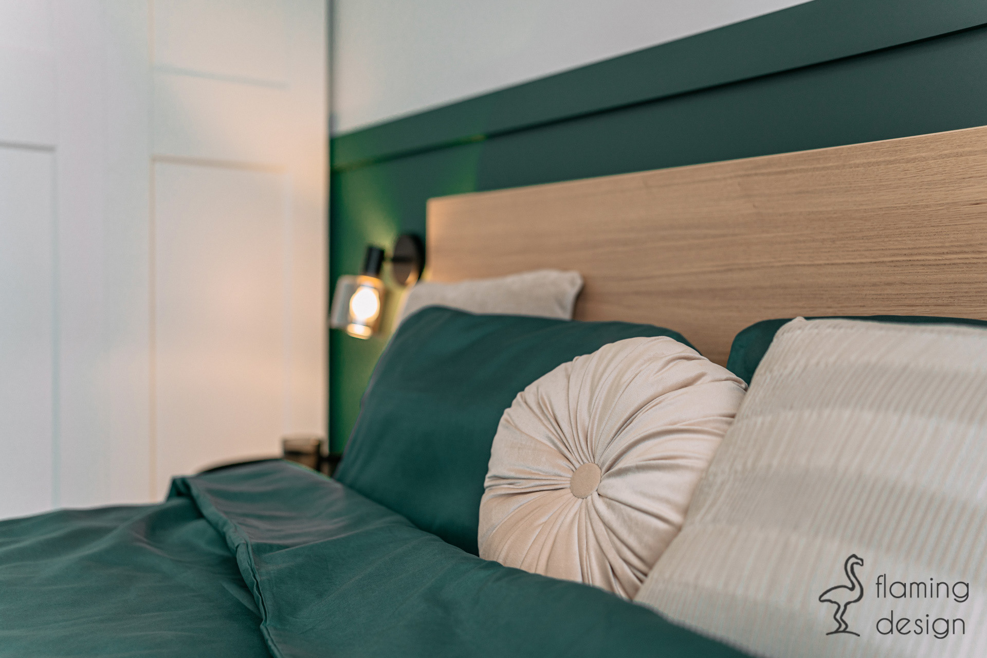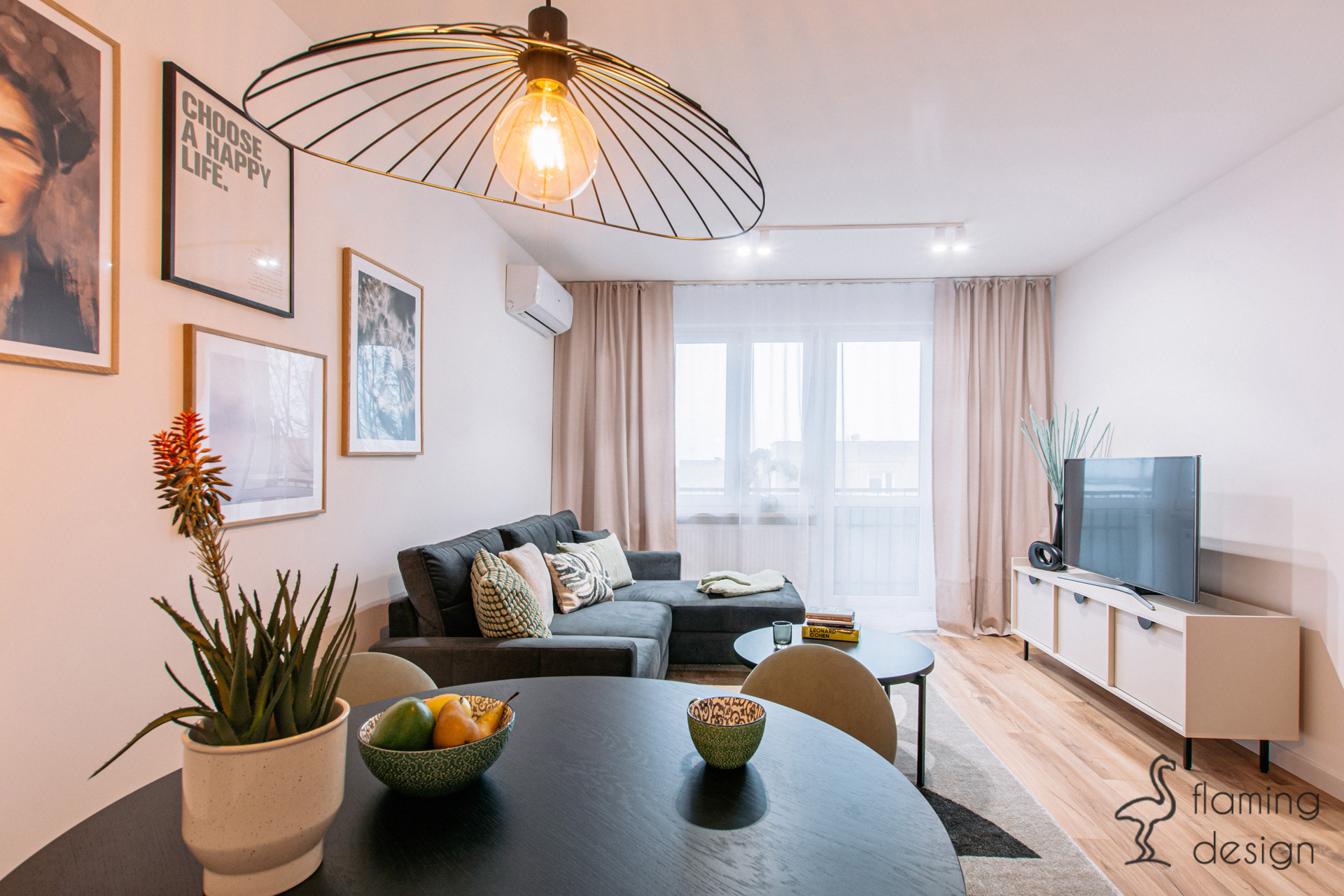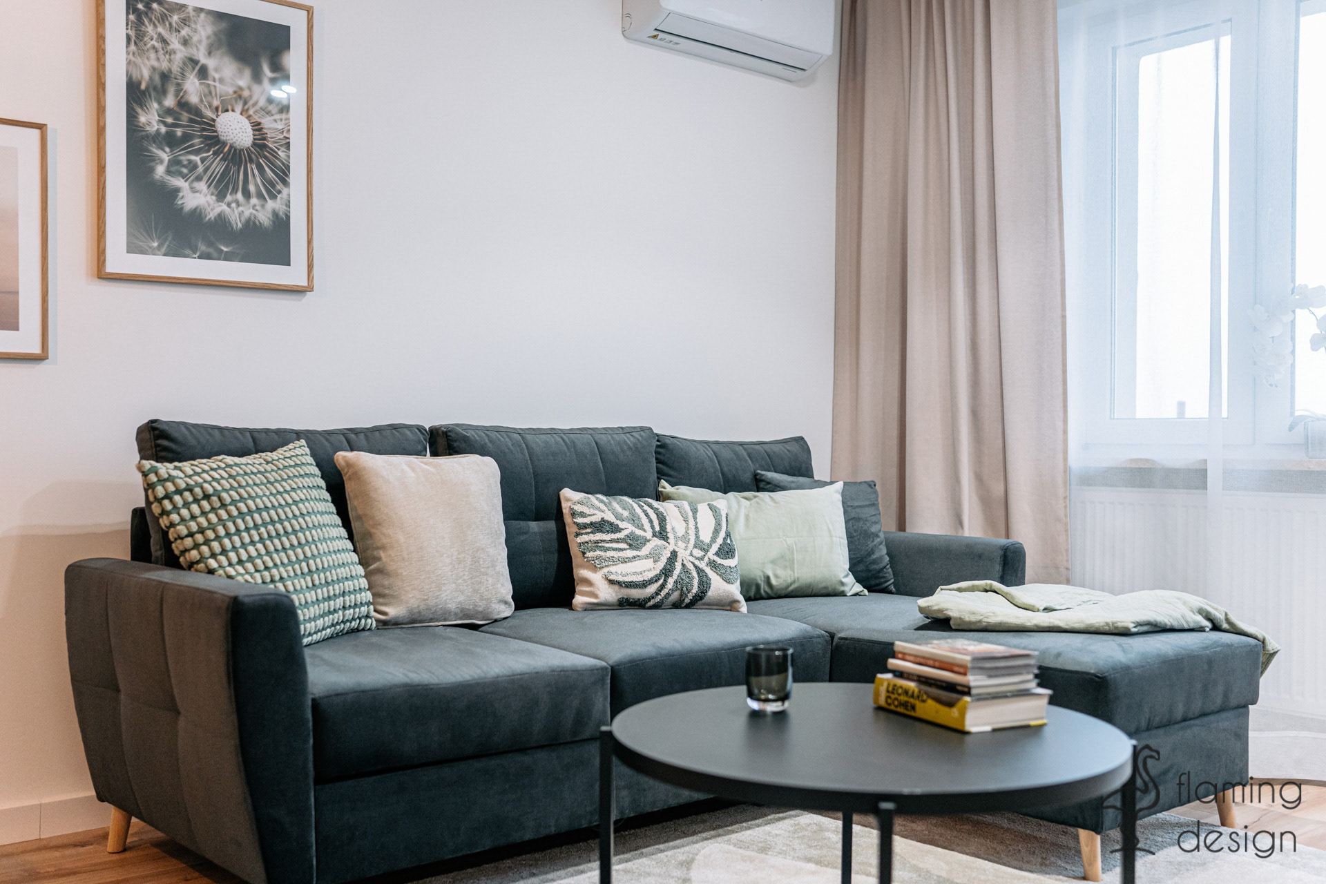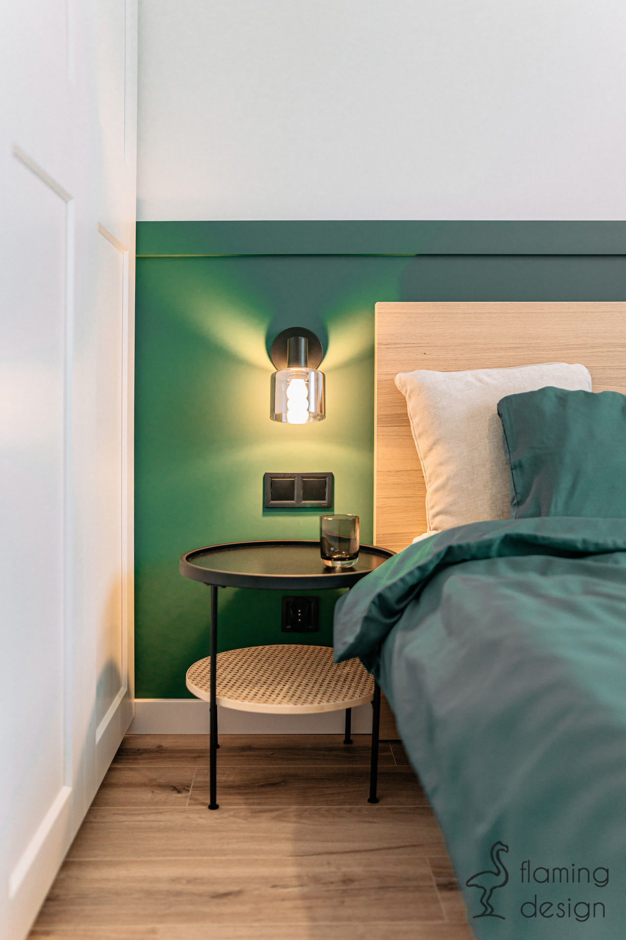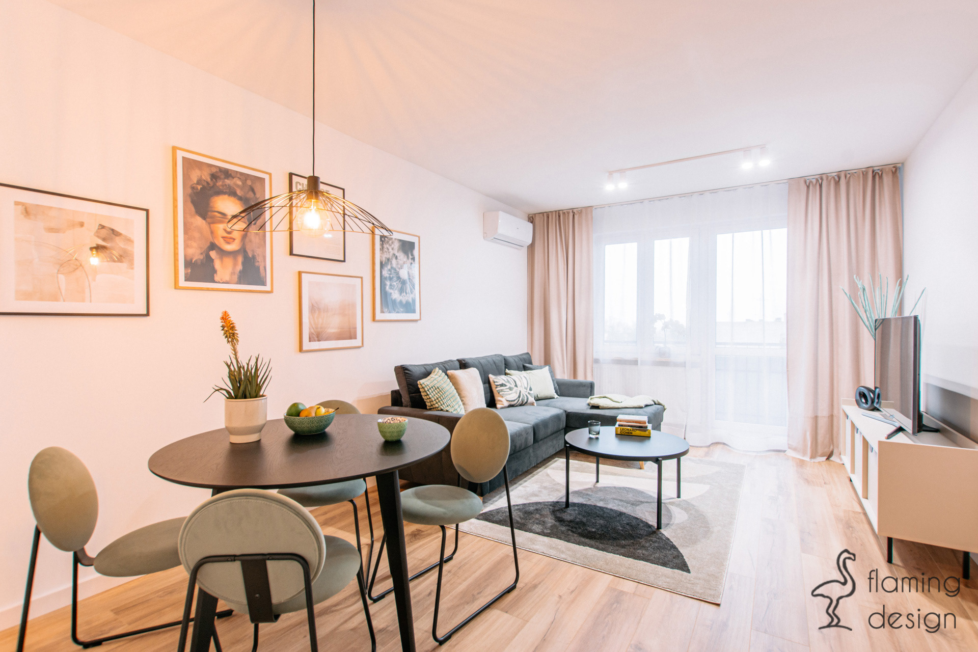 Projekt mieszkania na wynajem. Mieszkanie wymagało generalnego remontu, zachowano taki sam układ funkcjonalny pomieszczeń. W przedpokoju zaprojektowano dużą szafę z siedziskiem i wieszakami. W salonie znalazło się miejsce na rozkładaną sofę, okrągły stół z krzesłami oraz szafkę rtv. Dominują tu kolory takie jak biel, beż, jasny brąz, szałwiowa i butelkowa zieleń oraz czerń. Kuchnia z nowymi szafkami i czarnym okrągłym stolikiem jest bardziej funkcjonalna niż poprzednio. W łazience zaprojektowano szaro-beżowe płytki o wzorze lastryko, czarne dodatki takie jak baterie, kabina prysznicowa oraz zabudowę wnęki w kolorze podłogi w pozostałych pomieszczeniach mieszczącą pralkę i półki. Sypialnia z częścią ściany w kolorze zielonym nawiązuje do kolorów w salonie.