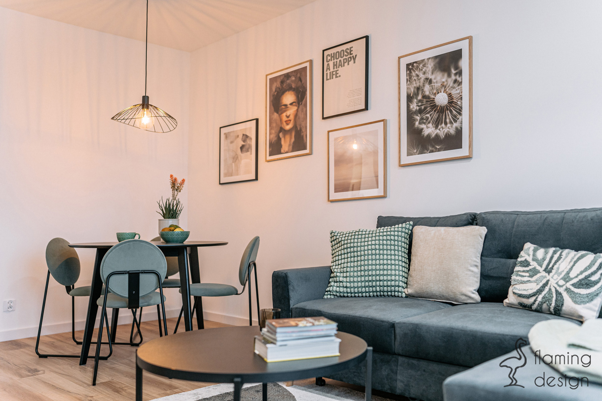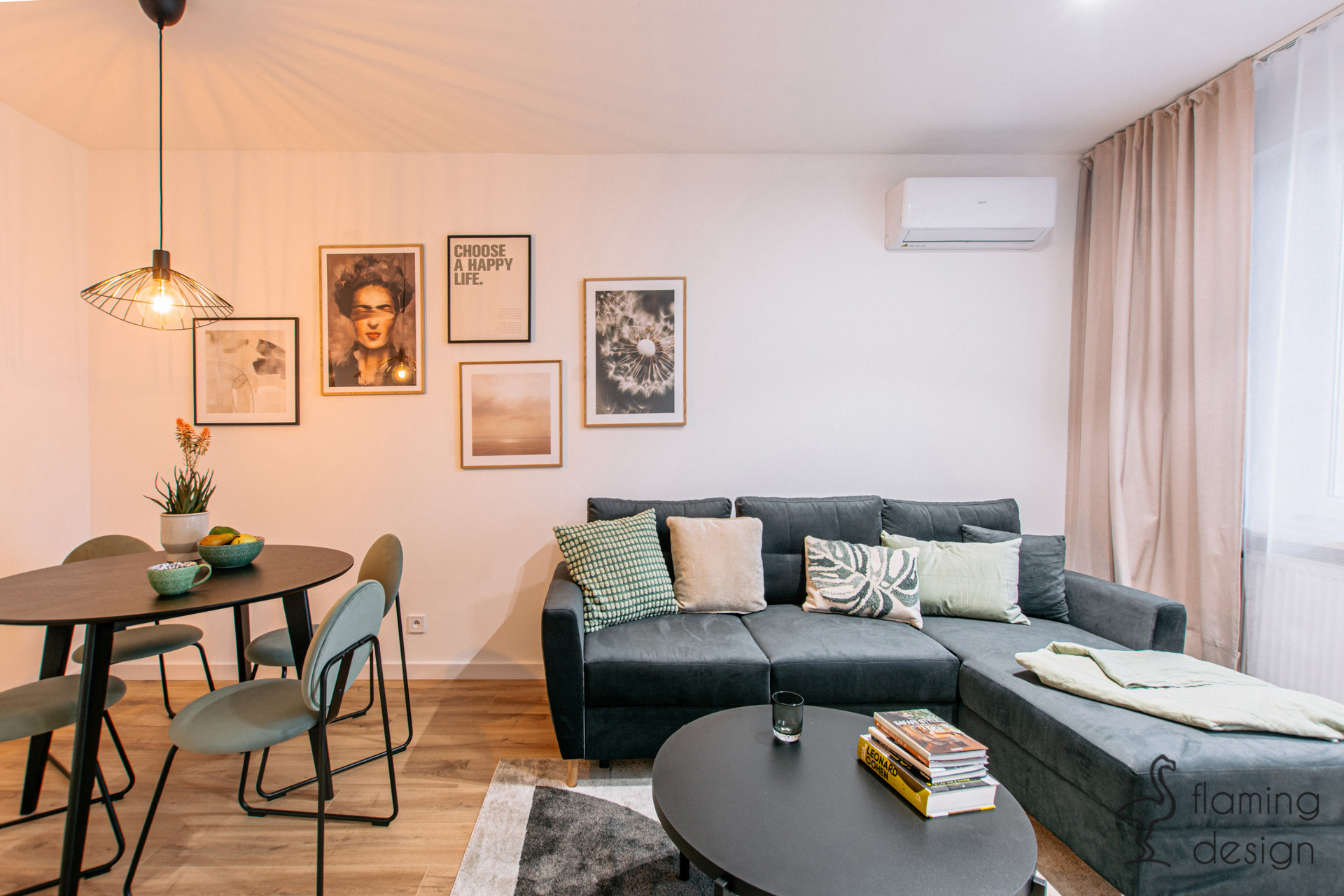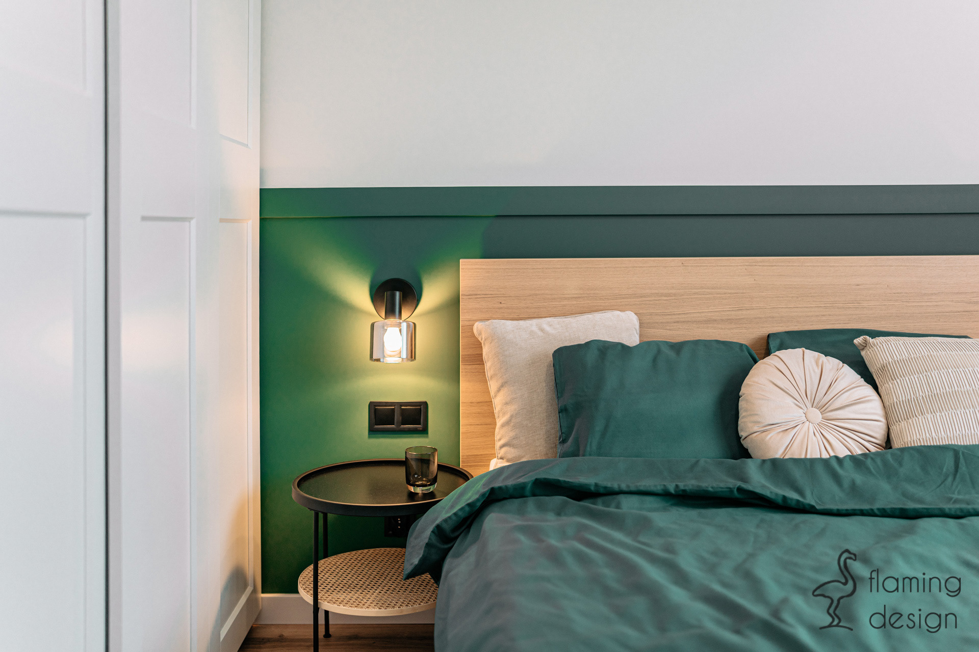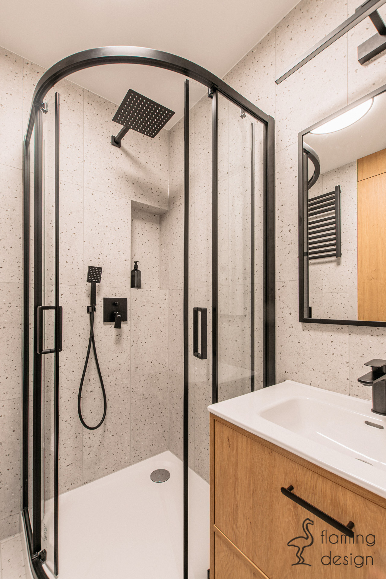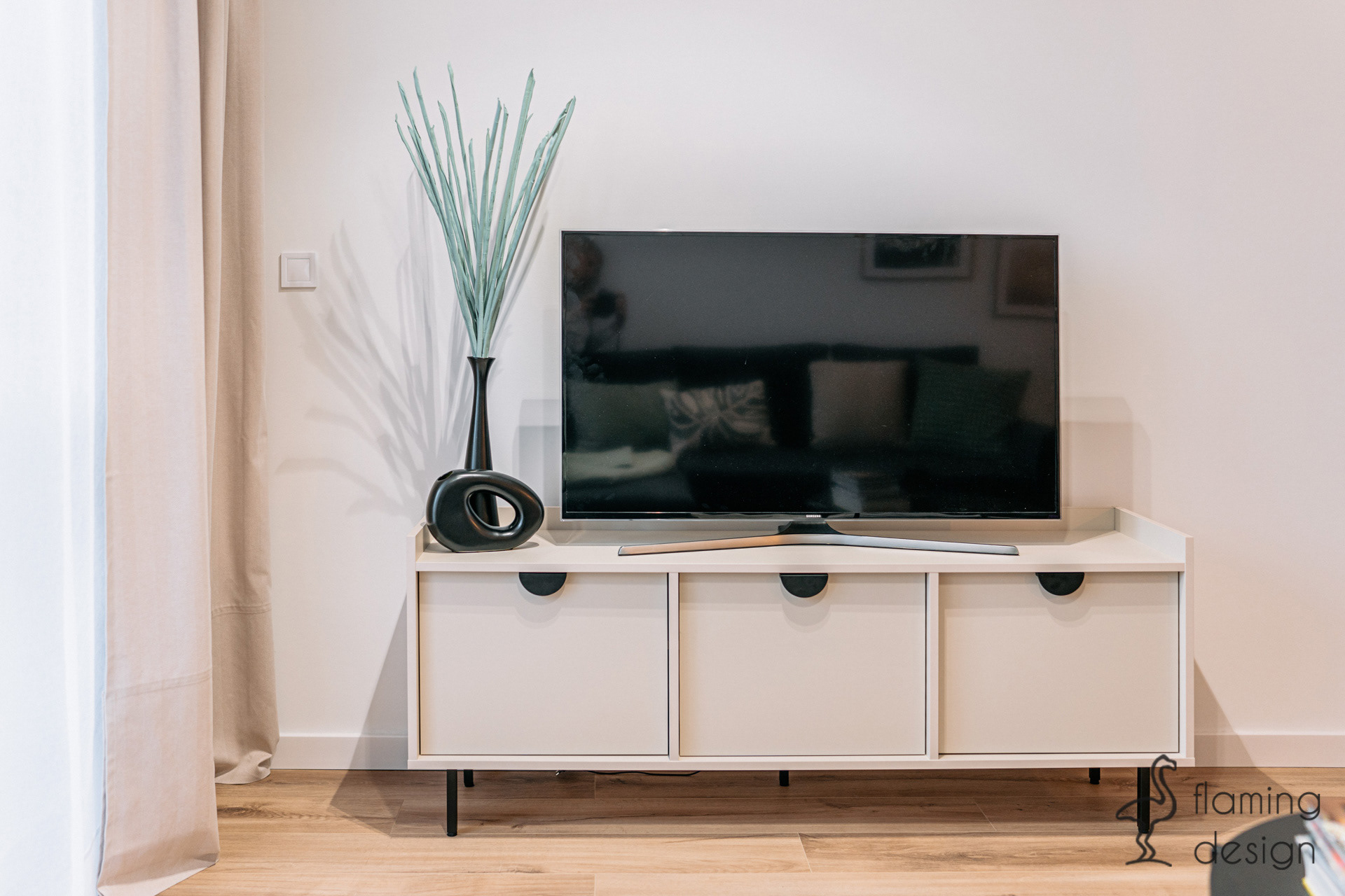 Projekt mieszkania na wynajem. Mieszkanie wymagało generalnego remontu, zachowano taki sam układ funkcjonalny pomieszczeń. W przedpokoju zaprojektowano dużą szafę z siedziskiem i wieszakami. W salonie znalazło się miejsce na rozkładaną sofę, okrągły stół z krzesłami oraz szafkę rtv. Dominują tu kolory takie jak biel, beż, jasny brąz, szałwiowa i butelkowa zieleń oraz czerń. Kuchnia z nowymi szafkami i czarnym okrągłym stolikiem jest bardziej funkcjonalna niż poprzednio. W łazience zaprojektowano szaro-beżowe płytki o wzorze lastryko, czarne dodatki takie jak baterie, kabina prysznicowa oraz zabudowę wnęki w kolorze podłogi w pozostałych pomieszczeniach mieszczącą pralkę i półki. Sypialnia z częścią ściany w kolorze zielonym nawiązuje do kolorów w salonie.