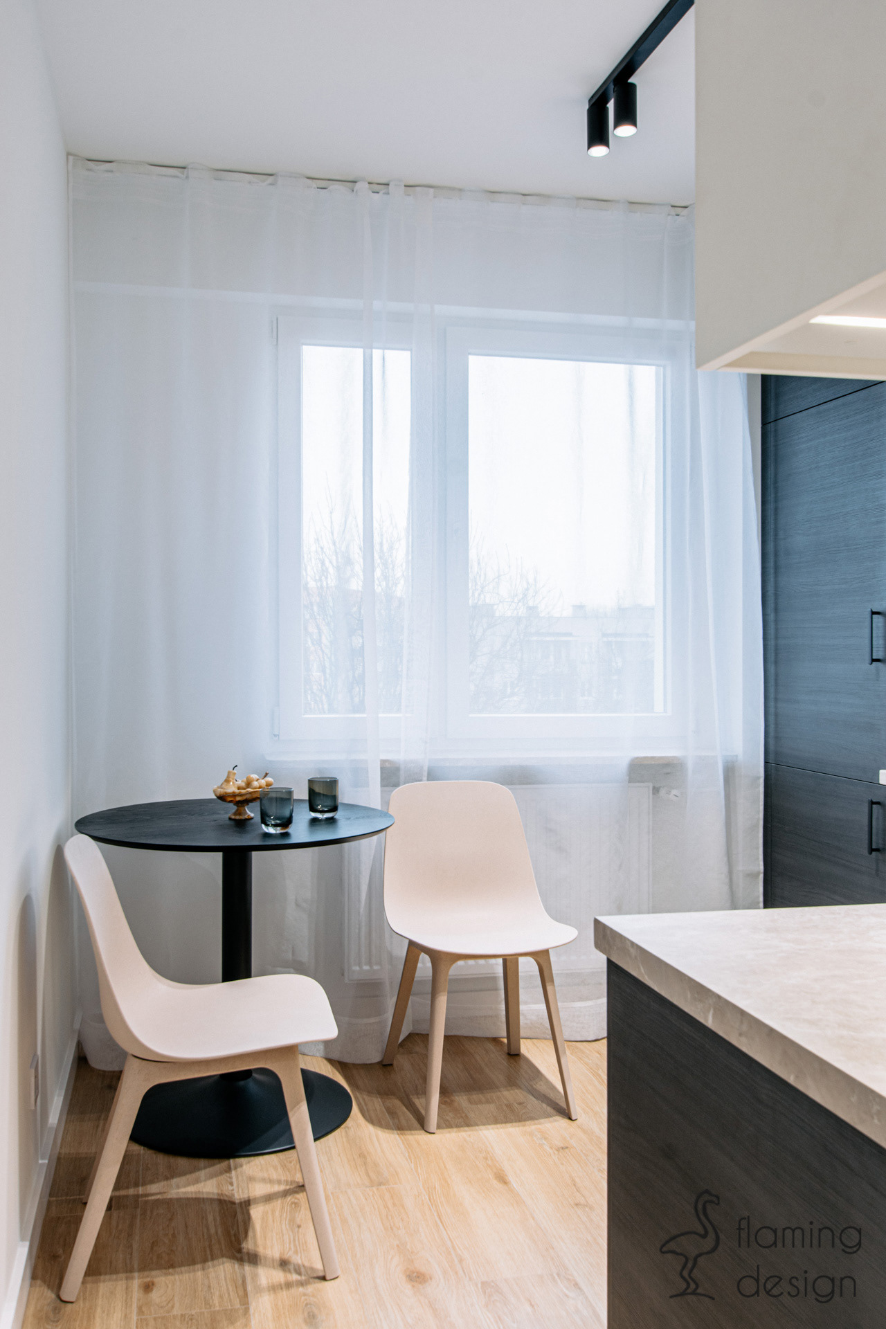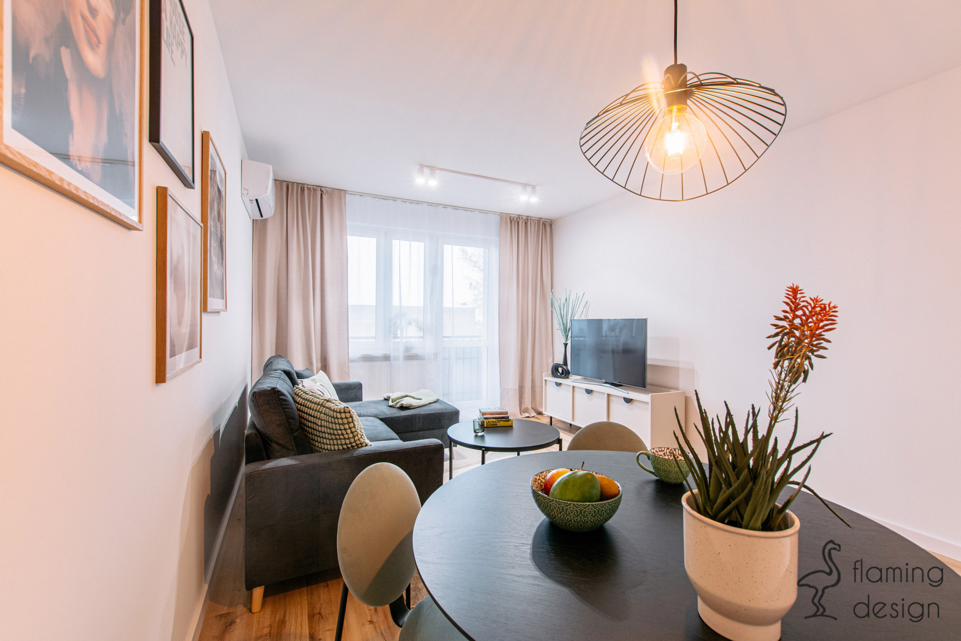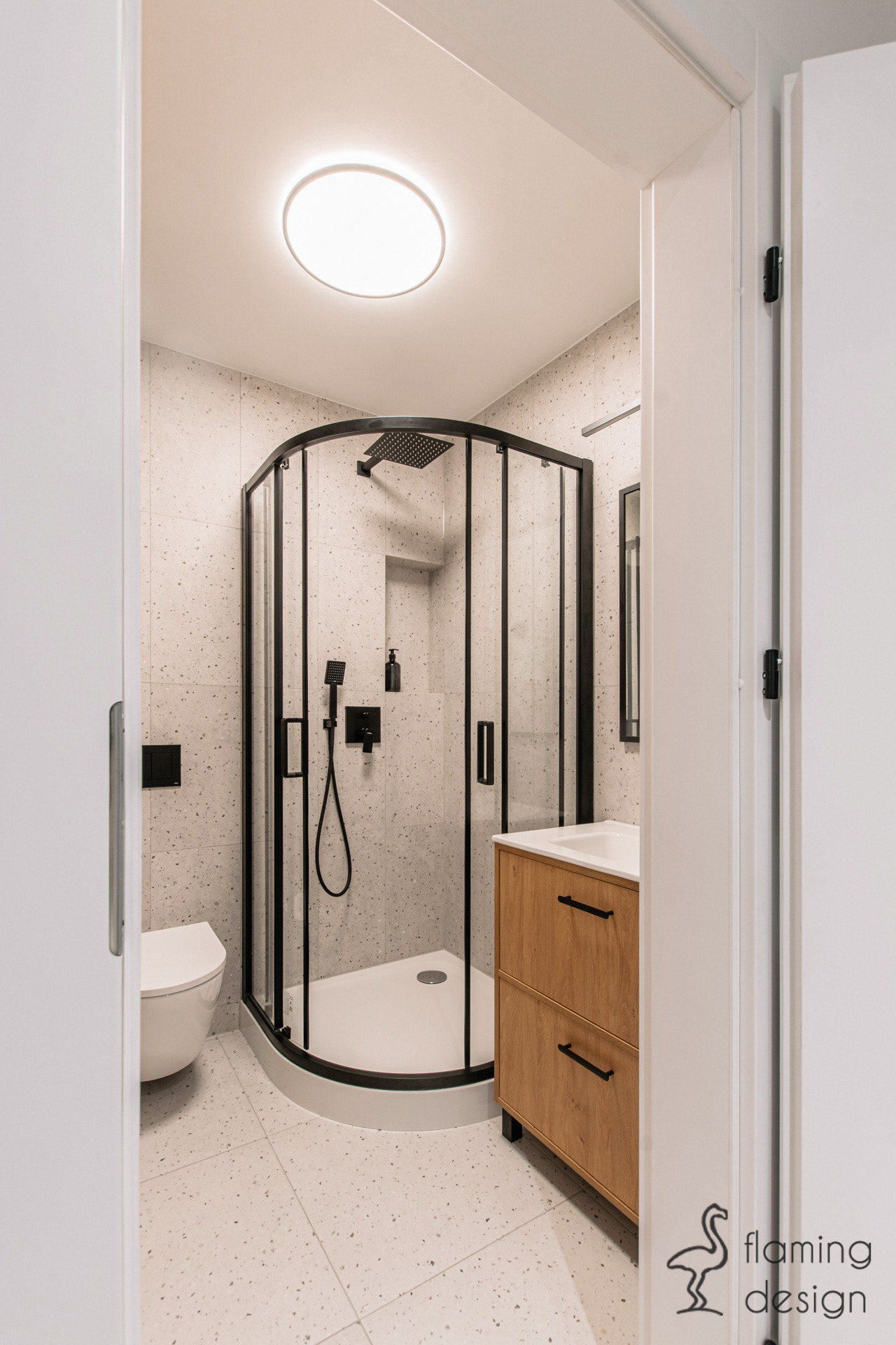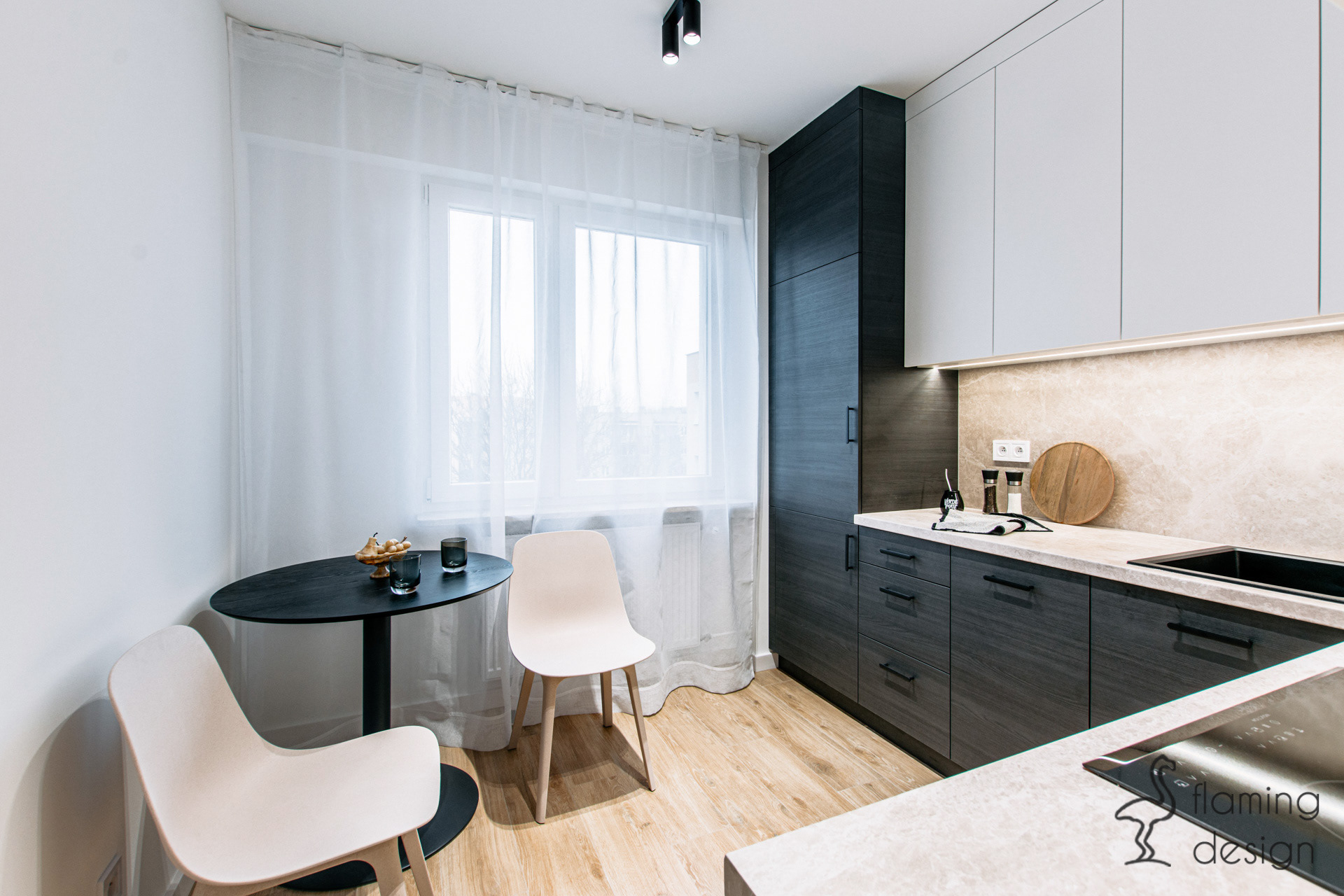 Projekt mieszkania na wynajem. Mieszkanie wymagało generalnego remontu, zachowano taki sam układ funkcjonalny pomieszczeń. W przedpokoju zaprojektowano dużą szafę z siedziskiem i wieszakami. W salonie znalazło się miejsce na rozkładaną sofę, okrągły stół z krzesłami oraz szafkę rtv. Dominują tu kolory takie jak biel, beż, jasny brąz, szałwiowa i butelkowa zieleń oraz czerń. Kuchnia z nowymi szafkami i czarnym okrągłym stolikiem jest bardziej funkcjonalna niż poprzednio. W łazience zaprojektowano szaro-beżowe płytki o wzorze lastryko, czarne dodatki takie jak baterie, kabina prysznicowa oraz zabudowę wnęki w kolorze podłogi w pozostałych pomieszczeniach mieszczącą pralkę i półki. Sypialnia z częścią ściany w kolorze zielonym nawiązuje do kolorów w salonie.