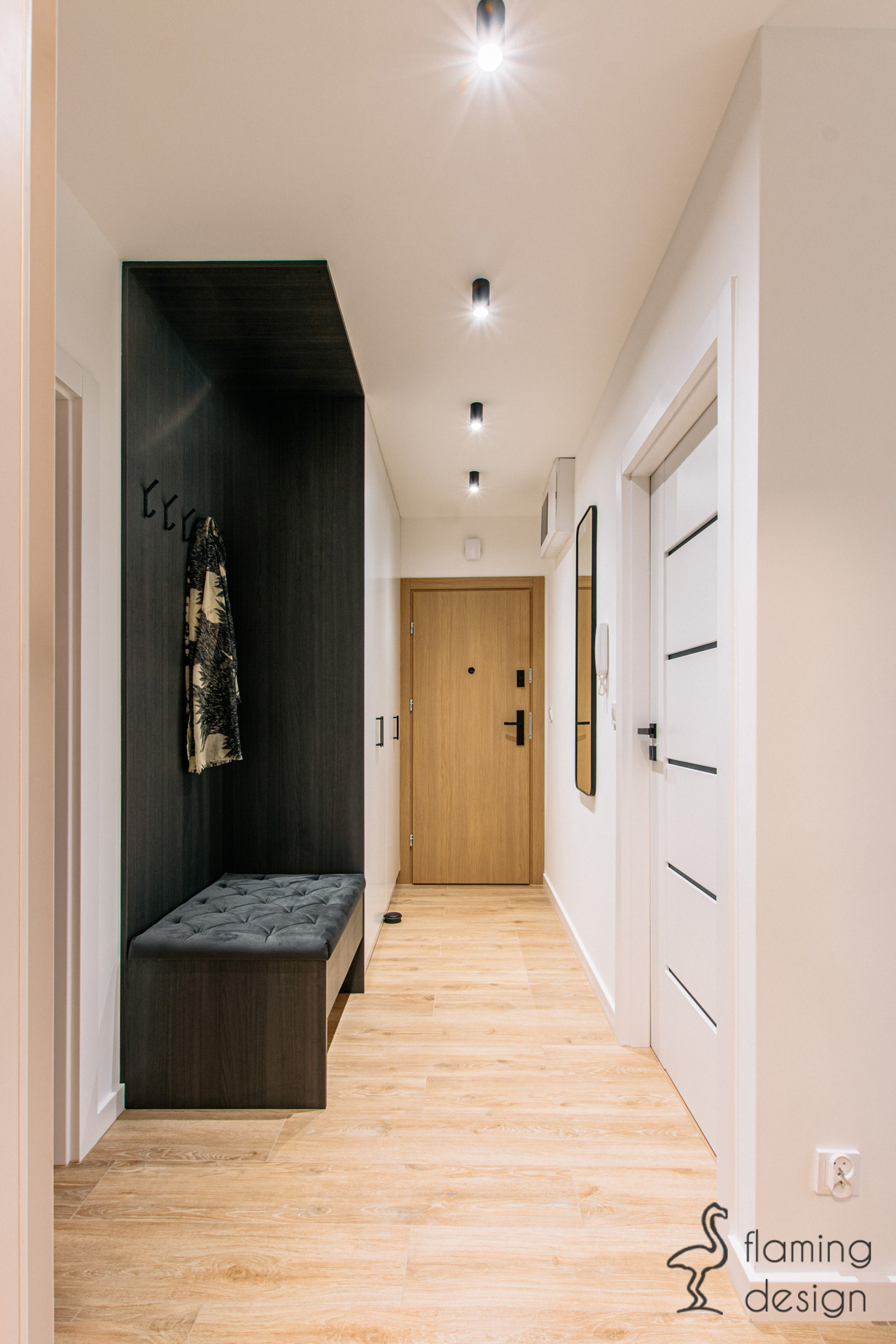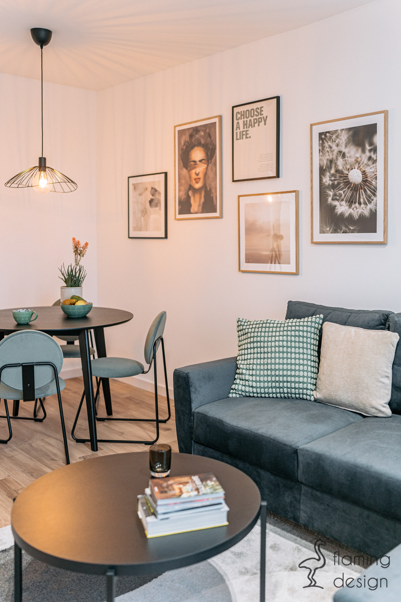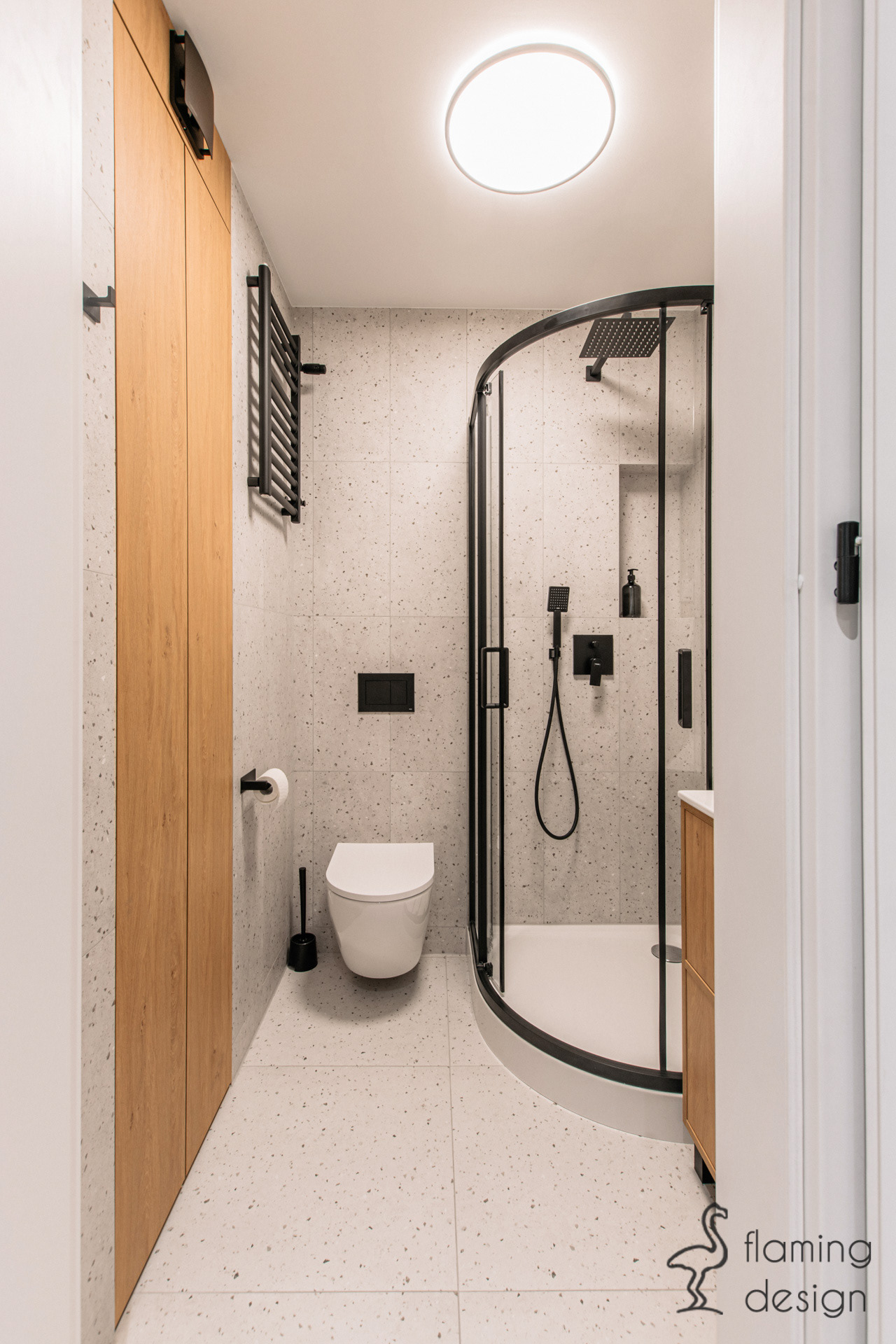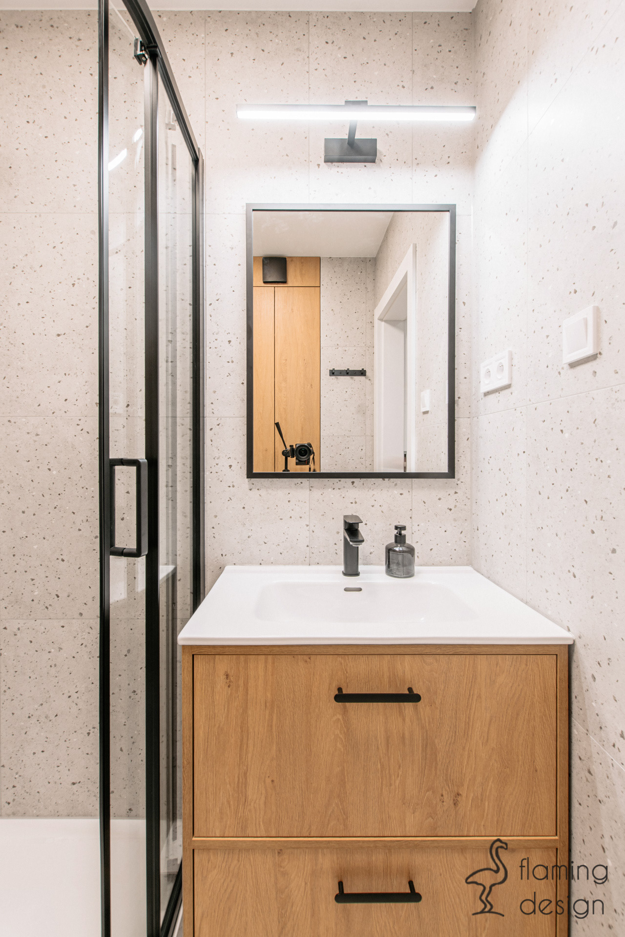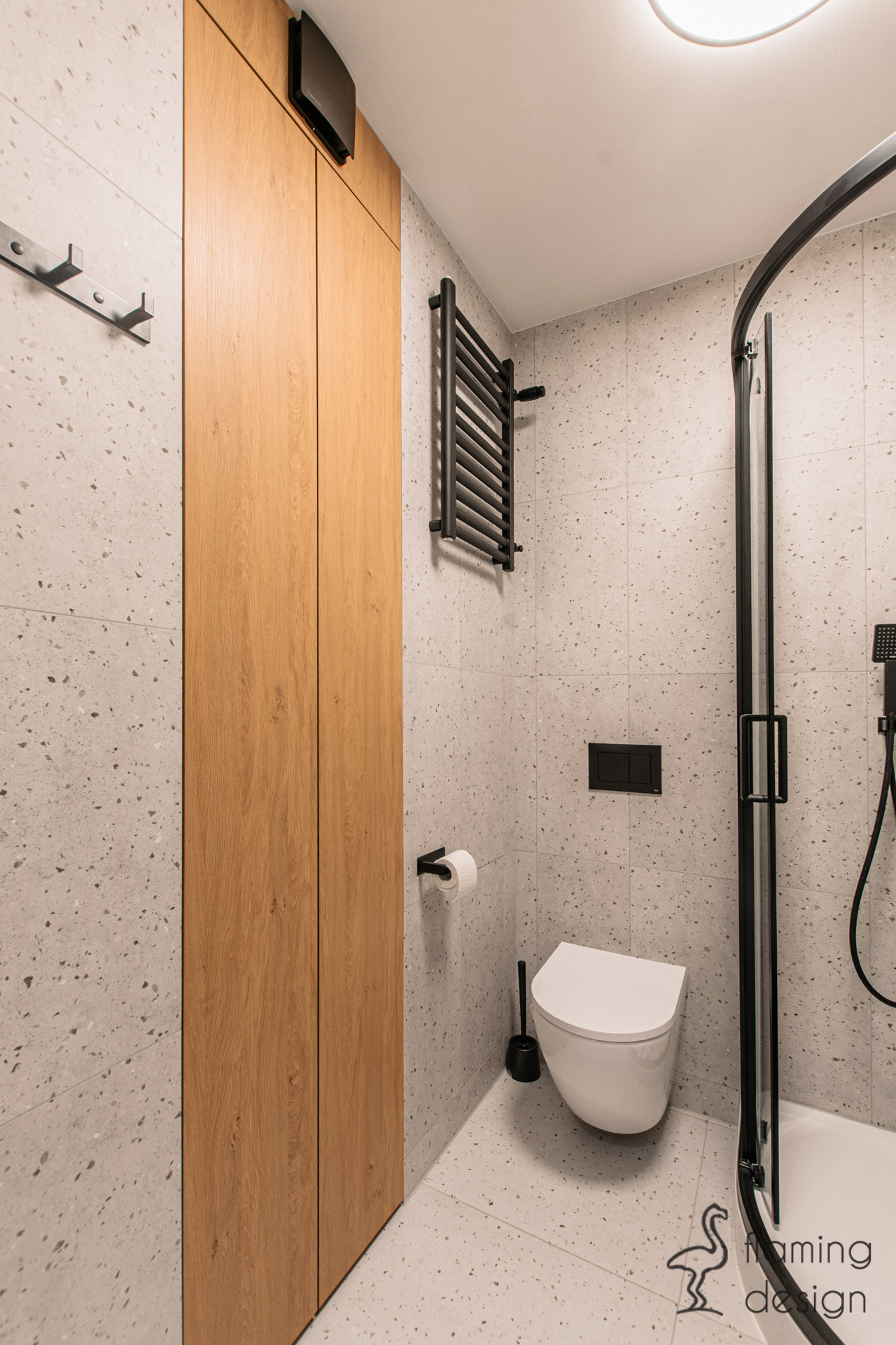Projekt mieszkania na wynajem. Mieszkanie wymagało generalnego remontu, zachowano taki sam układ funkcjonalny pomieszczeń. W przedpokoju zaprojektowano dużą szafę z siedziskiem i wieszakami. W salonie znalazło się miejsce na rozkładaną sofę, okrągły stół z krzesłami oraz szafkę rtv. Dominują tu kolory takie jak biel, beż, jasny brąz, szałwiowa i butelkowa zieleń oraz czerń. Kuchnia z nowymi szafkami i czarnym okrągłym stolikiem jest bardziej funkcjonalna niż poprzednio. W łazience zaprojektowano szaro-beżowe płytki o wzorze lastryko, czarne dodatki takie jak baterie, kabina prysznicowa oraz zabudowę wnęki w kolorze podłogi w pozostałych pomieszczeniach mieszczącą pralkę i półki. Sypialnia z częścią ściany w kolorze zielonym nawiązuje do kolorów w salonie.