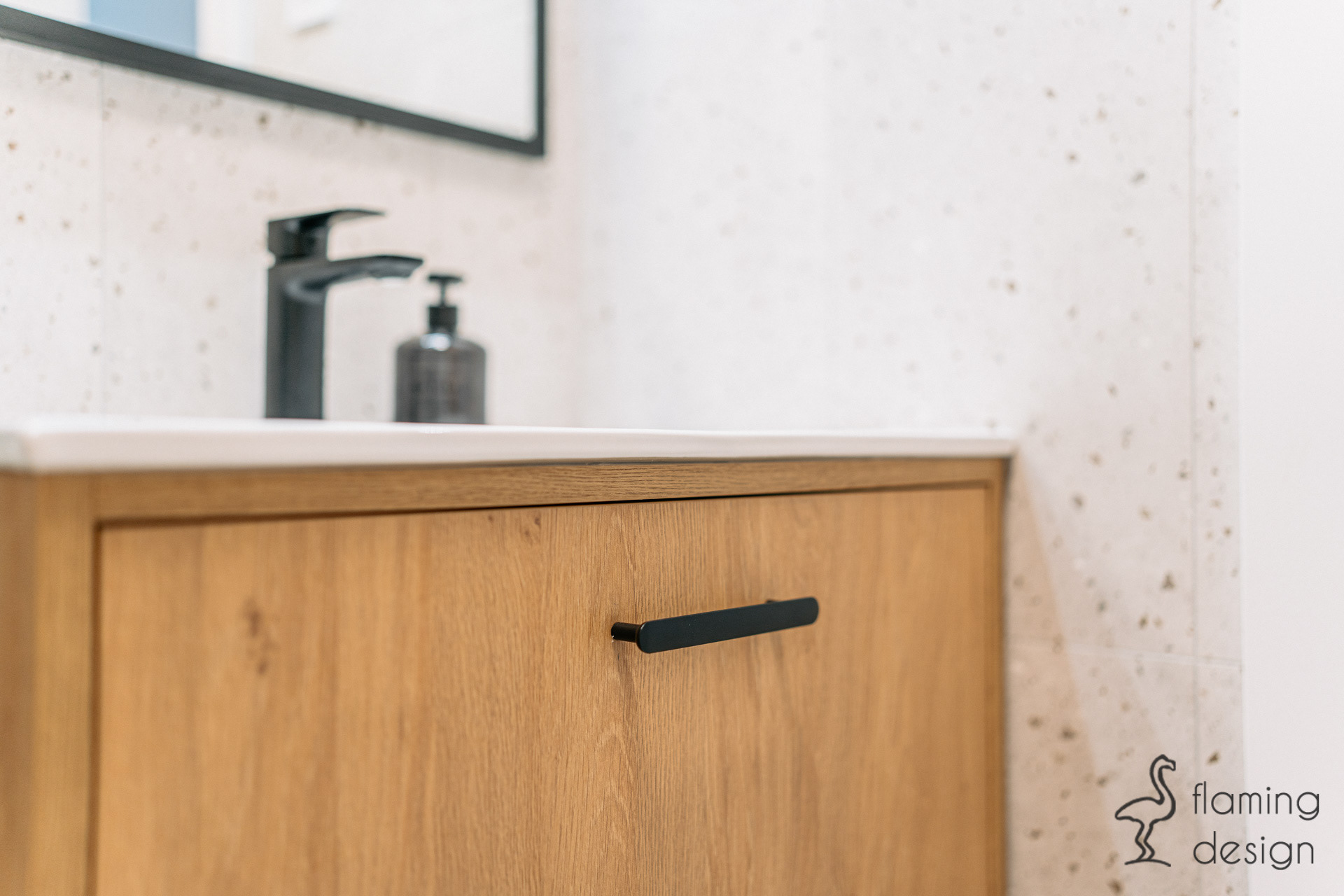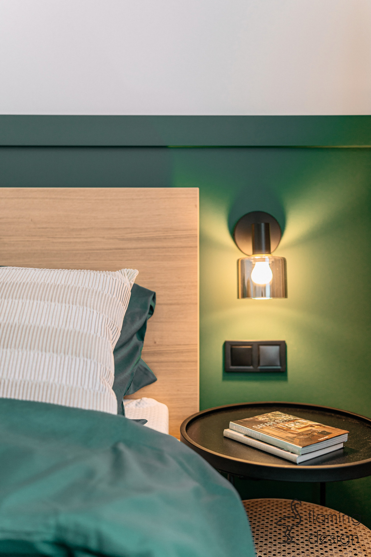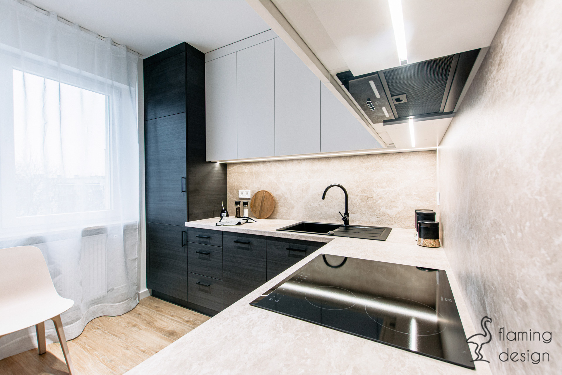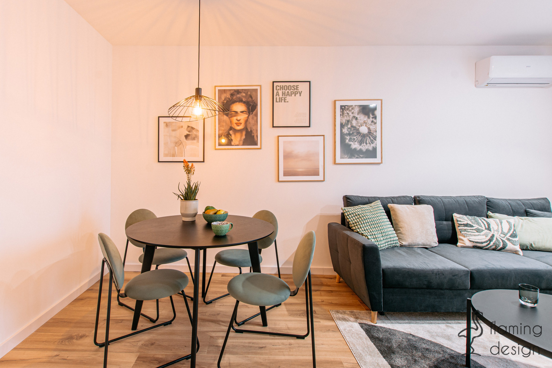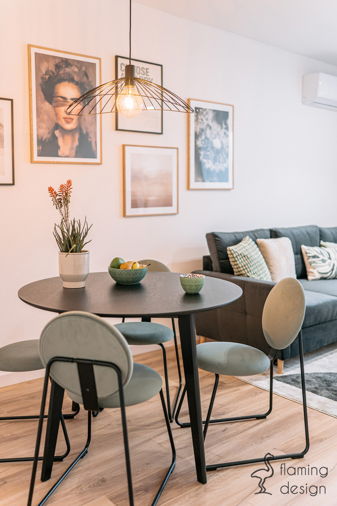 Projekt mieszkania na wynajem. Mieszkanie wymagało generalnego remontu, zachowano taki sam układ funkcjonalny pomieszczeń. W przedpokoju zaprojektowano dużą szafę z siedziskiem i wieszakami. W salonie znalazło się miejsce na rozkładaną sofę, okrągły stół z krzesłami oraz szafkę rtv. Dominują tu kolory takie jak biel, beż, jasny brąz, szałwiowa i butelkowa zieleń oraz czerń. Kuchnia z nowymi szafkami i czarnym okrągłym stolikiem jest bardziej funkcjonalna niż poprzednio. W łazience zaprojektowano szaro-beżowe płytki o wzorze lastryko, czarne dodatki takie jak baterie, kabina prysznicowa oraz zabudowę wnęki w kolorze podłogi w pozostałych pomieszczeniach mieszczącą pralkę i półki. Sypialnia z częścią ściany w kolorze zielonym nawiązuje do kolorów w salonie.