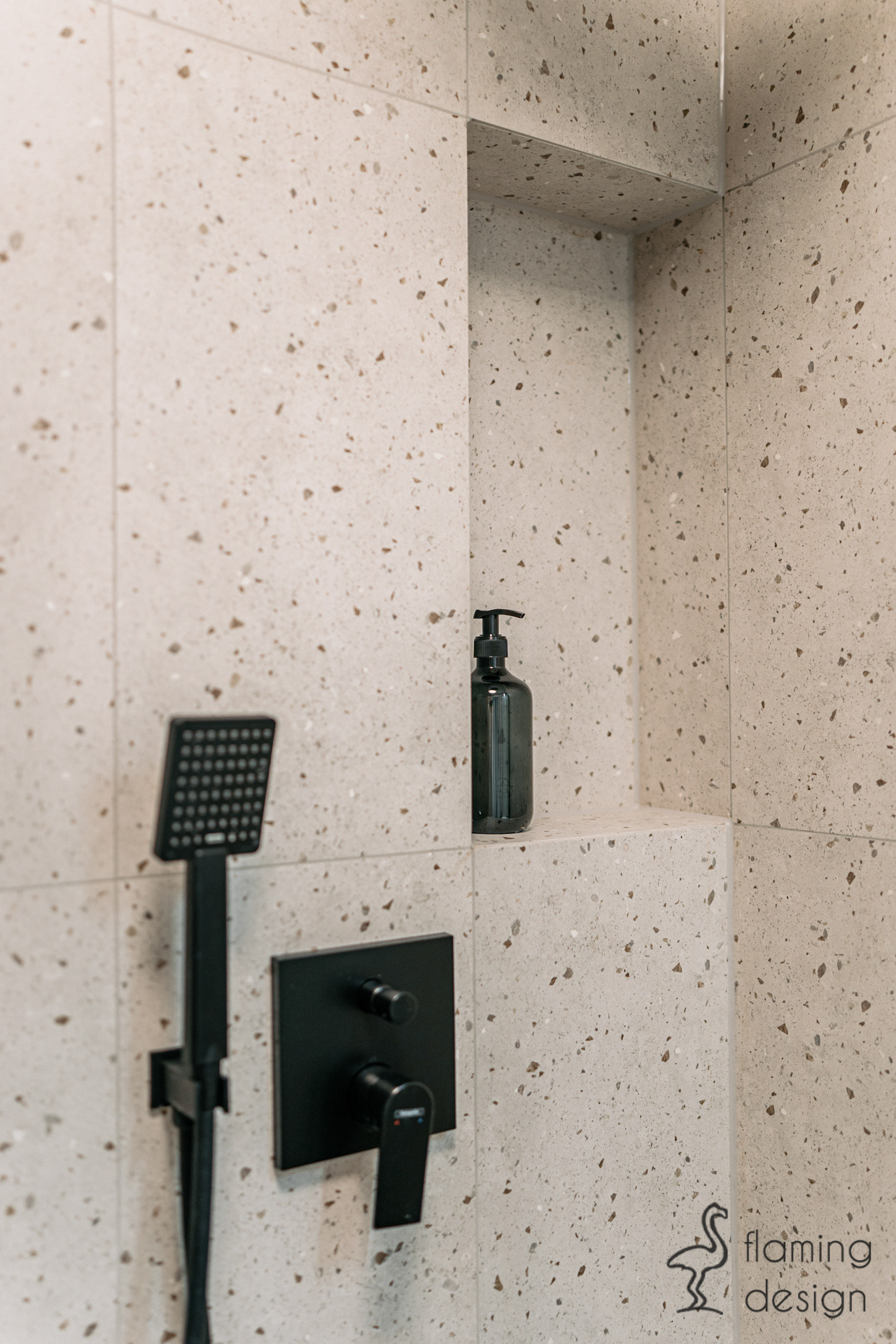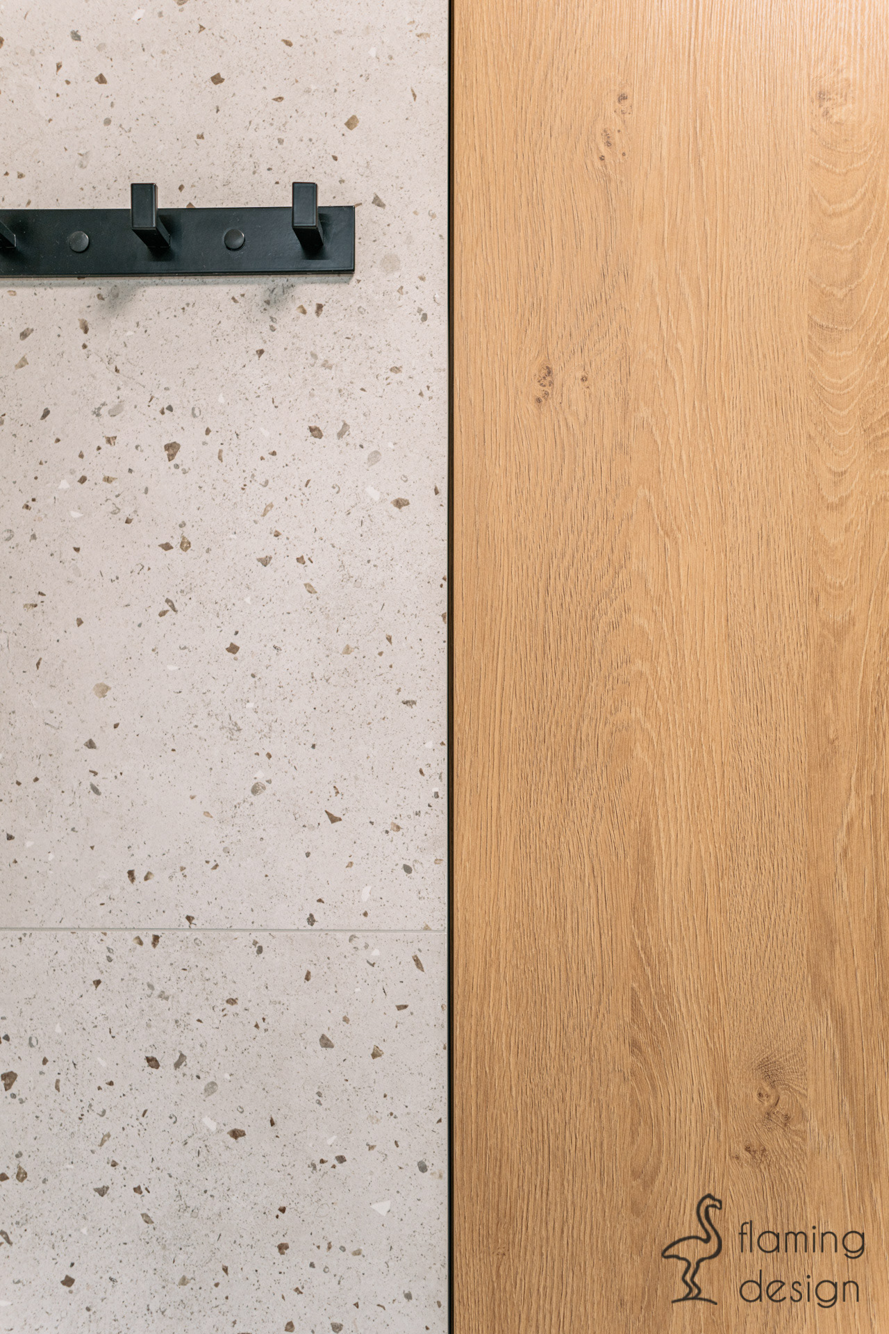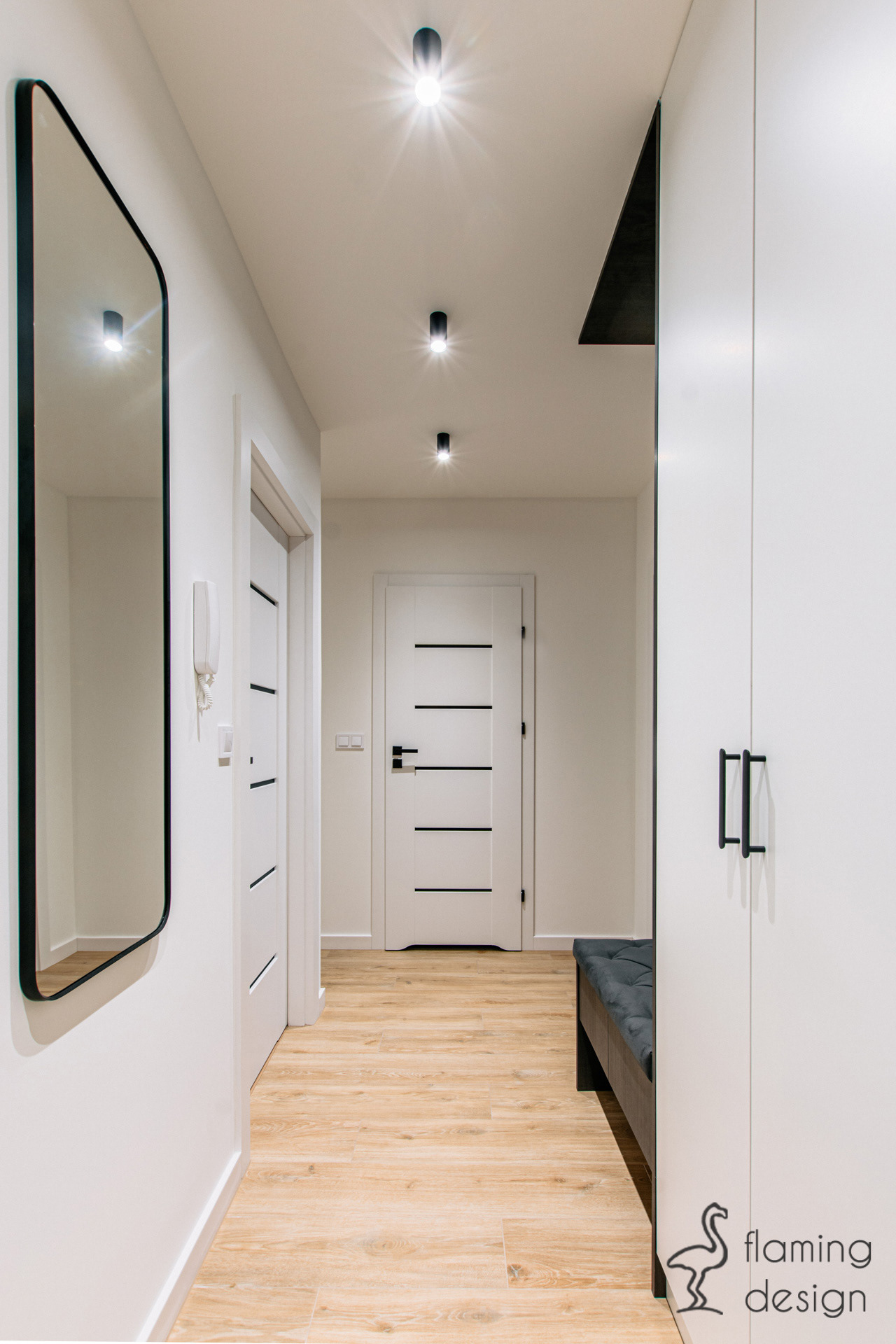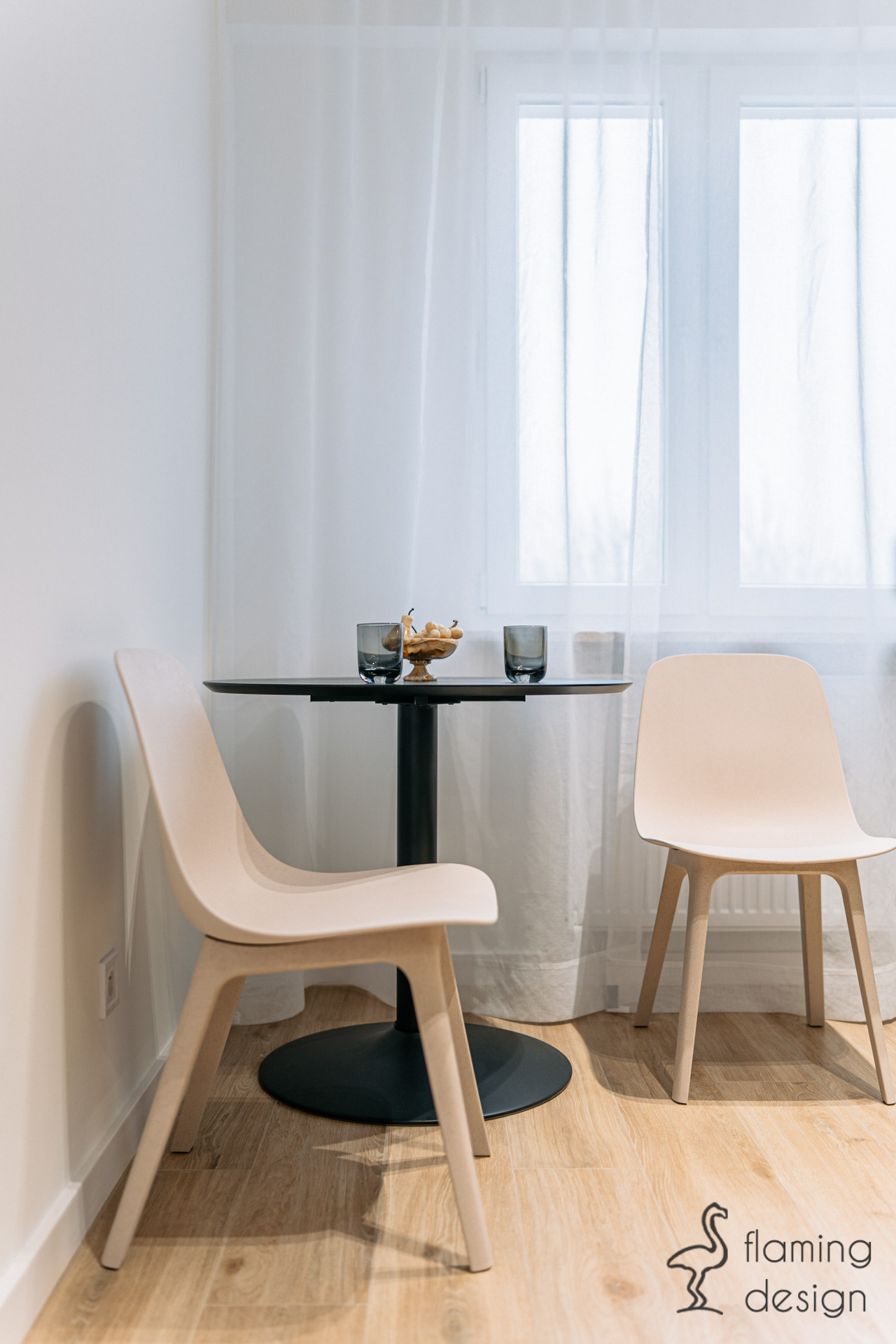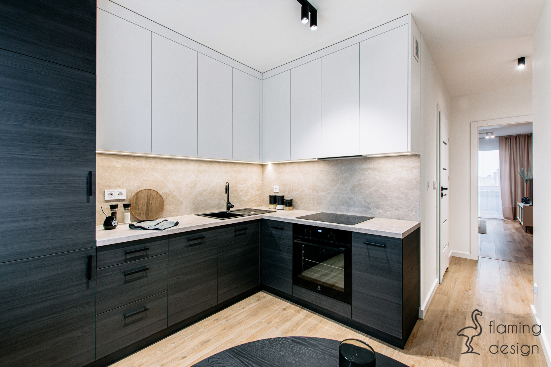 Projekt mieszkania na wynajem. Mieszkanie wymagało generalnego remontu, zachowano taki sam układ funkcjonalny pomieszczeń. W przedpokoju zaprojektowano dużą szafę z siedziskiem i wieszakami. W salonie znalazło się miejsce na rozkładaną sofę, okrągły stół z krzesłami oraz szafkę rtv. Dominują tu kolory takie jak biel, beż, jasny brąz, szałwiowa i butelkowa zieleń oraz czerń. Kuchnia z nowymi szafkami i czarnym okrągłym stolikiem jest bardziej funkcjonalna niż poprzednio. W łazience zaprojektowano szaro-beżowe płytki o wzorze lastryko, czarne dodatki takie jak baterie, kabina prysznicowa oraz zabudowę wnęki w kolorze podłogi w pozostałych pomieszczeniach mieszczącą pralkę i półki. Sypialnia z częścią ściany w kolorze zielonym nawiązuje do kolorów w salonie.