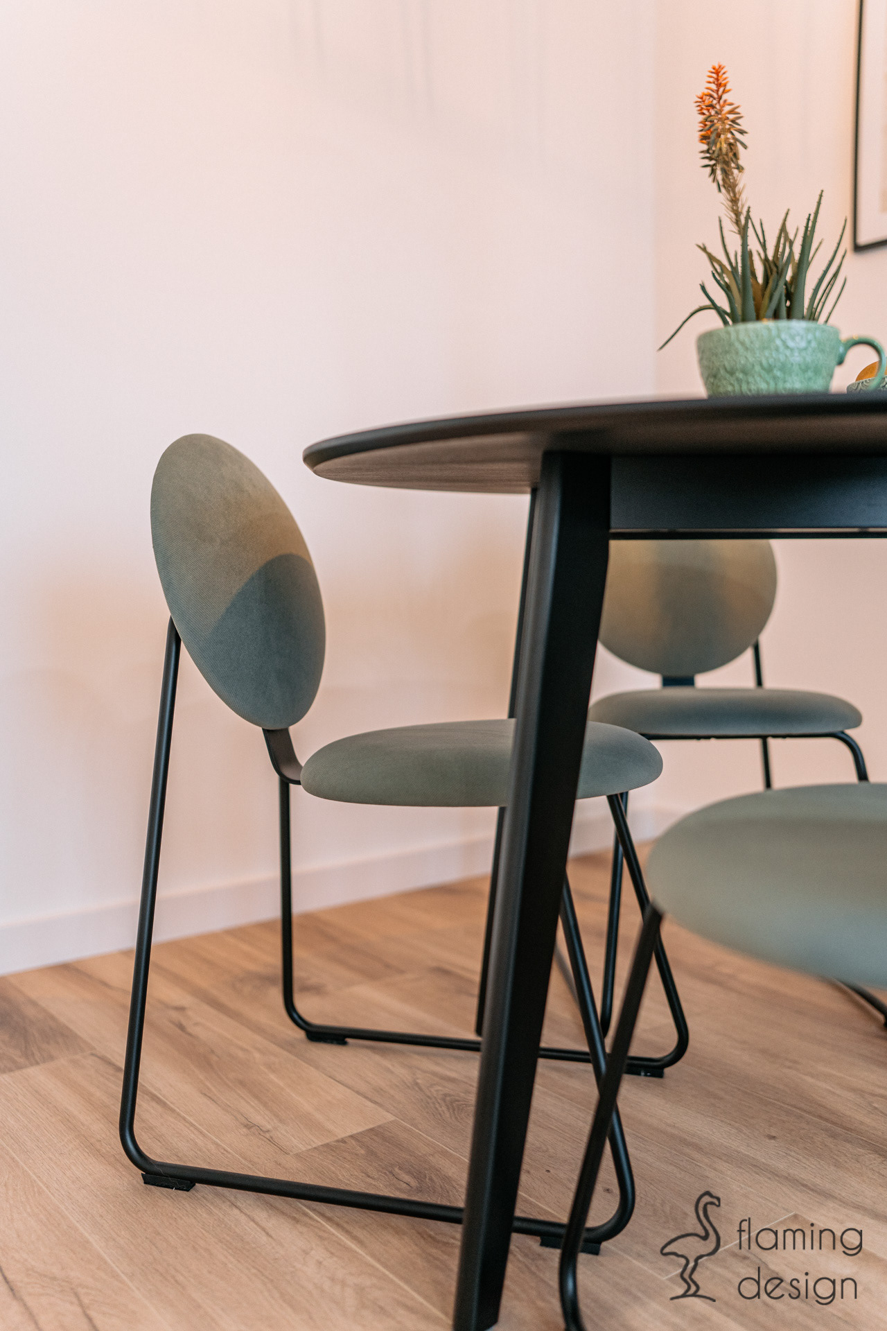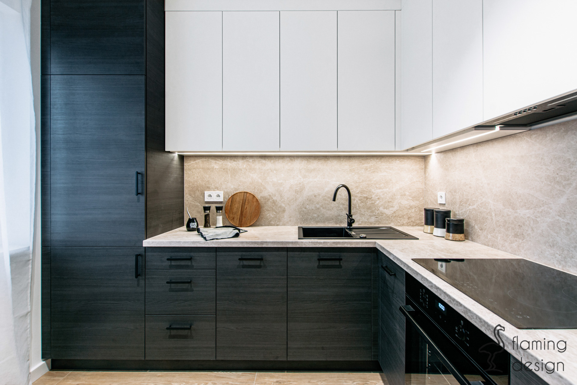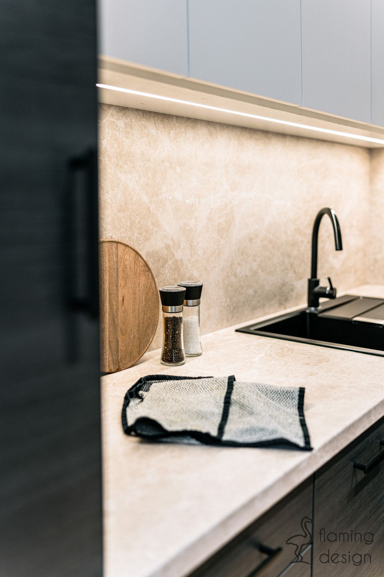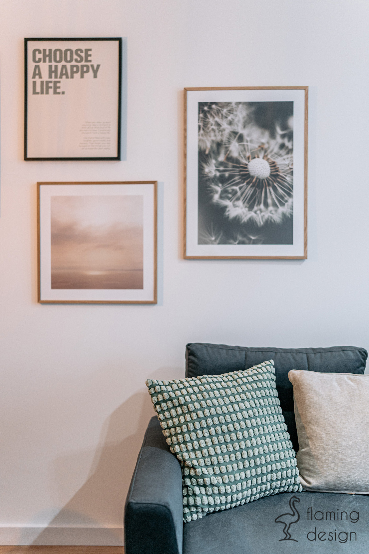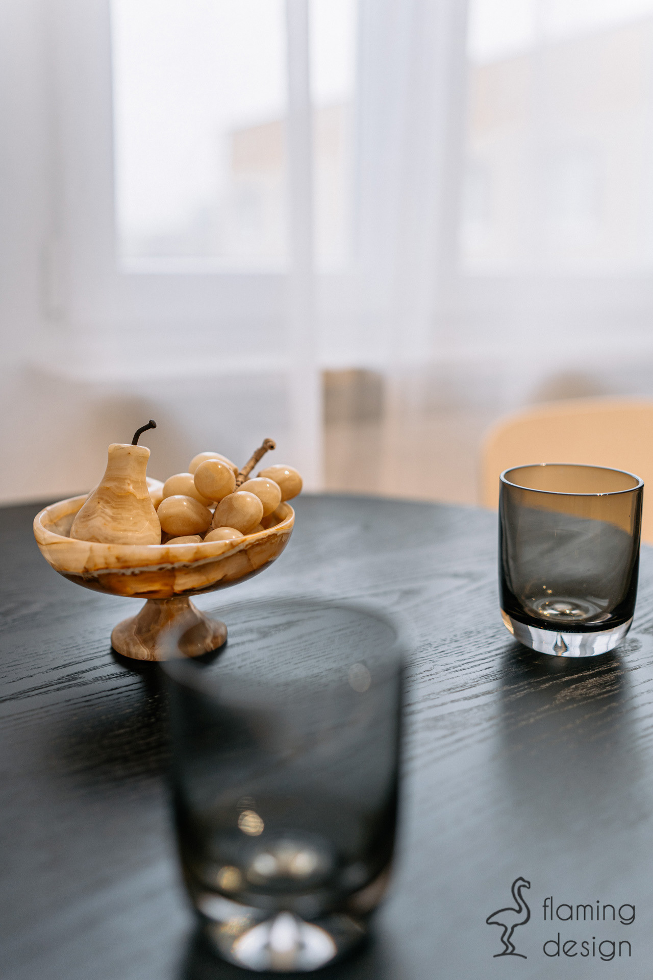 Projekt mieszkania na wynajem. Mieszkanie wymagało generalnego remontu, zachowano taki sam układ funkcjonalny pomieszczeń. W przedpokoju zaprojektowano dużą szafę z siedziskiem i wieszakami. W salonie znalazło się miejsce na rozkładaną sofę, okrągły stół z krzesłami oraz szafkę rtv. Dominują tu kolory takie jak biel, beż, jasny brąz, szałwiowa i butelkowa zieleń oraz czerń. Kuchnia z nowymi szafkami i czarnym okrągłym stolikiem jest bardziej funkcjonalna niż poprzednio. W łazience zaprojektowano szaro-beżowe płytki o wzorze lastryko, czarne dodatki takie jak baterie, kabina prysznicowa oraz zabudowę wnęki w kolorze podłogi w pozostałych pomieszczeniach mieszczącą pralkę i półki. Sypialnia z częścią ściany w kolorze zielonym nawiązuje do kolorów w salonie.