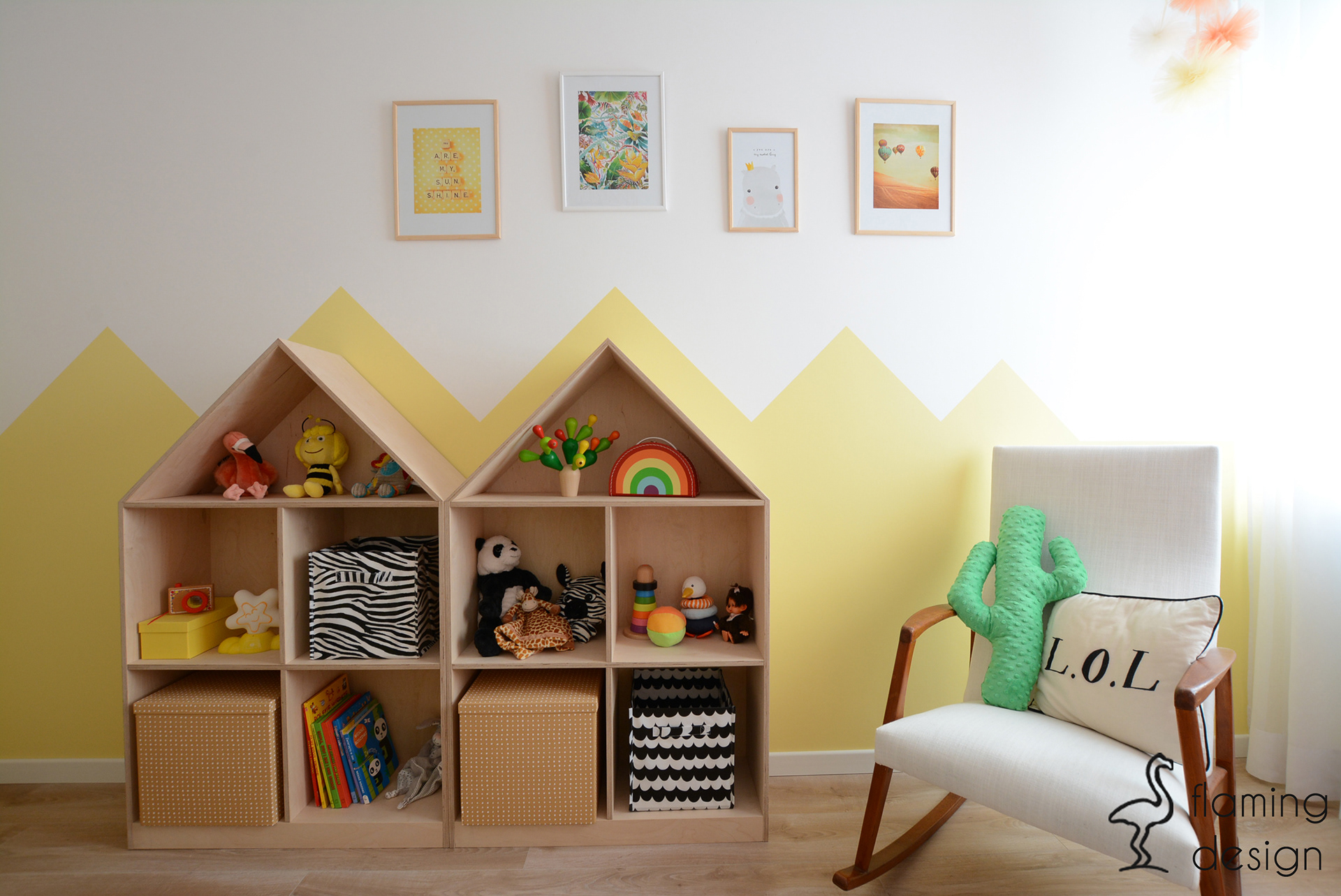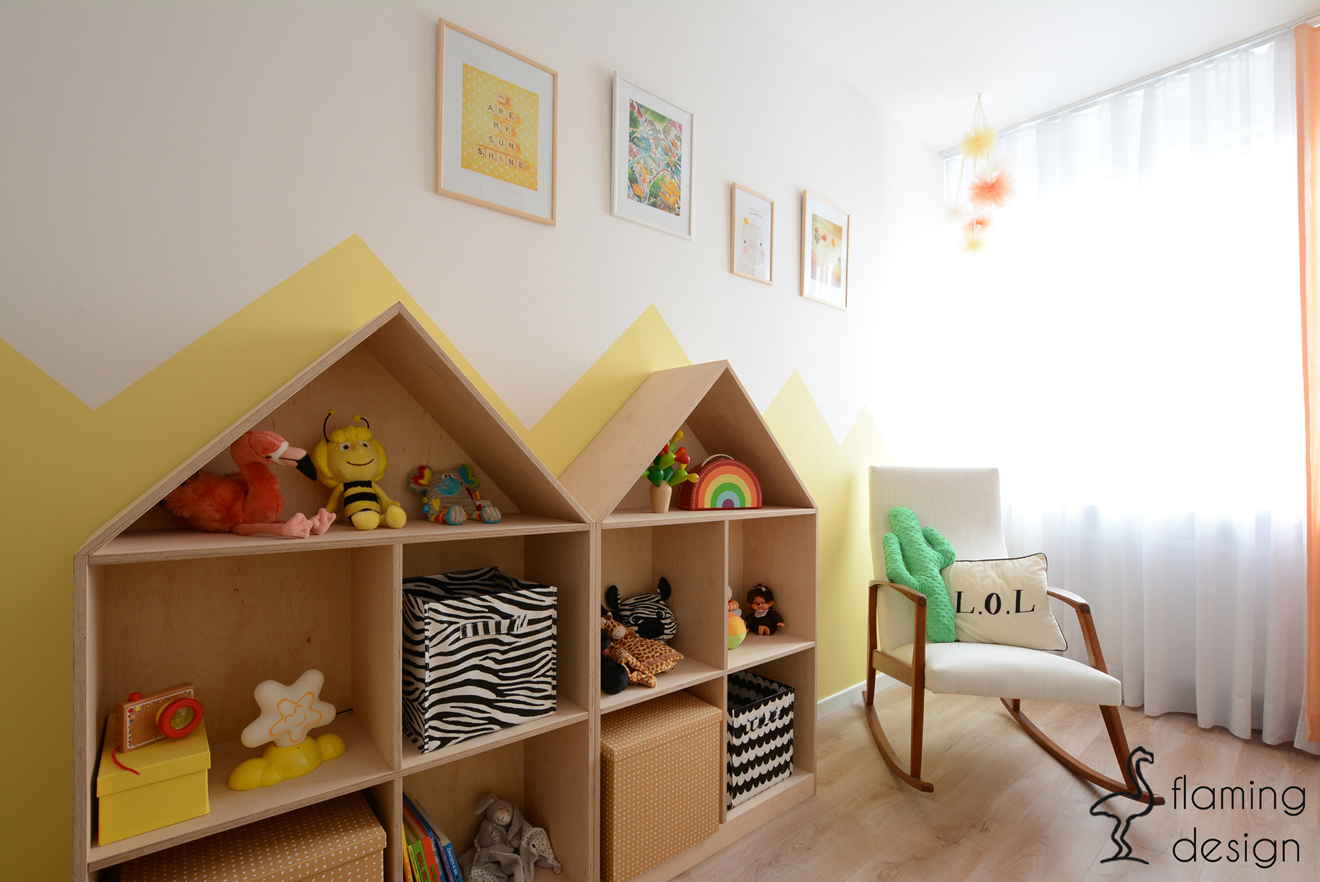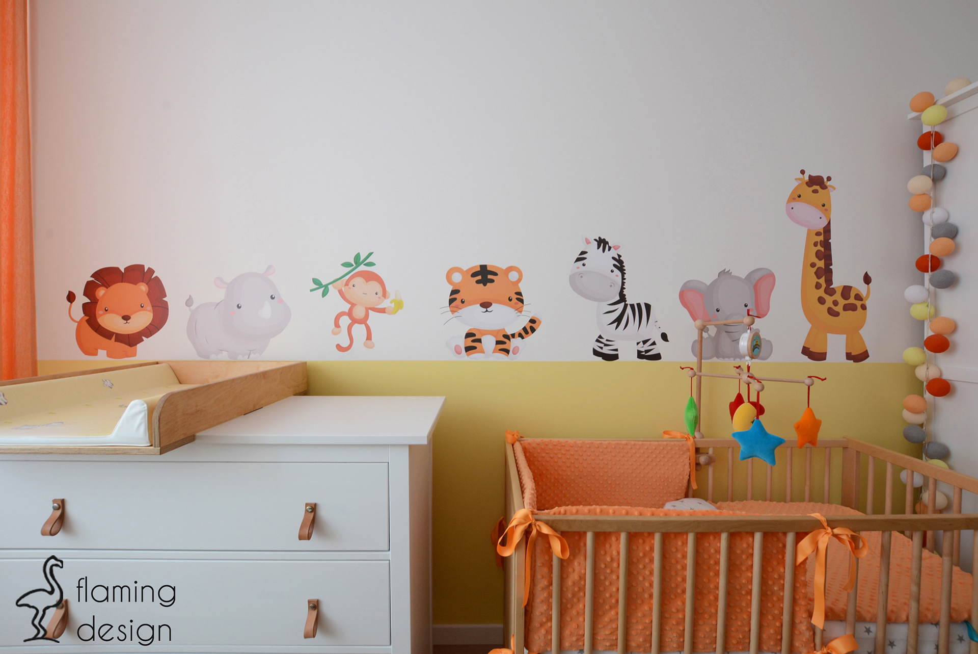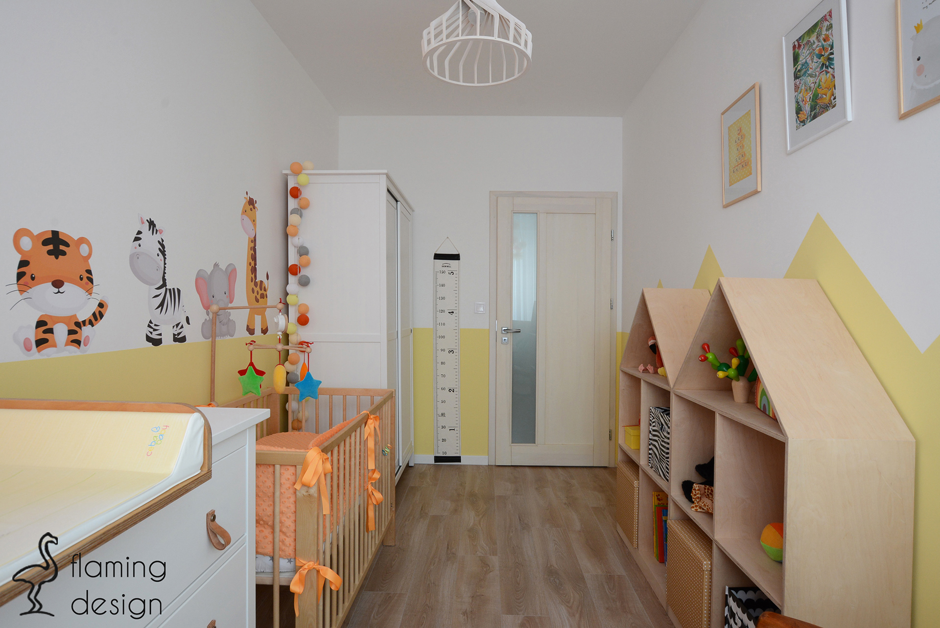 Projekt pokoju dla małej dziewczynki w kolorach innych niż różowy. We wnętrzu dominuje biały, jasny żółty, brzoskwiniowy oraz kolor naturalnego drewna. Na ścianie nad łóżeczkiem zaprojektowano naklejki ze zwierzętami, regały ze sklejki w kształcie domków wykonano na zamówienie. Do tego pasują białe, drewniane meble oraz kolorowe dodatki i zabawki.