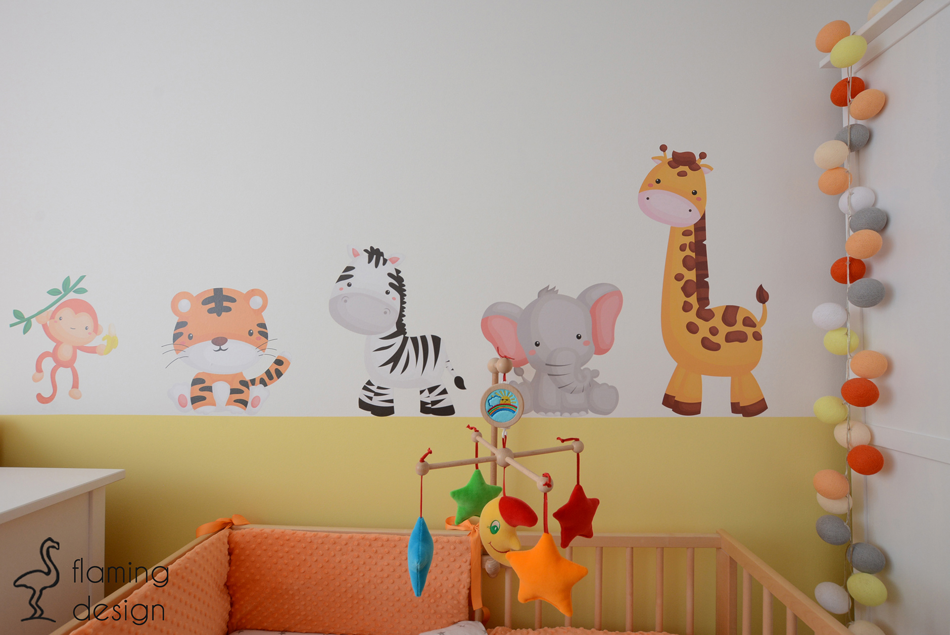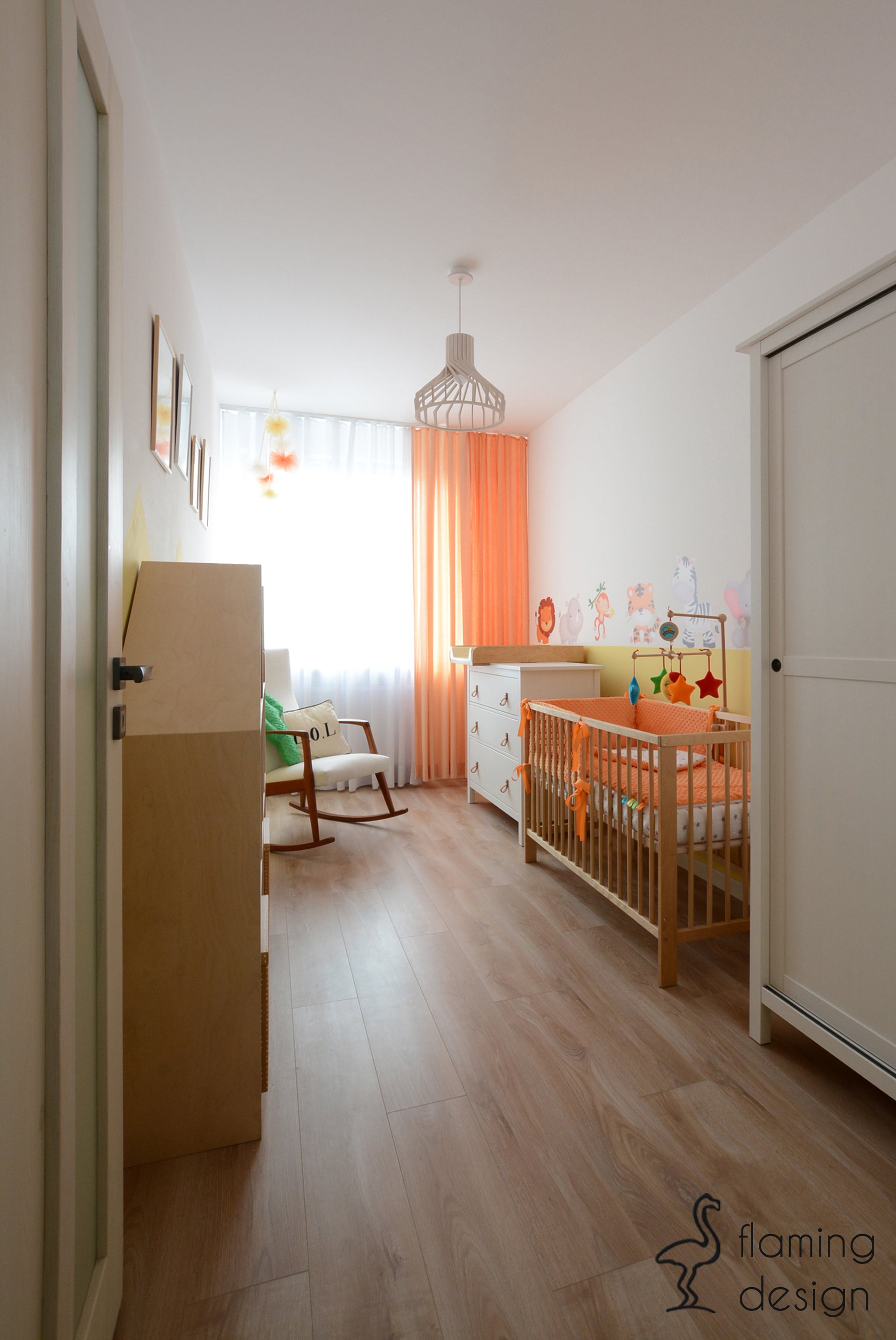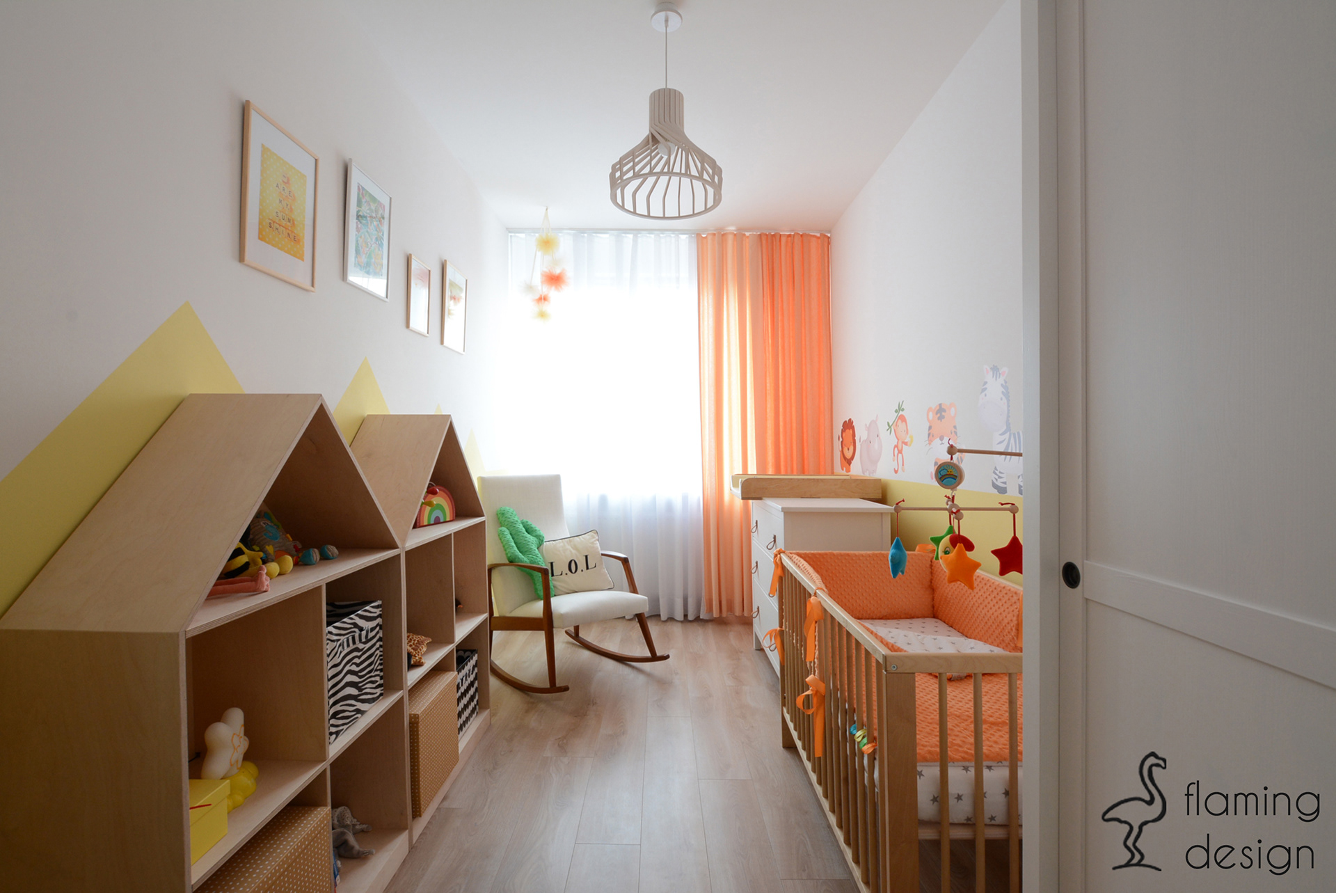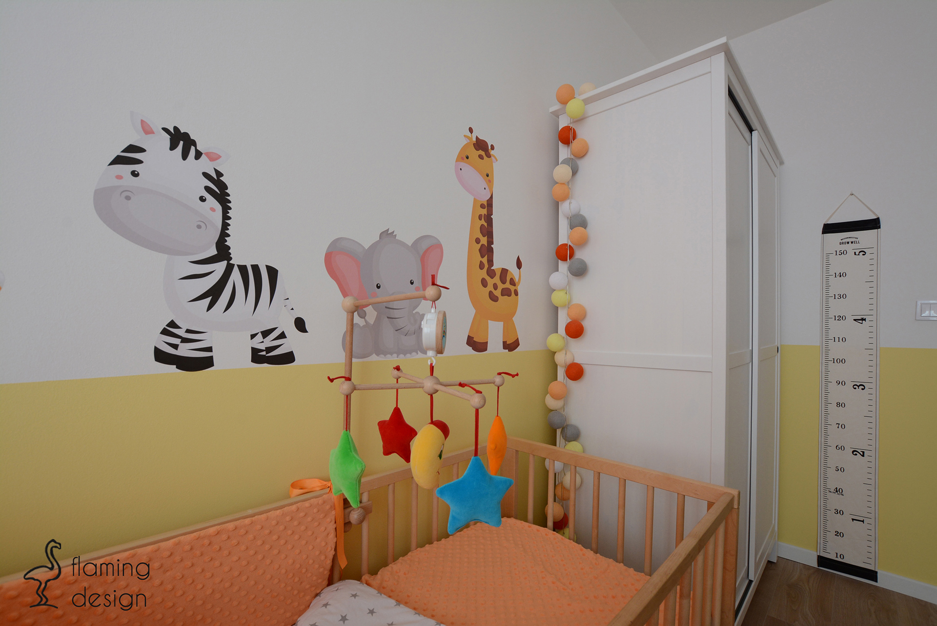 Projekt pokoju dla małej dziewczynki w kolorach innych niż różowy. We wnętrzu dominuje biały, jasny żółty, brzoskwiniowy oraz kolor naturalnego drewna. Na ścianie nad łóżeczkiem zaprojektowano naklejki ze zwierzętami, regały ze sklejki w kształcie domków wykonano na zamówienie. Do tego pasują białe, drewniane meble oraz kolorowe dodatki i zabawki.