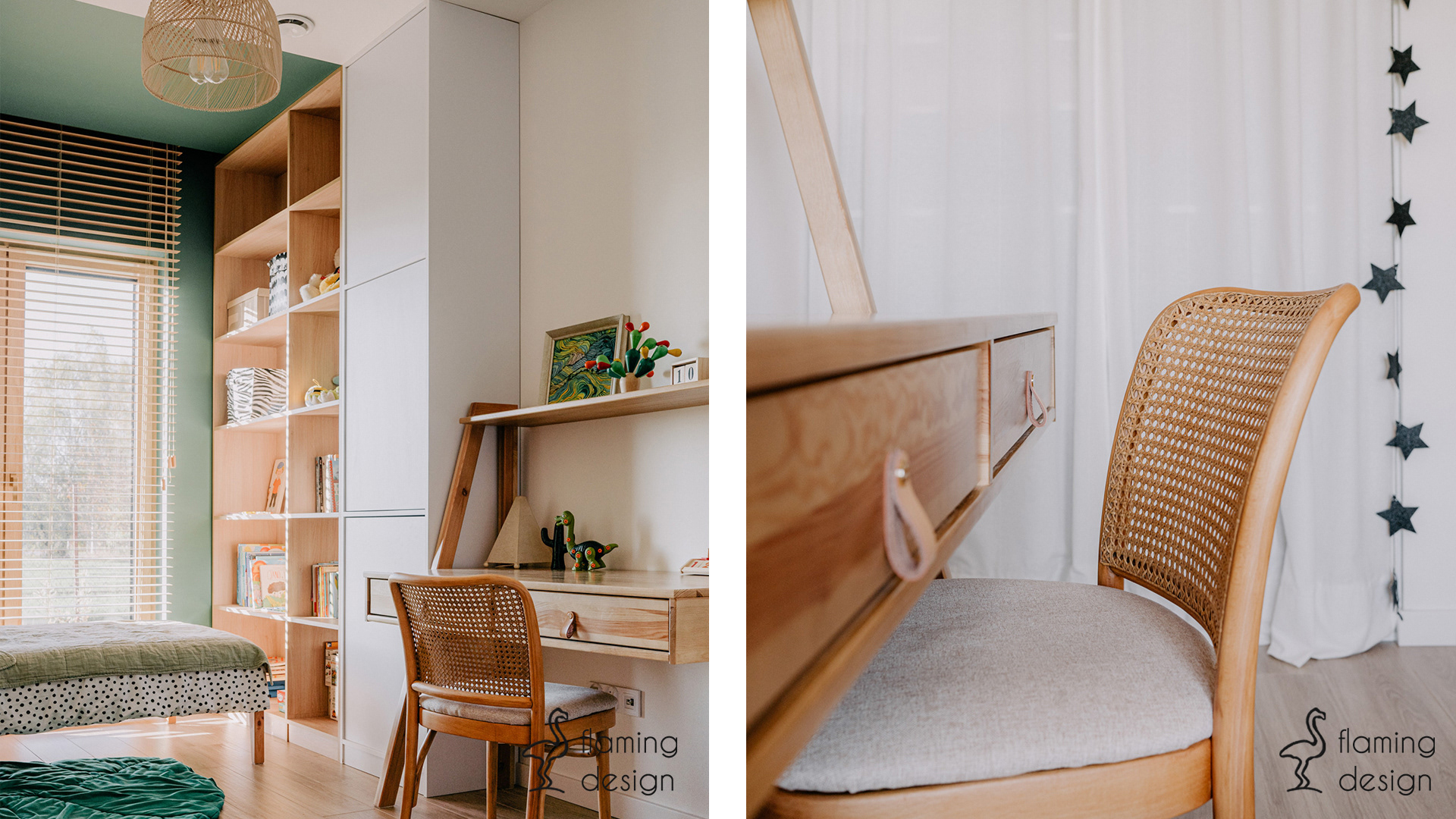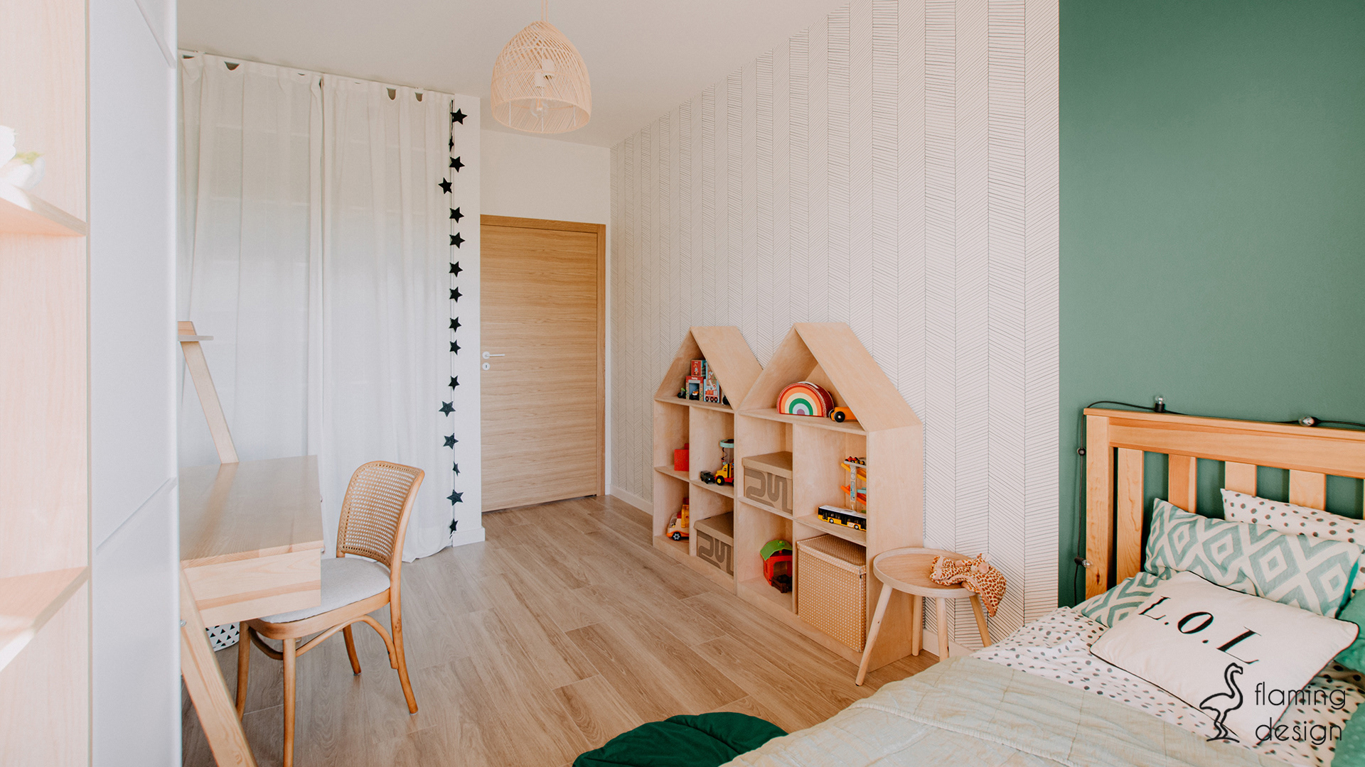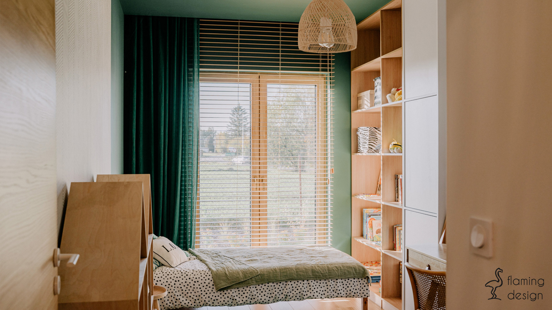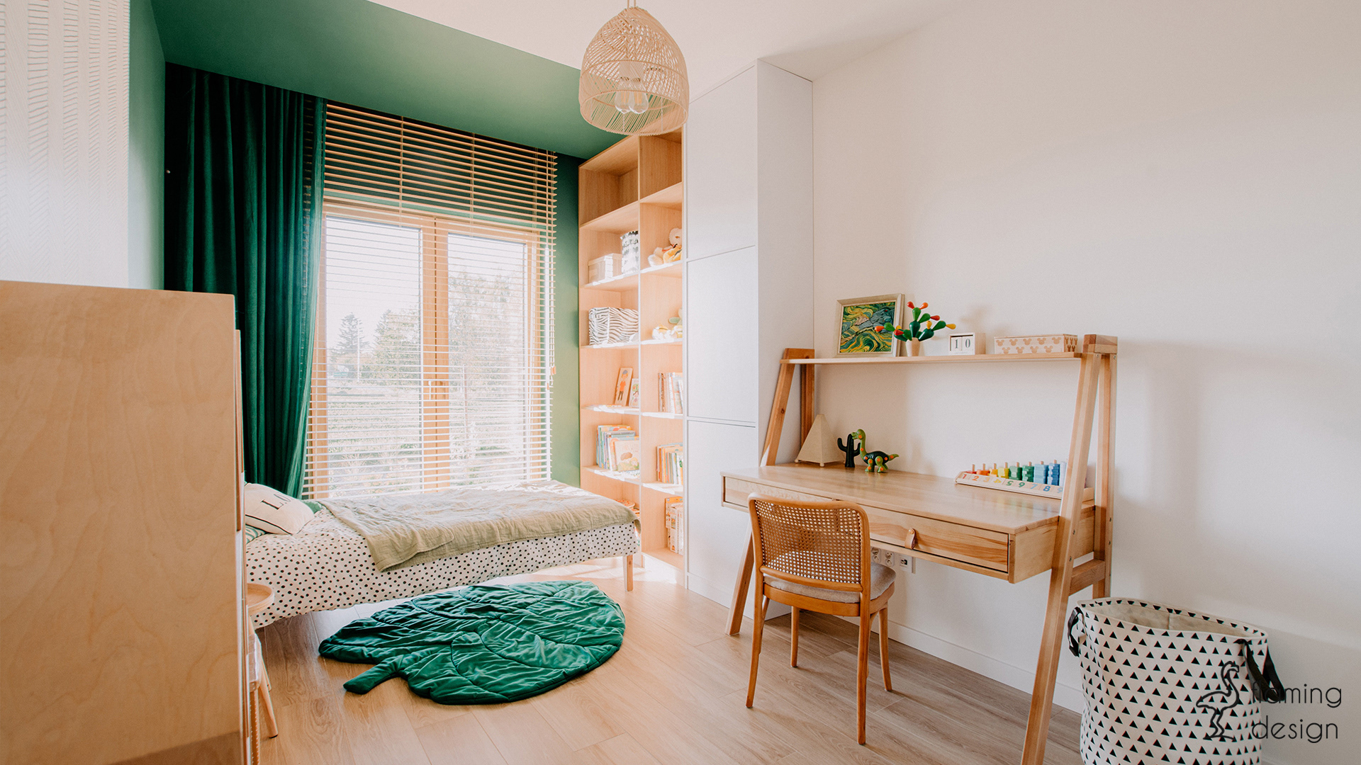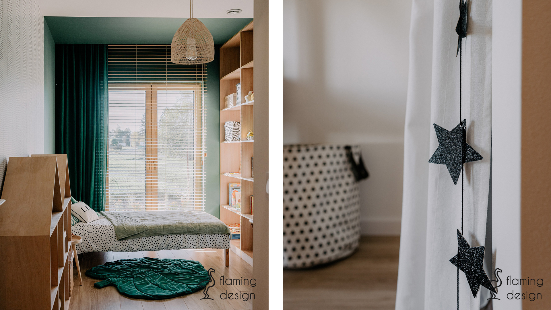 Realizacja pokoju dla chłopca w domu jednorodzinnym. W pokoju o powierzchni 13 m2, za pomocą części ściany w kolorze szmaragdowym wydzielono strefę odpoczynku, w której znajduje się łóżko oraz regał na całą wysokość. Obok regału i białej szafki zaprojektowano drewniane biurko z półką. Na przeciwko biurka są regały domki wykonane na zamówienie, na tej samej ścianie jest tapeta w czarno-białą jodełkę. Szafa w zabudowie nie ma standardowych frontów, tutaj powieszono białą zasłonę oraz girlandę z czarnymi gwiadkami dla dekoracji. Na podłodze ułożone są płytki gresowe imitujące drewno.