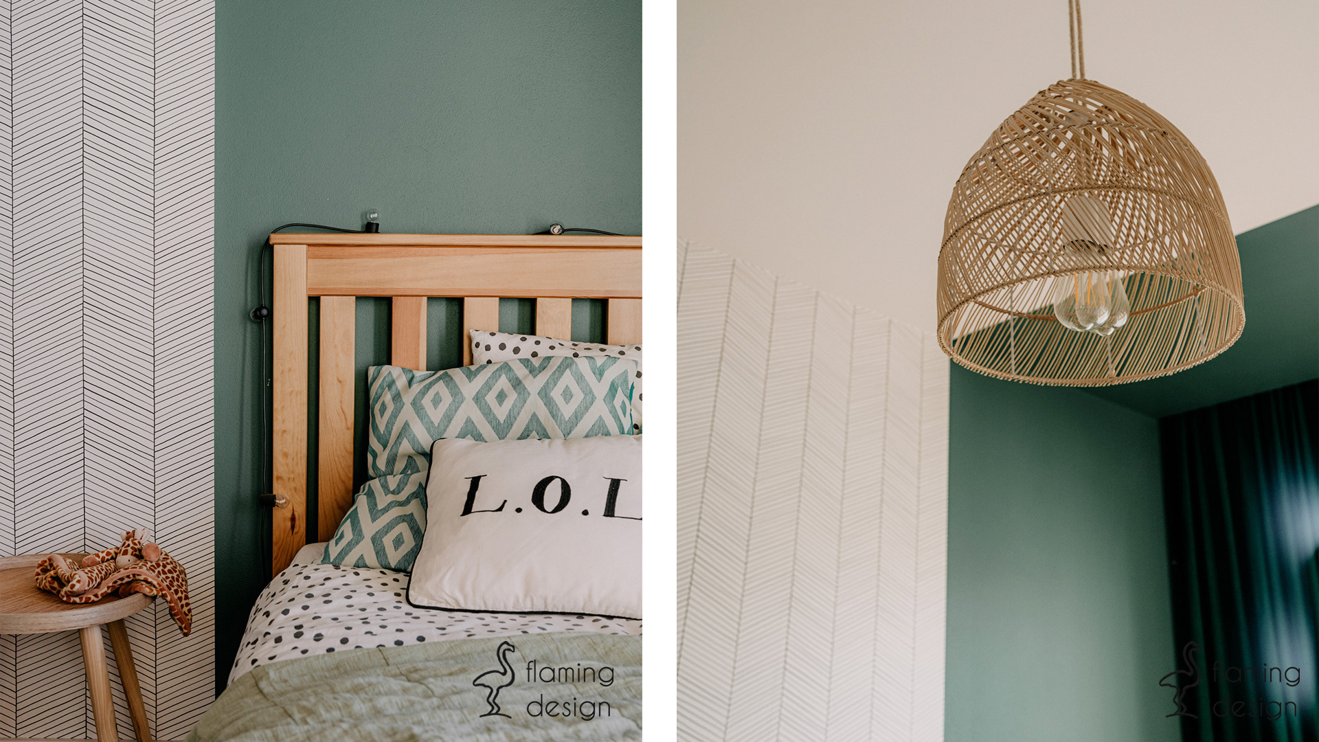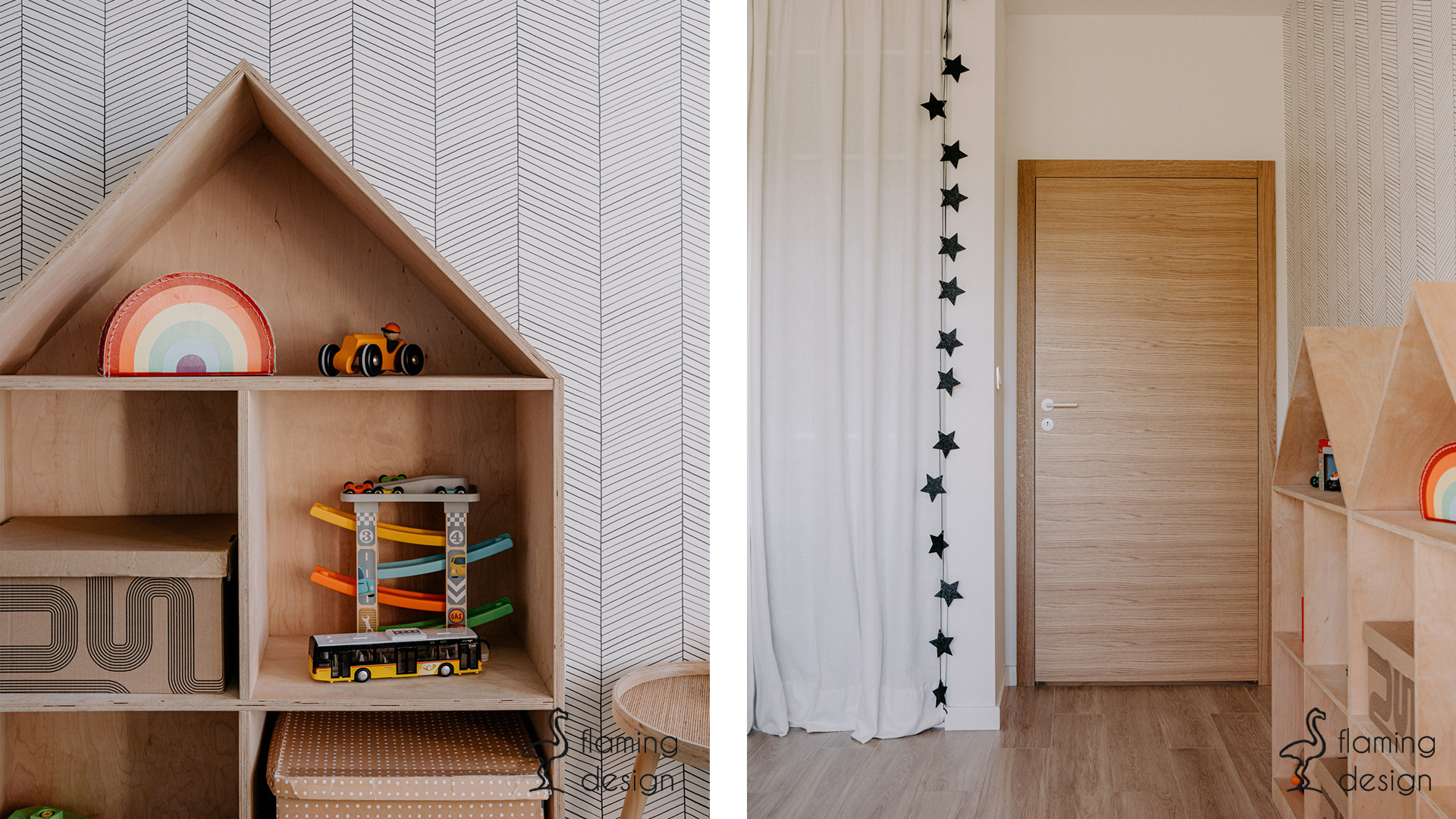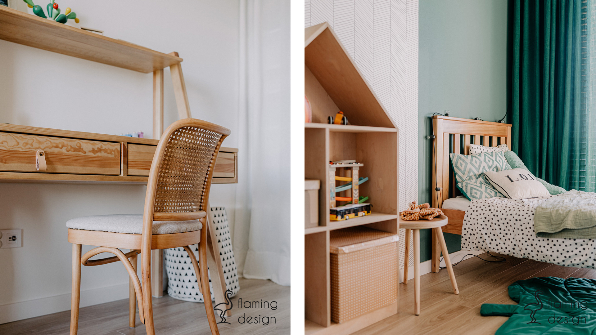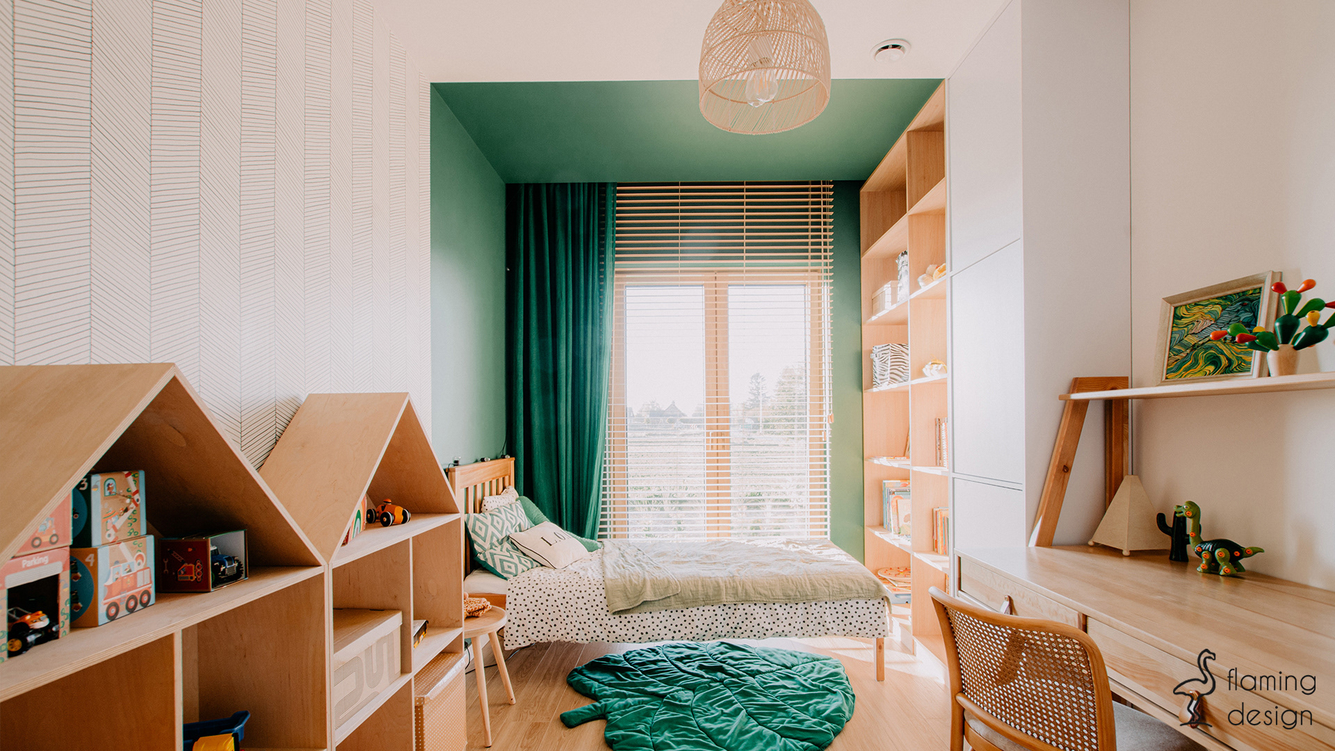Realizacja pokoju dla chłopca w domu jednorodzinnym. W pokoju o powierzchni 13 m2, za pomocą części ściany w kolorze szmaragdowym wydzielono strefę odpoczynku, w której znajduje się łóżko oraz regał na całą wysokość. Obok regału i białej szafki zaprojektowano drewniane biurko z półką. Na przeciwko biurka są regały domki wykonane na zamówienie, na tej samej ścianie jest tapeta w czarno-białą jodełkę. Szafa w zabudowie nie ma standardowych frontów, tutaj powieszono białą zasłonę oraz girlandę z czarnymi gwiadkami dla dekoracji. Na podłodze ułożone są płytki gresowe imitujące drewno.