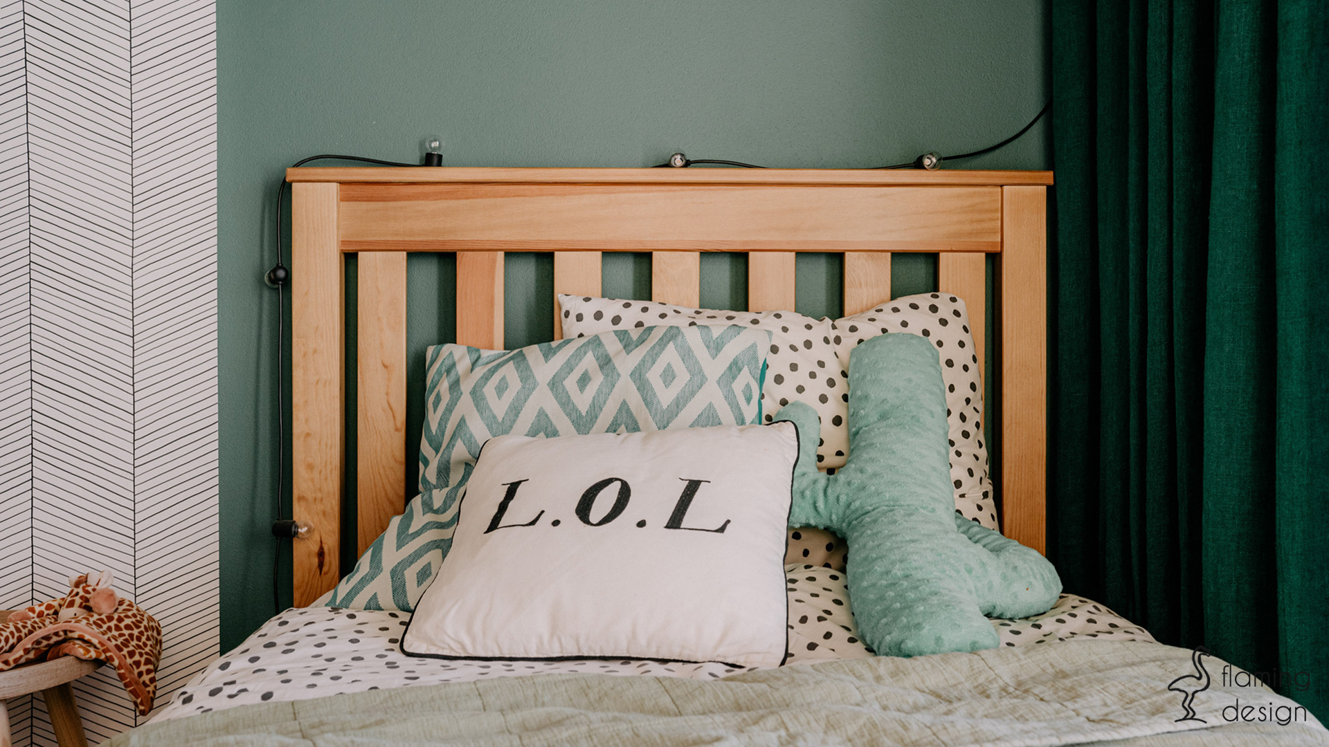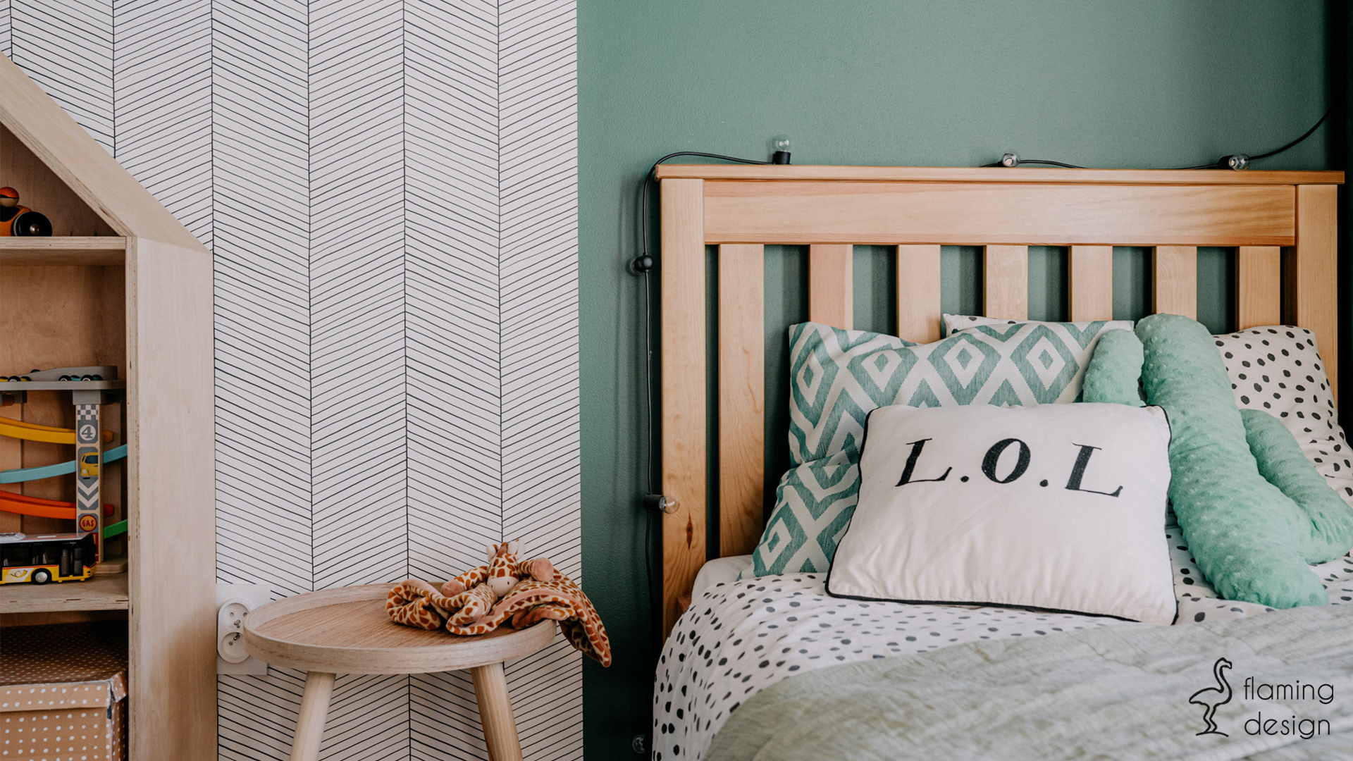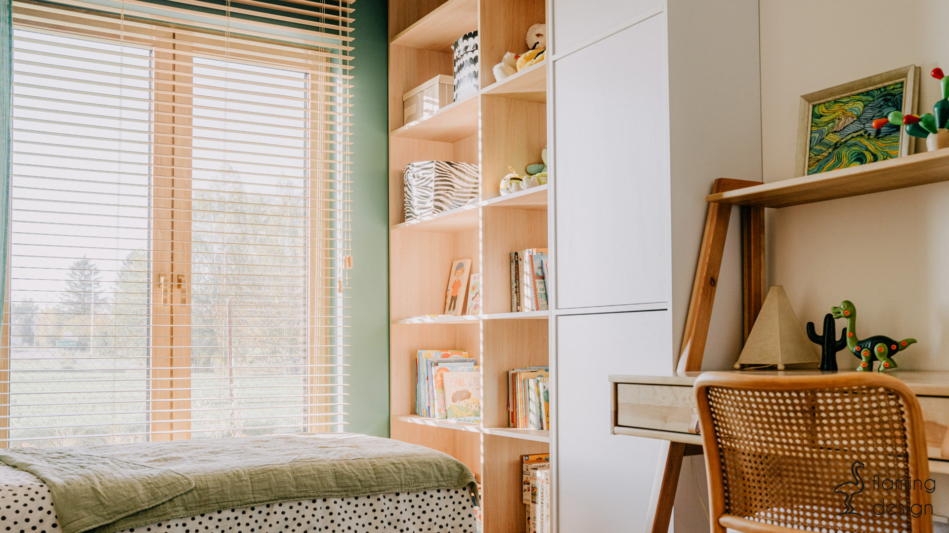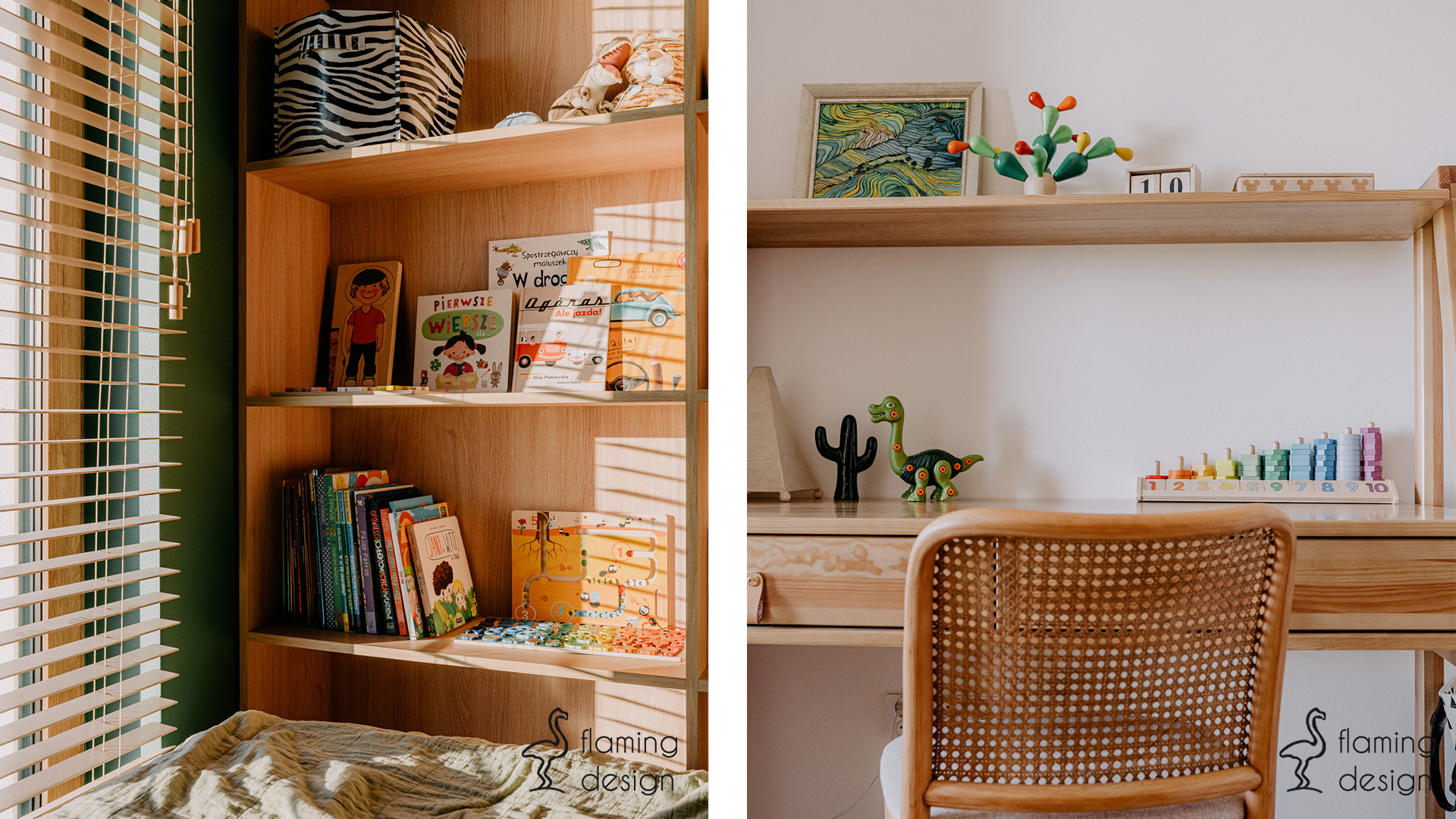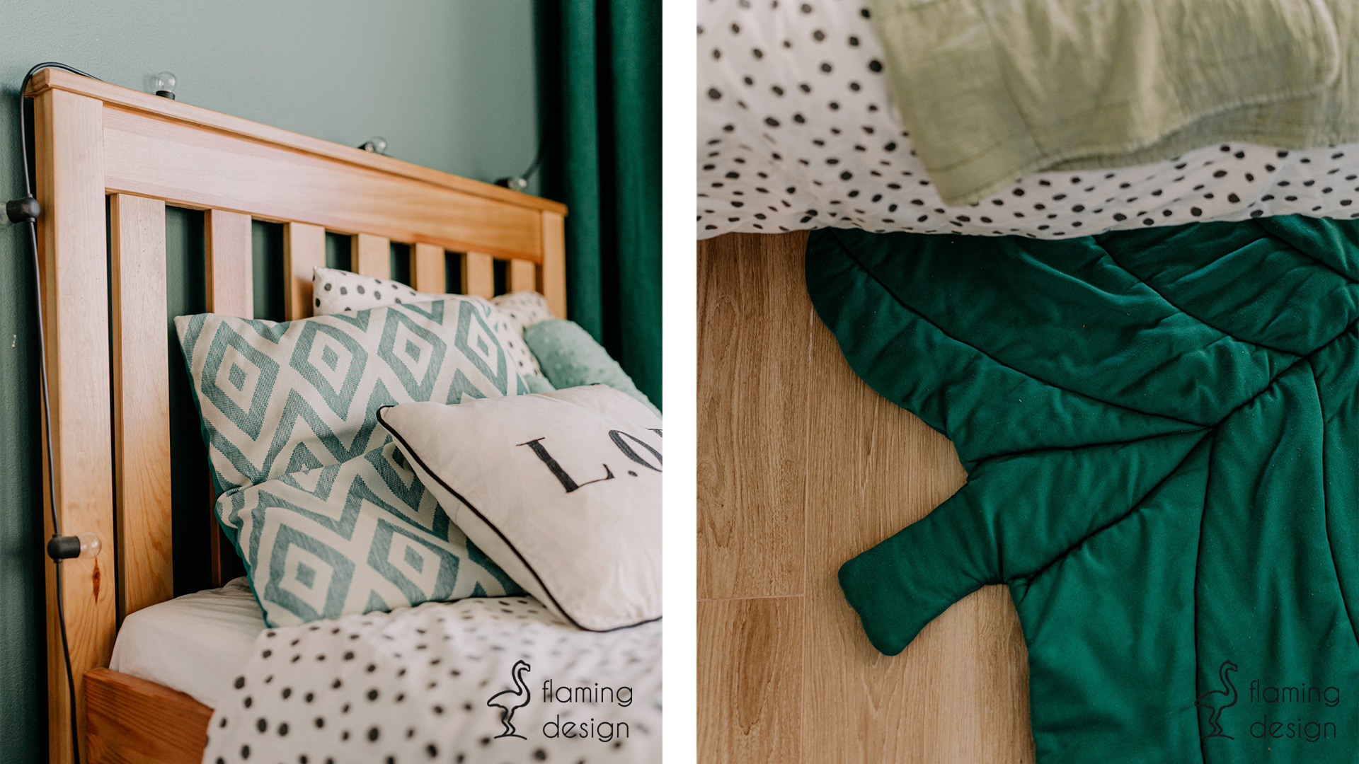 Realizacja pokoju dla chłopca w domu jednorodzinnym. W pokoju o powierzchni 13 m2, za pomocą części ściany w kolorze szmaragdowym wydzielono strefę odpoczynku, w której znajduje się łóżko oraz regał na całą wysokość. Obok regału i białej szafki zaprojektowano drewniane biurko z półką. Na przeciwko biurka są regały domki wykonane na zamówienie, na tej samej ścianie jest tapeta w czarno-białą jodełkę. Szafa w zabudowie nie ma standardowych frontów, tutaj powieszono białą zasłonę oraz girlandę z czarnymi gwiadkami dla dekoracji. Na podłodze ułożone są płytki gresowe imitujące drewno.