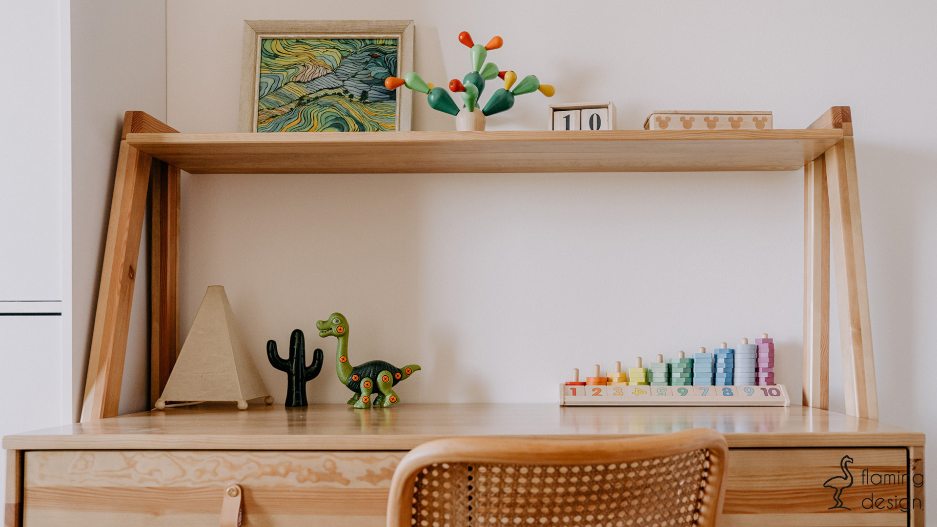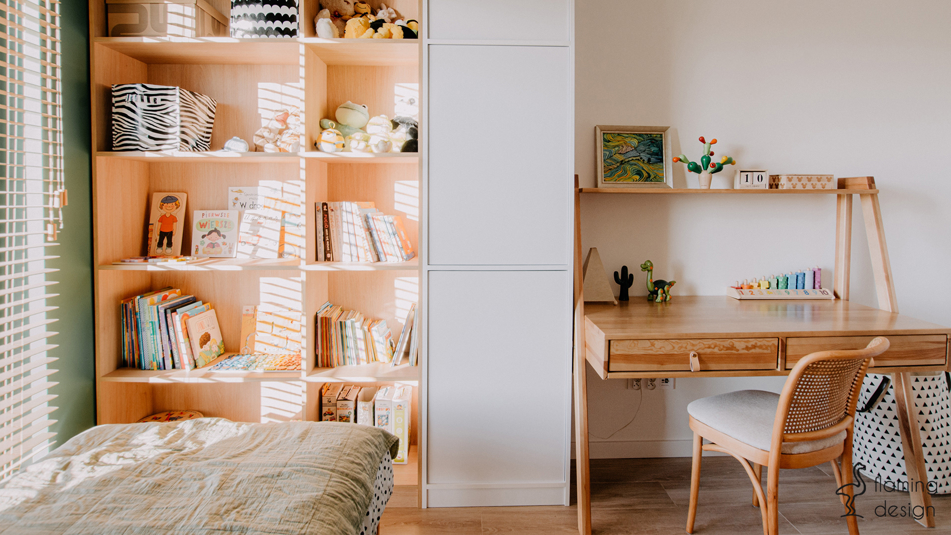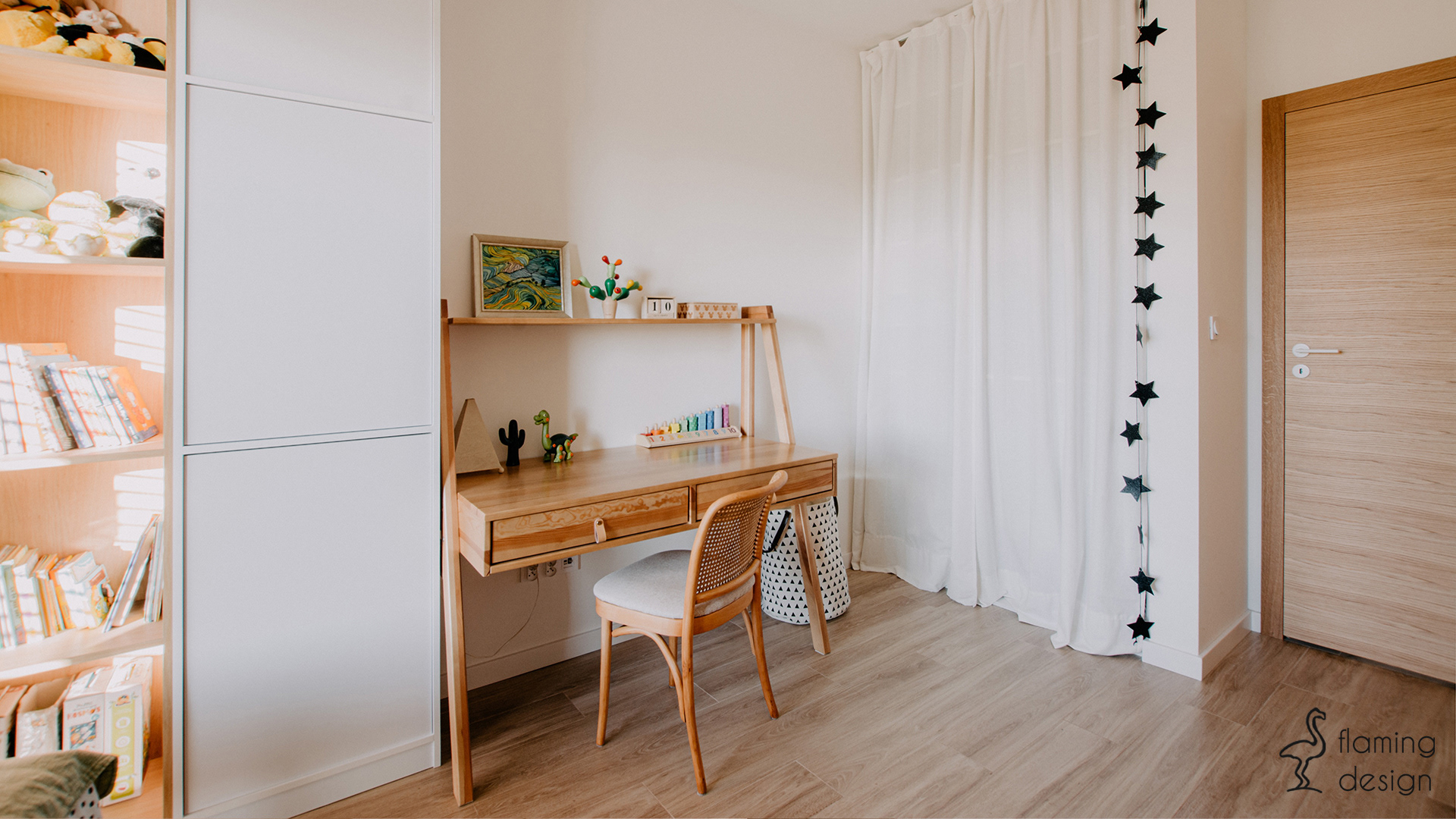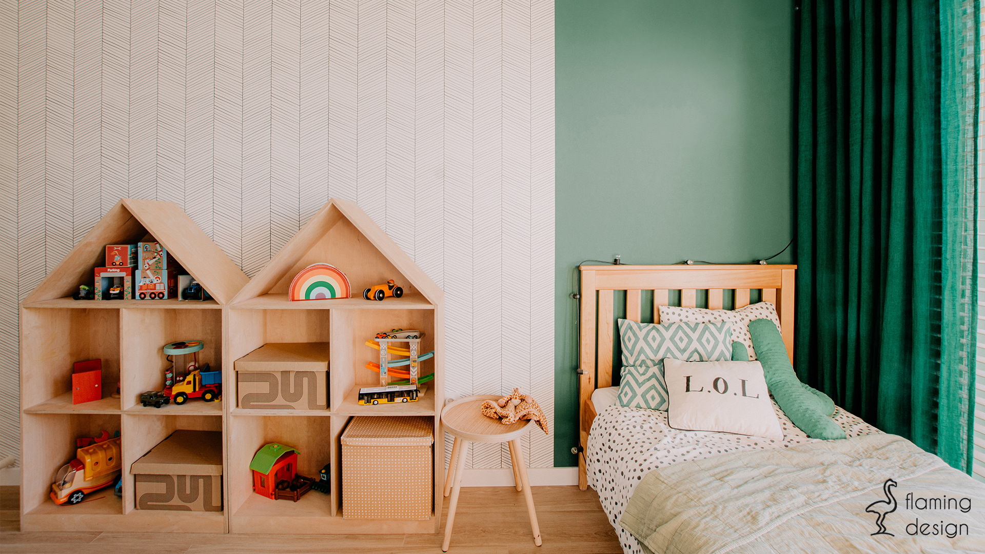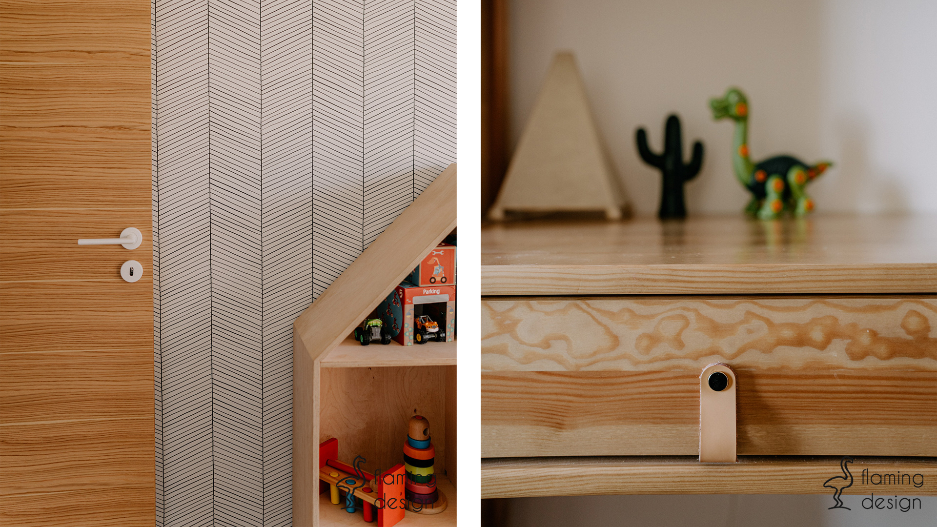 Realizacja pokoju dla chłopca w domu jednorodzinnym. W pokoju o powierzchni 13 m2, za pomocą części ściany w kolorze szmaragdowym wydzielono strefę odpoczynku, w której znajduje się łóżko oraz regał na całą wysokość. Obok regału i białej szafki zaprojektowano drewniane biurko z półką. Na przeciwko biurka są regały domki wykonane na zamówienie, na tej samej ścianie jest tapeta w czarno-białą jodełkę. Szafa w zabudowie nie ma standardowych frontów, tutaj powieszono białą zasłonę oraz girlandę z czarnymi gwiadkami dla dekoracji. Na podłodze ułożone są płytki gresowe imitujące drewno.