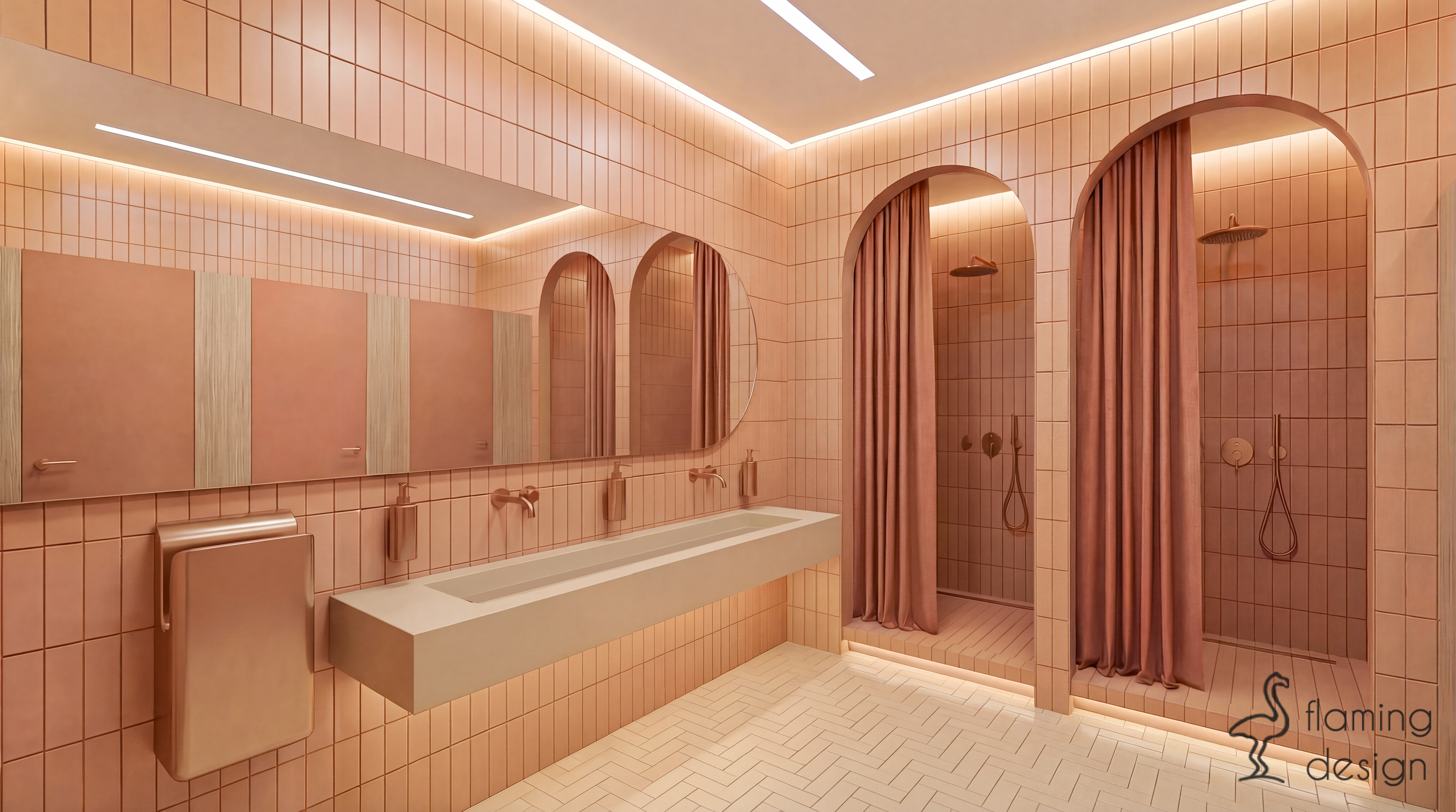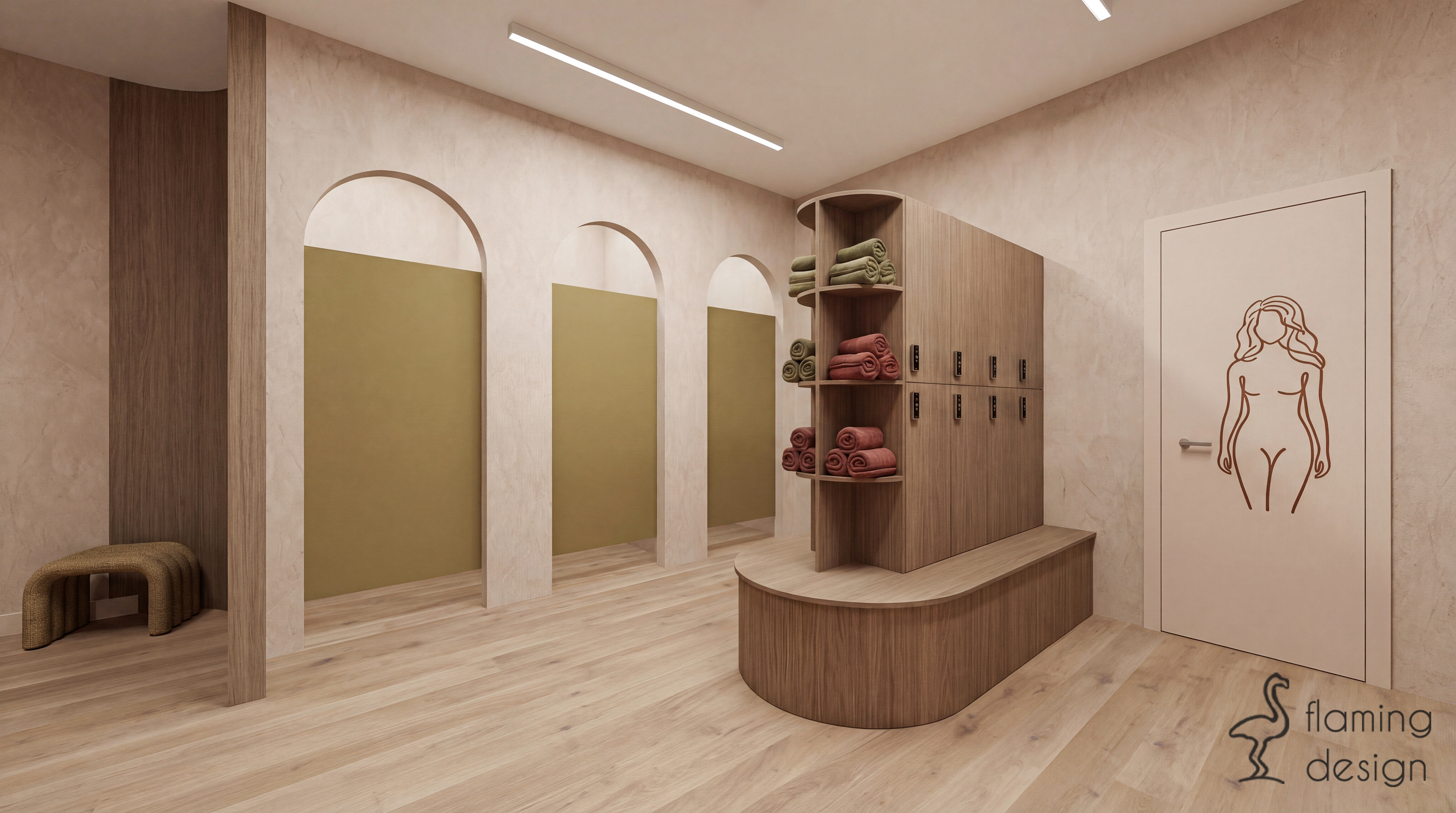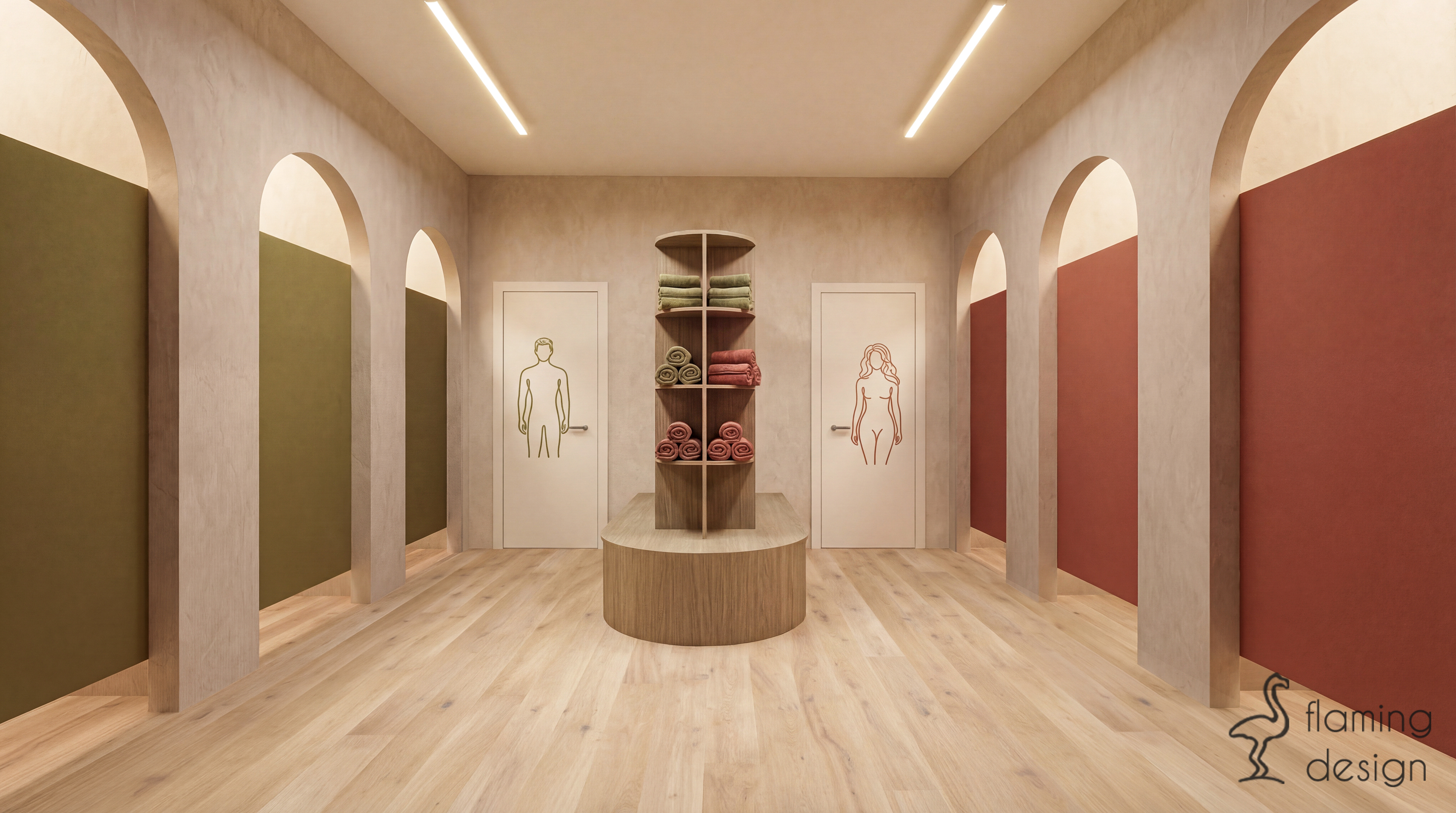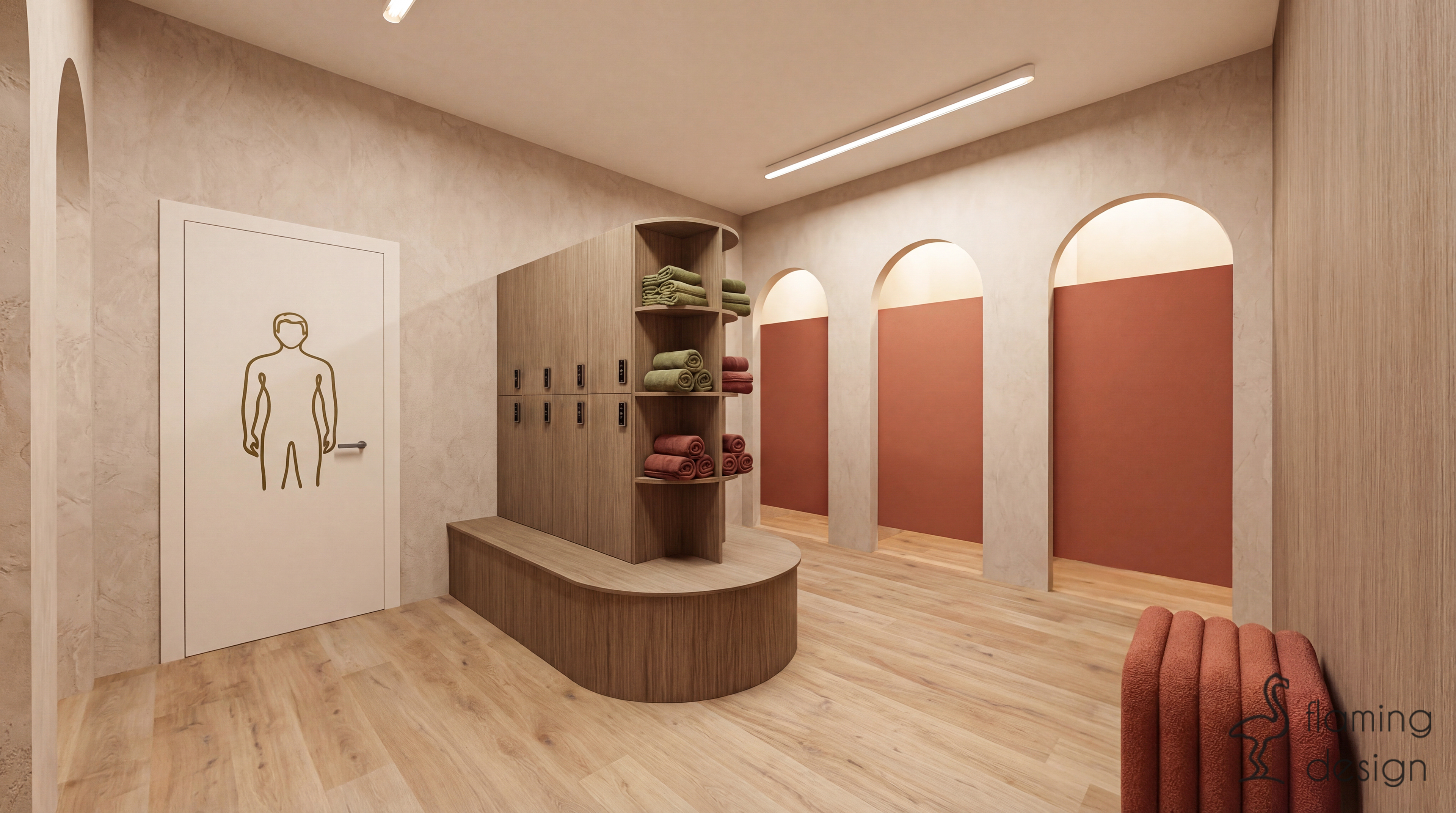 Strefa szatni i łazienek została zaprojektowana jako harmonijne przedłużenie sali ćwiczeń, wprowadzając jednak wyraźniejszy, funkcjonalny podział za pomocą koloru. Centralny punkt komunikacyjny zajmuje drewniany moduł z szafkami i półkami na ręczniki, którego obłe zakończenie prowadzi użytkowników w głąb pomieszczenia. Przestrzeń jest zorganizowana wokół rytmu wysokich arkad, które pełnią funkcję wejść do strefy męskiej (oznaczonej stonowaną, oliwkową zielenią) oraz damskiej (utrzymanej w ciepłym odcieniu terakoty). Wnętrza łazienek bazują na fakturach – pionowe, wąskie płytki oraz prysznicowe zasłony w niszach tworzą bezpieczną, niemal domową atmosferę, która sprzyja wyciszeniu po treningu. Minimalistyczne, surowe w formie umywalki oraz miedziana i chromowana armatura podkreślają organiczny charakter projektu, zamieniając rutynowe czynności w kojący rytuał w duchu slow life.