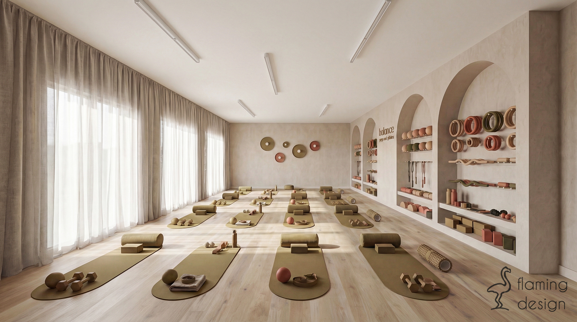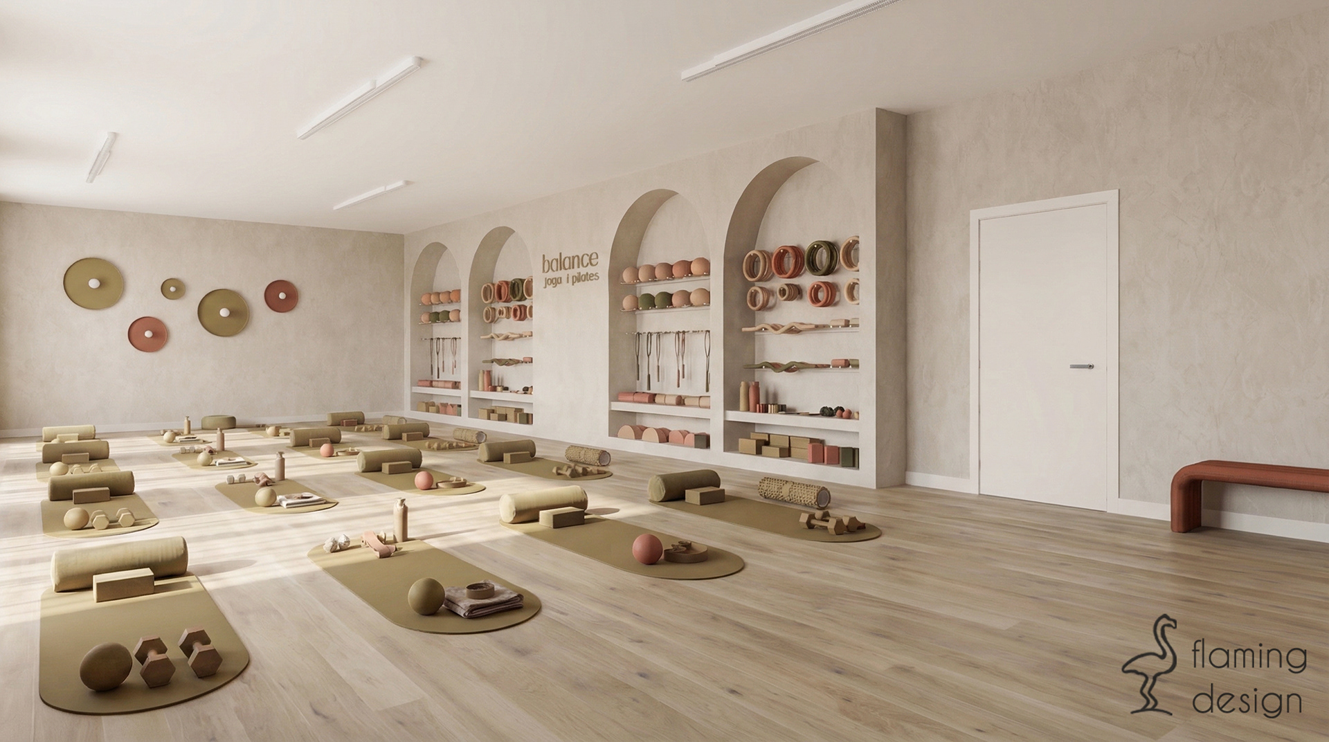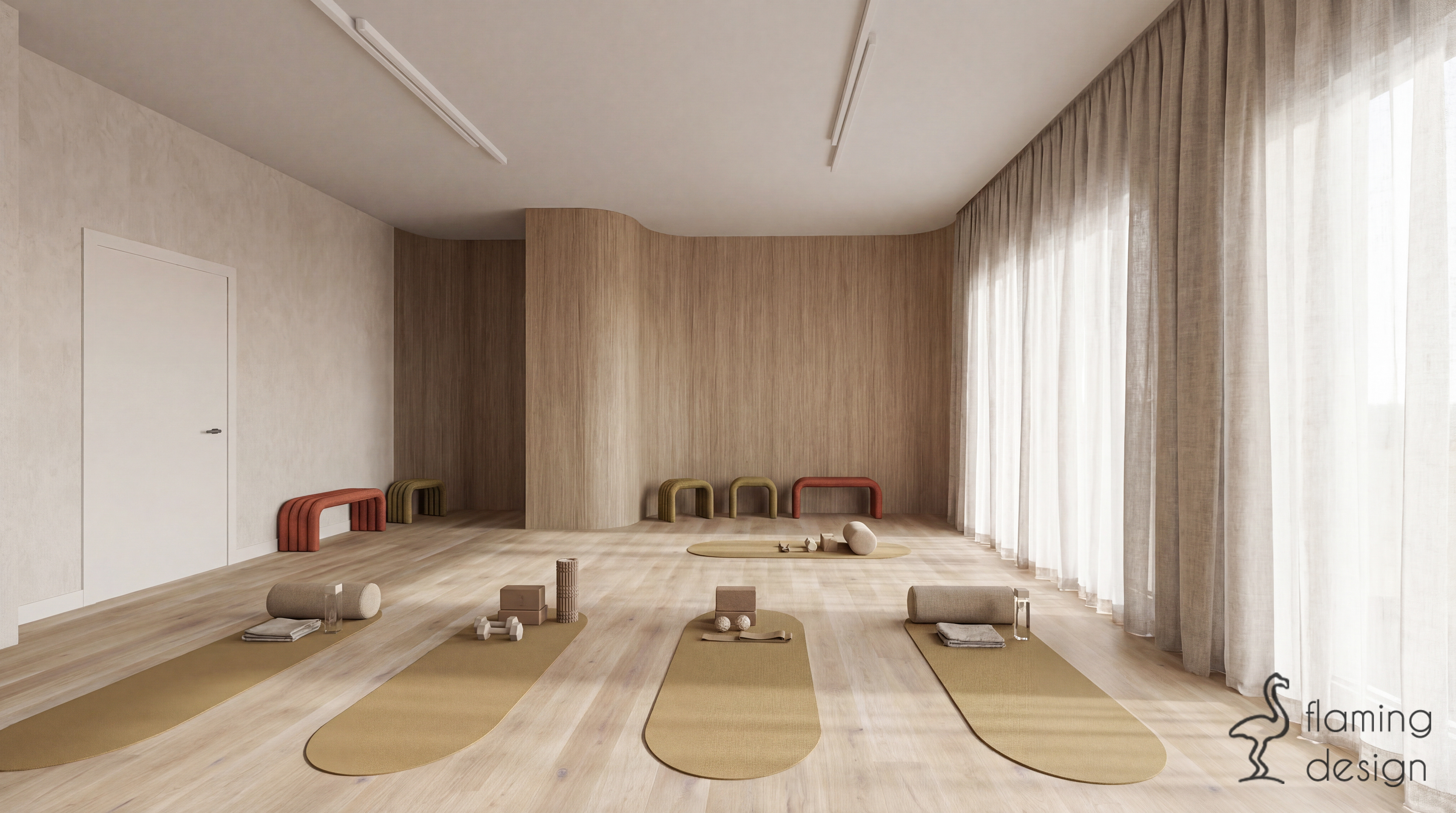 Ten minimalistyczny projekt studia jogi i pilatesu łączy estetykę zen z nowoczesną funkcjonalnością, tworząc przestrzeń sprzyjającą wyciszeniu i regeneracji. Wnętrza opierają się na ciepłej, ziemistej palecie barw, w której dominują odcienie beżu, terakoty i oliwkowej zieleni, dopełnione naturalną teksturą drewna. Kluczowym elementem architektonicznym są miękkie łuki i obłe formy, które pojawiają się zarówno w niszach ekspozycyjnych na akcesoria, jak i w konstrukcji strefy szatni. Główna sala ćwiczeń została zaprojektowana z myślą o maksymalnym świetle dziennym, które łagodnie filtruje się przez półtransparentne zasłony, podkreślając naturalny rysunek drewnianej podłogi.